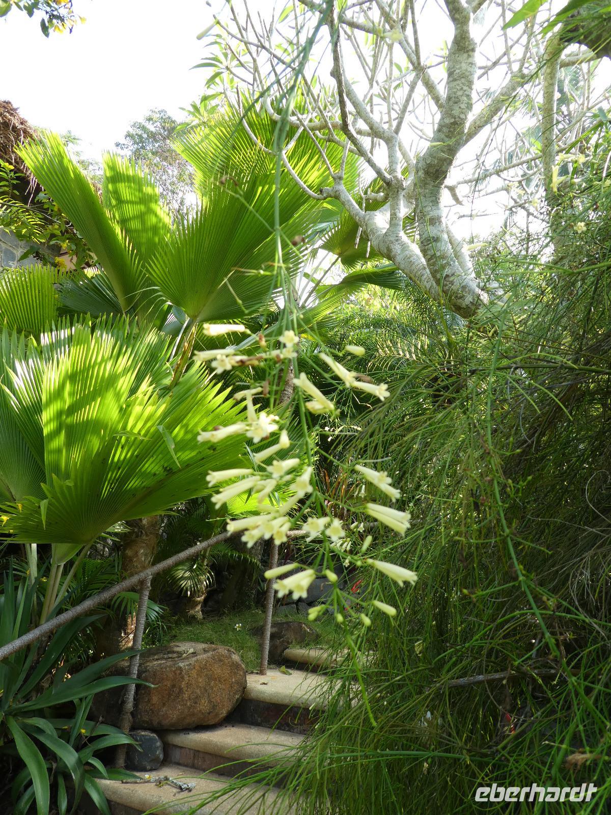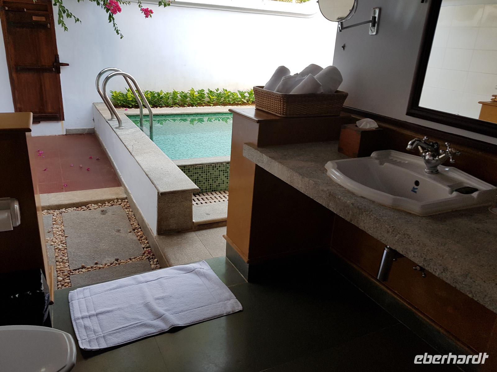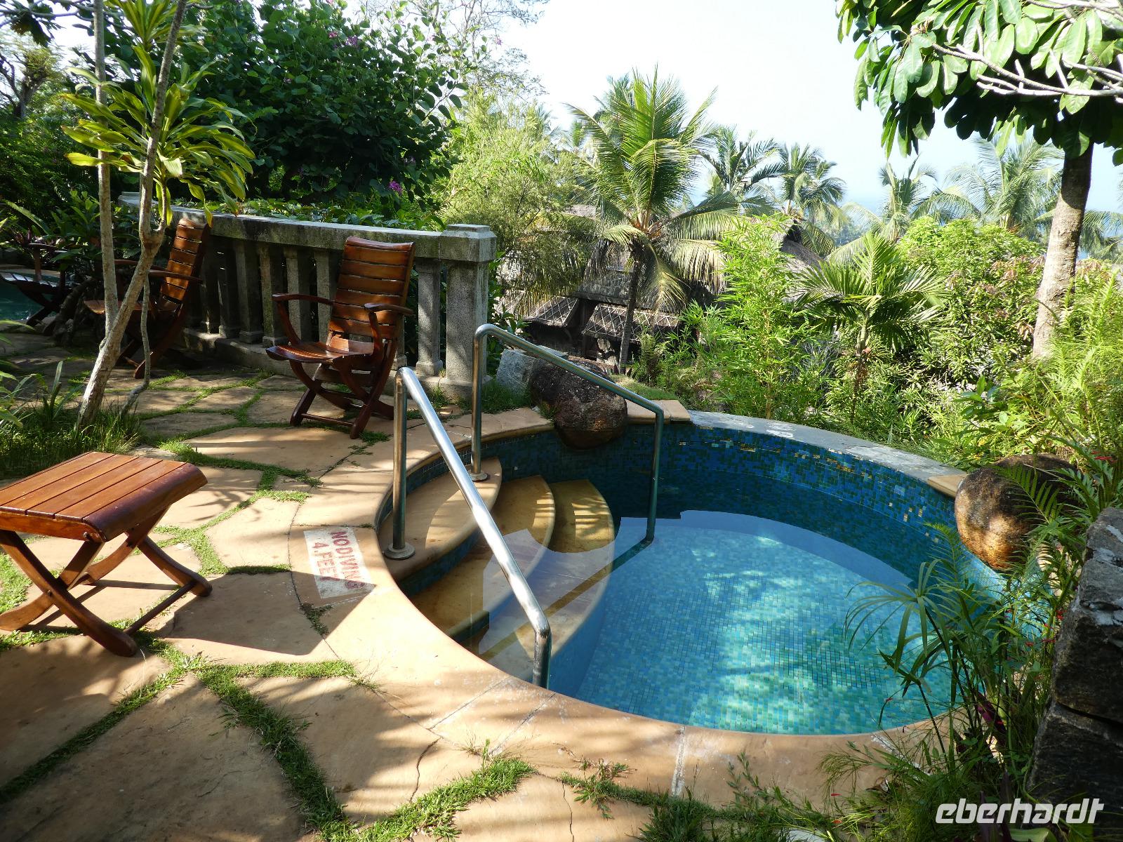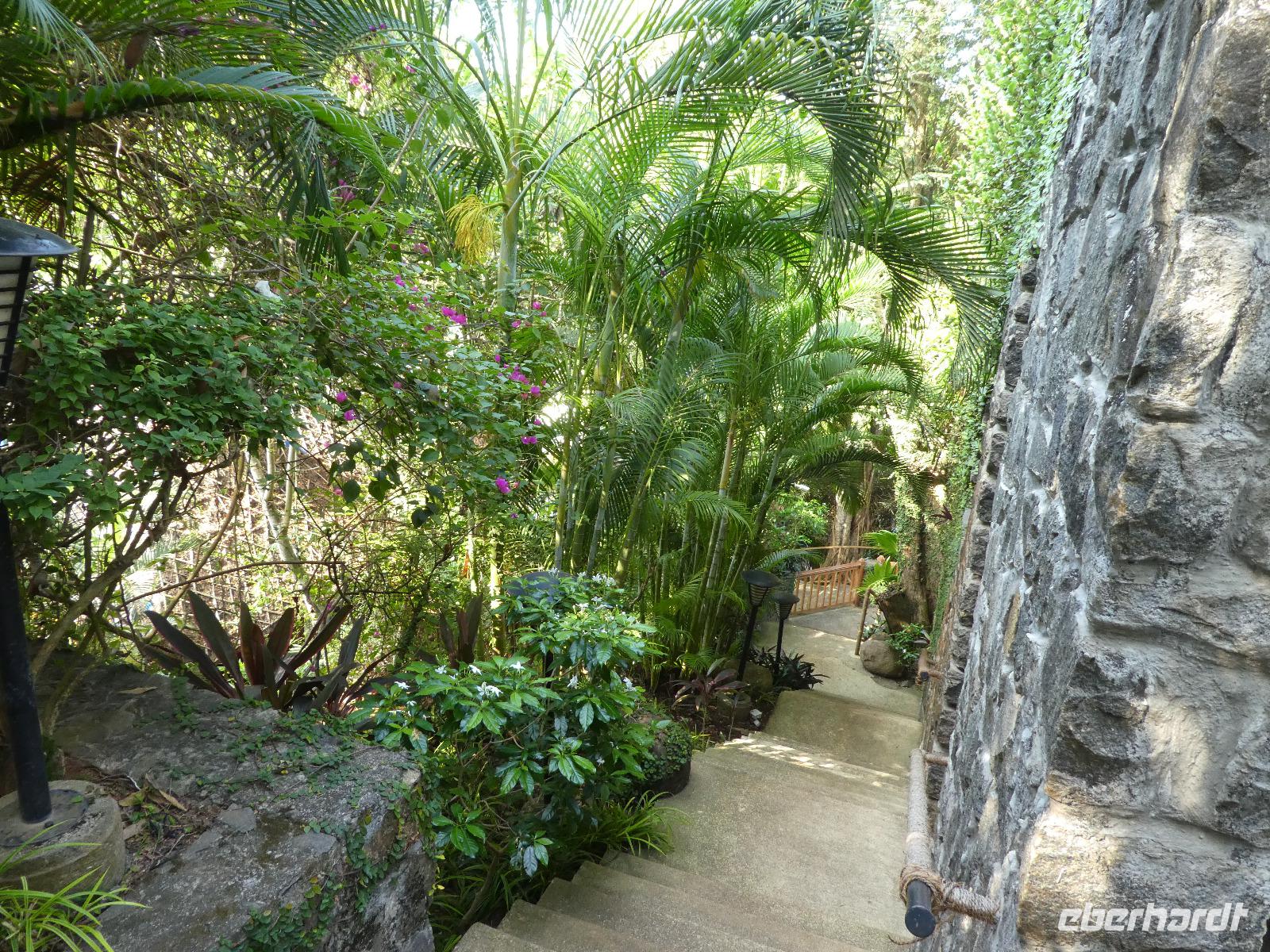 Das kleine Boot holte uns mit dem Gepäck wieder vom Hausboot ab und an Kand warteten schon Bhawani und Sajee auf uns. Die Fahrt ging weiter in den Süden und zum Mittagessen organisierten wir ein typisches südindisches Mahl auf einem Bananenblatt. Die Inder essen mit den Fingern, für uns Europäer wurden Löffel und Gabel bereit gelegt. Es schmeckte hervorragend. Am frühen Nachmittag erreichten wir Kovalem und unser letztes Hotel Vivanta by Taj - Green Cove. Inzwischen herrschten Temperaturen von 35 Grad und so schmeckte die frische Kokosnuß besonders gut. Die Hotelanlage lag in einem tropischen Garten hoch über dem Meer und war sehr verwinkelt. Wir wurden zu unseren Häuschen begleitet und richteten uns ein. Am Nachmittag dann erkundeten wir den Bereich unten am Meer und den etwas weiter entfernten Sandstrand von Kovalem. Wie schon am Vembanadsee gab es auch hier ab 17 Uhr kostenlos Kaffee und Snacks und wir konnten die Vorbereitungen für einen Hochzeitsempfang beobachten. Dann hieß es Abschied nehmen von Bhawani, der uns von Delhi bis hierher begleitet hatte und von dem wir sehr viel über Indien erfahren hatten. Danke Bhawani, wir hatten viel Spaß miteinander in familiärer Atmosphäre unserer kleinen Gruppe.