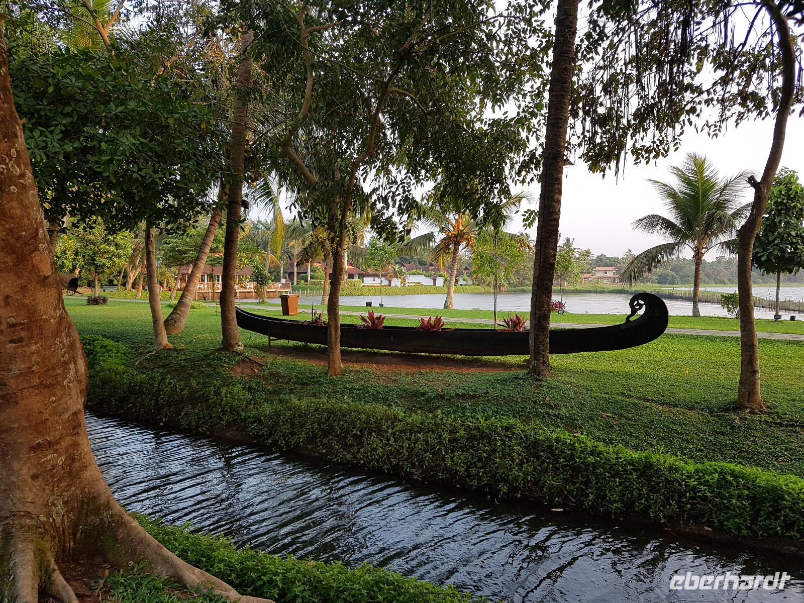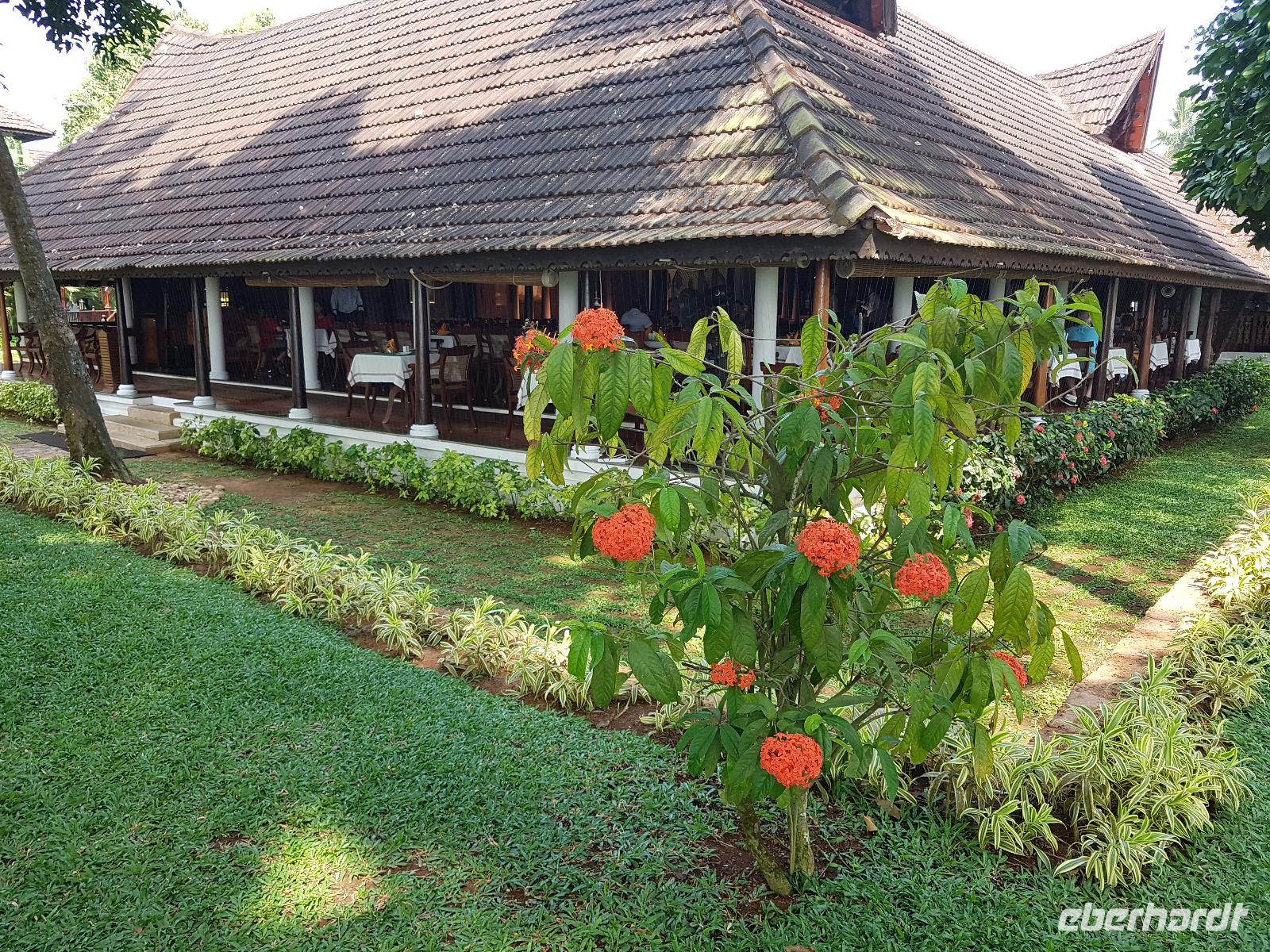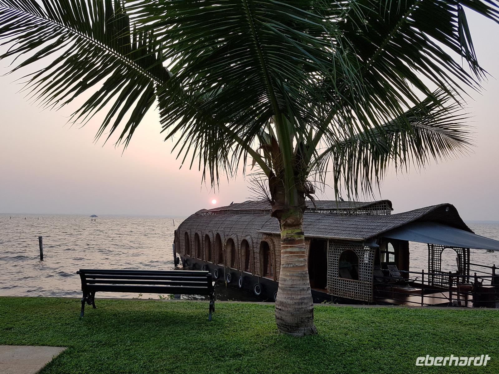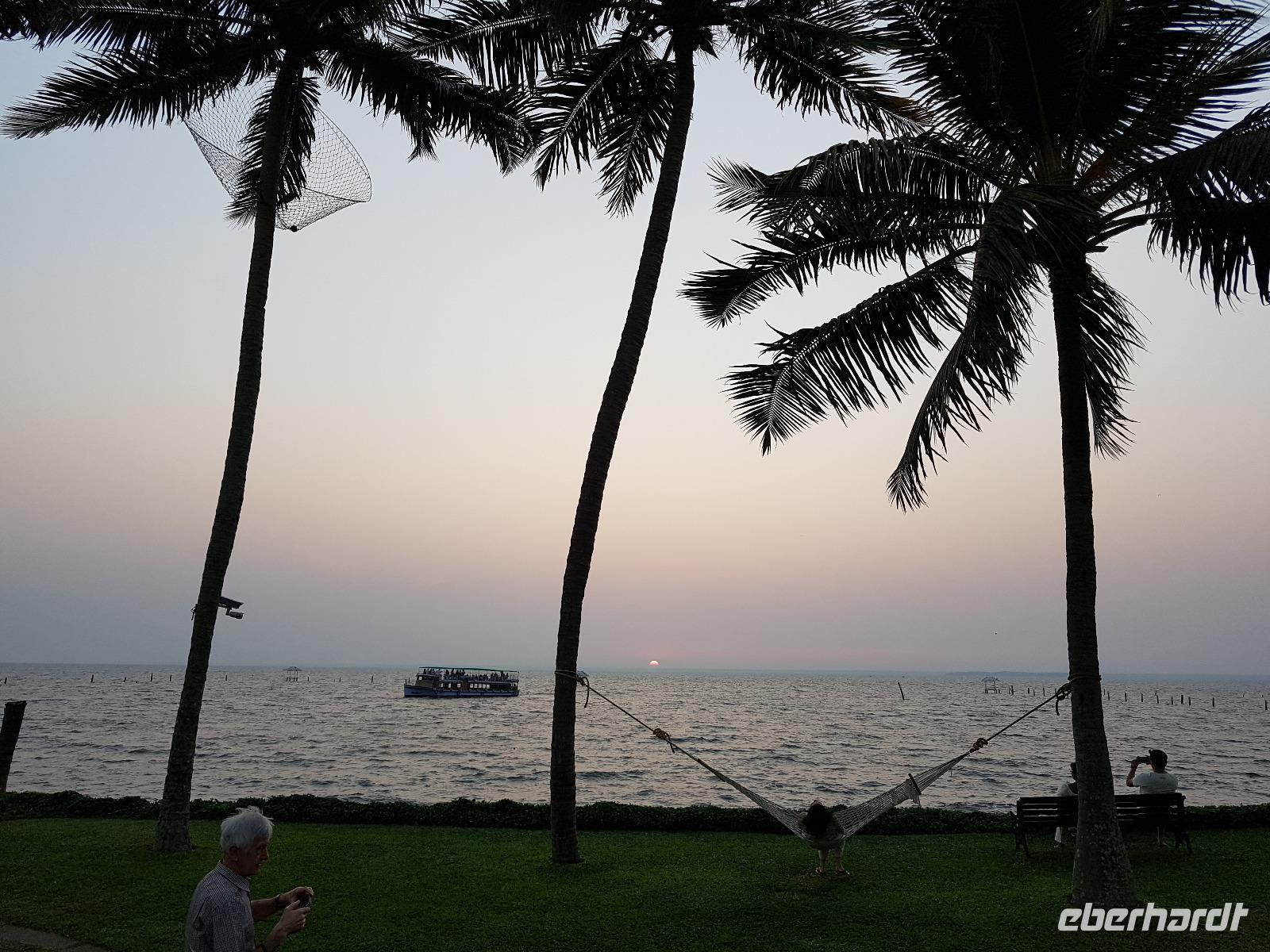 Noch ein Frühstück in diesem Traumhotel und dann mußten wir wieder zum Flughafen nach Mumbai. Gegen Mittag landeten wir in Cochin und wurden von Sajee mit seinem Kleinbus empfangen. Er begleitete uns bis zum Ende unseres Indien Aufenthaltes. In Cochin fuhren wir auf die Insel Cochin Fort, wo sich der historische Teil der Stadt befindet. Wir besichtigten die Franziskaner Kirche, in der einst Vasco da Gama beigesetzt wurde und danach den Fischmarkt. Die Fische werden noch traditionell mit den chinesischen Fischernetzen gefangen und wir durften beim Aufziehen der Netzte mit helfen. Im Uferbereich standen viele alte und große Bäume und besonders der Kanonenkugelbaum mit seinen wunderschönen Blüten hatte es uns angetan. Unsere verspätete Mittagspause verbrachten wir bei einem Stoffhändler, der uns seine Produkte vorstellte und dazu Gemüsetaschen und Getränke servierte. Danach folgte eine 2stündige Fahrt weiter in den Süden bis zu unserem nächsten Hotel, dem Kumarakom Lake Resort. Wir bekamen zur Begrüßung eine frische Kokosnuß und dann wurde jeder zu seinem Haus mit Privatpool geführt. Ein traumhaftes Anwesen direkt am Vembanad See gelegen bot endlich Gelegenheit zum Relaxen und Verarbeiten des bis dahin Erlebten. Bis zum Abendessen erkundeten wir diese traumhafte Anlage und erlebten den Sonnenuntergang über dem See in der Hängematte. Das Abendessen und Frühstück wurde in einem offenen Restaurant eingenommen und auch hier waren die Speisen vom Buffet sehr schmackhaft.