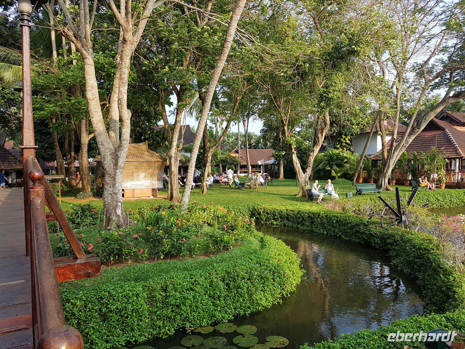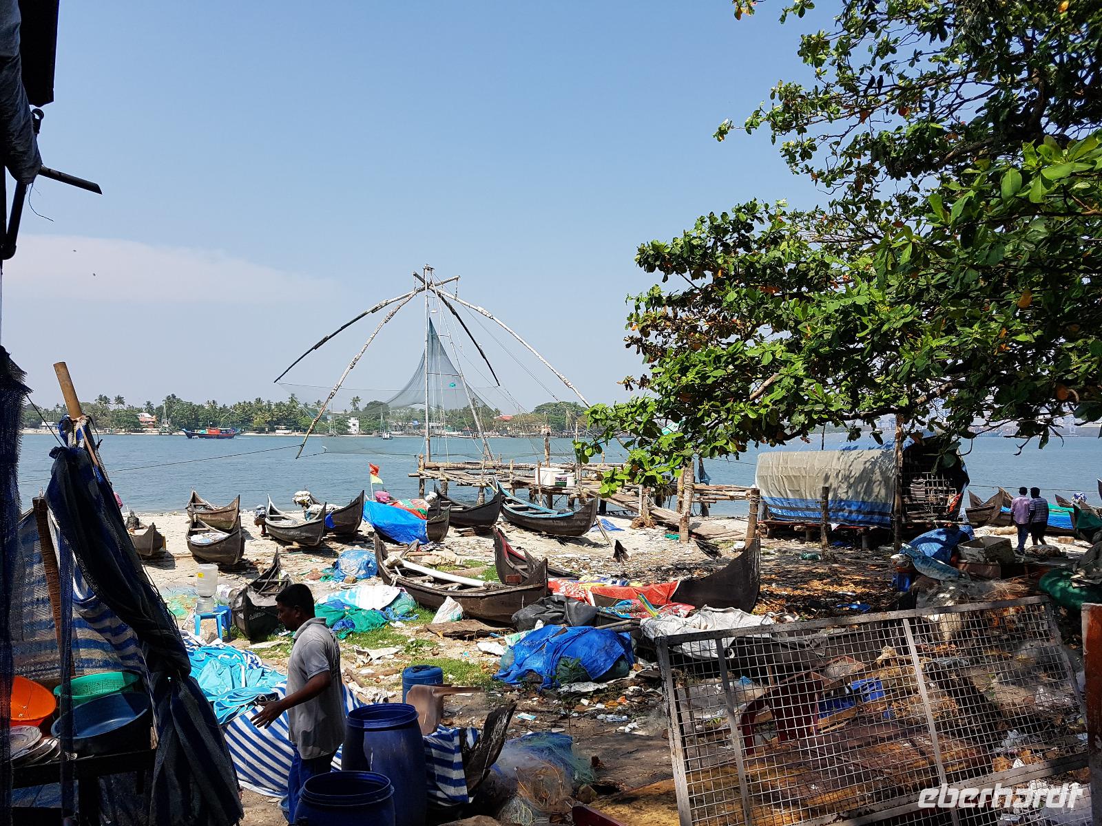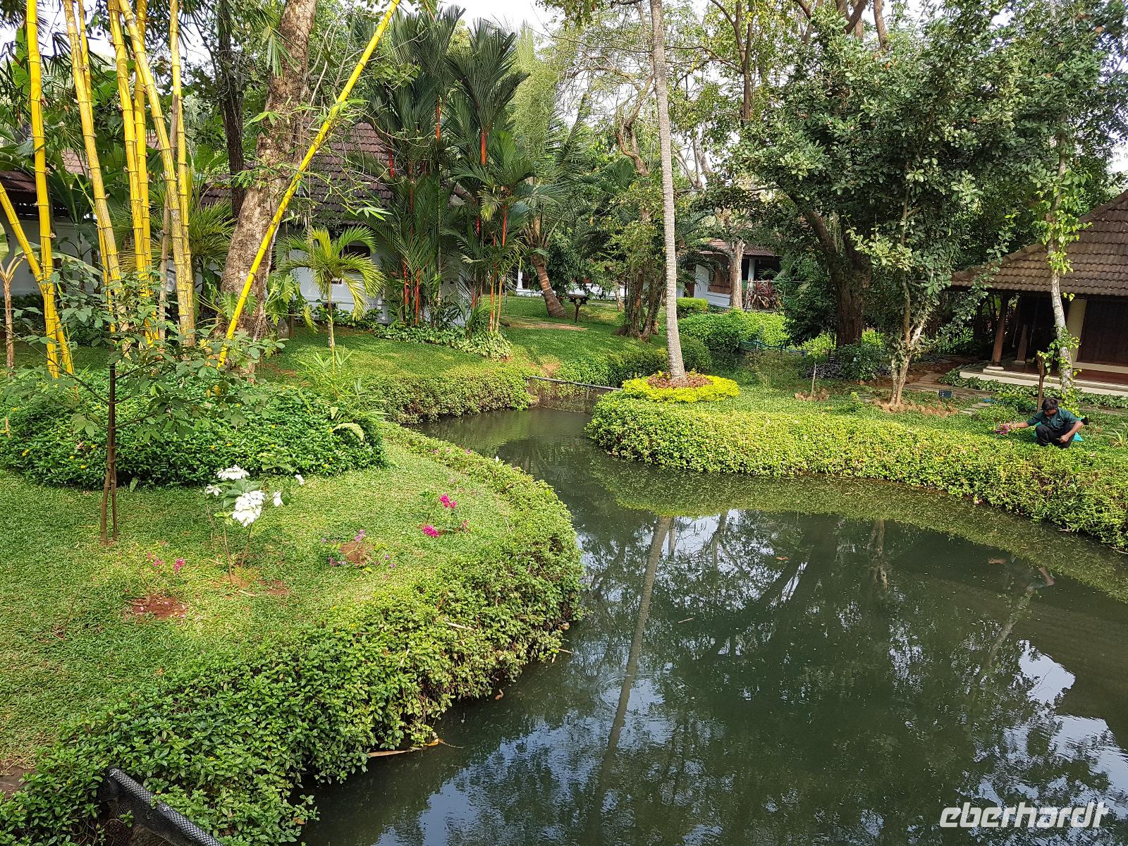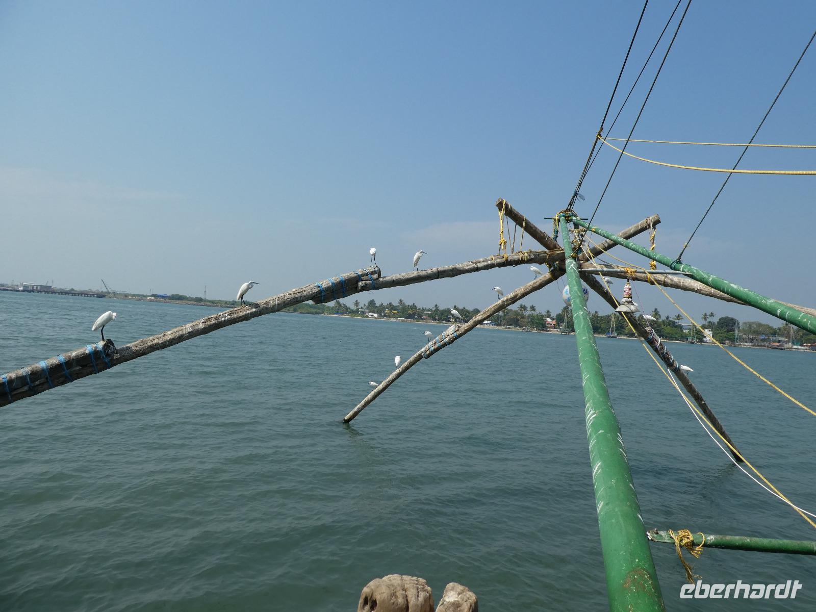 Noch ein Frühstück in diesem Traumhotel und dann mußten wir wieder zum Flughafen nach Mumbai. Gegen Mittag landeten wir in Cochin und wurden von Sajee mit seinem Kleinbus empfangen. Er begleitete uns bis zum Ende unseres Indien Aufenthaltes. In Cochin fuhren wir auf die Insel Cochin Fort, wo sich der historische Teil der Stadt befindet. Wir besichtigten die Franziskaner Kirche, in der einst Vasco da Gama beigesetzt wurde und danach den Fischmarkt. Die Fische werden noch traditionell mit den chinesischen Fischernetzen gefangen und wir durften beim Aufziehen der Netzte mit helfen. Im Uferbereich standen viele alte und große Bäume und besonders der Kanonenkugelbaum mit seinen wunderschönen Blüten hatte es uns angetan. Unsere verspätete Mittagspause verbrachten wir bei einem Stoffhändler, der uns seine Produkte vorstellte und dazu Gemüsetaschen und Getränke servierte. Danach folgte eine 2stündige Fahrt weiter in den Süden bis zu unserem nächsten Hotel, dem Kumarakom Lake Resort. Wir bekamen zur Begrüßung eine frische Kokosnuß und dann wurde jeder zu seinem Haus mit Privatpool geführt. Ein traumhaftes Anwesen direkt am Vembanad See gelegen bot endlich Gelegenheit zum Relaxen und Verarbeiten des bis dahin Erlebten. Bis zum Abendessen erkundeten wir diese traumhafte Anlage und erlebten den Sonnenuntergang über dem See in der Hängematte. Das Abendessen und Frühstück wurde in einem offenen Restaurant eingenommen und auch hier waren die Speisen vom Buffet sehr schmackhaft.