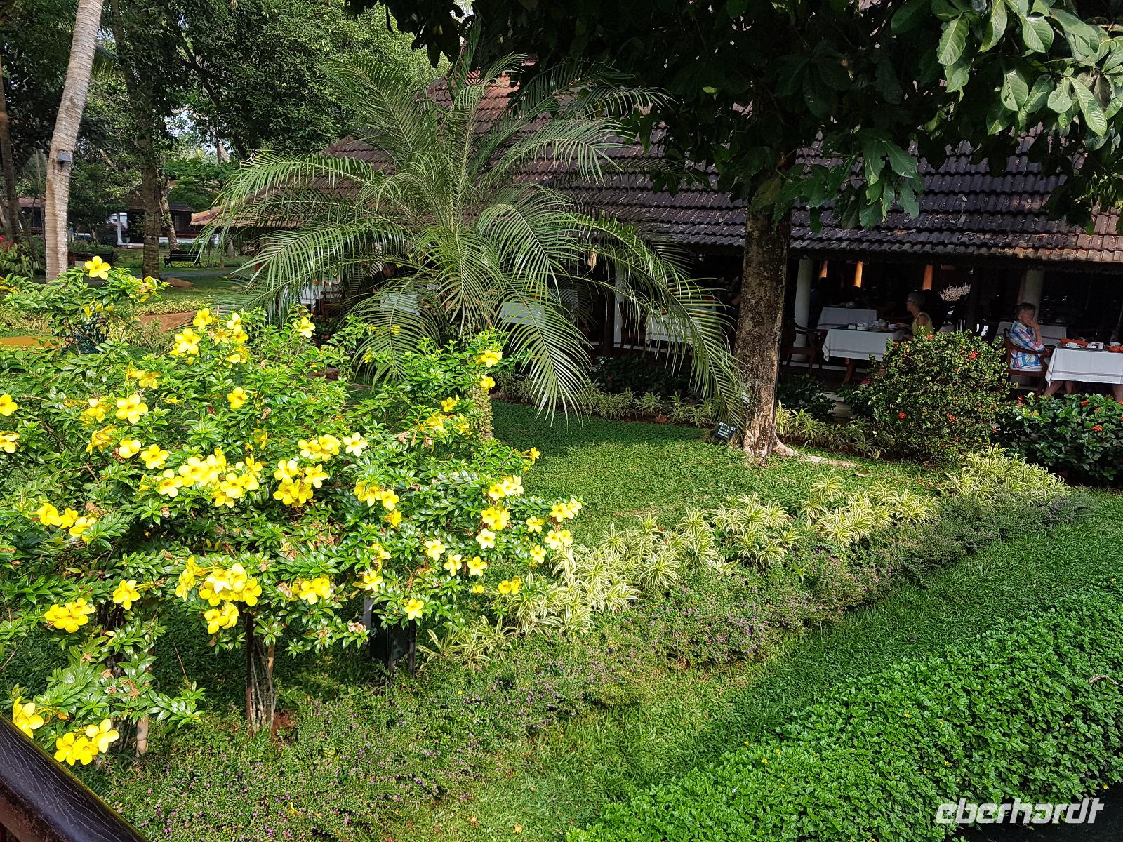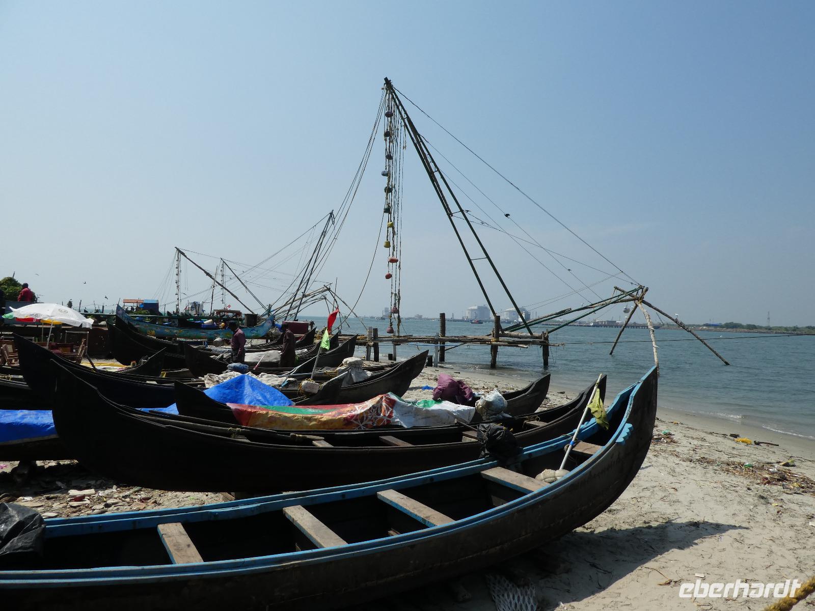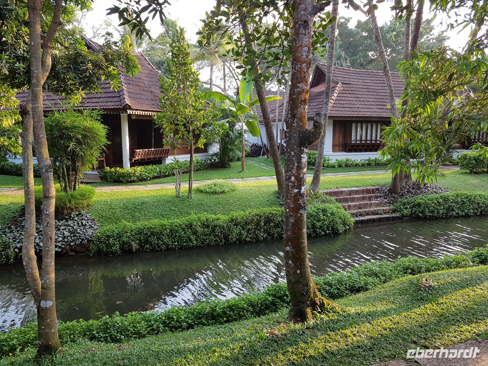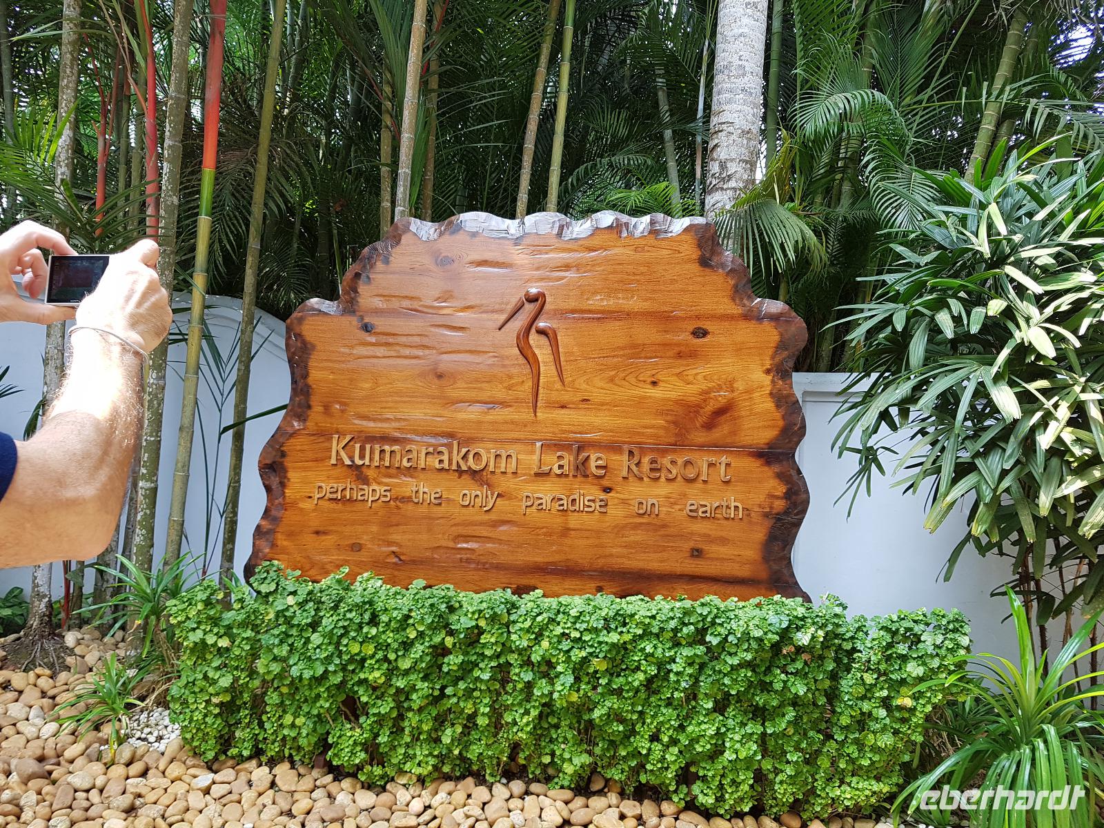 Noch ein Frühstück in diesem Traumhotel und dann mußten wir wieder zum Flughafen nach Mumbai. Gegen Mittag landeten wir in Cochin und wurden von Sajee mit seinem Kleinbus empfangen. Er begleitete uns bis zum Ende unseres Indien Aufenthaltes. In Cochin fuhren wir auf die Insel Cochin Fort, wo sich der historische Teil der Stadt befindet. Wir besichtigten die Franziskaner Kirche, in der einst Vasco da Gama beigesetzt wurde und danach den Fischmarkt. Die Fische werden noch traditionell mit den chinesischen Fischernetzen gefangen und wir durften beim Aufziehen der Netzte mit helfen. Im Uferbereich standen viele alte und große Bäume und besonders der Kanonenkugelbaum mit seinen wunderschönen Blüten hatte es uns angetan. Unsere verspätete Mittagspause verbrachten wir bei einem Stoffhändler, der uns seine Produkte vorstellte und dazu Gemüsetaschen und Getränke servierte. Danach folgte eine 2stündige Fahrt weiter in den Süden bis zu unserem nächsten Hotel, dem Kumarakom Lake Resort. Wir bekamen zur Begrüßung eine frische Kokosnuß und dann wurde jeder zu seinem Haus mit Privatpool geführt. Ein traumhaftes Anwesen direkt am Vembanad See gelegen bot endlich Gelegenheit zum Relaxen und Verarbeiten des bis dahin Erlebten. Bis zum Abendessen erkundeten wir diese traumhafte Anlage und erlebten den Sonnenuntergang über dem See in der Hängematte. Das Abendessen und Frühstück wurde in einem offenen Restaurant eingenommen und auch hier waren die Speisen vom Buffet sehr schmackhaft.