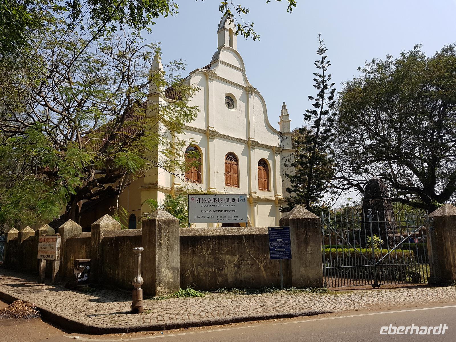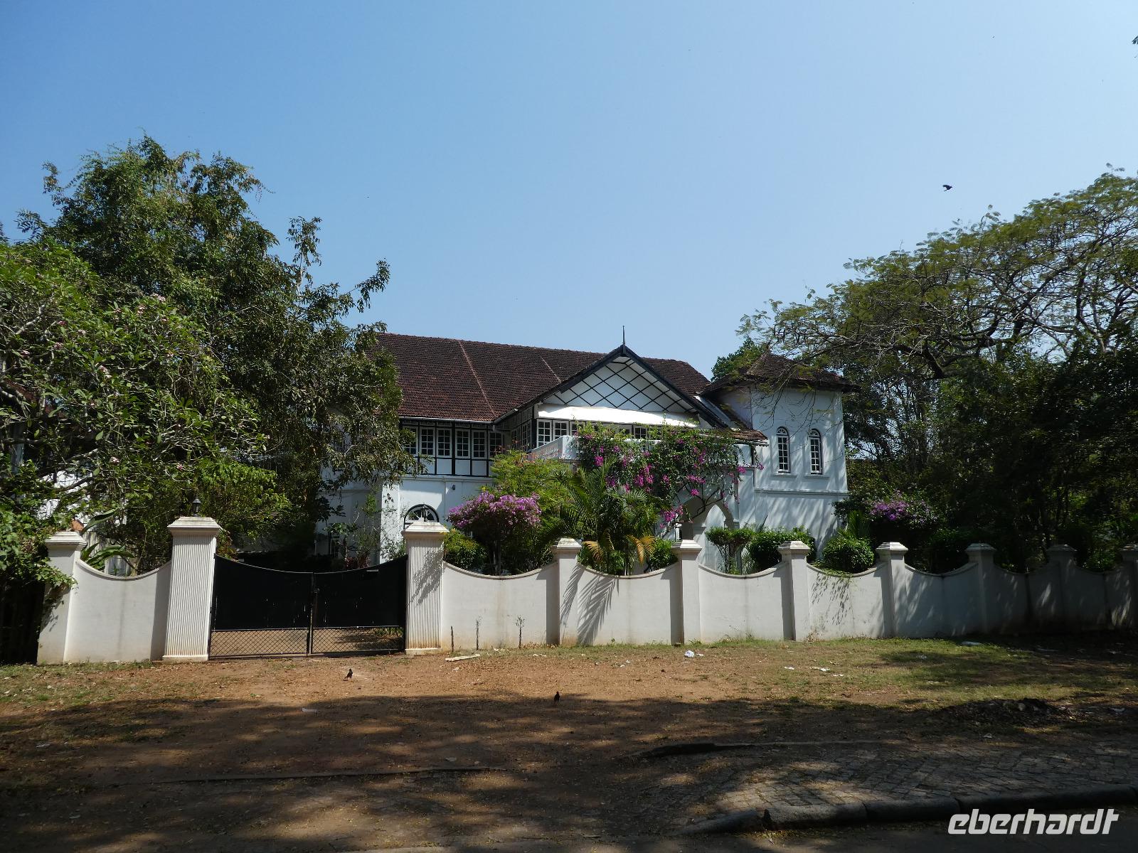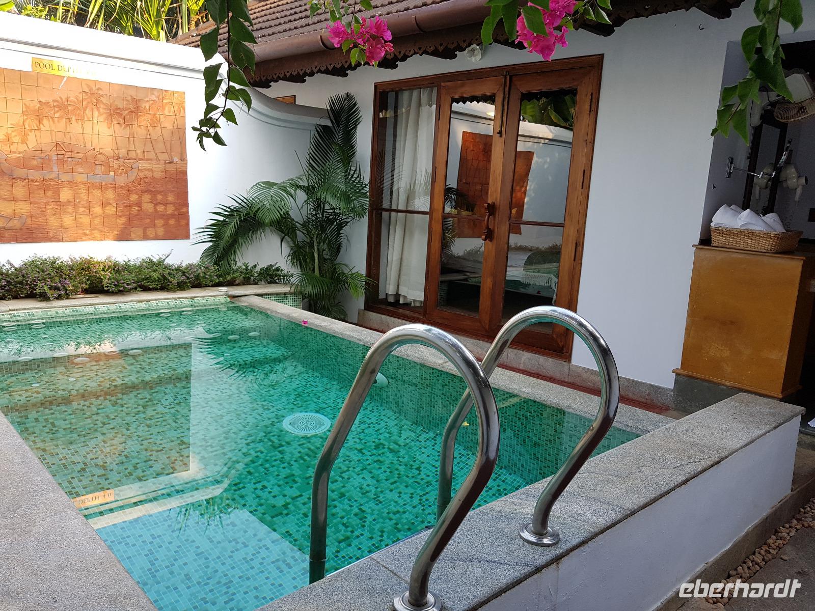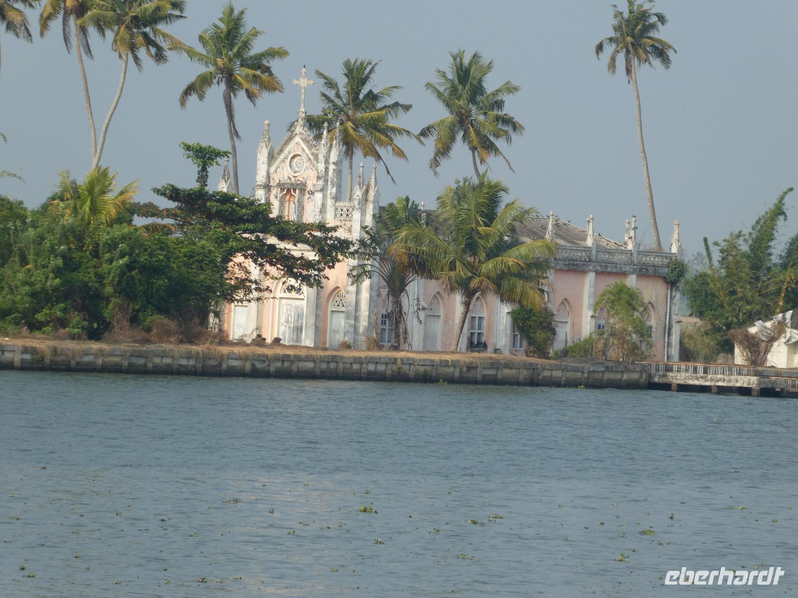 Noch ein Frühstück in diesem Traumhotel und dann mußten wir wieder zum Flughafen nach Mumbai. Gegen Mittag landeten wir in Cochin und wurden von Sajee mit seinem Kleinbus empfangen. Er begleitete uns bis zum Ende unseres Indien Aufenthaltes. In Cochin fuhren wir auf die Insel Cochin Fort, wo sich der historische Teil der Stadt befindet. Wir besichtigten die Franziskaner Kirche, in der einst Vasco da Gama beigesetzt wurde und danach den Fischmarkt. Die Fische werden noch traditionell mit den chinesischen Fischernetzen gefangen und wir durften beim Aufziehen der Netzte mit helfen. Im Uferbereich standen viele alte und große Bäume und besonders der Kanonenkugelbaum mit seinen wunderschönen Blüten hatte es uns angetan. Unsere verspätete Mittagspause verbrachten wir bei einem Stoffhändler, der uns seine Produkte vorstellte und dazu Gemüsetaschen und Getränke servierte. Danach folgte eine 2stündige Fahrt weiter in den Süden bis zu unserem nächsten Hotel, dem Kumarakom Lake Resort. Wir bekamen zur Begrüßung eine frische Kokosnuß und dann wurde jeder zu seinem Haus mit Privatpool geführt. Ein traumhaftes Anwesen direkt am Vembanad See gelegen bot endlich Gelegenheit zum Relaxen und Verarbeiten des bis dahin Erlebten. Bis zum Abendessen erkundeten wir diese traumhafte Anlage und erlebten den Sonnenuntergang über dem See in der Hängematte. Das Abendessen und Frühstück wurde in einem offenen Restaurant eingenommen und auch hier waren die Speisen vom Buffet sehr schmackhaft.