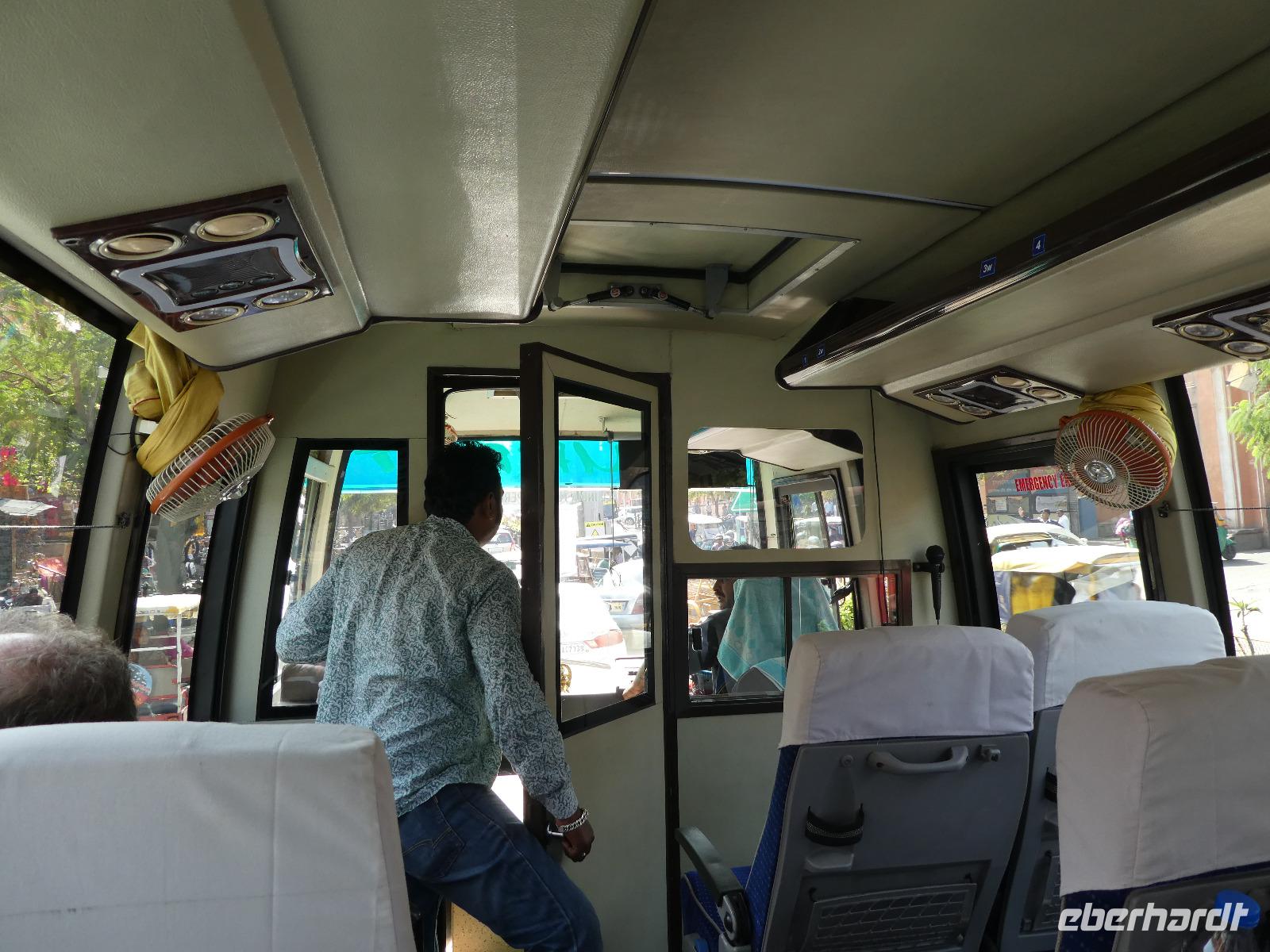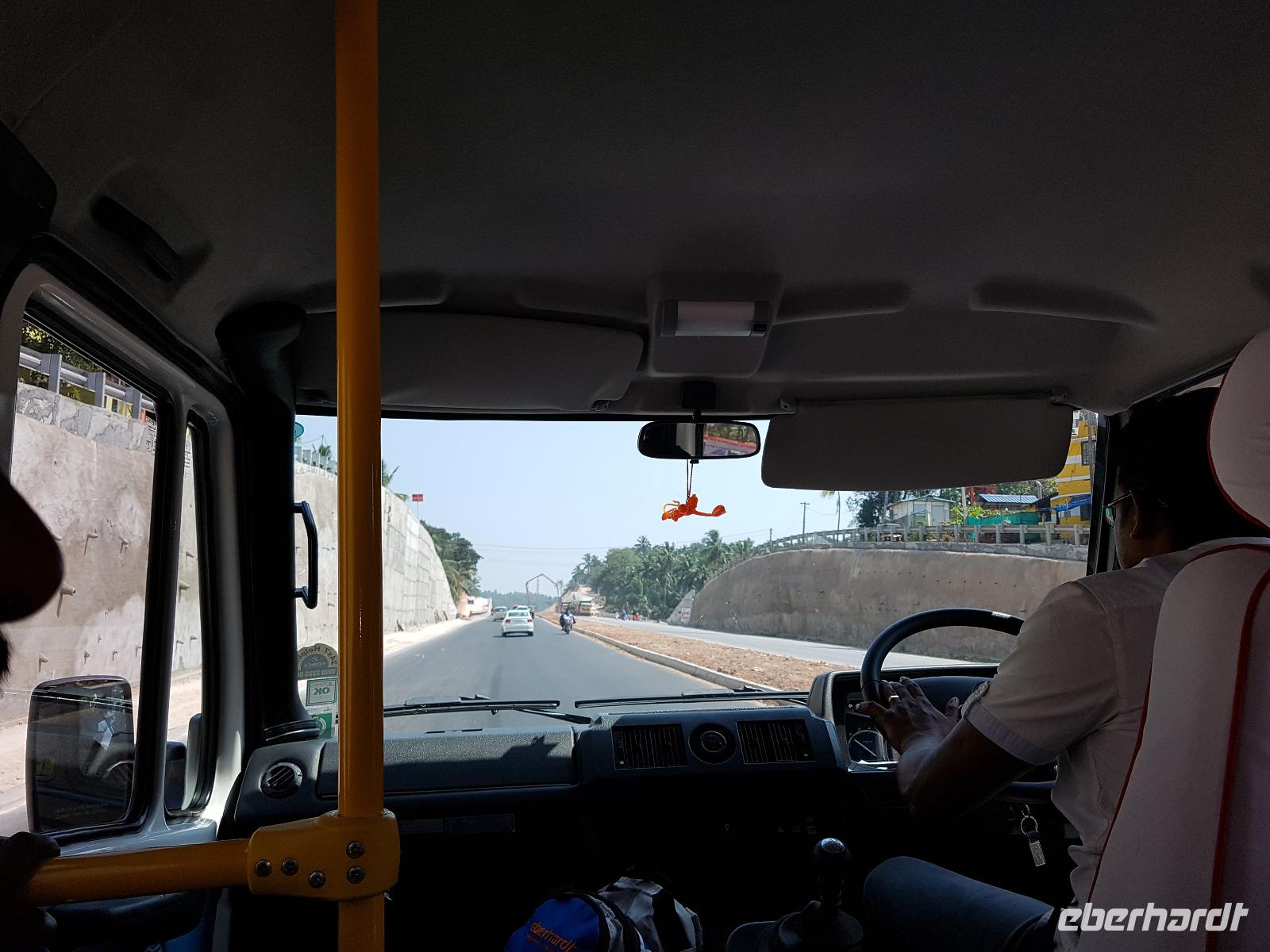 Nach der Landung begaben wir uns zur Paßkontrolle für das E-Visum, wurden fotografiert und teilweise wurden zusätzlich Fingerabdrücke genommen. Dann gings zum Kofferband, ein wenig Geld tauschen und endlich hinaus, wo uns Bhawani schon sehnsüchtlich erwartete. Er brachte uns zu unserem Bus und dort wurden wir mit Blumenkränzen herzlich willkommen geheißen - namaste Indien - endlich sind wir da !