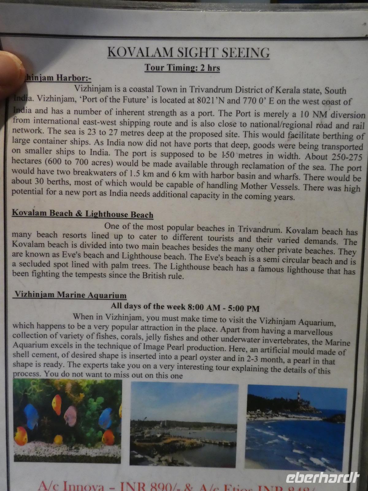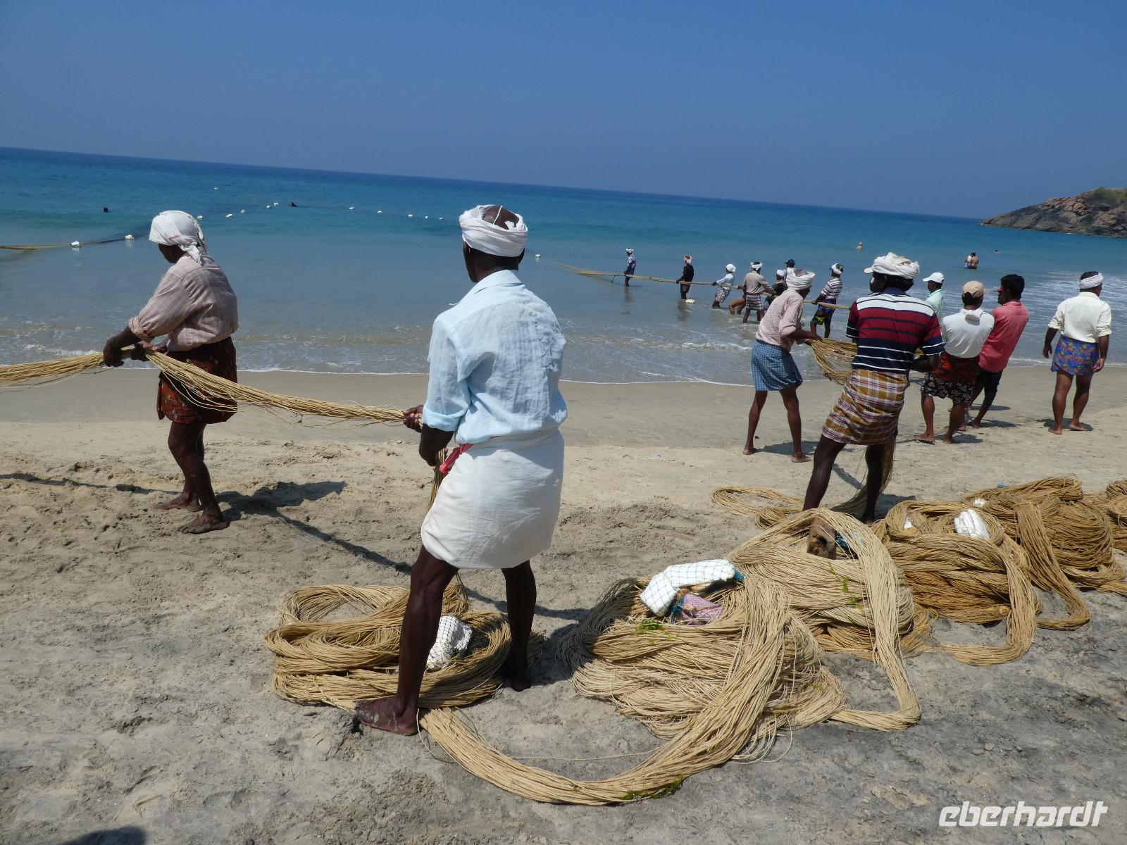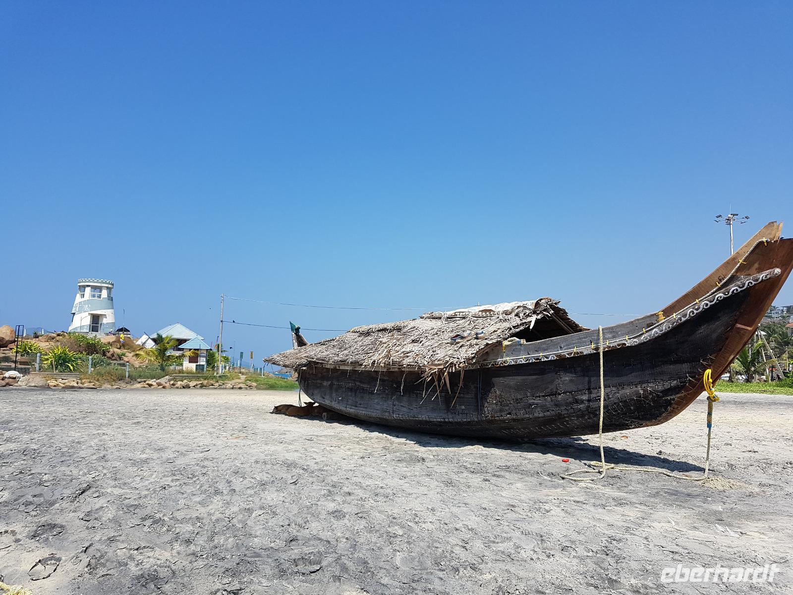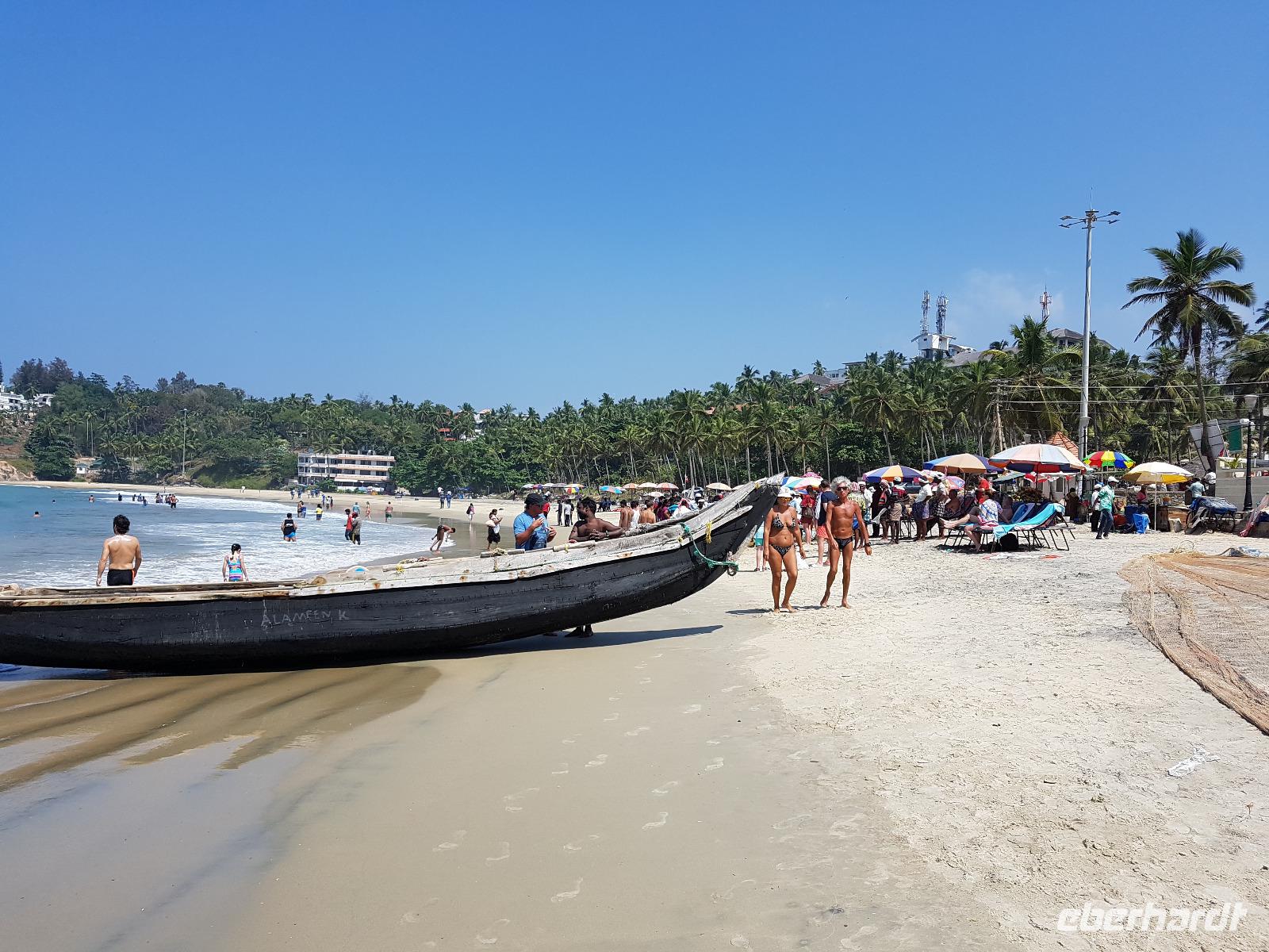 Unser letzter Tag in Indien war gekommen und wir verbrachten ihn am Strand. Nach einem späten Frühstück machten wir uns zu Fuß auf den Weg und konnten die Fischer beobachten, wie sie die Netze gemeinsam einholten. Es gab Möglichkeiten zum Einkaufen und wir nahmen uns Liegen und Sonnenschirme am Strand beim Leuchtturm und wir badeten im warmen Wasser der indischen Ozeans. Kovalem hatte eine kleine Uferstrasse mit Geschäften, Restaurants, Wechselstuben und Reiseanbietern. So hätten wir zum Beispiel auch eine Bootsfahrt in die Mangroven machen können. Am Nachmittag liefen wir zu unserem Hotel zurück, erkundeten nochmals die traumhafte Anlage und begannen die Koffer zu packen. Beim Abendessen ließen wir unsere traumhafte Reise noch einmal Revue passieren und legten uns wenigstens 1- 2 Stunden ins Bett. 24 Uhr hieß es dann endgültig Abschied nehmen. Unser Bus brachte uns zum Flughafen von Trivandrum.
