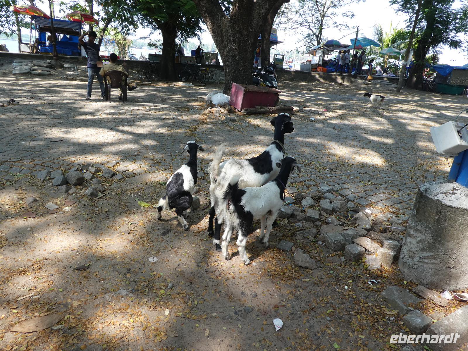 Es hieß Abschied nehmen von diesem Paradies und wir fuhren nach Alleppey zu unserem Hausboot. Da auf den Booten kein Alkohol verkauft werden darf, deckten wir uns an der Rezeption mit Bier für den Abend ein. Dann brachte uns ein kleines Boot mit dem Gepäck zu unserem Hausboot. Unser Hausboot hatte 4 Zimmer, 3 unten und eines oben und auf dem Oberdeck war reichlich Platz für uns. Das Boot legte auch gleich ab und wir fuhren auf kleineren und größeren Wasserwegen wieder bis zum Vembanad See. Es gab Mittagessen an Bord, zubereitet von der Crew und sehr schmackhaft. Unterwegs hielten wir an einem kleinen Fischmarkt und wir hätten uns dort fürs Abendessen auch frischen Fisch kaufen können.Aber für das Abendessen war schon südindisches Hühnchen abgekündigt worden An den Ufern waren die Bewohner bei ihren täglichen Verrichtungen zu beobachten. Viele Häuser waren nur vom Wasser aus zu erreichen. Die Wasserwege sind von Dämmen begrenzt und dahinter liegen die Reisfelder. Das ist praktisch, denn Wasser zum Bewässern der Felder ist immer vorrätig. Am Abend legte unser Hausboot am Ufer an und so konnten wir es verlassen und einen Spaziergang nach Alleppey unternehmen. Zurück nahmen wir 2 Tuktuks. Das Abendessen bereitete wieder die Crew für uns und so ließen wir den Tag gemütlich an Deck ausklingen.