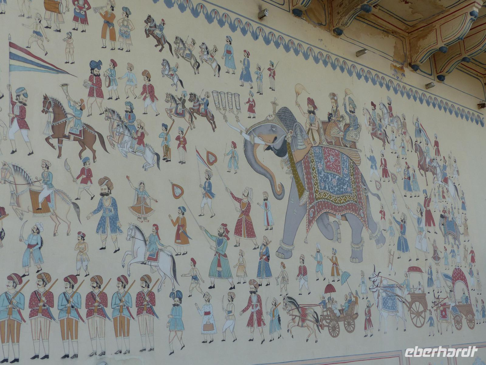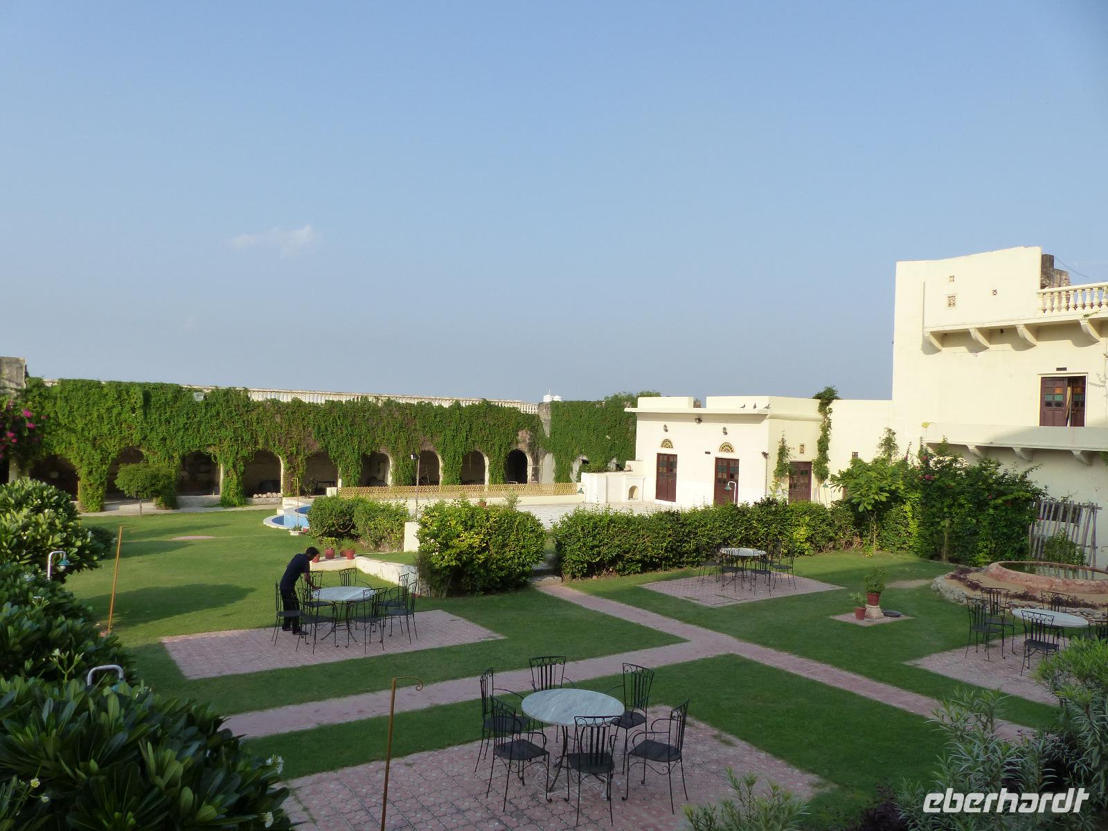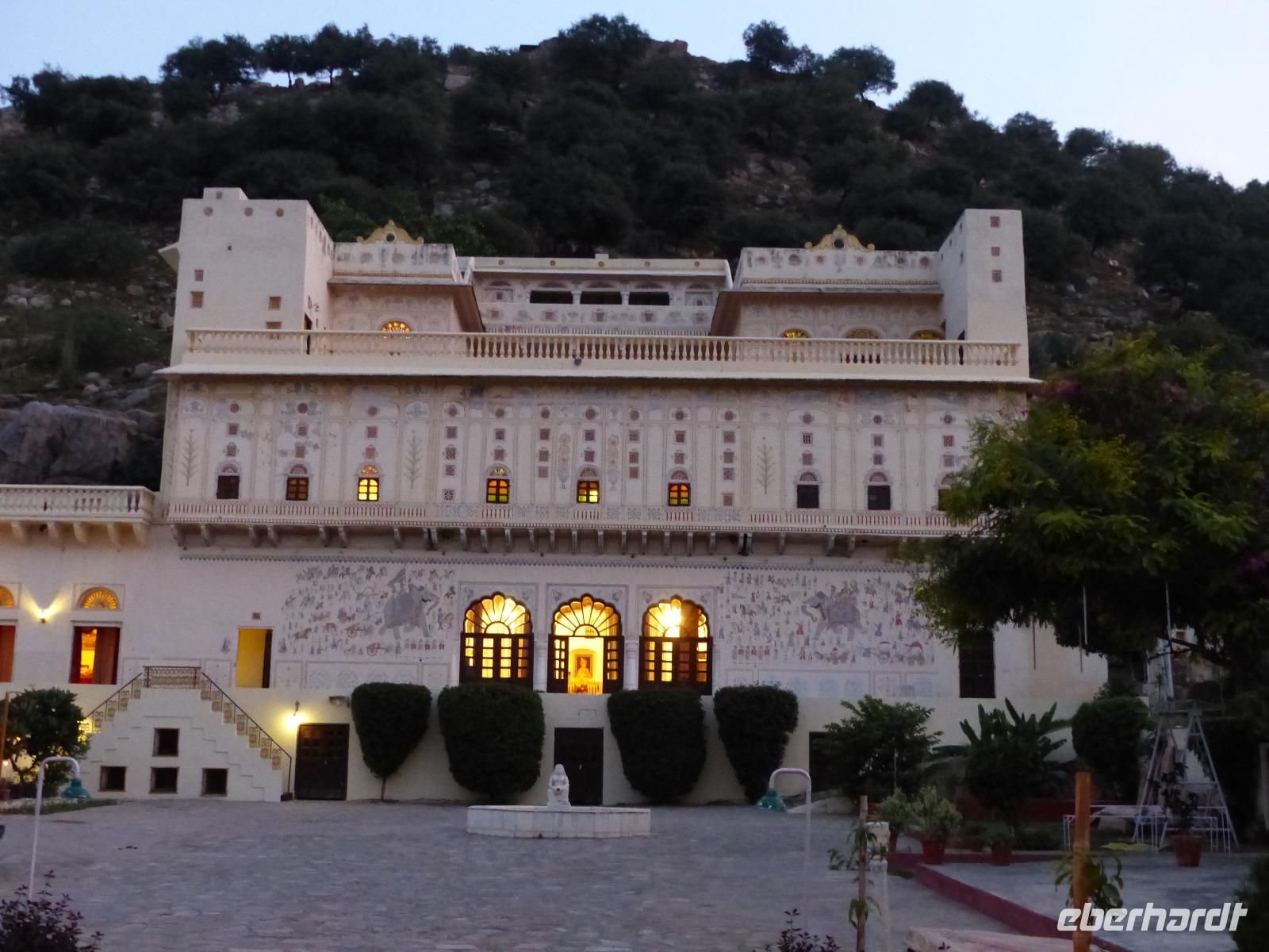 Nach einem ersten Frühstück in Indien verlassen wir vorerst Delhi und beginnen unsere Reise nach Kalwar, einer kleinen Stadt mit Dorfcharakter in der Nähe von Jaipur. Schon nach den ersten Metern Fahrt überwältigt uns der ganz normale Wahnsinn auf Indiens Straßen. Nicht nur Mopeds drängeln sich durch, auch Kühe überqueren die Straße - und Straßenmarkierungen werden sowie völlig überbewertet. Sicher und mit dem ein oder anderen Hubsignal manövriert uns unser Fahrer aus der Stadt direkt auf den Highway. Sandeep, unser Reiseleiter, erzählt uns die ersten Geschichten und auch ein typischer Mittagssnack darf nicht fehlen - Naanbrot, mit Käse oder Knoblauch, dazu Masala Tee oder sogar das erste indische Bier - Kingfisher, stehen auf unserer Speisekarte. Am späten Nachmittag, etwa 2 Stunden später als geplant - wer hätte das bei diesem Verkehr gedacht ;) - erreichen wir unser Hotel in Kalwar. Eine Hotelanlage fast für uns allein, in der bis heute die Zeit fast stehengeblieben scheint. Nicht nur die Bilder erinnern an die Zeit der Maharadjas, sondern auch wunderschöne Zeichnungen am Hauptgebäude. Nach etwas Zeit zum frisch machen, begeben wir uns auf einen kleinen Spaziergang durch die Stadt. Wir sind erstaunt mit welcher natürlichen Herzlichkeit wir empfangen werden. Es ist sogar fraglich wer sich mehr über diesen Besuch freut - wir oder die Bewohner dieser Stadt? Bei unserem Bummel kommen wir auch bei einer Familie vorbei, welche Tongefäße herstellt. Als wäre es selbstverständlich, wird die Maschine noch einmal angeworfen, und uns die Tätigkeit, welcher hier tagtäglich nachgegangen wird, vorgeführt. Neugierige Kinderaugen schauen interessiert durch das Grundstückstor der Familie. Als wir dann wieder in unserem kleinen Palast ankommen, wartet schon das Abendessen auf uns. Bei angenehmen Temperaturen lassen wir uns die indische Küche schmecken und genießen das Ambiente. Ein erster schöner Tag in Indien neigt sich dem Ende.