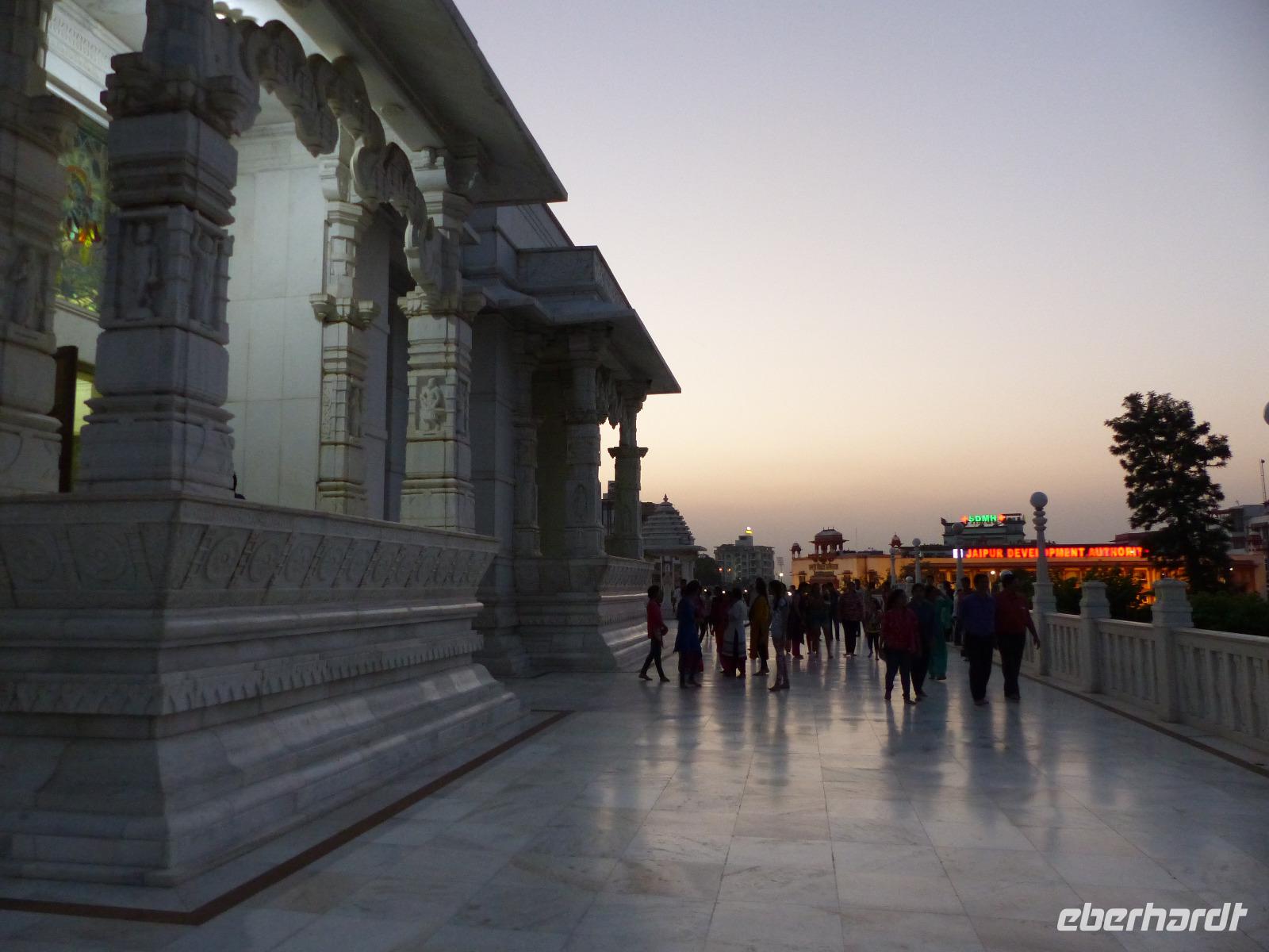 Nach einem kleinen Frühstück und nicht allzu früh setzen wir unsere Reise fort - nach Jaipur, der Hauptstadt Rajasthan's. Mit Ankunft in der „Pink City" wie Jaipur aufgrund der vielen rot angemalten Häuser auch genannt wird, suchen wir zu allererst eine Wechselstube auf und begeben uns dann in den alten Teil der Stadt. Hier schlendern wir an kleinen Verkaufsständen entlang und lassen uns im Anschluss auf eine erste Rikscha-Fahrt ein. Am Hauptbasar und dem Palast der Winde vorbei, bis zum Stadtpalast und zurück- ein aufregendes Erlebnis ;) Durch etwas freie Zeit im Anschluss, fahren wir zu unserem Hotel, checken ein und haben hier die Möglichkeit uns alle etwas frisch zu machen. Am frühen Nachmittag geht es weiter - eine Mittagspause und der Besuch des Palast Kinos Raj Mandir stehen auf dem Programm. Das doch recht moderne Kino überrascht uns alle - die Ausstattung steht den unseren Kinos in nichts nach! Bei einem aktuellen Film über Cricket mit dem Spieler M.S. Dhoni in der Hauptrolle, lassen wir uns in die indische Kinowelt entführen. Im Anschluss beschließen wir kurzer Hand, noch eine Manufaktur für Kunsthandwerk zu besuchen. Hier wird uns gezeigt, wie Holzstempel zum Bedrucken von Baumwolltüchern verwendet werden- natürlich darf ein kurzes einkaufen nicht fehlen. Kurz bevor es dunkel wird, wartet noch eine kleine Überraschung auf uns - wir besuchen den Birla Tempel, ein hinduistischer Tempel welcher in weißem Marmor erstrahlt. Zur Tempelschließungszeremonie sind wir dabei, wie ein Priester diese abhält. Geweiht mit heiligem Wasser des Ganges, genießen wir anschließend unser Abendessen in einem Restaurant in der Stadt. Leider können wir der dazu gedachten Musik nur im Anschluss lauschen, da aufgrund von Hygienebestimmungen, das Essen nach innen verlagert wurde. Gut gesättigt kehren wir zu unserem Hotel zurück und einer angenehmen Nachtruhe steht nichts mehr im Wege.