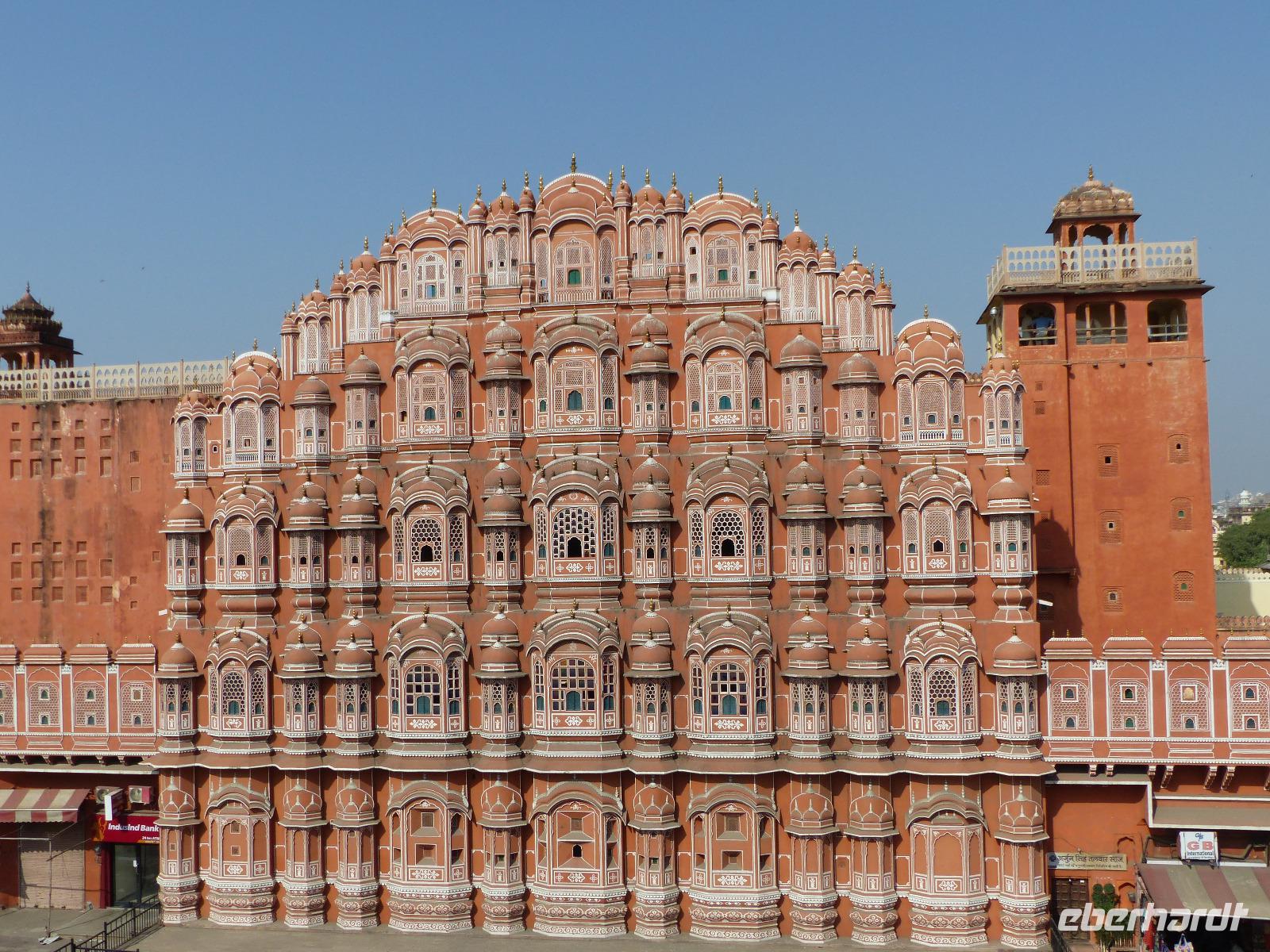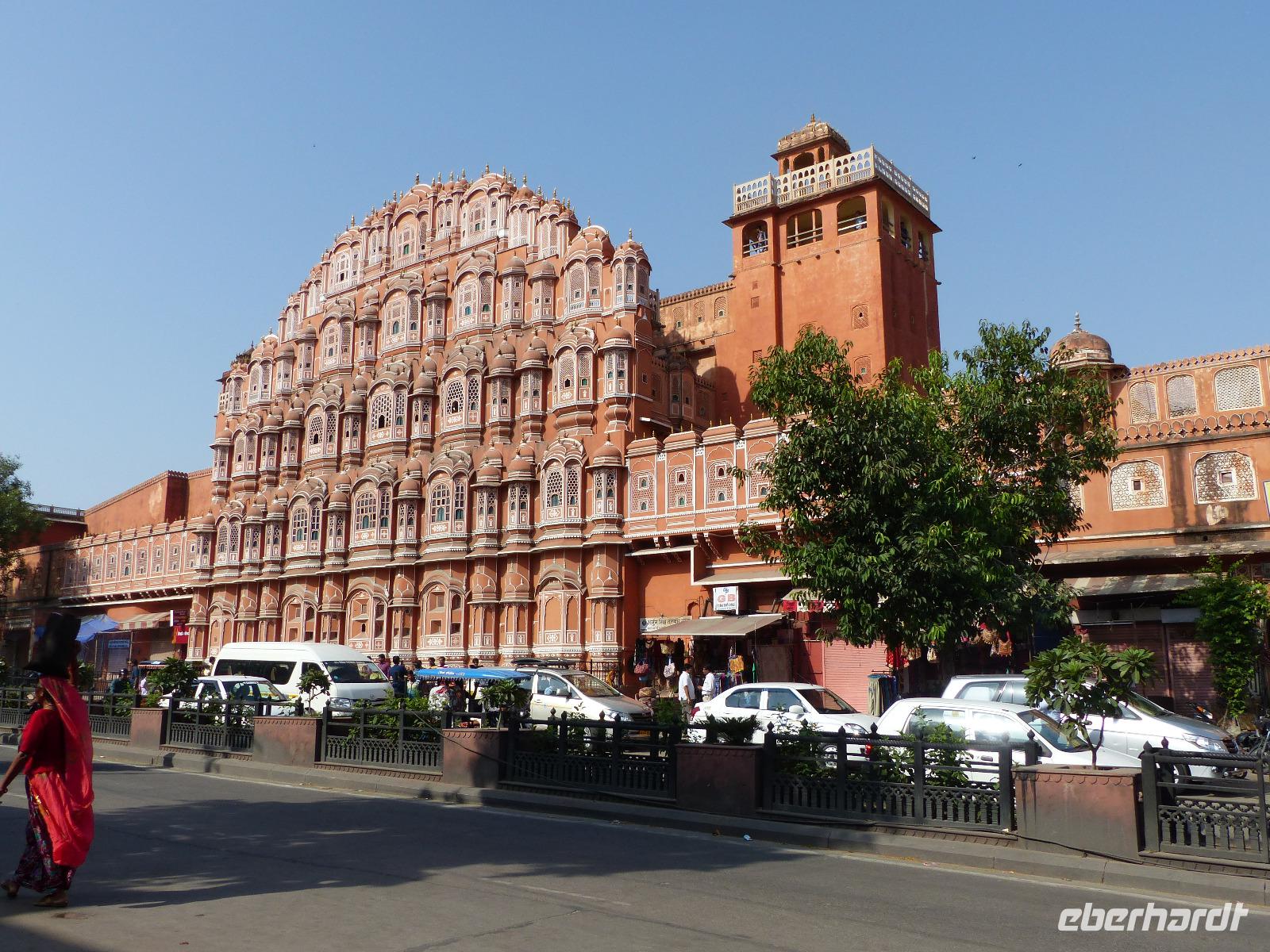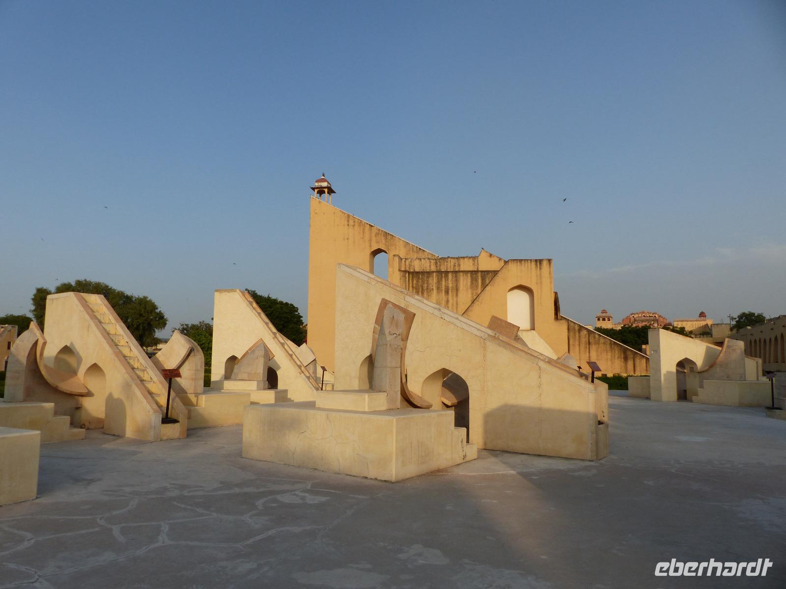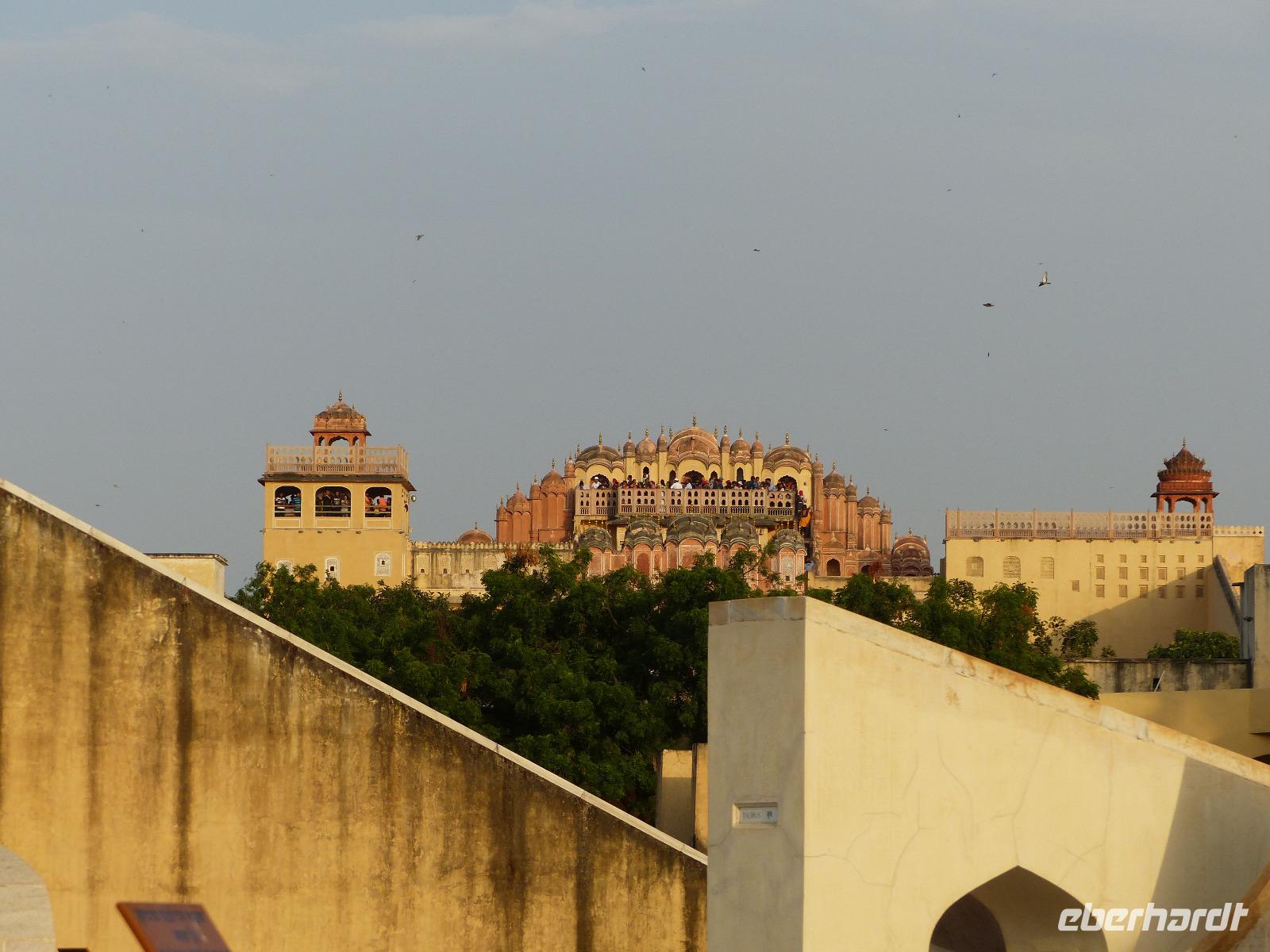 Guten Morgen Jaipur! Heute machen wir uns auf den Weg zum ca. 11km entfernten Amber Fort. Doch bevor wir die Stadt verlassen, halten wir noch für einen kurzen Fotostopp am Hawa Mahal, welche auch als Palast der Winde bekannt ist. Das Sonnenlicht ist ideal am Morgen und von einer gegenüberliegenden Terrasse können wir eine schöne Aufnahme dieser fünfstöckigen Fassade mit unserer Kamera festhalten. Da immer noch das 9-tägige Fest anhält, ist es uns im Anschluss nicht möglich das Amber Fort auf dem Rücken eines Elefanten zu erklimmen. Hingegen fahren wir in ein nahegelegenes Dorf, in dem die Mahouts mit ihrer Familie und den Elefanten leben. Umsingelt von Händlern (welche auch eine Bierbestellung möglich machen ;)) reiten wir am Rande des Dorfes vorbei, bevor wir dann zu Fuß die Festung mit ihrer typisch rajputischen Architektur besuchen. Mit vielen Indern gemeinsam besichtigen wir die Anlage, wo wir gespannt Sandeeps Erzählungen lauschen und anhand von vielen kleinen Details die Synthese von muslimischer und hinduistischer Architektur wunderbar erkennen können. Auf dem Rückweg nach Jaipur halten wir am Wasserpalast und nehmen eine kleine Stärkung zu uns. Im wahrsten Sinne des Wortes werden wir auf der kurzen Fahrt im Bus verzaubert - ein kleiner Junge führt uns kleine Zaubertricks vor. Zurück im alten Stadtzentrum von Jaipur, besuchen wir zuerst den Stadtpalast, welcher heute anteilig für die Öffentlichkeit zugänglich ist aber auch von den Nachfahren der Herrscherfamilie bewohnt wird. Da wir es bereits kurz vor 17 Uhr haben, geht es im Schnellschritt weiter in das gegenübergelegene Freiluftobservatorium Jantar Mantar, welches nicht nur in Indien von den fünf durch Udai Singh errichteten am beeindruckendsten ist, sondern auch weltweit als größtes steinernes Observatorium gilt. Etwas geschafft kehren wir in unser Hotel zurück und lassen uns im Anschluss das leckere Buffet im Hotelrestaurant schmecken.