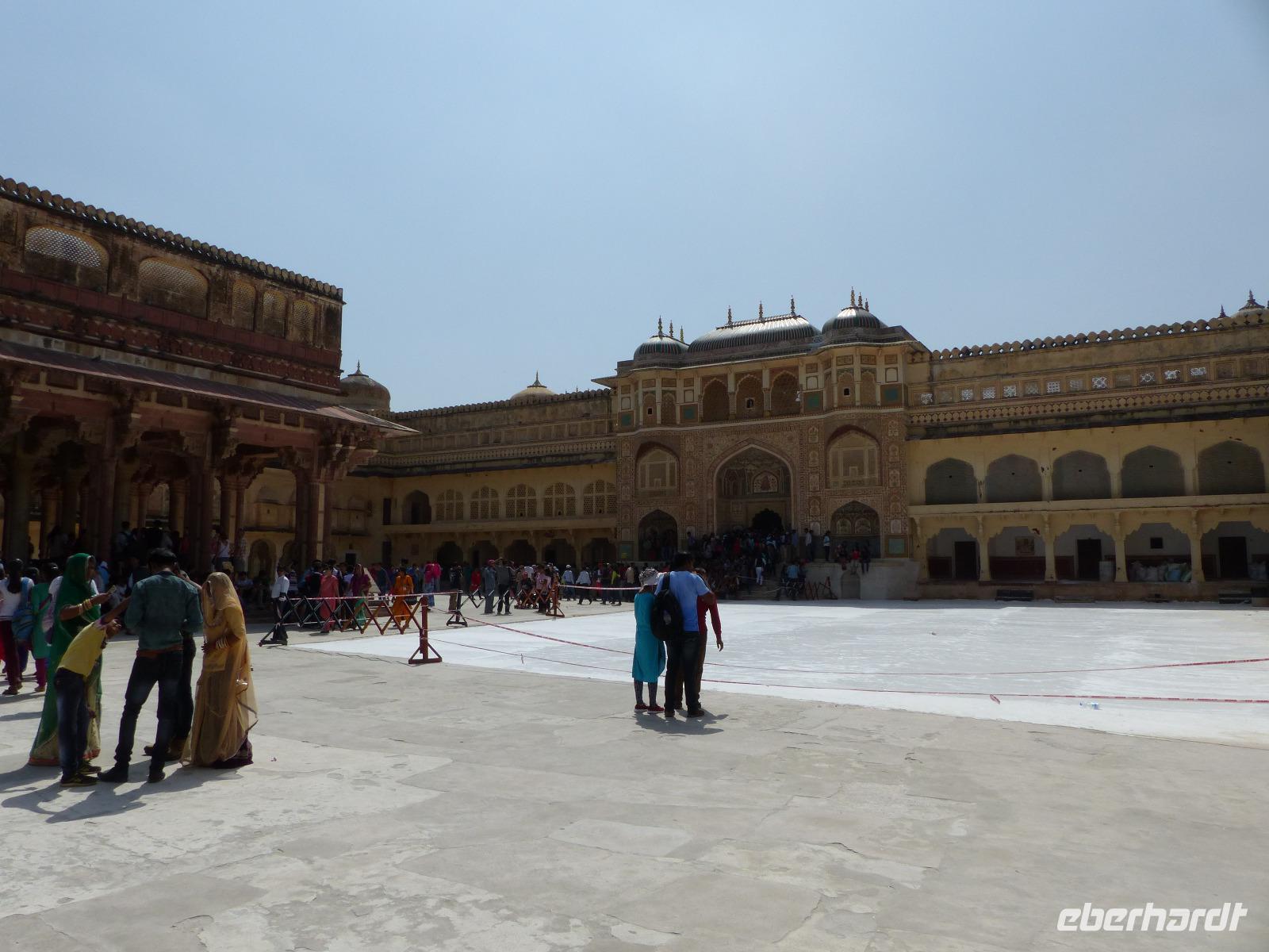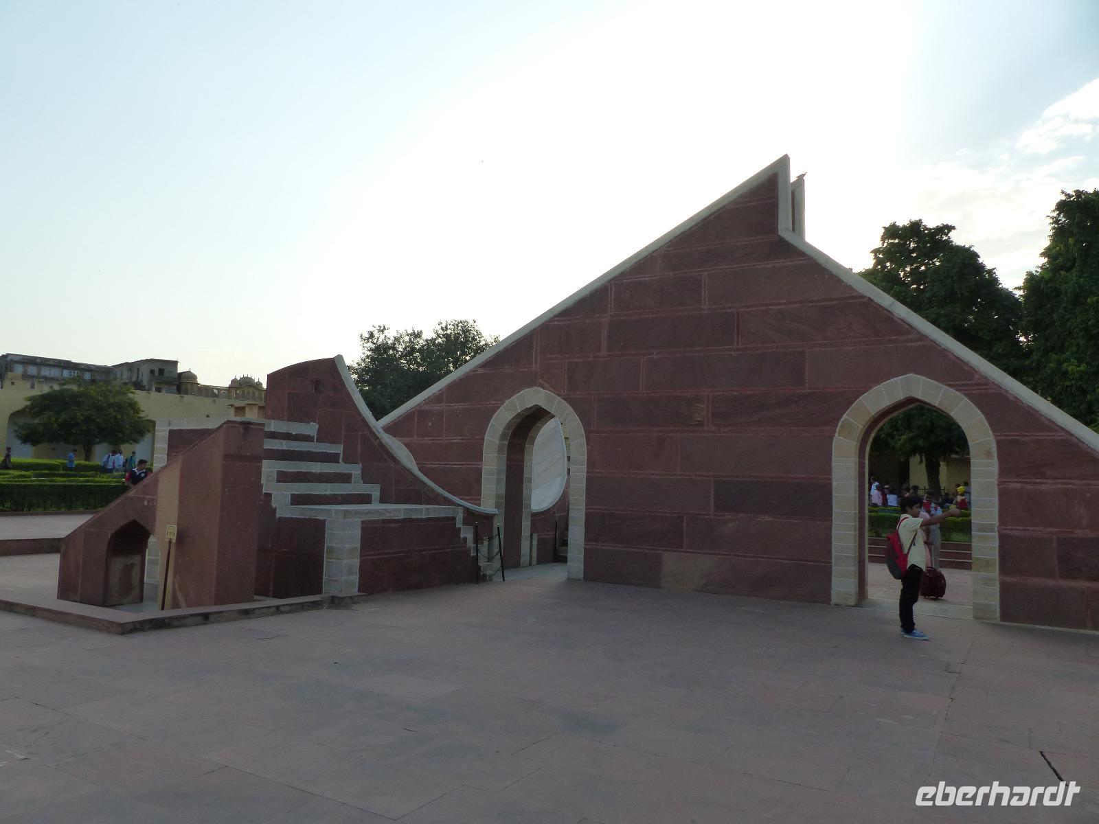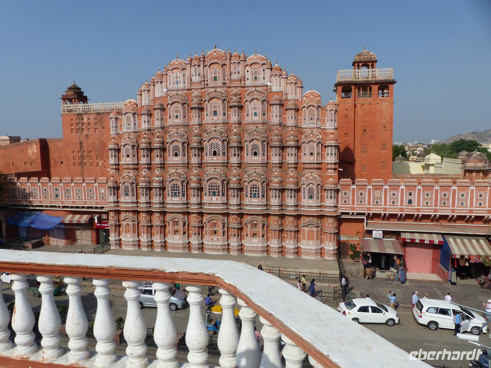 Guten Morgen Jaipur! Heute machen wir uns auf den Weg zum ca. 11km entfernten Amber Fort. Doch bevor wir die Stadt verlassen, halten wir noch für einen kurzen Fotostopp am Hawa Mahal, welche auch als Palast der Winde bekannt ist. Das Sonnenlicht ist ideal am Morgen und von einer gegenüberliegenden Terrasse können wir eine schöne Aufnahme dieser fünfstöckigen Fassade mit unserer Kamera festhalten. Da immer noch das 9-tägige Fest anhält, ist es uns im Anschluss nicht möglich das Amber Fort auf dem Rücken eines Elefanten zu erklimmen. Hingegen fahren wir in ein nahegelegenes Dorf, in dem die Mahouts mit ihrer Familie und den Elefanten leben. Umsingelt von Händlern (welche auch eine Bierbestellung möglich machen ;)) reiten wir am Rande des Dorfes vorbei, bevor wir dann zu Fuß die Festung mit ihrer typisch rajputischen Architektur besuchen. Mit vielen Indern gemeinsam besichtigen wir die Anlage, wo wir gespannt Sandeeps Erzählungen lauschen und anhand von vielen kleinen Details die Synthese von muslimischer und hinduistischer Architektur wunderbar erkennen können. Auf dem Rückweg nach Jaipur halten wir am Wasserpalast und nehmen eine kleine Stärkung zu uns. Im wahrsten Sinne des Wortes werden wir auf der kurzen Fahrt im Bus verzaubert - ein kleiner Junge führt uns kleine Zaubertricks vor. Zurück im alten Stadtzentrum von Jaipur, besuchen wir zuerst den Stadtpalast, welcher heute anteilig für die Öffentlichkeit zugänglich ist aber auch von den Nachfahren der Herrscherfamilie bewohnt wird. Da wir es bereits kurz vor 17 Uhr haben, geht es im Schnellschritt weiter in das gegenübergelegene Freiluftobservatorium Jantar Mantar, welches nicht nur in Indien von den fünf durch Udai Singh errichteten am beeindruckendsten ist, sondern auch weltweit als größtes steinernes Observatorium gilt. Etwas geschafft kehren wir in unser Hotel zurück und lassen uns im Anschluss das leckere Buffet im Hotelrestaurant schmecken.