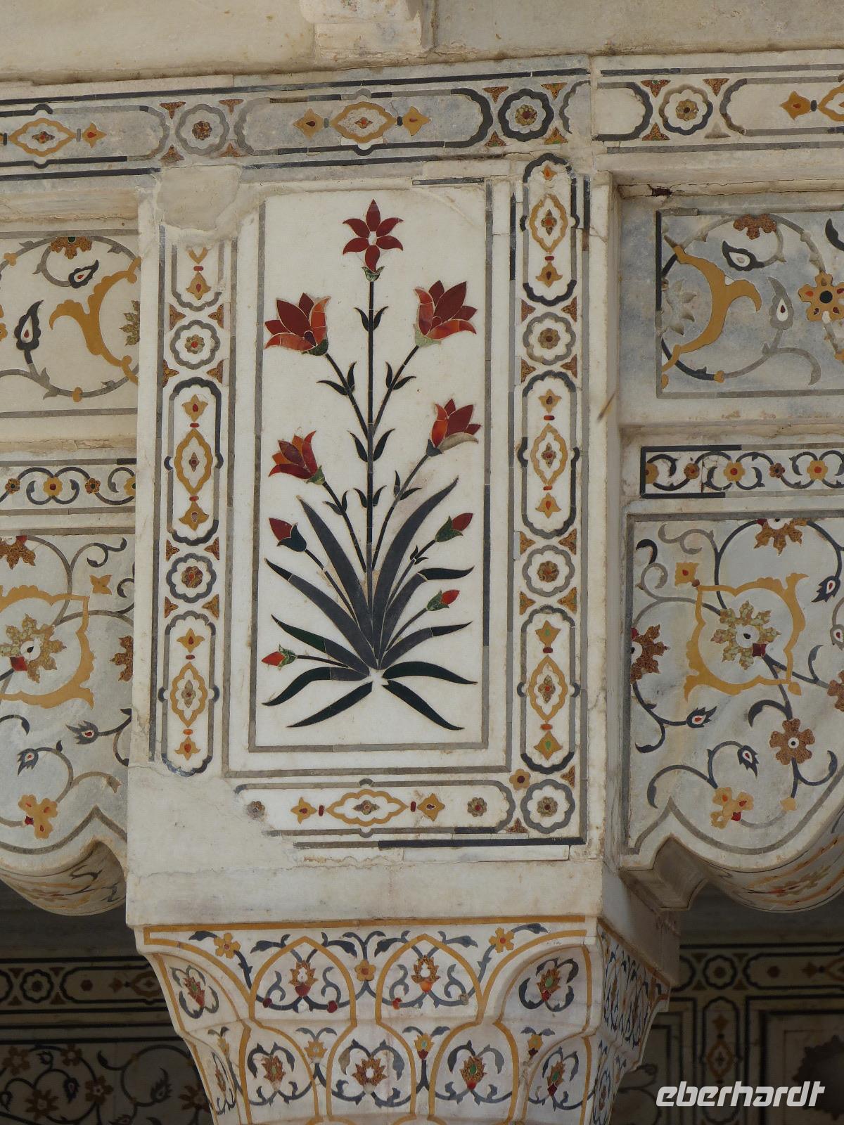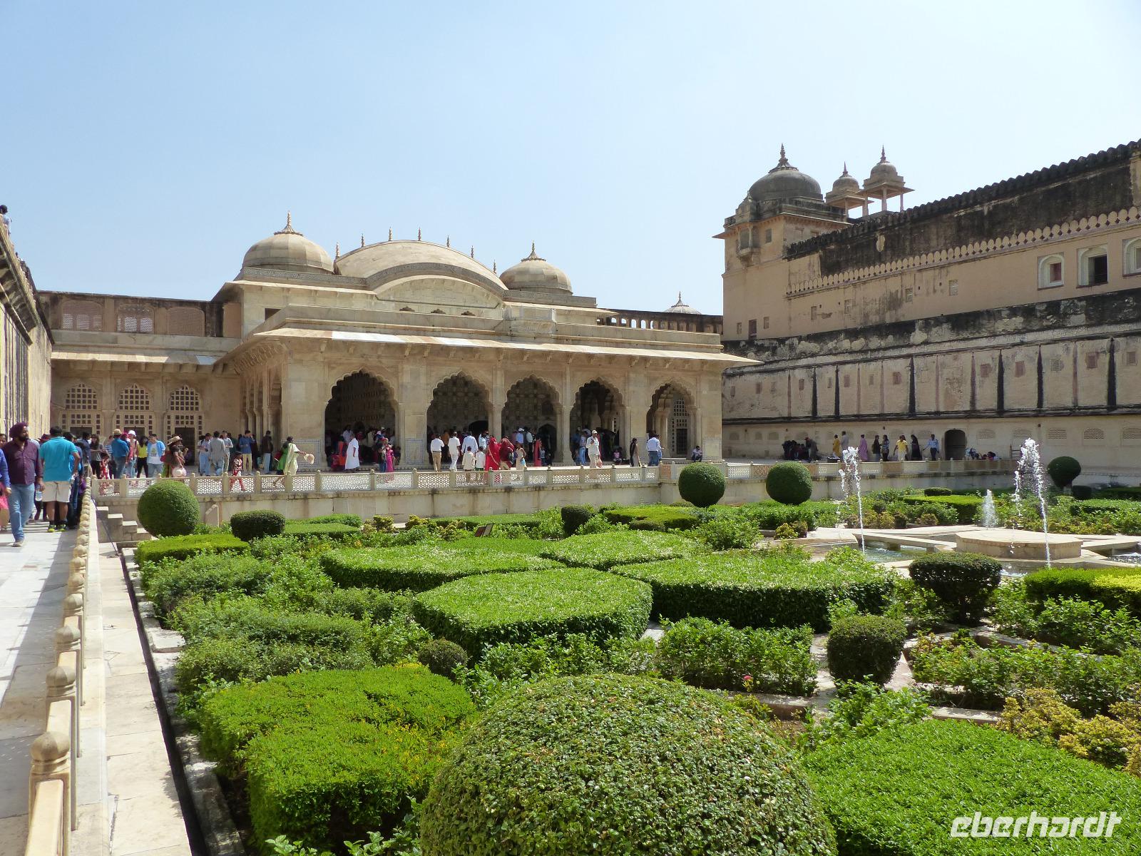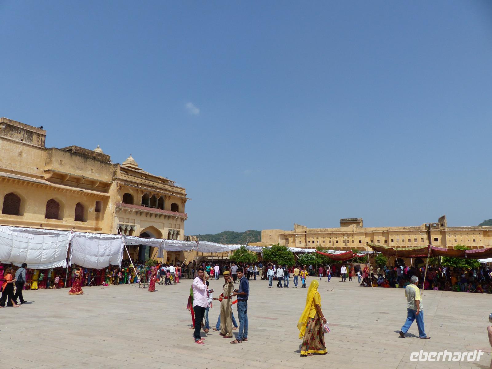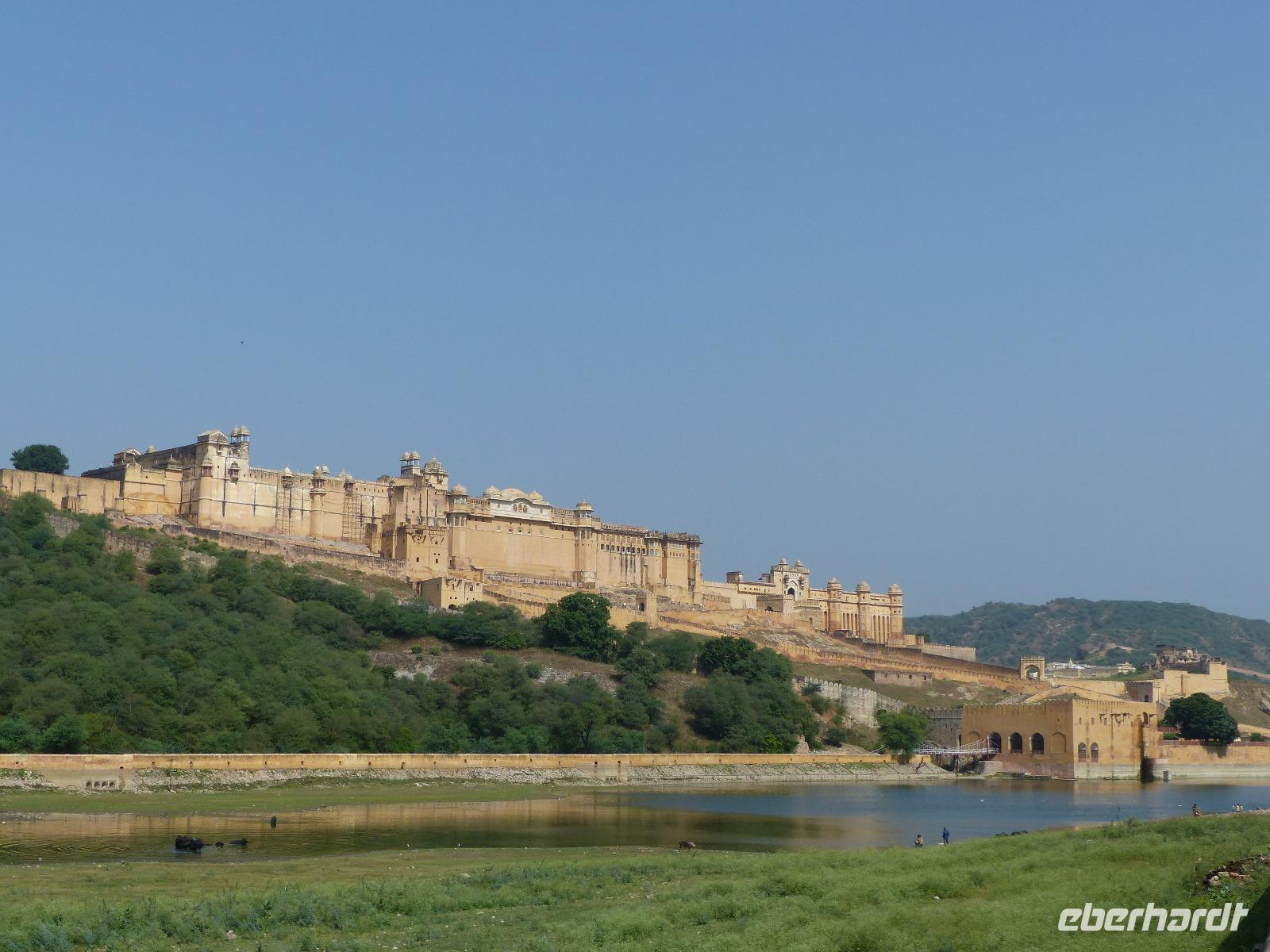 Guten Morgen Jaipur! Heute machen wir uns auf den Weg zum ca. 11km entfernten Amber Fort. Doch bevor wir die Stadt verlassen, halten wir noch für einen kurzen Fotostopp am Hawa Mahal, welche auch als Palast der Winde bekannt ist. Das Sonnenlicht ist ideal am Morgen und von einer gegenüberliegenden Terrasse können wir eine schöne Aufnahme dieser fünfstöckigen Fassade mit unserer Kamera festhalten. Da immer noch das 9-tägige Fest anhält, ist es uns im Anschluss nicht möglich das Amber Fort auf dem Rücken eines Elefanten zu erklimmen. Hingegen fahren wir in ein nahegelegenes Dorf, in dem die Mahouts mit ihrer Familie und den Elefanten leben. Umsingelt von Händlern (welche auch eine Bierbestellung möglich machen ;)) reiten wir am Rande des Dorfes vorbei, bevor wir dann zu Fuß die Festung mit ihrer typisch rajputischen Architektur besuchen. Mit vielen Indern gemeinsam besichtigen wir die Anlage, wo wir gespannt Sandeeps Erzählungen lauschen und anhand von vielen kleinen Details die Synthese von muslimischer und hinduistischer Architektur wunderbar erkennen können. Auf dem Rückweg nach Jaipur halten wir am Wasserpalast und nehmen eine kleine Stärkung zu uns. Im wahrsten Sinne des Wortes werden wir auf der kurzen Fahrt im Bus verzaubert - ein kleiner Junge führt uns kleine Zaubertricks vor. Zurück im alten Stadtzentrum von Jaipur, besuchen wir zuerst den Stadtpalast, welcher heute anteilig für die Öffentlichkeit zugänglich ist aber auch von den Nachfahren der Herrscherfamilie bewohnt wird. Da wir es bereits kurz vor 17 Uhr haben, geht es im Schnellschritt weiter in das gegenübergelegene Freiluftobservatorium Jantar Mantar, welches nicht nur in Indien von den fünf durch Udai Singh errichteten am beeindruckendsten ist, sondern auch weltweit als größtes steinernes Observatorium gilt. Etwas geschafft kehren wir in unser Hotel zurück und lassen uns im Anschluss das leckere Buffet im Hotelrestaurant schmecken.