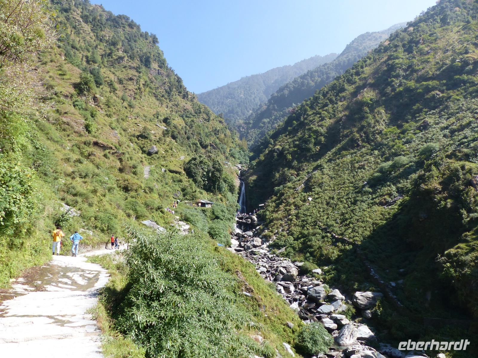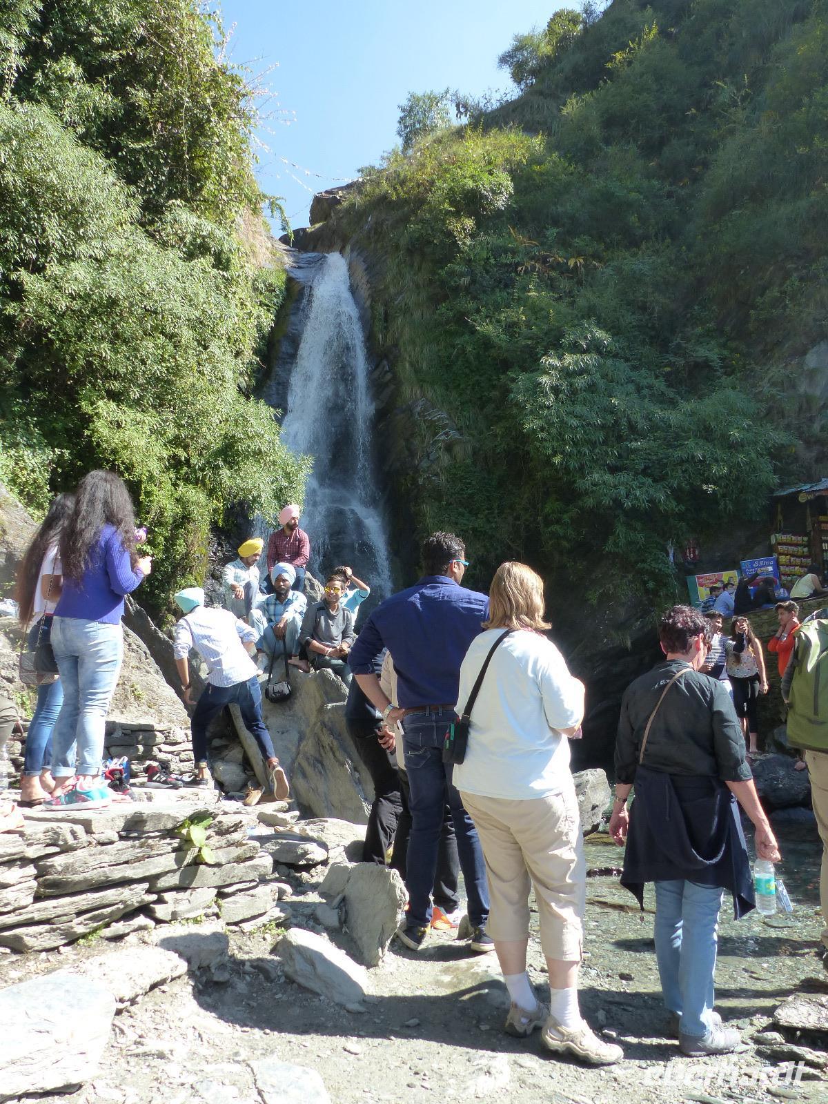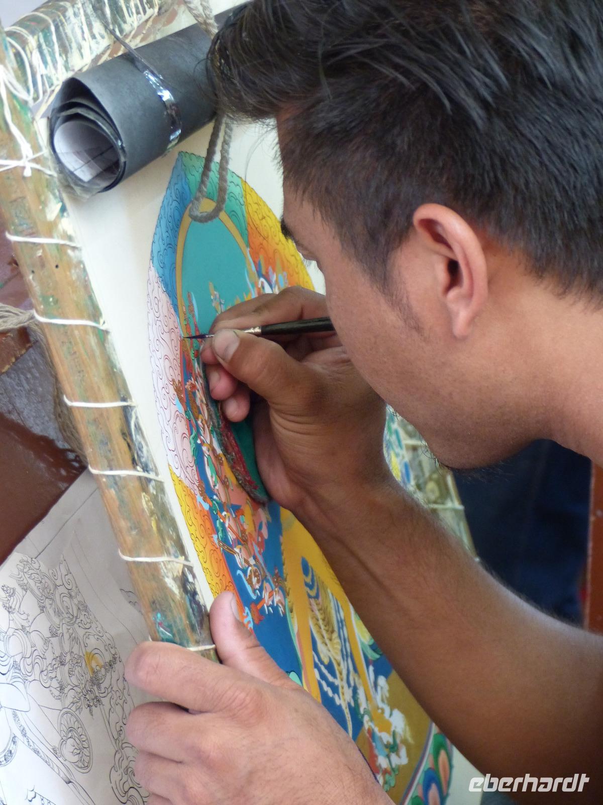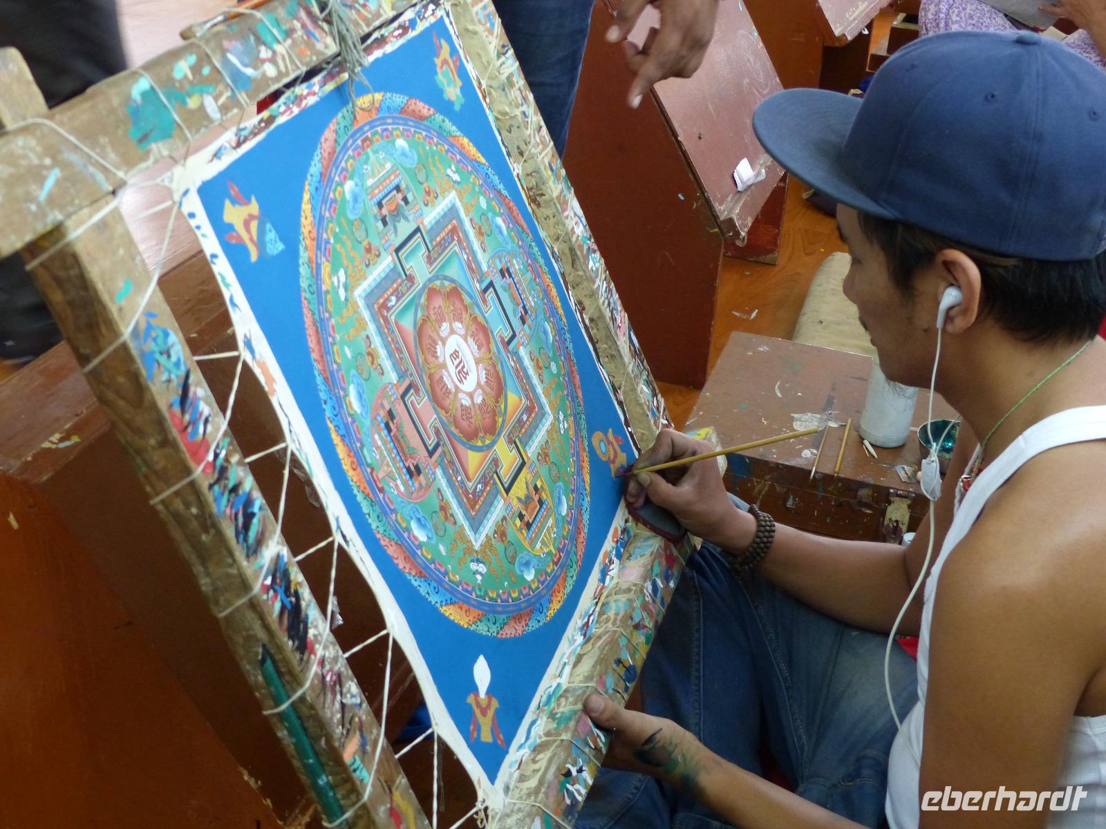 Die nächsten beiden Tage stehen ganz im Zeichen des tibetischen Buddhismus und die Bedeutung Dharamsalas als britisch Hill Station. Wir beginnen unseren Aufenthalt in den Bergen mit dem Besuch einer kleinen Schule, welche sich direkt im Nachbarort von McLeodganj befindet. Die kleinen Kinder - nicht älter als 6 Jahre, haben sich gerade im Hof aufgestellt und so werden wir mit fröhlichen Liedern begrüßt. Da wir heute ein Geburtstagskind in der Gruppe haben, gibt Sandeep diese Information an die Kleinen weiter. Mit einer seitlichen Bewegung des Kopfes, geben die Kinder jeweils ihr Einverständnis zur Geltung und wir singen gemeinsam „Happy Birthday". Nach diesem süßen Kennenlernen verabschieden wir uns wieder und beginnen nach einem anschließenden Tempelbesuch eine kleine Wanderung. Der Weg führt uns zu einem Wasserfall, wo wir unsere Füße im kalten Nass erfrischen können. Nach den kühlen Temperaturen Morgen, ist es jetzt wieder durch die warmen Sonnenstrahlen sehr angenehm. Nach einer kleinen Essenspause fahren wir zu unserem Hotel zurück und begeben uns von da zum Tempel und gleichzeitig der Residenz des Dalai Lama. Wir sind erstaunt wie schlicht alles gehalten ist, aber auch glücklich die Anlage besuchen zu dürfen. Leider hält sich der Dalai Lama selbst aktuell in Europa auf, sodass ein Treffen leider nicht möglich ist ;). Bevor wir am Abend über den Markt schlendern und in angenehmer Atmosphäre Souvenirs kaufen, nehmen wir noch eine kleine Stärkung zu uns und üben uns bei einem Workshop für Thangka Malerei. Diese alte Tibetische Kunst beeindruckt uns sehr und verdeutlich beim selber ausprobieren, wie aufwendig und mühsam so ein Gemälde entsteht.