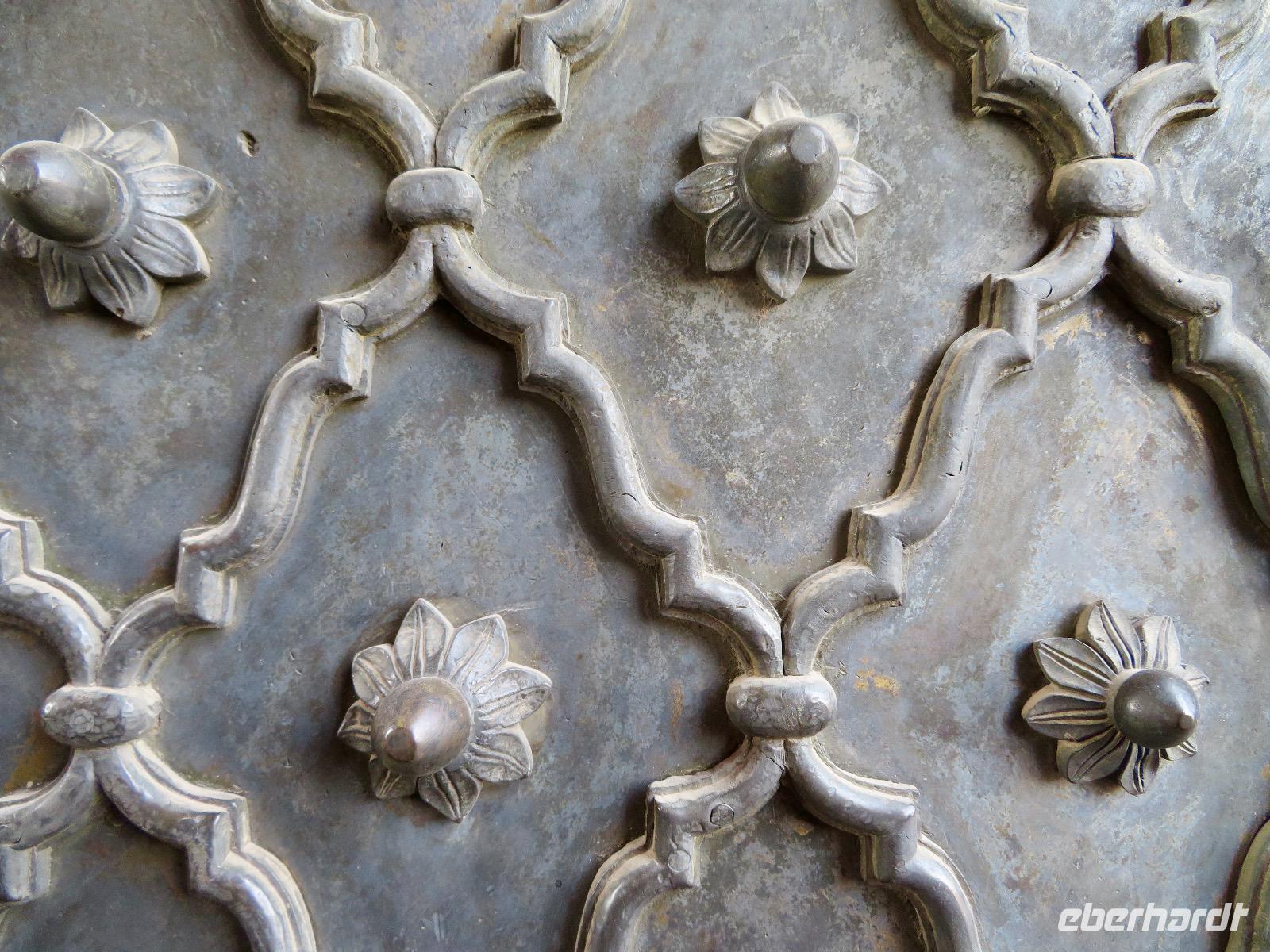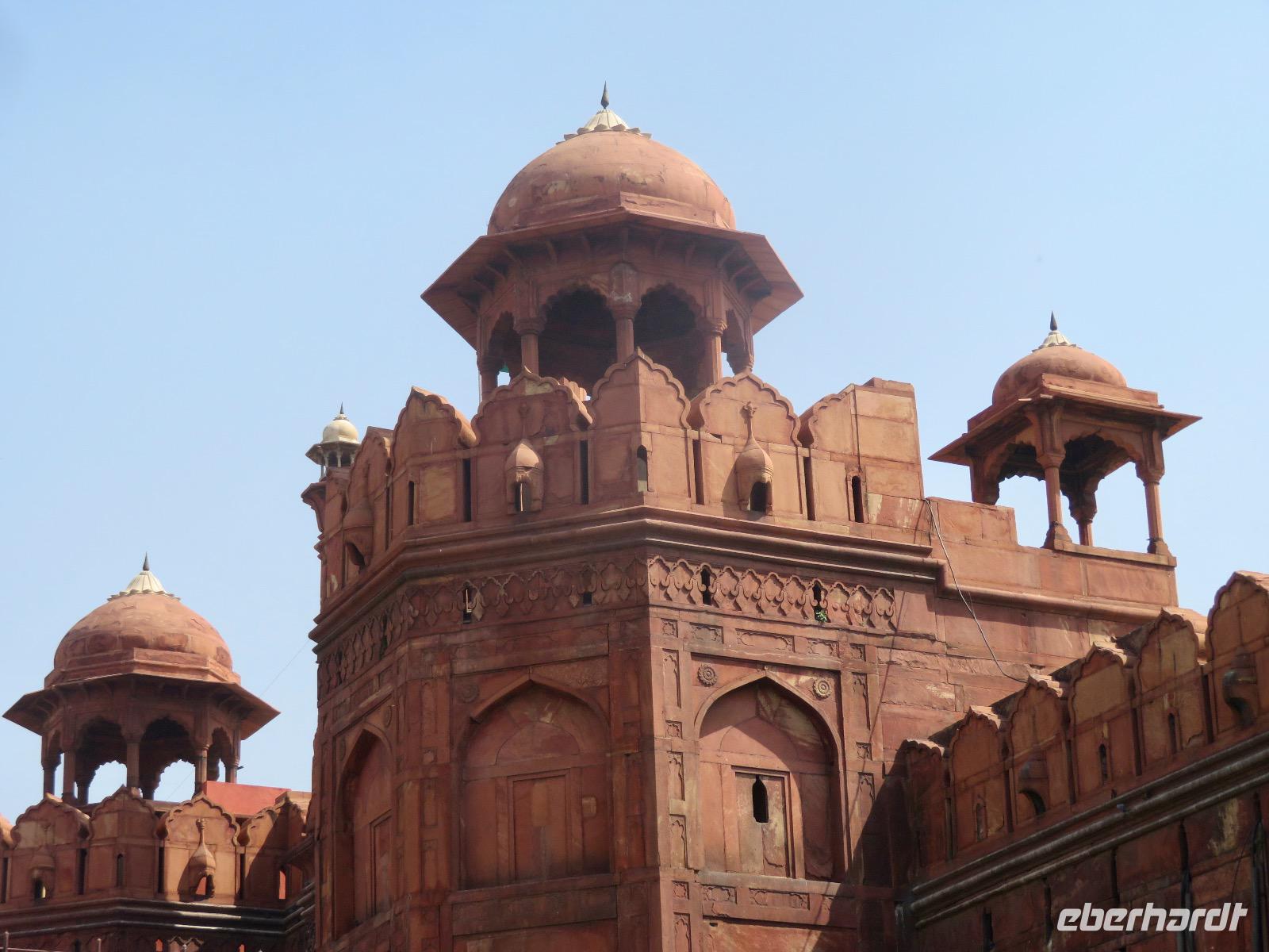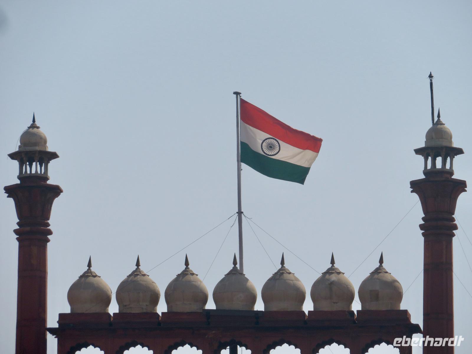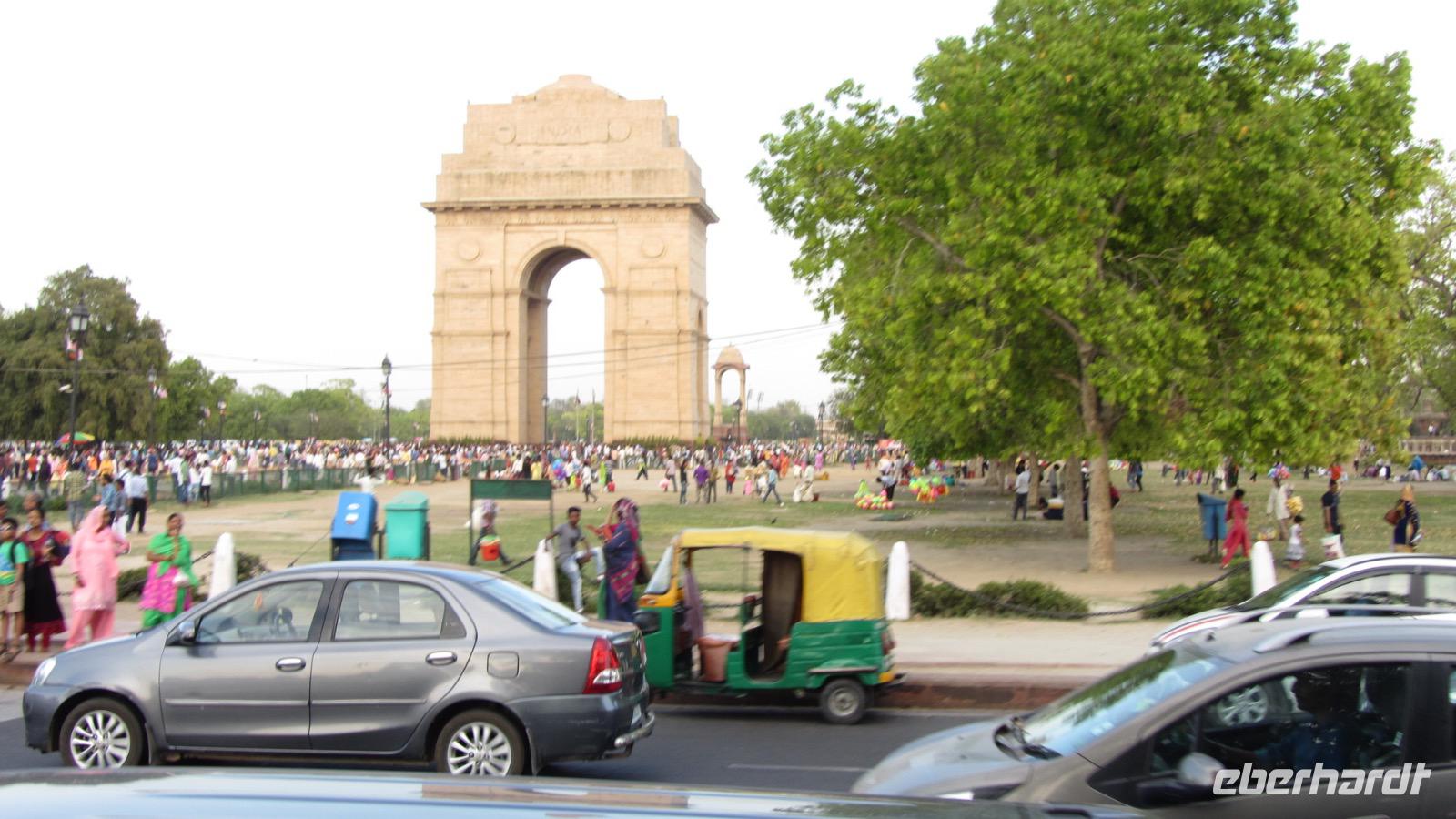 Symmetrisch liegen sie hier im Regierungsviertel. Der Reisebus gibt drei Runden aus, um die die Paläste des Präsidenten und des Vizepräsidenten sowie dem gewaltigen Rundbau des Parlamentsgebäudes von Indien zu sehen. Genau eine englische Meile lang ist die von hier ausgehende Paradestraße, die am berühmten India-Gate endet. An diesem 42 m hohen Triumphbogen ist immer etwas los, es drängen sich Schaulustige, schlendern Familien mit ihren Kindern, bieten Händler Snacks, Spielzeug und allerlei Kleinigkeiten feil. Schnell erhaschen wir aus dem Bus heraus ein Erinnerungsfoto, falls nicht ein anderer Bus genau in dieser Sekunde vor unserer Kamera fährt. Unter dem Bogen befindet sich Neu Delhis vielleicht bekanntestes und umdrängtestes Monument. Es wurde 1921 vom damals berühmten englischen Architekten Sir Edwin L. Lutyens entworfen - zum Gedenken an die Inder, die im ersten Weltkrieg gefallen waren. Daher sind im Inneren des torähnlichen Bauwerkes 90.000 Namen eingraviert und es befindet sich das „Grab des unbekannten" Soldaten mit ewiger Flamme - gemeinsam bewacht von Soldaten aller Waffengattungen der indischen Berufsarmee.