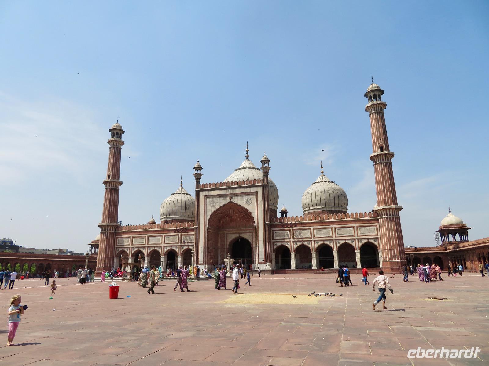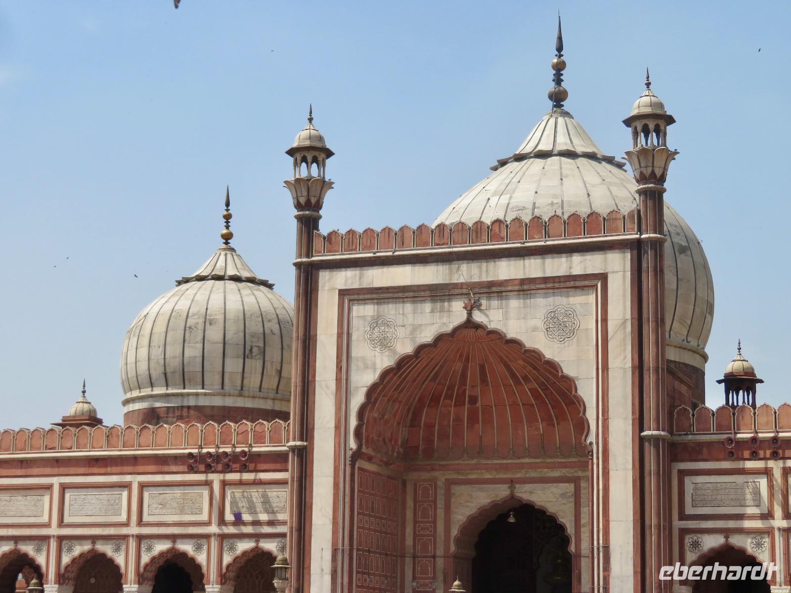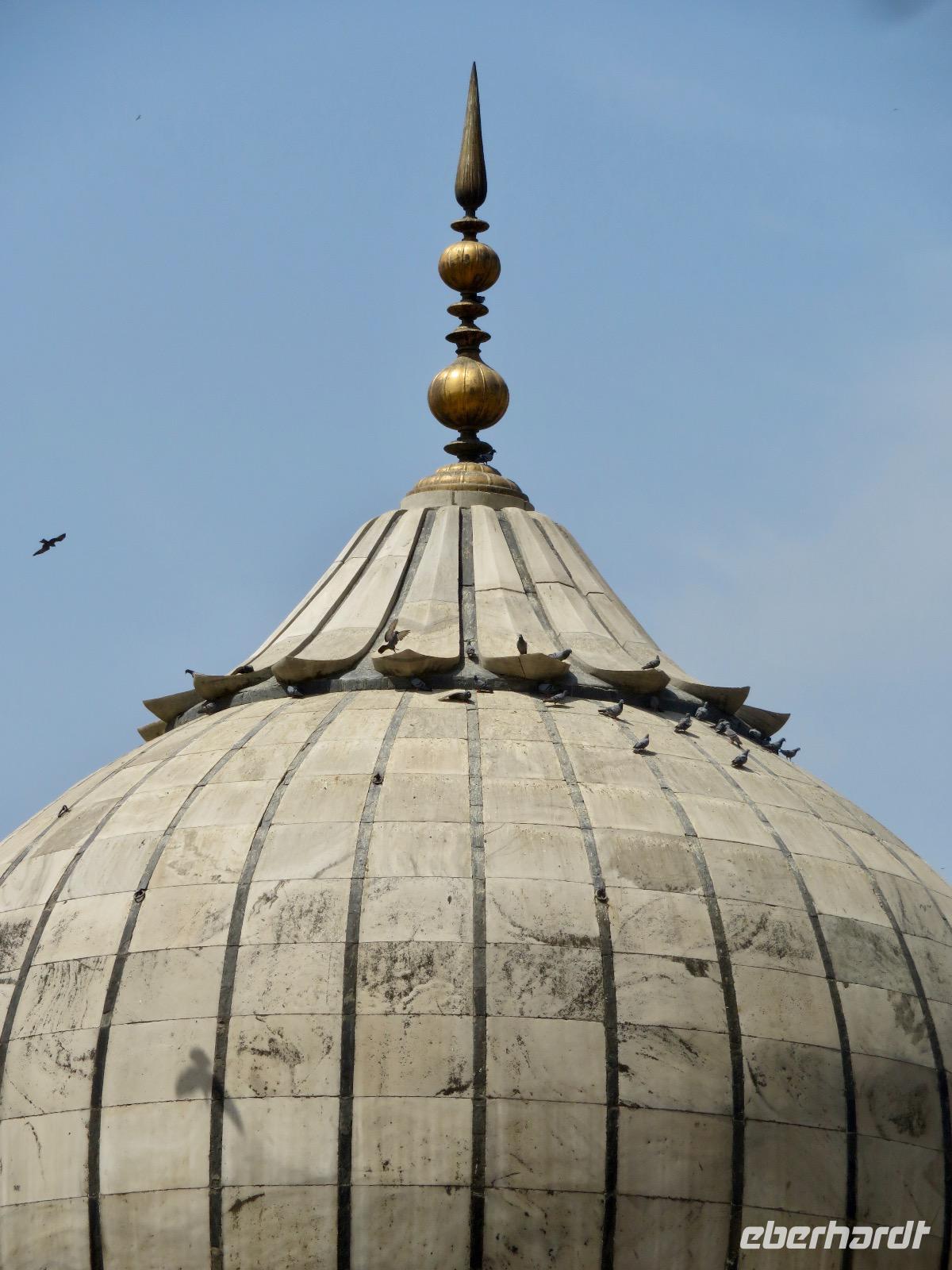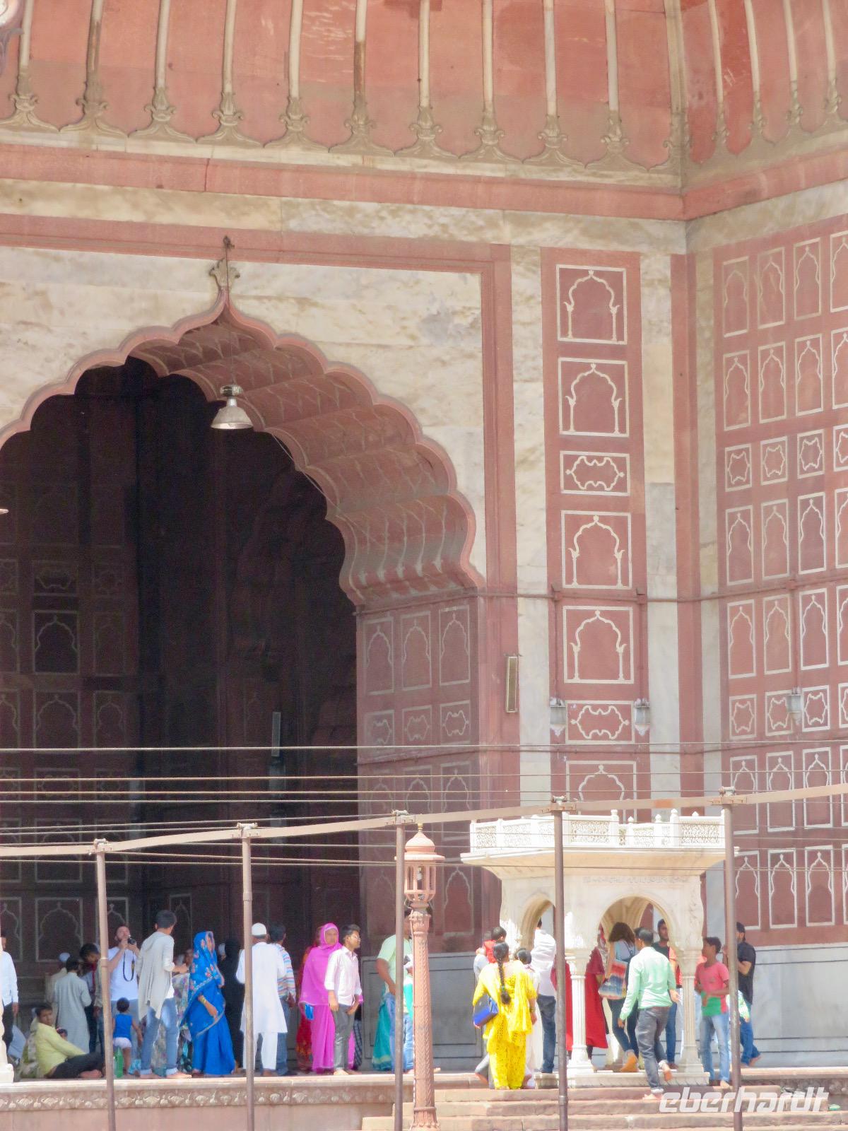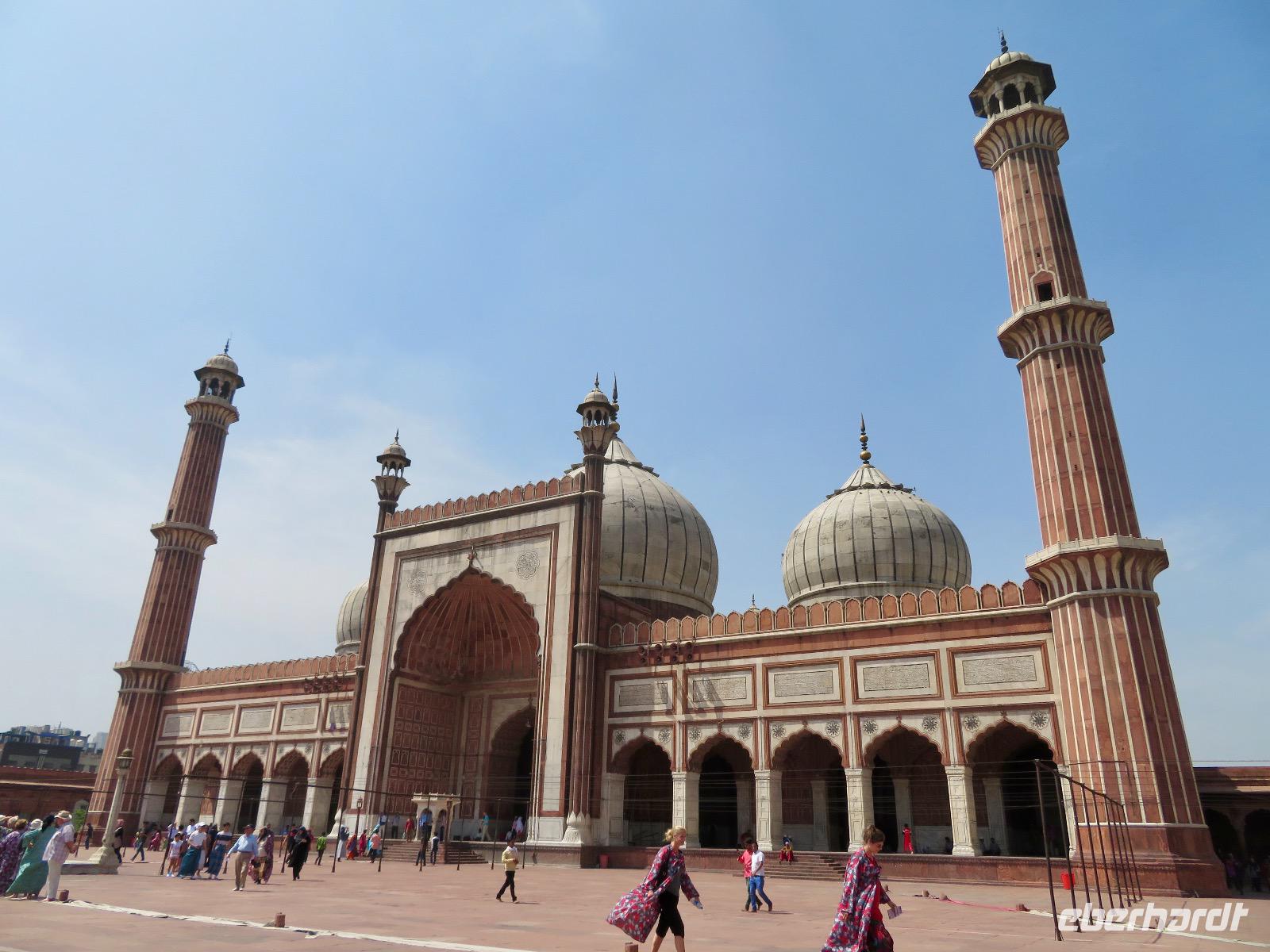 Die erste Nacht im unbekannten Bett war nicht für alle gleichermaßen erholsam. Doch wir sind neugierig auf dieses Land und stecken die Müdigkeit weg. Es tolles Abenteuer steht uns bevor. Dei der bedeutendsten Sehenswürdigkeiten Alt- und Neu-Delhis wollen wir entdecken. Heute ist Samstag und unser Bus bringt uns durch den „nicht ganz so wilden" Verkehr nach Alt-Delhi. - In unserem europäischen Verkehrshorizont von „nicht ganz so wild" keine Spur. Erster Stopp erfolgt am Roten Fort. Hier wechseln wir das Verkehrsmittel. Es sind Rikschas für uns organisiert, die für einen unvergesslichen, persönlichen und hautnahen Kontakt mit dem indischen Verkehr sorgen. Durch durch die engen Gassen schieben wir uns vorbei an hunderten von Menschen, heiligen Kühen, links und rechts hupte es von Rikschas, Tuk Tuks, Autos ... wow .. welch eine andere Welt, aber wir geniessen sie in vollen Zügen. Wir überleben die Fahrt durch dieses berühmte Bollywoodviertel bis hin zur Freitagsmoschee mit breitem Grinsen. Mit besonders farbenfrohen Kleidern ausgestattet, besichtigen wir das riesige Areal. Weiter vorbei an den verrückt gezogenen Elektrokabeln erreichen wir die Mahatma Gandhi Gedenkstätte. Ein privater Bänker kommt zu uns in den Bus und versorgt uns mit etwas Kapital in der Landeswährung Rupie. Das erspart uns langes Anstehen an den Banken und außerdem dürften wir offiziell nach der Währungsreform täglich nur einen kleinen Betrag von 80 Euro umtauschen. Doch in Indien ist alles möglich, so auch der private Geldtausch... Psst...