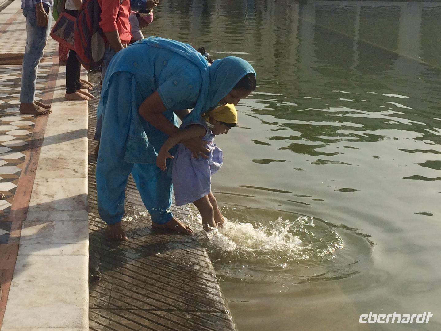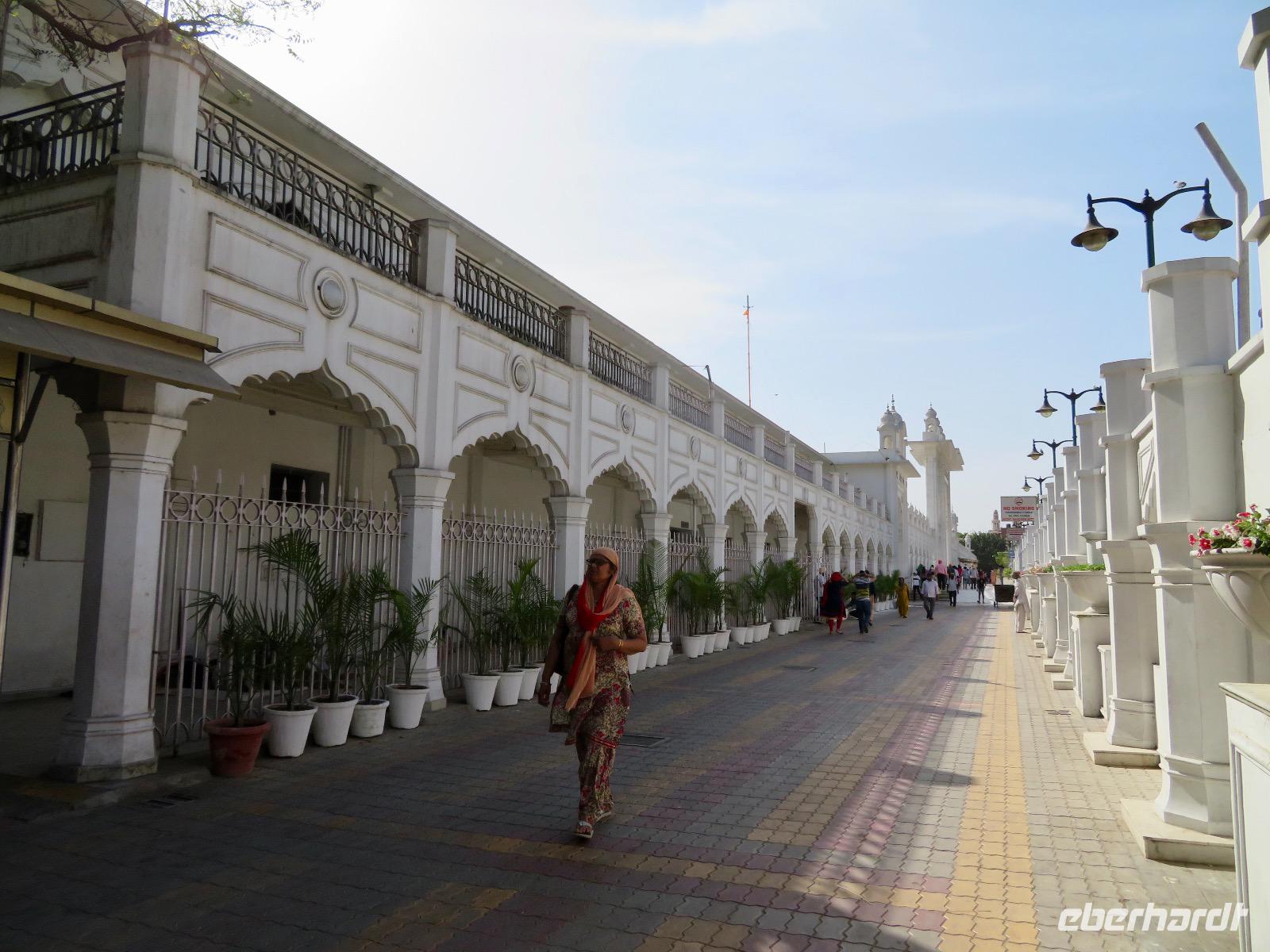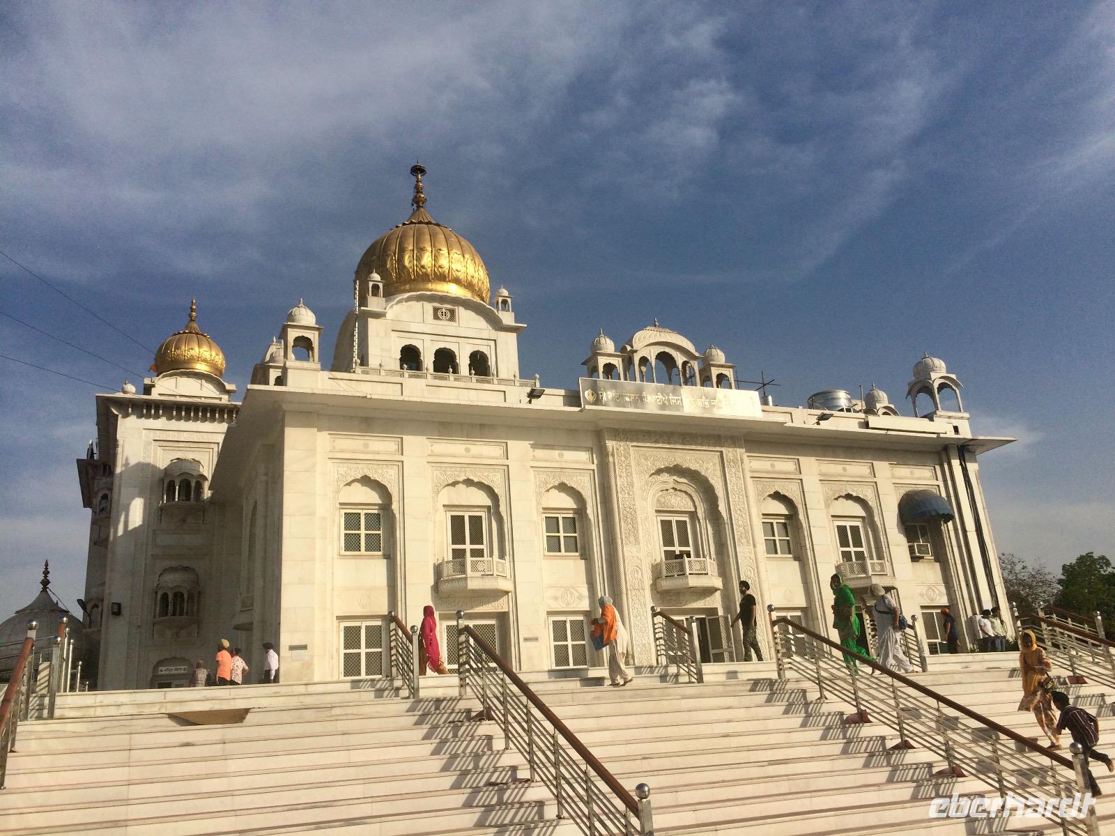Die Höhepunkte sind noch nicht vorbei, denn Bhawani zeigt uns nun den Gurdwara Bangla Sahib, dem größten Sikh-Tempel in Delhi. Doch er ist nicht nur irgendein Tempel. Mit gesonderter Kopfbedeckung und barfuß dürfen wir hinter die Kulissen blicken. Die Großküche beköstigt täglich tausende von Menschen. Jeder der es wollte, kann kommen. Natürlich gibt es aus religiösen Gründen kein Fleisch, sondern nur vegetarische Angebote, aber diese werden von zahlreichen Freiwilligen sowie den den Besuchern des Tempels selbst gekocht und zubereitet. Vorbei an Teigknetflächen, großen Suppenschalen, Essenden und Kochenden, sind wir bald mitten drin im Geschehen und können selbst den Teig für das bekannte Naanbrot kneten und ausrollen. Später besuchen wir den eigentlichen Tempel und lauschen einer dortigen Zeremonie. Die Spiritualität erfüllt alle Räume und erfüllt auch unsere Sinne mit Begeisterung.