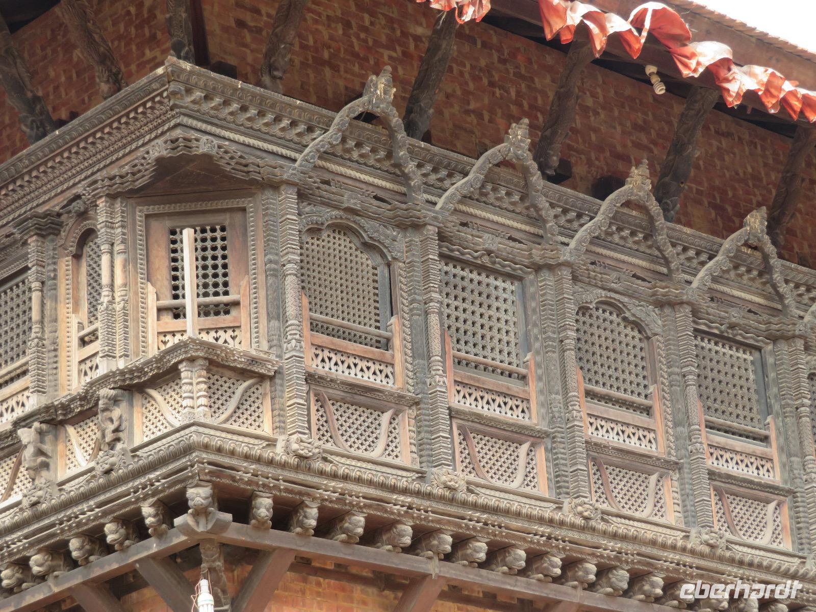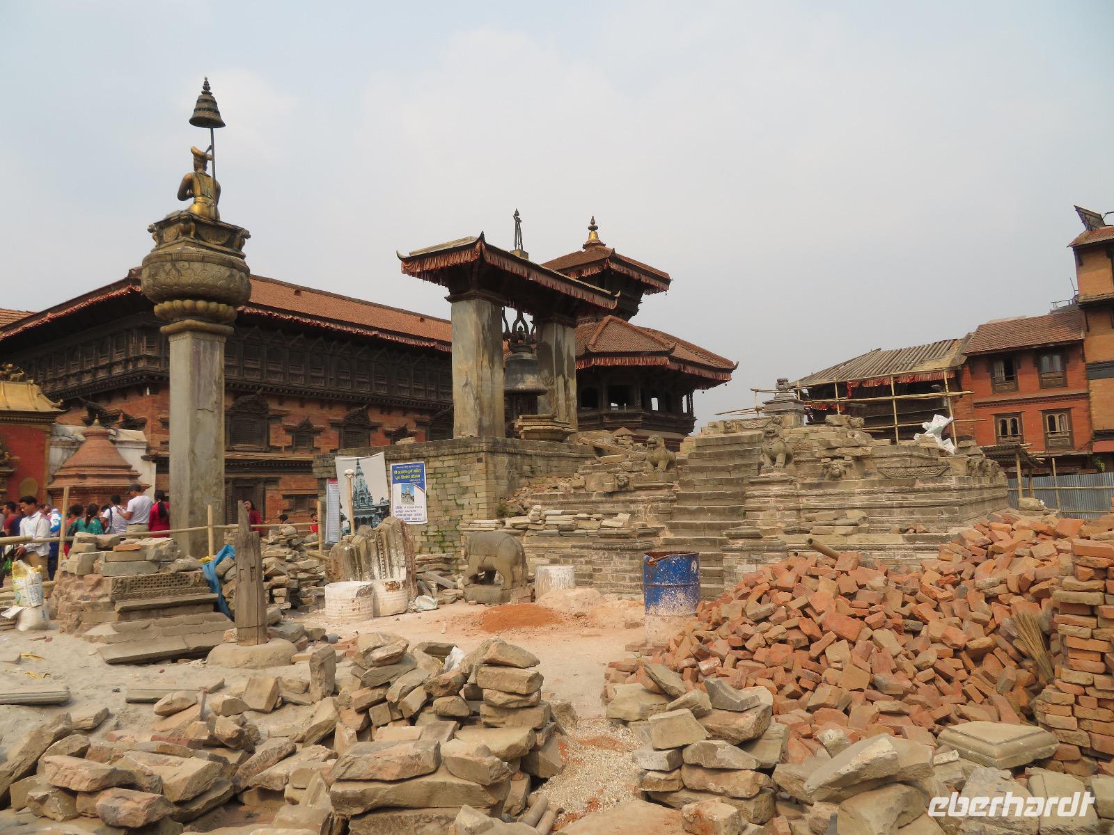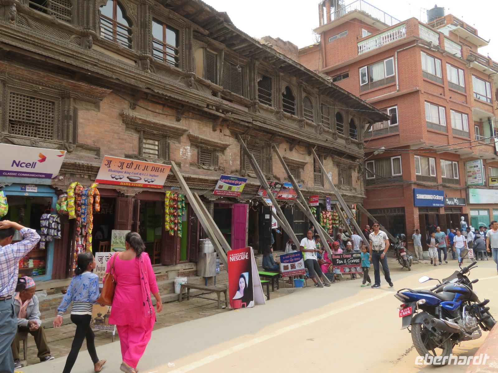 Der historische Stadtkern von Bhaktapur wurde auch mit deutscher Hilfe rekonstruiert. Das Autofahren ist dort zwar verboten, trotzdem herrscht ein Gewirr von Menschen und hupenden Motorradfahrern an allen Ecken. Wir schauen uns die alte Durbar Square und kleine Gassen mit den unzähligen Läden und Verkaufsständen an. Dann besichtigen wir noch einige Tempel von außen und den Königspalast. Die Spuren des Erdbebens von 2015 sind nicht zu übersehen, doch sie nehmen dem Ganzen die ehrwürdige Anmut nicht.