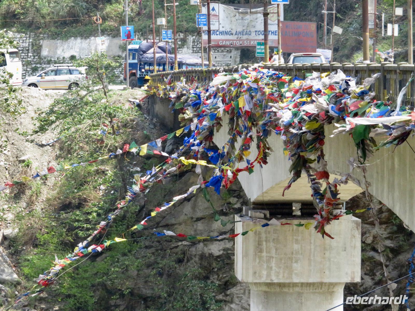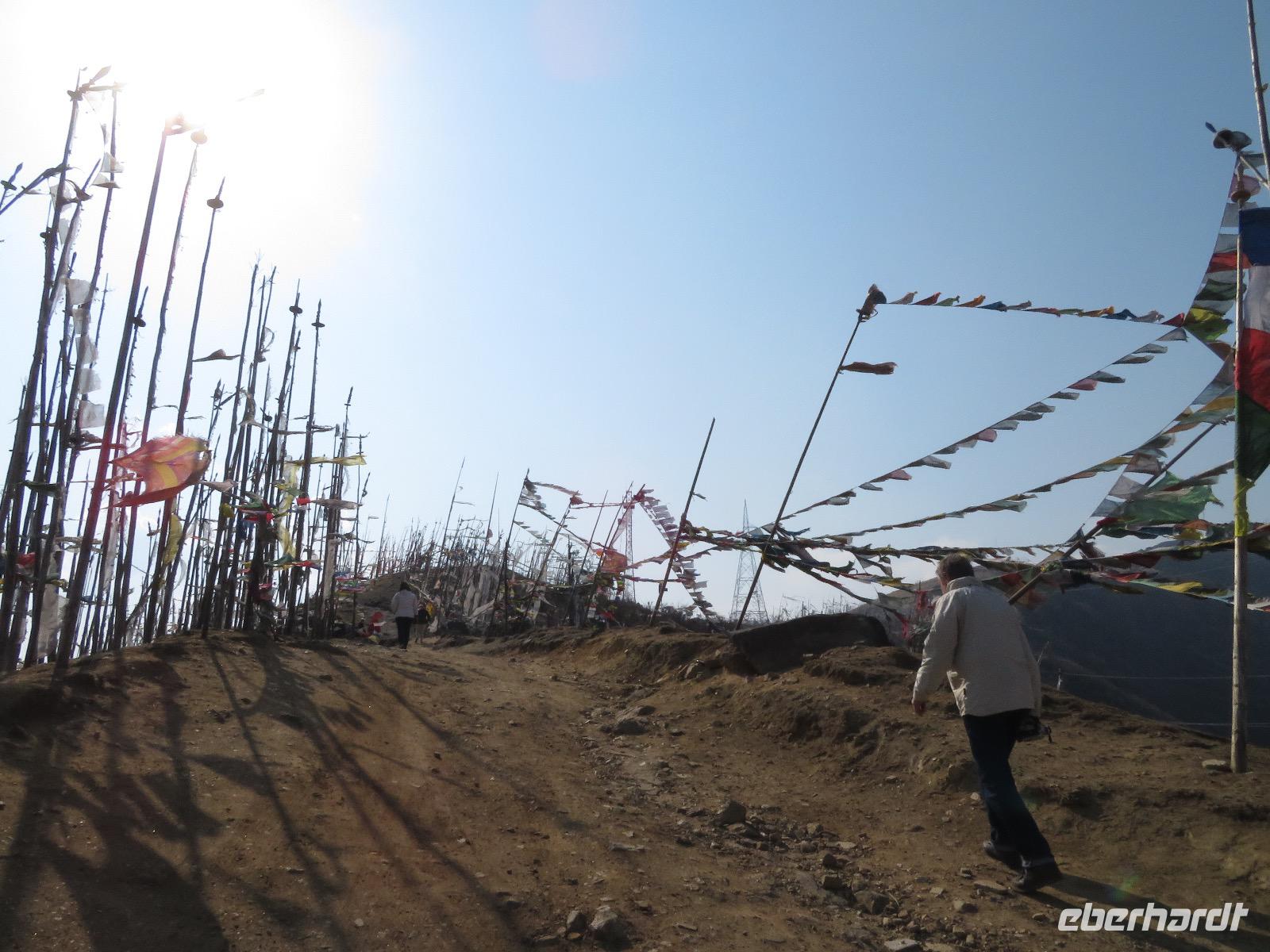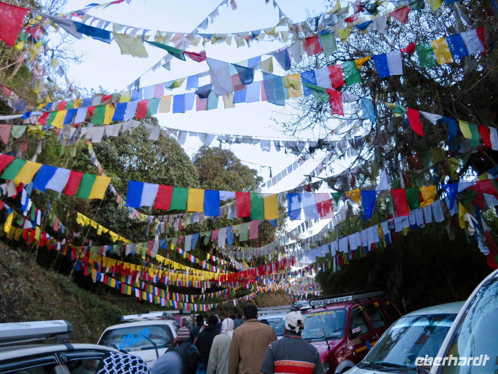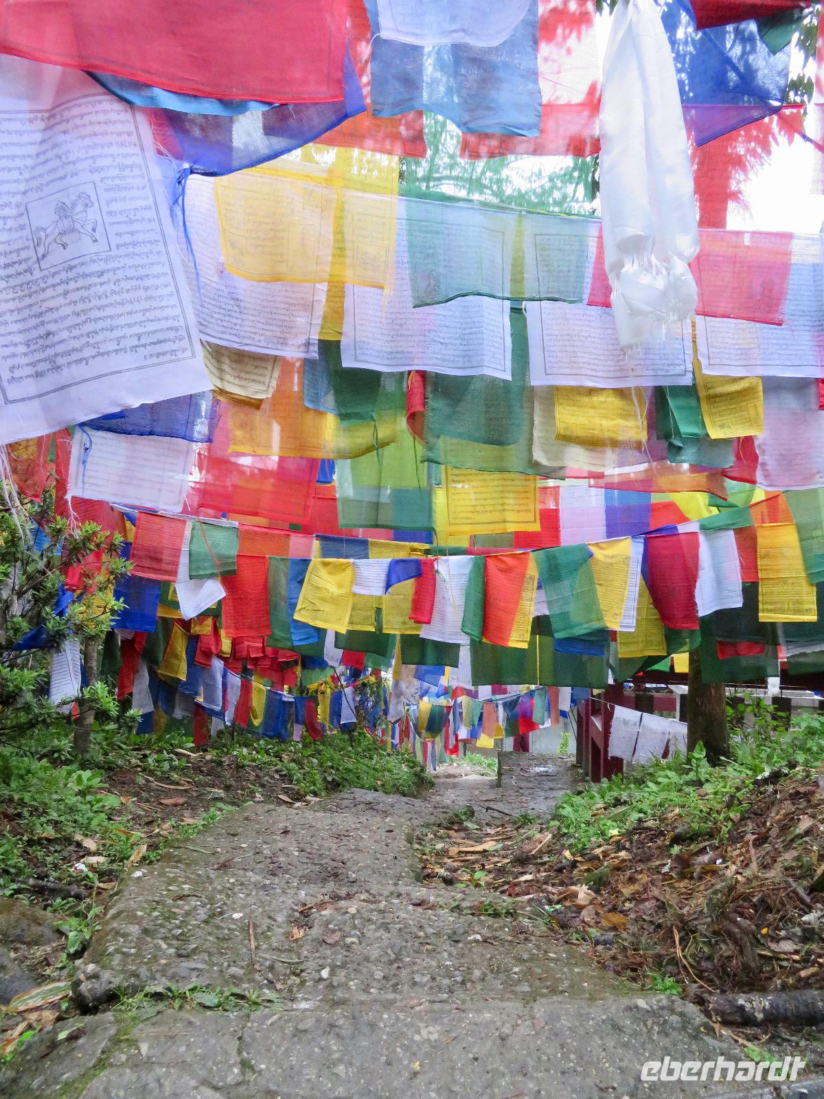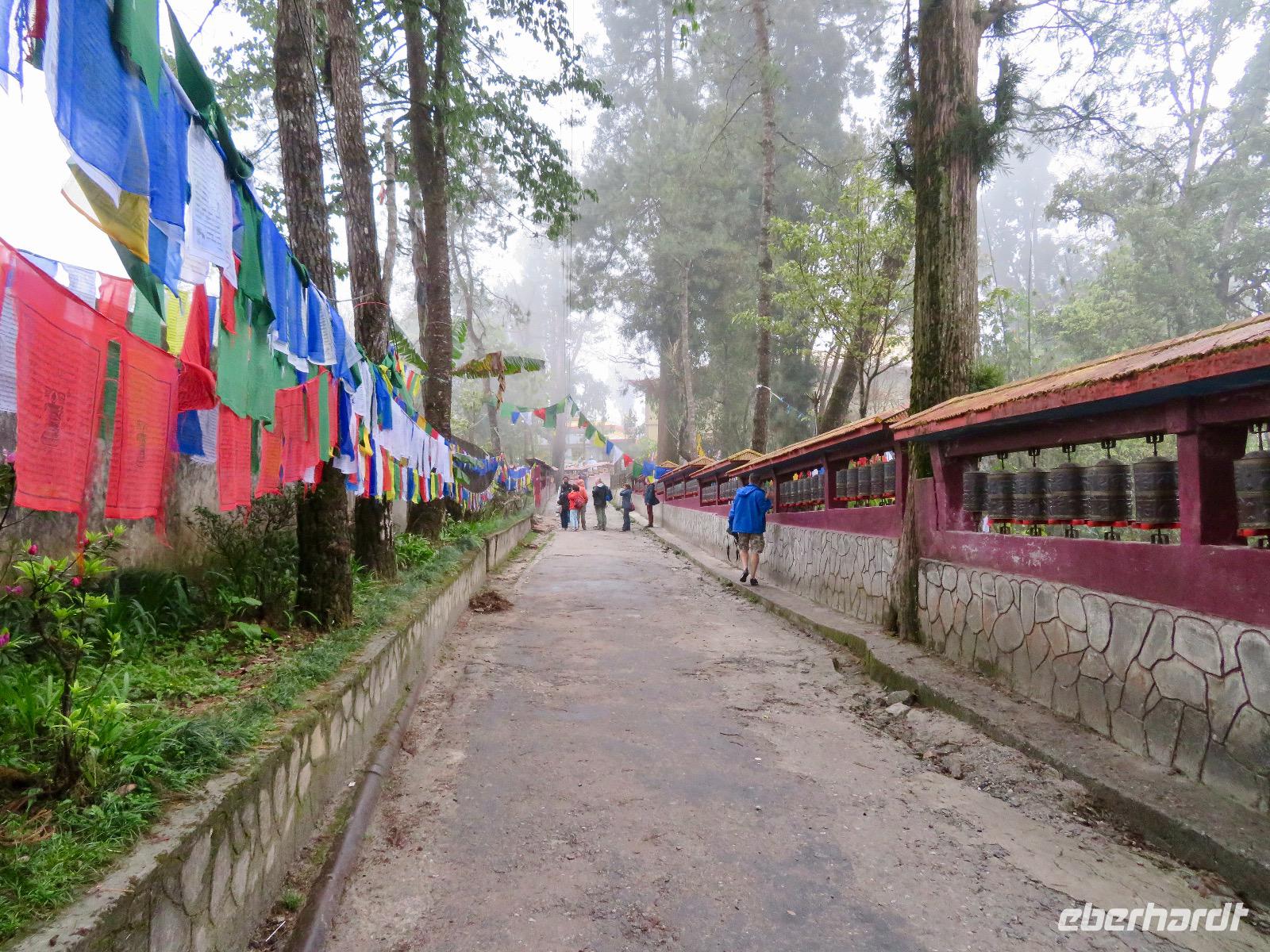Unser letzter Punkt für den Tag ist das älteste Kloster der Stadt, das Enchey-Kloster. Hier studieren die reicheren Mönche nur tagsüber, am Abend dürfen sie nach Hause kehren. Eine lange Allee mit Gebetsmühlen und abertausenden bunten Gebetsfahnen führen zum Hauptkloster. Allerdings wird es gerade renoviert, weshalb uns der Blick ins Innere verborgen bleibt.