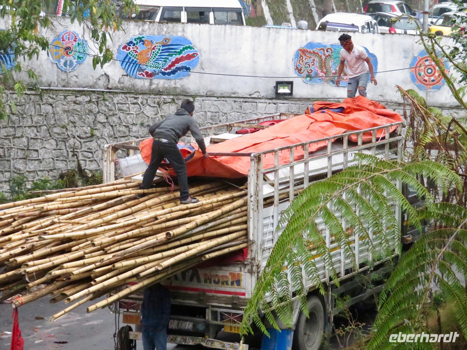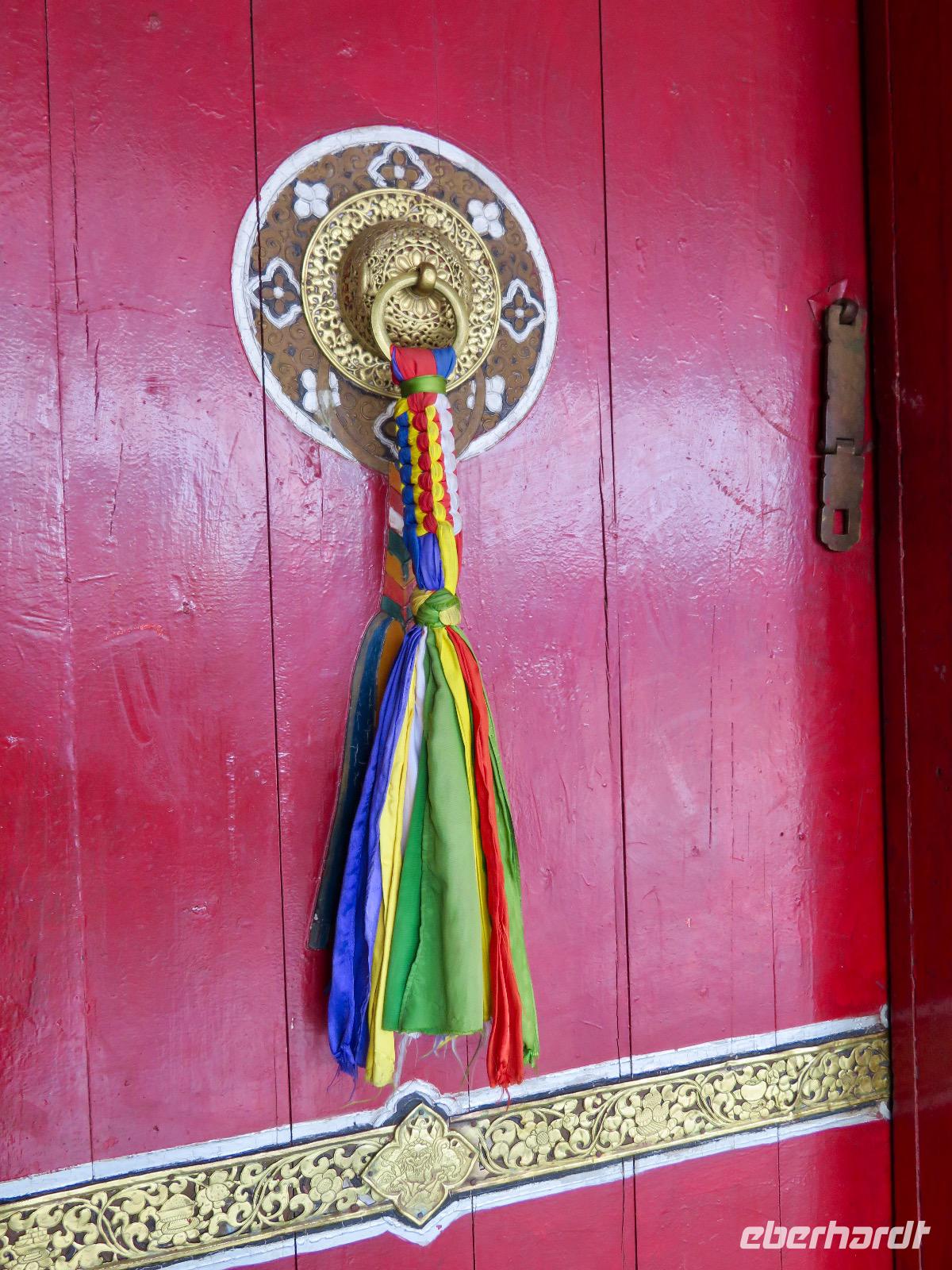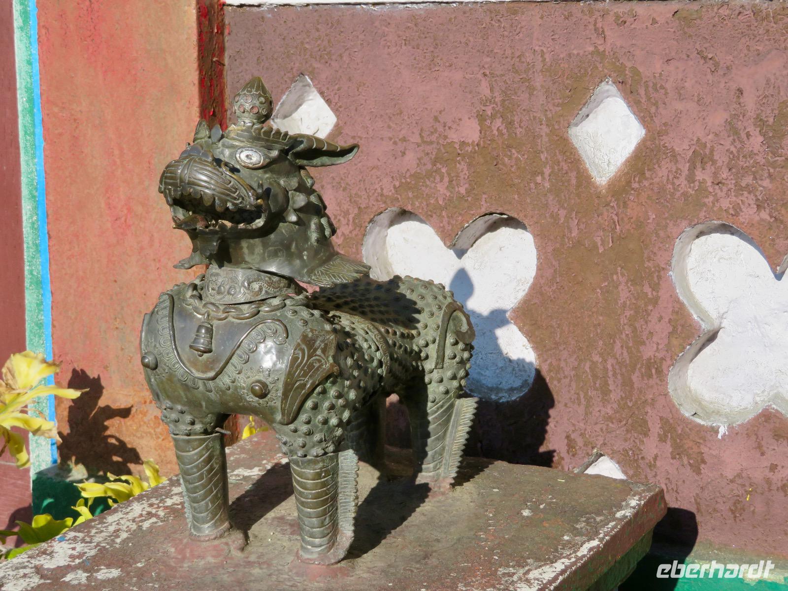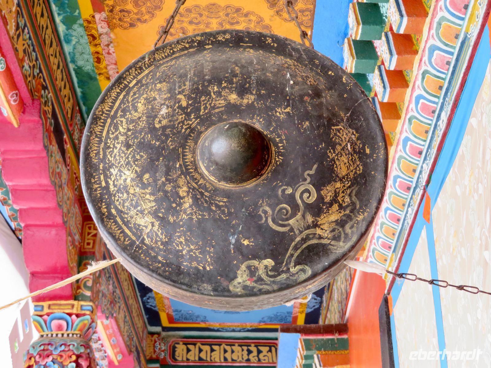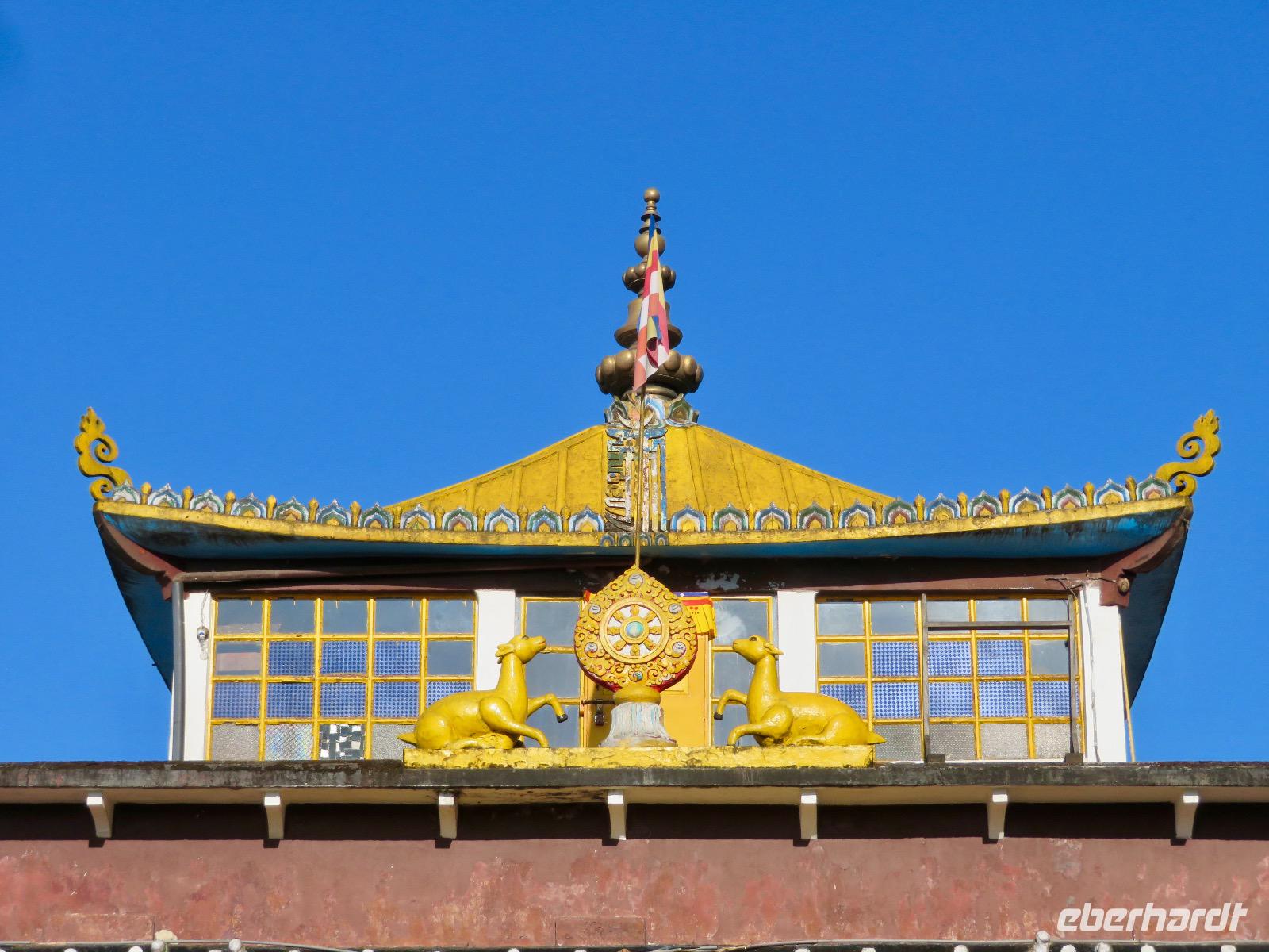 Unser letzter Punkt für den Tag ist das älteste Kloster der Stadt, das Enchey-Kloster. Hier studieren die reicheren Mönche nur tagsüber, am Abend dürfen sie nach Hause kehren. Eine lange Allee mit Gebetsmühlen und abertausenden bunten Gebetsfahnen führen zum Hauptkloster. Allerdings wird es gerade renoviert, weshalb uns der Blick ins Innere verborgen bleibt.