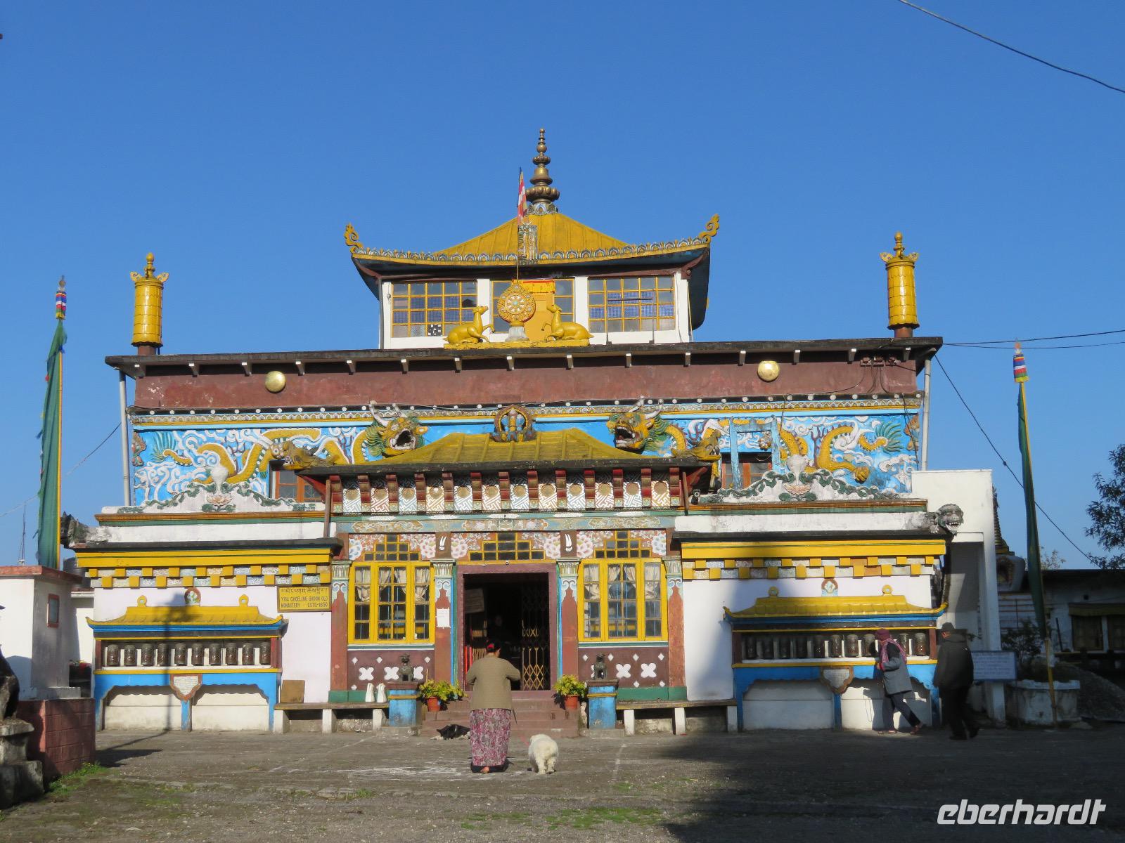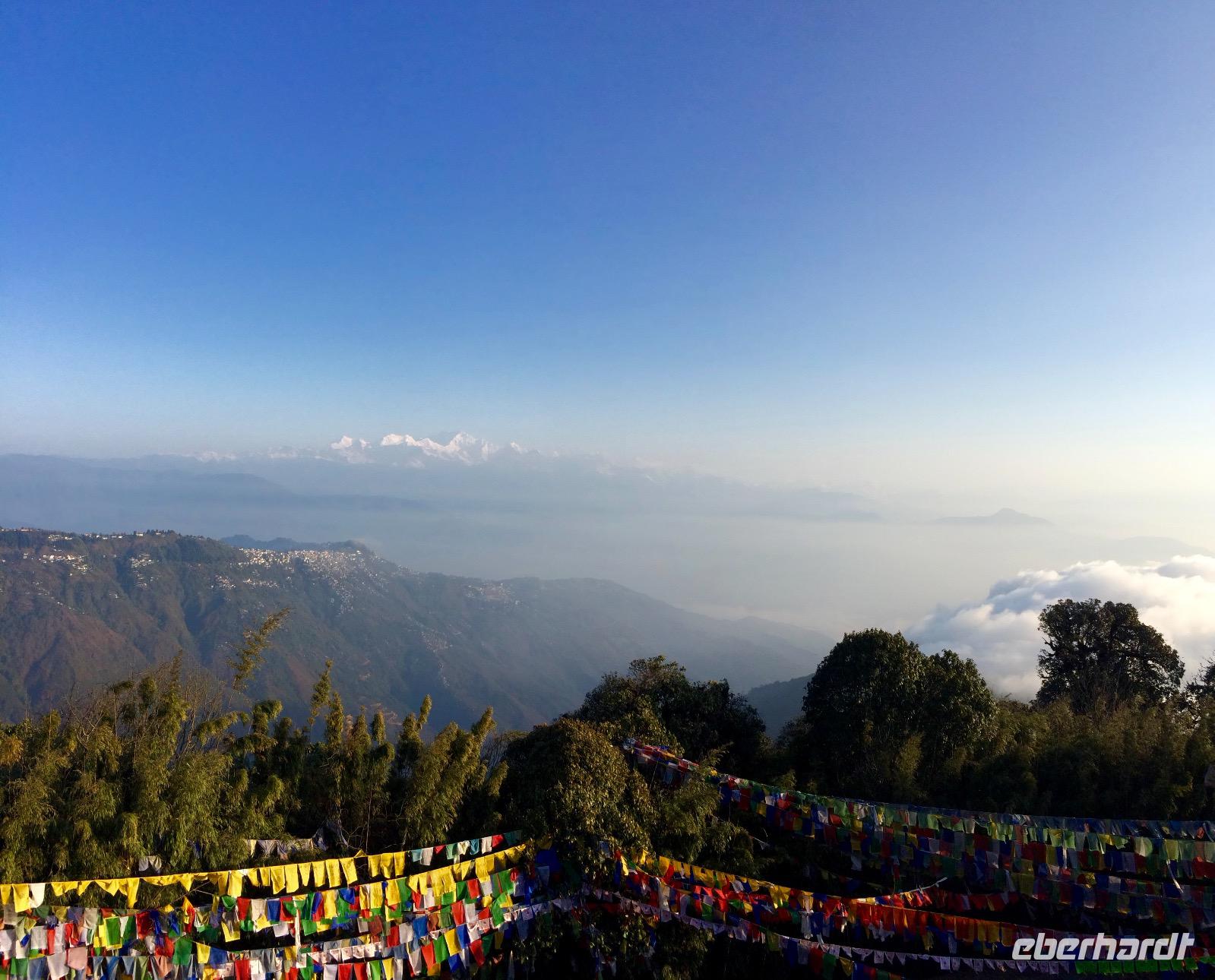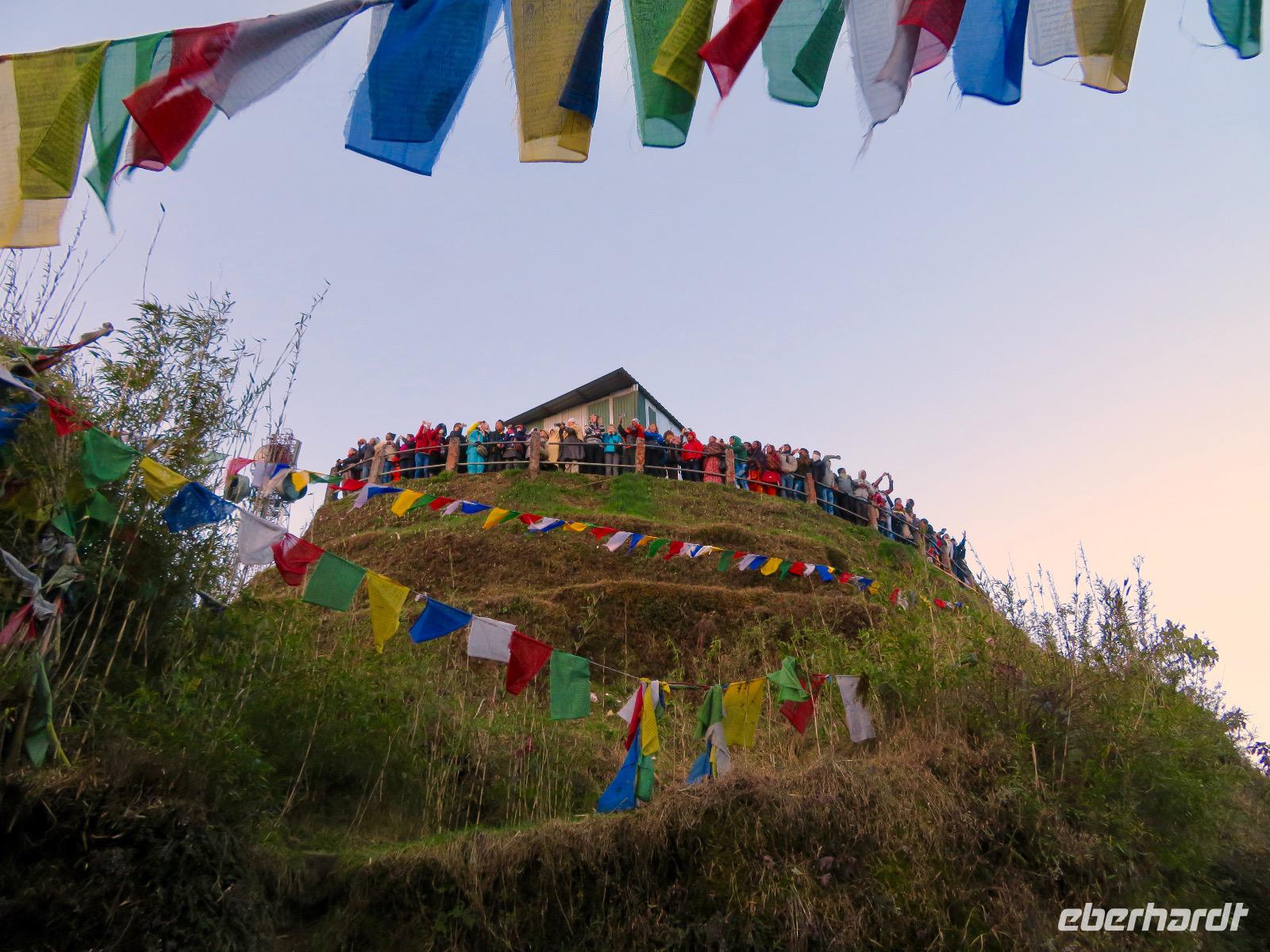 Der Wecker klingelt ungnädigerweise noch fast mitten in der Nacht. Doch das zeitige Aufstehen soll belohnt werden mit einem wundervollen Sonnenaufgang am Tiger Hill. Bequeme Jeeps bringen uns am heutigen Tag durch die zahlreichen Serpentinen bergauf und bergab. Am Fuße des Tiger Hills merken wir, dass nicht nur wir diese tolle Idee mit dem Panoramablick auf das Himalaya-Gebirge haben. Gefühlt zweitausend Inder und Tibeter zusammen mit ein paar sich hierher verlaufenden europäischen Touristen steigen wir den Tiger Hill (2.500 Meter) hinauf. Der Fleiß hat sich ausgezahlt, denn wir sehen heute schon die Spitze des Mount Everest weit hinten am Horizont. Im Vordergrund erstreckt sich die gewaltige Himalaya-Gebirgskette vor unseren Füßen. Alle Fotoapparate werden gezuckt, um die besten Portraits mit dem weltweit dritthöchsten Berg Kanchenjunga (8.586 Metern) zu schießen. Bald stehen wir fast allein auf dem Tiger Hill, die Inder haben das Feld gleich nach dem Sonnenaufgang verlassen, und ergötzen uns an diesem tollen Ausblick. Bevor es zurück zum Frühstück & zur Tiefenentspannung auf der Couch oder in der Sonne im Hotel geht, besuchen wir das alte Yiga Choling-Kloster. Bhawani erklärt uns die drei großen buddhistischen Richtungen Mahayana, Hinayana (auch Diayana) und Tibetanischer Vajrayana Buddhismus (Diamentenweg). Westbengalen wird auch gern als Minitibet gesehen. Die am weitesten verbreitete Religion ist die des Tibetanischen Buddhismus. Eines der sechs offiziellen Sprachen ist auch tibetisch und es gibt viele Läden mit den kleinen leckeren Momos, gefüllte Teigtaschen, welche tibetische Spezialität sind.