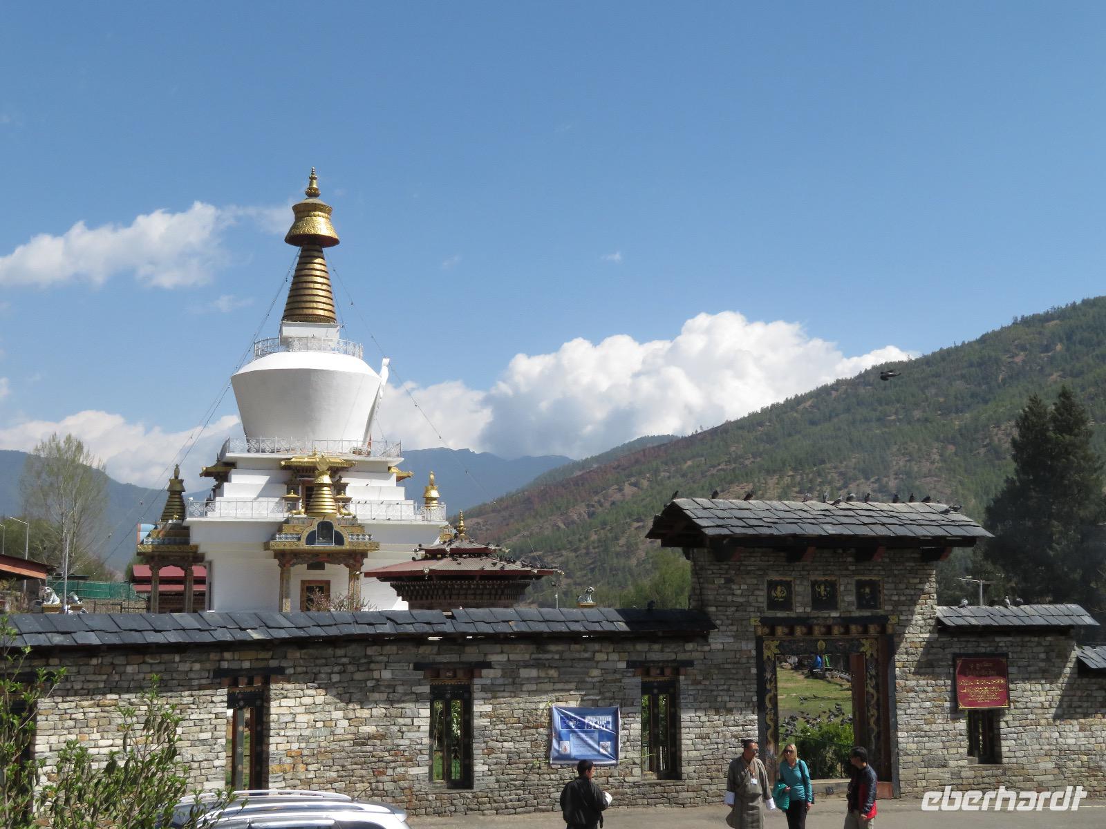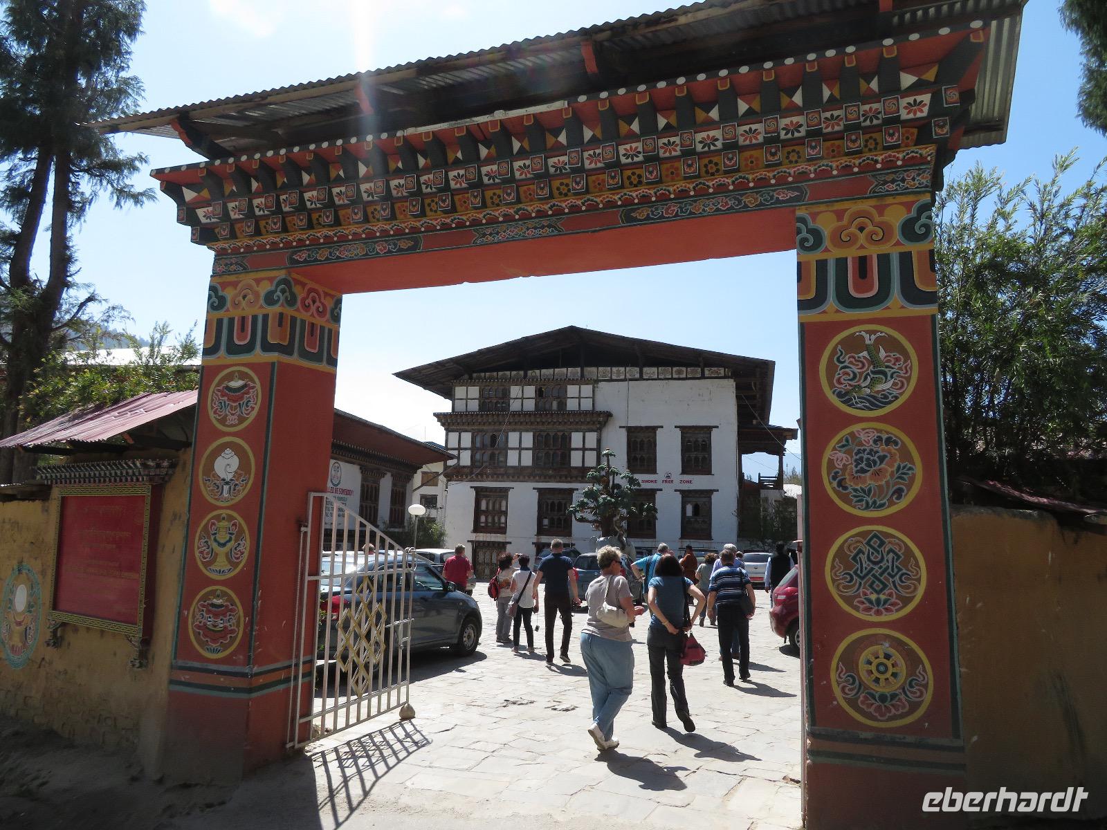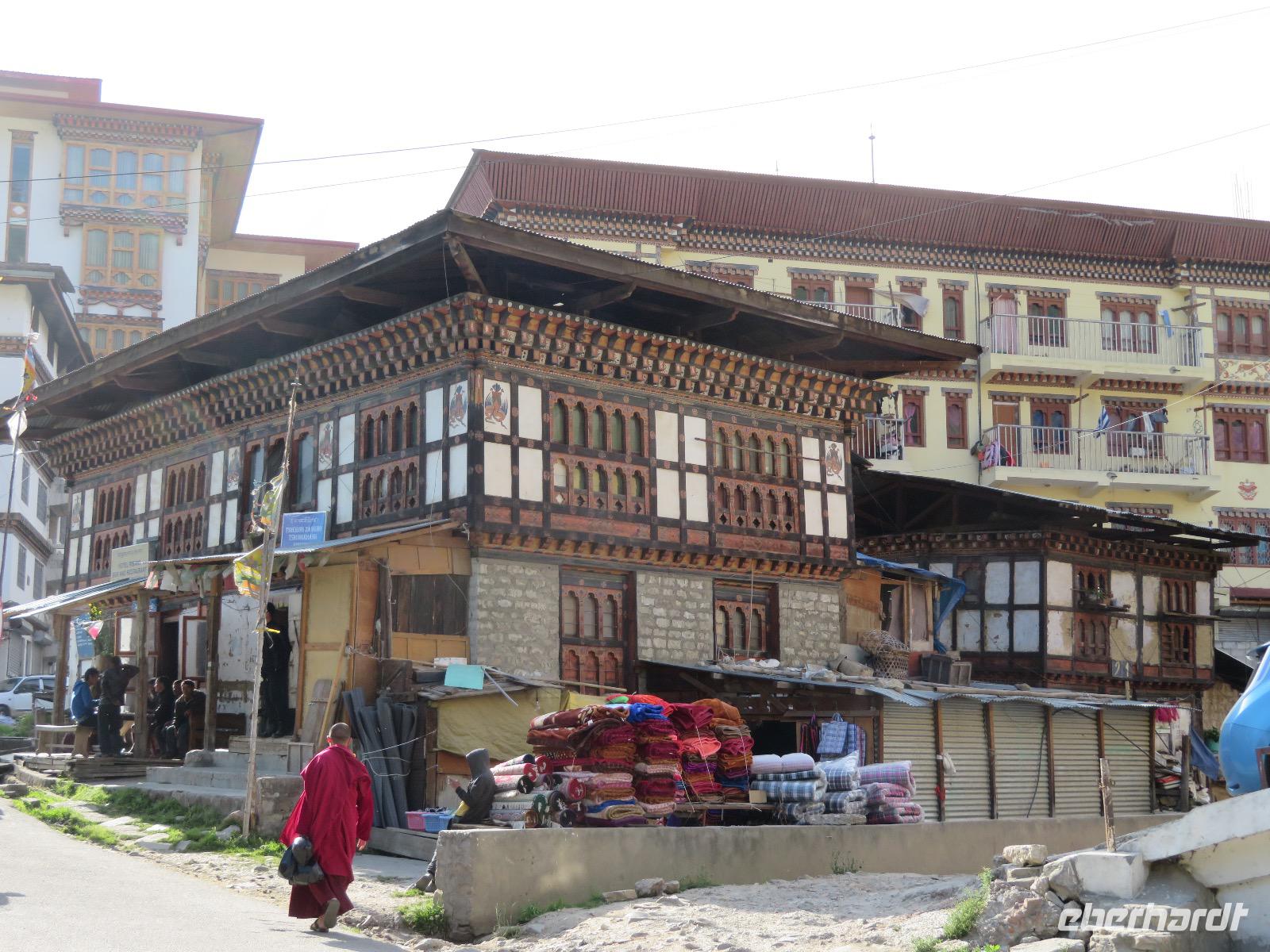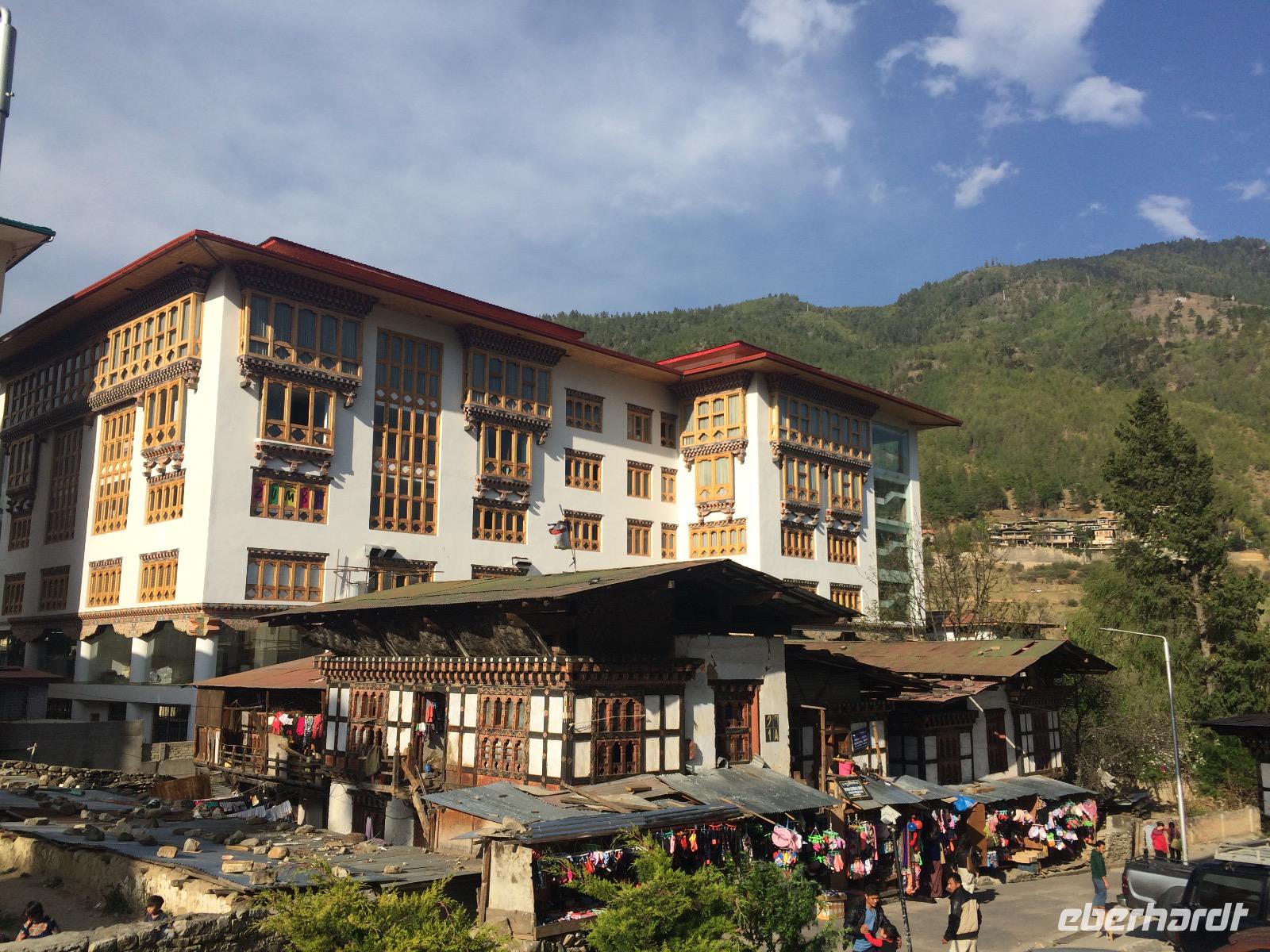 Nun geht es zu einer Handwerksstätte für Kinder aus armen Familien. Wie in Gangtok bekommen sie hier ebenfalls eine tolle Ausbildung in Malerei, Weberei, Schnitzerei und Wirtschaft. Die Berufschancen nach der Ausbildung sind sehr hoch, berichtete Sangay. Im Innenhof erzählt uns Sangay auch von der Geschichte der Harmonischen Vier, wie Vogel, Affe, Hase und Elefant einen Pfirsichbaum pflanzen und ernten und so nur zusammen stark sind.Neben dem recht kleinen, bescheidenen Königspalast, dem großen Parlamentsgebäude befindet sich der große Thimphu-Dzong. Ihr Inneres beherbergt unglaubliche Schätze an bunten Seidentüchern, Wandmalereien, welche den Lebenslauf Buddhas wiedergeben, und großartige Statuen sowie heilige Schriften. Die gewaltigen Ausmaße der Festung und die Ruhe hinter den Mauern geben eine besondere Aura.Wer noch nicht fußmüde ist, bummelt durch die Straßen und den lokalen Markt. Viele Produkte müssen aus Indien und Nepal importiert werden. Im oberen Stockwerk werden die biologisch angebauten Gemüse- und Kräuter wie auch eigens gezüchtete Hühner und Schweine verkauft, welche die Bauern auf ihrem Land selbst ernten. So finden wir hier Buttertee, Essfarn und Yakkäse. Seltsamerweise können wir auf dem Markt auch Rindfleisch kaufen, obwohl Rinder in dieser Welt ja heilig sind. Sangay verrät uns, dass sie selbst keine Rinder schlachten, aber doch auch Rindfleisch aus dem Ausland importieren und verspeisen. Ja, willkommen in Bhutan.