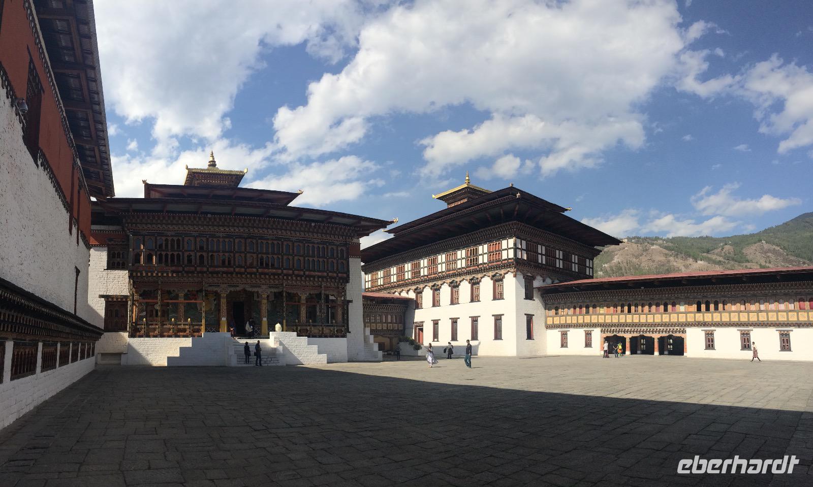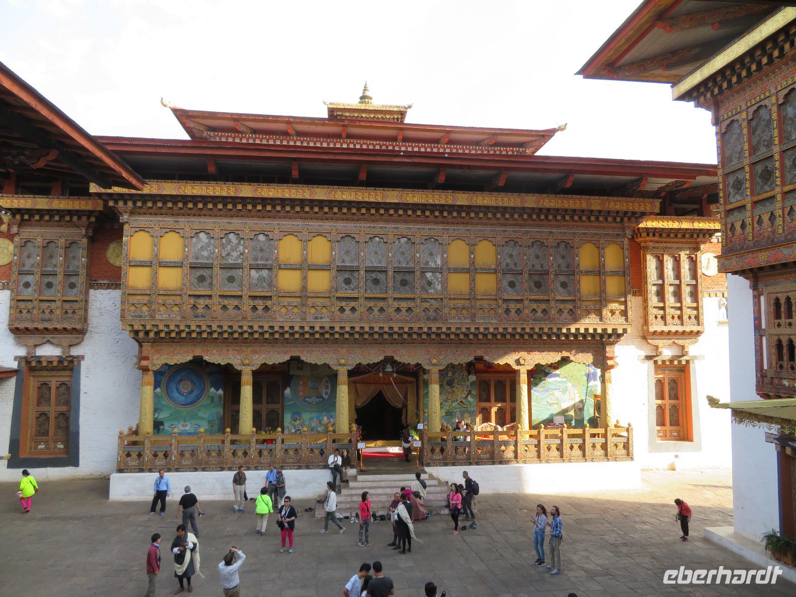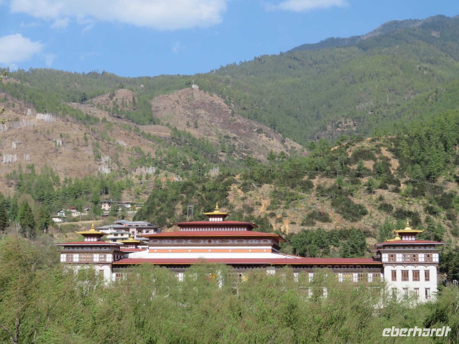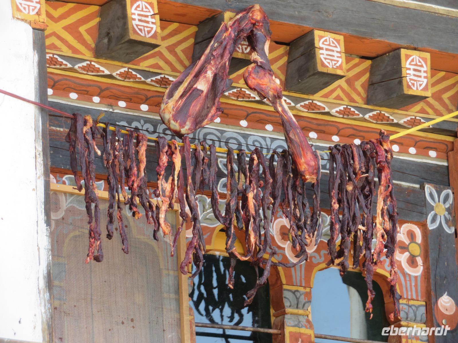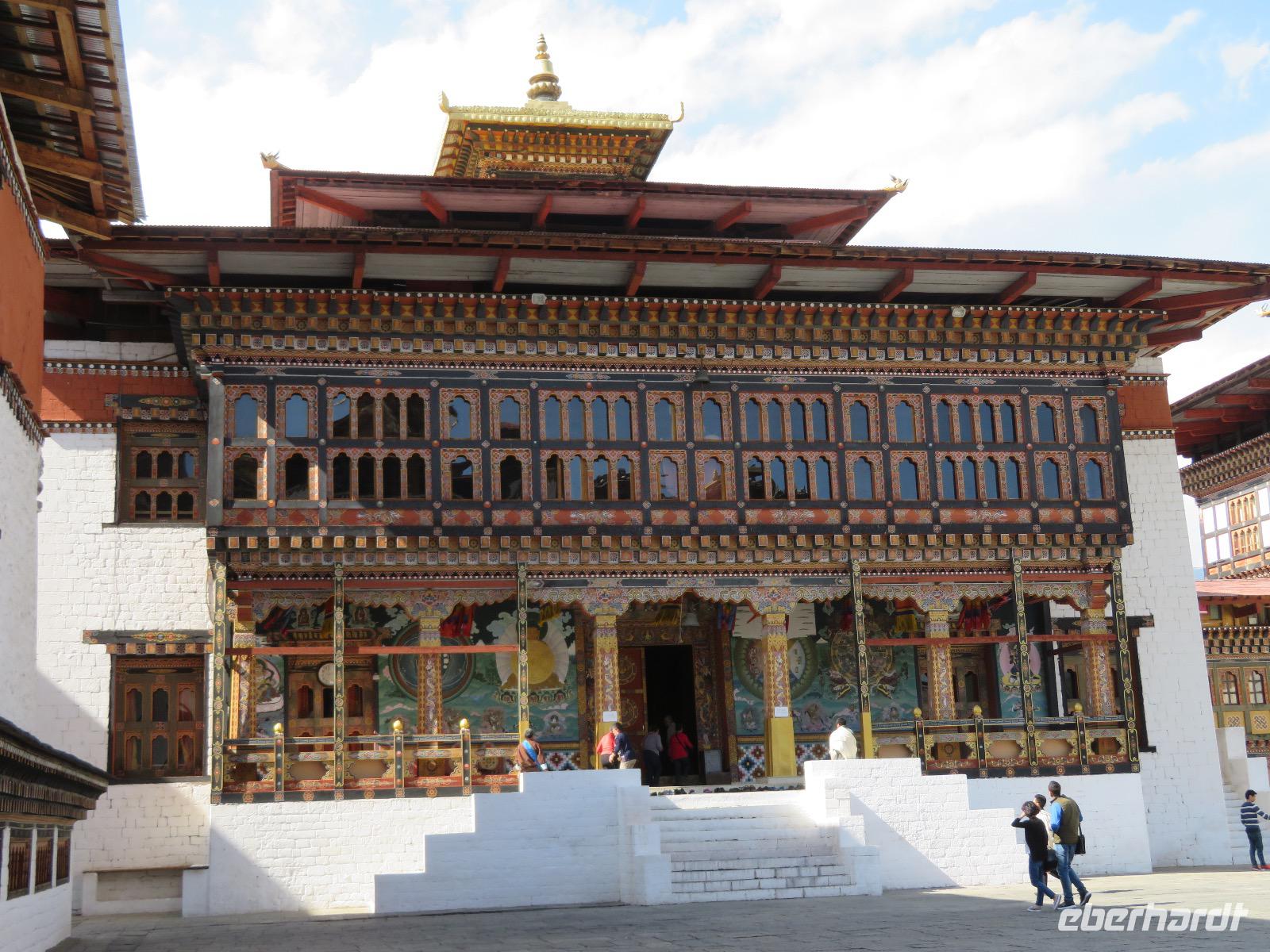 Nun geht es zu einer Handwerksstätte für Kinder aus armen Familien. Wie in Gangtok bekommen sie hier ebenfalls eine tolle Ausbildung in Malerei, Weberei, Schnitzerei und Wirtschaft. Die Berufschancen nach der Ausbildung sind sehr hoch, berichtete Sangay. Im Innenhof erzählt uns Sangay auch von der Geschichte der Harmonischen Vier, wie Vogel, Affe, Hase und Elefant einen Pfirsichbaum pflanzen und ernten und so nur zusammen stark sind.Neben dem recht kleinen, bescheidenen Königspalast, dem großen Parlamentsgebäude befindet sich der große Thimphu-Dzong. Ihr Inneres beherbergt unglaubliche Schätze an bunten Seidentüchern, Wandmalereien, welche den Lebenslauf Buddhas wiedergeben, und großartige Statuen sowie heilige Schriften. Die gewaltigen Ausmaße der Festung und die Ruhe hinter den Mauern geben eine besondere Aura.Wer noch nicht fußmüde ist, bummelt durch die Straßen und den lokalen Markt. Viele Produkte müssen aus Indien und Nepal importiert werden. Im oberen Stockwerk werden die biologisch angebauten Gemüse- und Kräuter wie auch eigens gezüchtete Hühner und Schweine verkauft, welche die Bauern auf ihrem Land selbst ernten. So finden wir hier Buttertee, Essfarn und Yakkäse. Seltsamerweise können wir auf dem Markt auch Rindfleisch kaufen, obwohl Rinder in dieser Welt ja heilig sind. Sangay verrät uns, dass sie selbst keine Rinder schlachten, aber doch auch Rindfleisch aus dem Ausland importieren und verspeisen. Ja, willkommen in Bhutan.