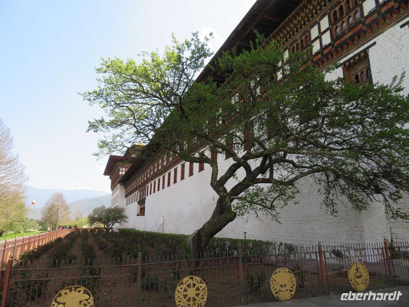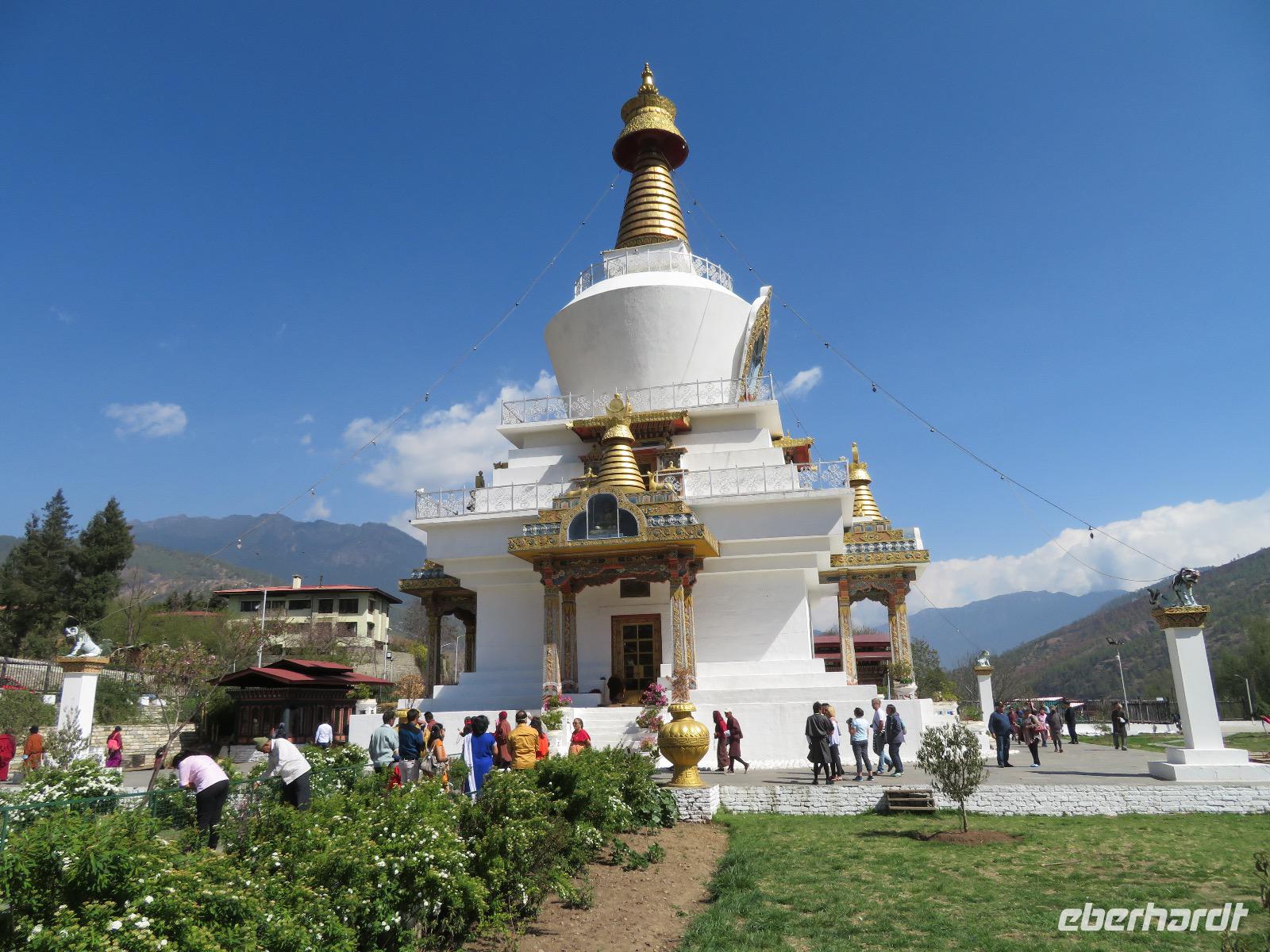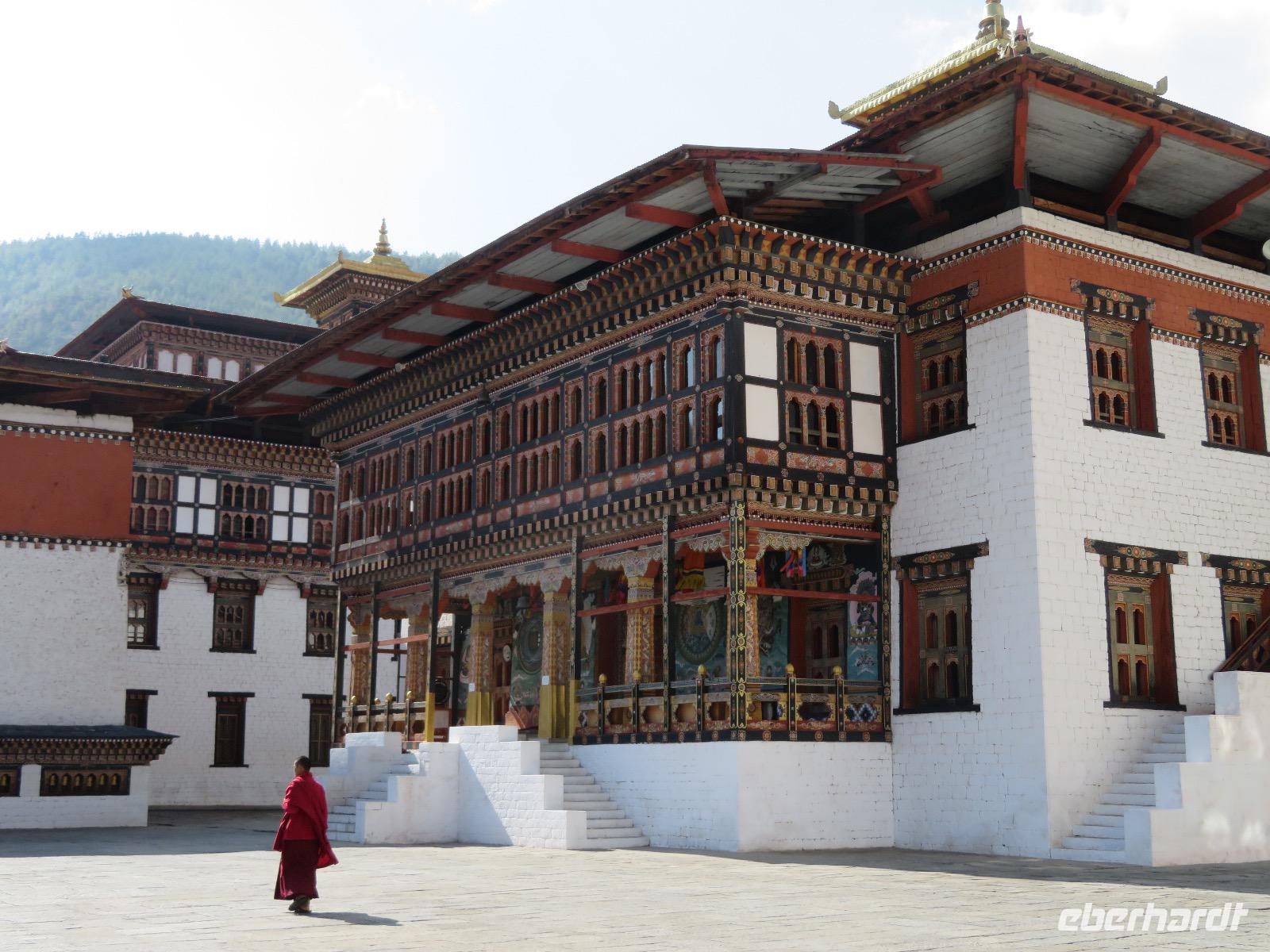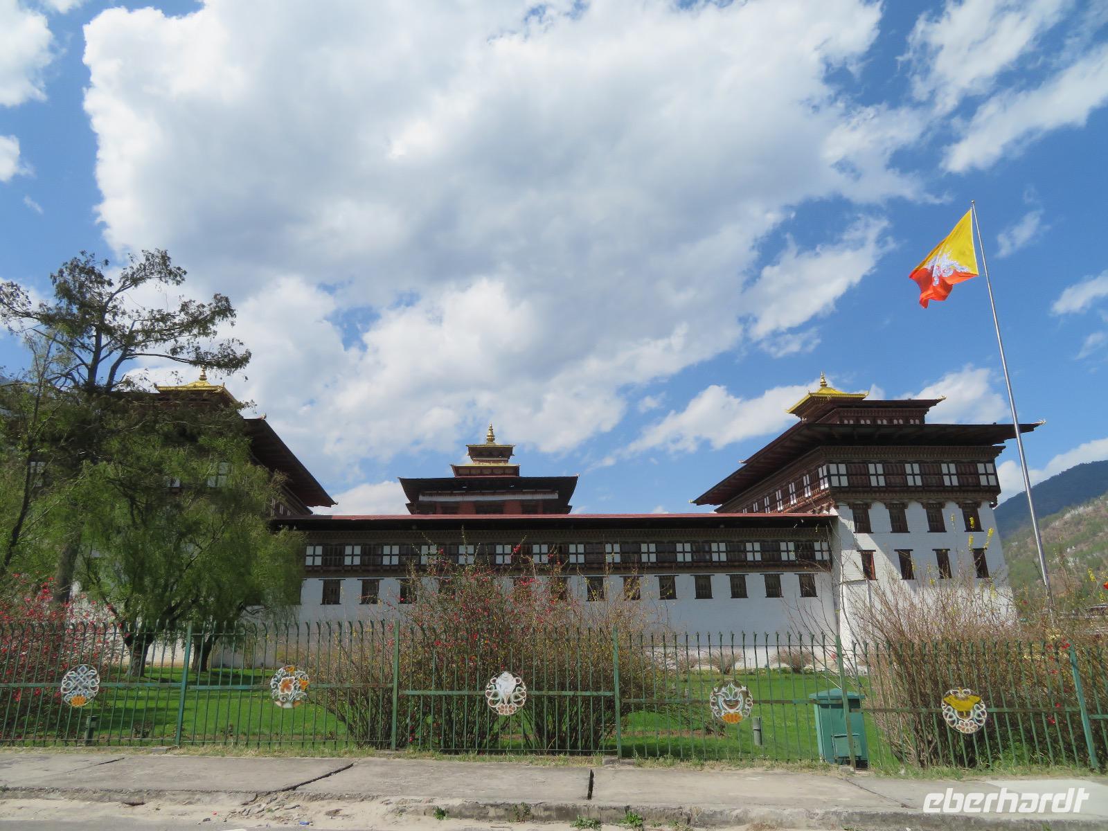 Nun geht es zu einer Handwerksstätte für Kinder aus armen Familien. Wie in Gangtok bekommen sie hier ebenfalls eine tolle Ausbildung in Malerei, Weberei, Schnitzerei und Wirtschaft. Die Berufschancen nach der Ausbildung sind sehr hoch, berichtete Sangay. Im Innenhof erzählt uns Sangay auch von der Geschichte der Harmonischen Vier, wie Vogel, Affe, Hase und Elefant einen Pfirsichbaum pflanzen und ernten und so nur zusammen stark sind.Neben dem recht kleinen, bescheidenen Königspalast, dem großen Parlamentsgebäude befindet sich der große Thimphu-Dzong. Ihr Inneres beherbergt unglaubliche Schätze an bunten Seidentüchern, Wandmalereien, welche den Lebenslauf Buddhas wiedergeben, und großartige Statuen sowie heilige Schriften. Die gewaltigen Ausmaße der Festung und die Ruhe hinter den Mauern geben eine besondere Aura.Wer noch nicht fußmüde ist, bummelt durch die Straßen und den lokalen Markt. Viele Produkte müssen aus Indien und Nepal importiert werden. Im oberen Stockwerk werden die biologisch angebauten Gemüse- und Kräuter wie auch eigens gezüchtete Hühner und Schweine verkauft, welche die Bauern auf ihrem Land selbst ernten. So finden wir hier Buttertee, Essfarn und Yakkäse. Seltsamerweise können wir auf dem Markt auch Rindfleisch kaufen, obwohl Rinder in dieser Welt ja heilig sind. Sangay verrät uns, dass sie selbst keine Rinder schlachten, aber doch auch Rindfleisch aus dem Ausland importieren und verspeisen. Ja, willkommen in Bhutan.