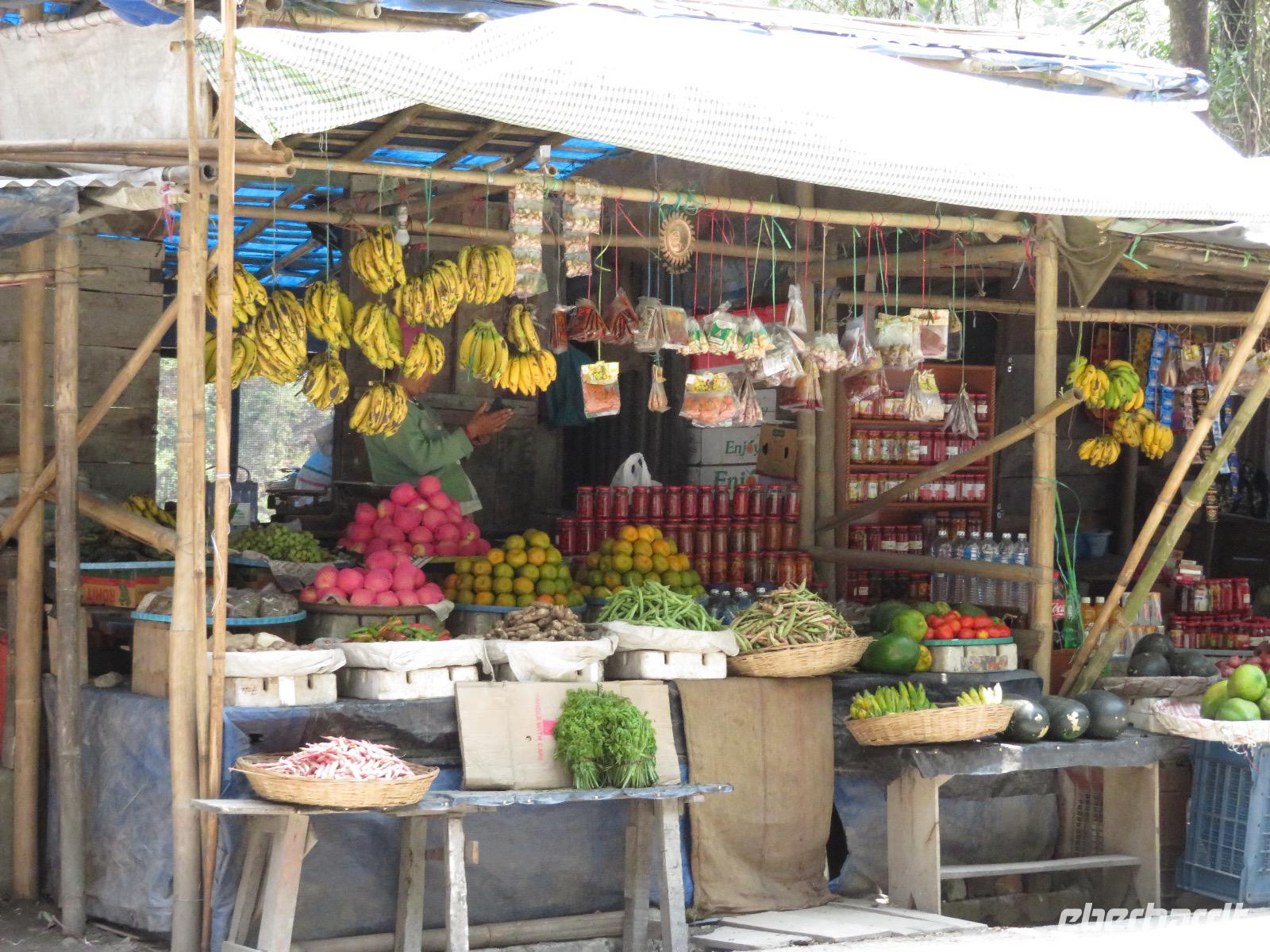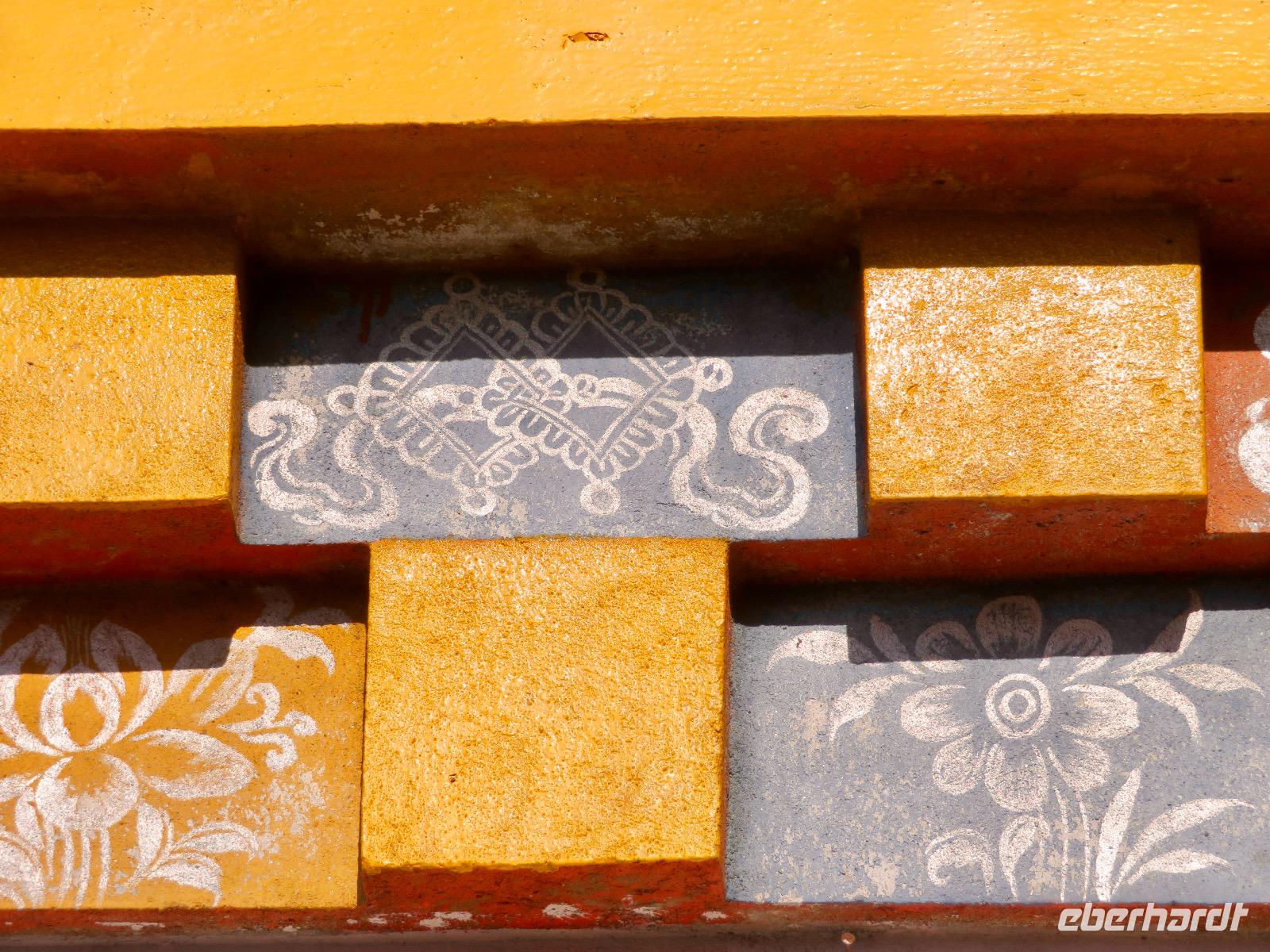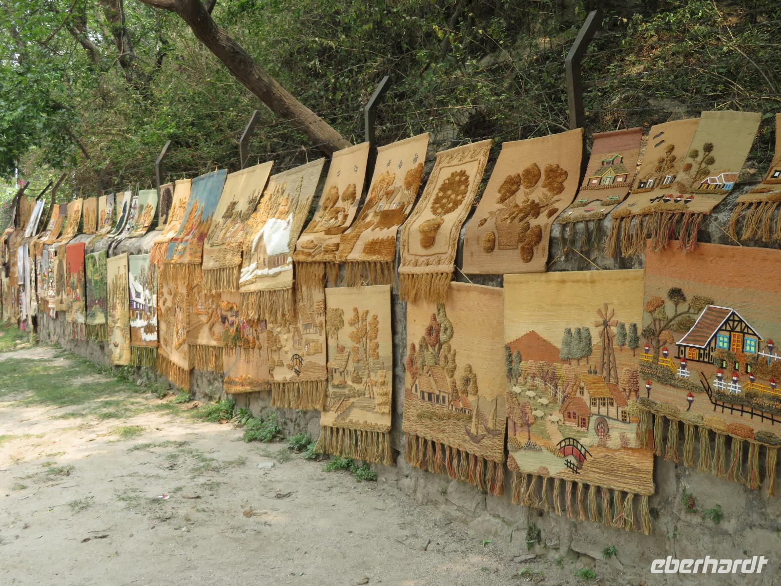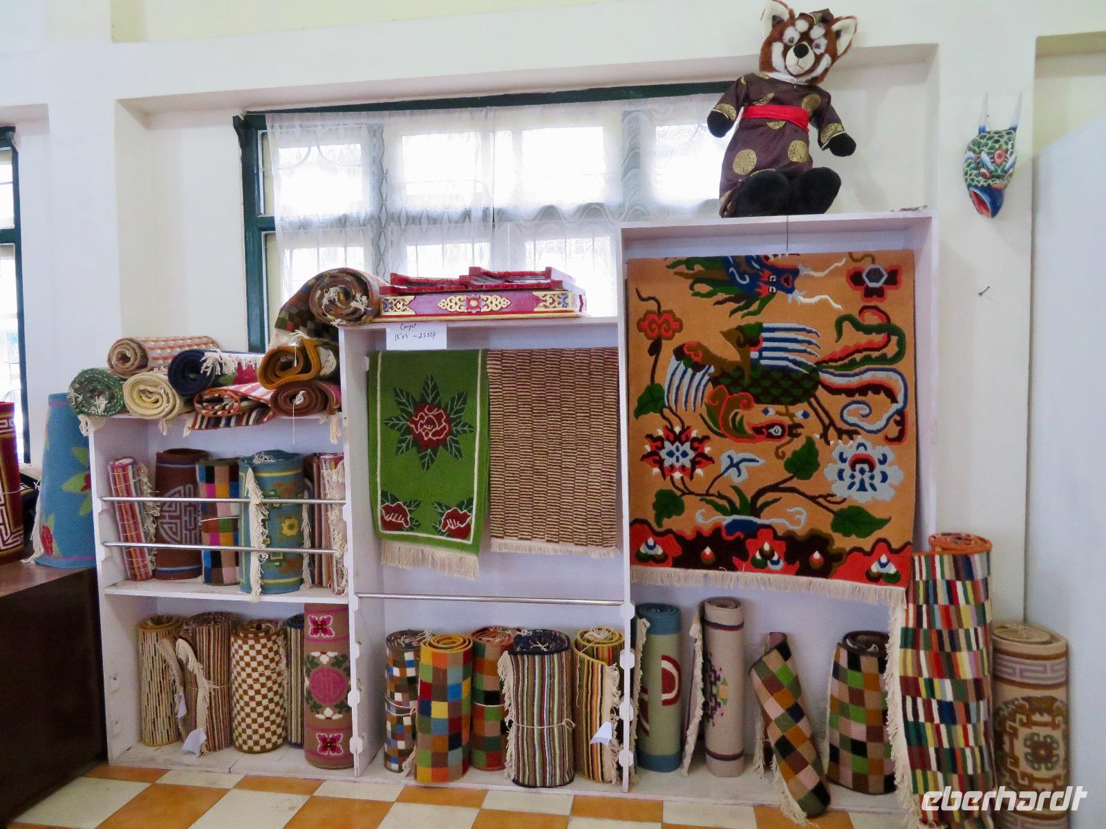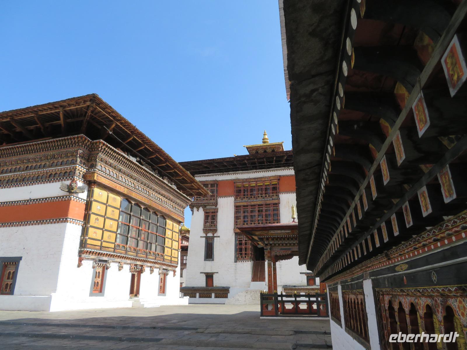 Nun geht es zu einer Handwerksstätte für Kinder aus armen Familien. Wie in Gangtok bekommen sie hier ebenfalls eine tolle Ausbildung in Malerei, Weberei, Schnitzerei und Wirtschaft. Die Berufschancen nach der Ausbildung sind sehr hoch, berichtete Sangay. Im Innenhof erzählt uns Sangay auch von der Geschichte der Harmonischen Vier, wie Vogel, Affe, Hase und Elefant einen Pfirsichbaum pflanzen und ernten und so nur zusammen stark sind.Neben dem recht kleinen, bescheidenen Königspalast, dem großen Parlamentsgebäude befindet sich der große Thimphu-Dzong. Ihr Inneres beherbergt unglaubliche Schätze an bunten Seidentüchern, Wandmalereien, welche den Lebenslauf Buddhas wiedergeben, und großartige Statuen sowie heilige Schriften. Die gewaltigen Ausmaße der Festung und die Ruhe hinter den Mauern geben eine besondere Aura.Wer noch nicht fußmüde ist, bummelt durch die Straßen und den lokalen Markt. Viele Produkte müssen aus Indien und Nepal importiert werden. Im oberen Stockwerk werden die biologisch angebauten Gemüse- und Kräuter wie auch eigens gezüchtete Hühner und Schweine verkauft, welche die Bauern auf ihrem Land selbst ernten. So finden wir hier Buttertee, Essfarn und Yakkäse. Seltsamerweise können wir auf dem Markt auch Rindfleisch kaufen, obwohl Rinder in dieser Welt ja heilig sind. Sangay verrät uns, dass sie selbst keine Rinder schlachten, aber doch auch Rindfleisch aus dem Ausland importieren und verspeisen. Ja, willkommen in Bhutan.