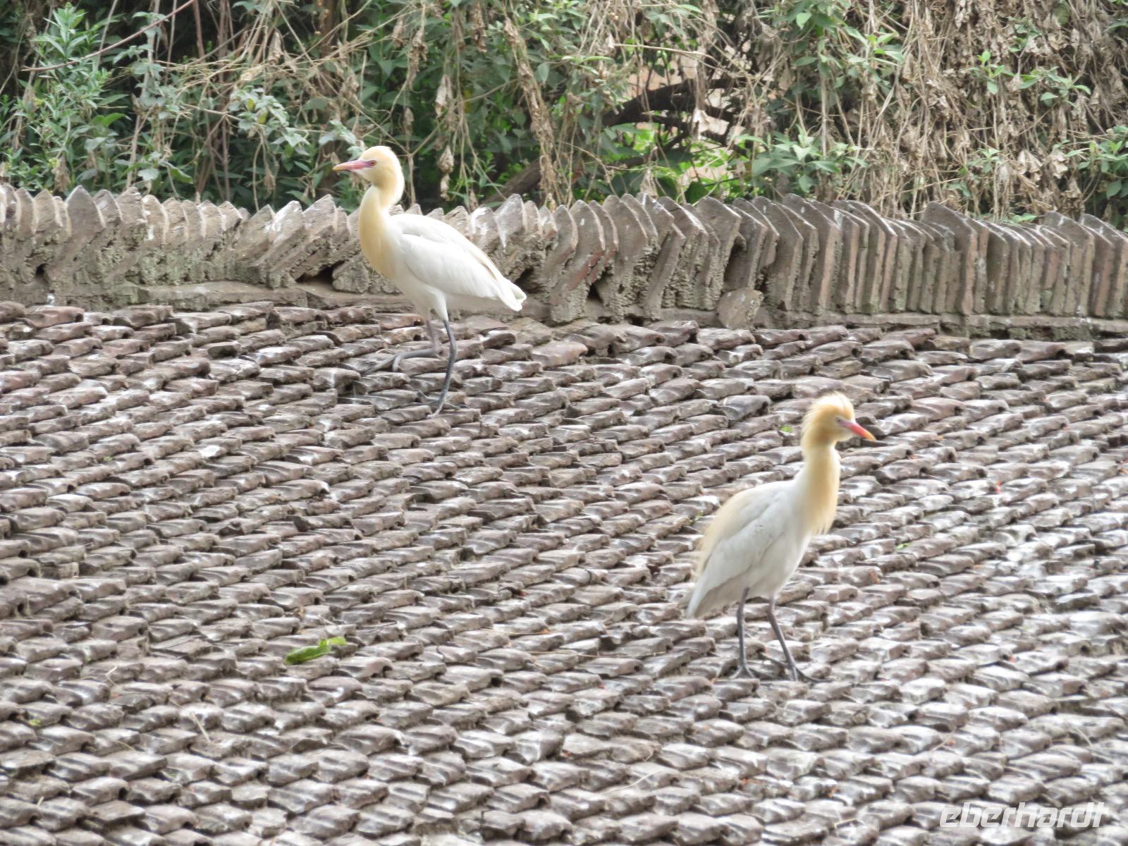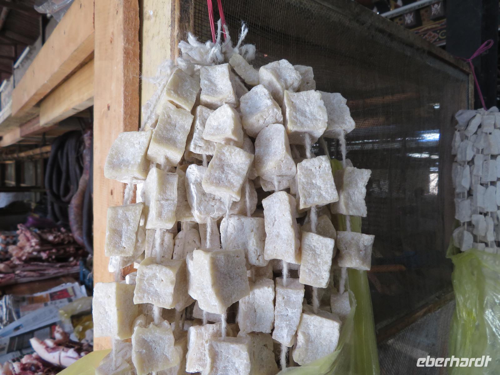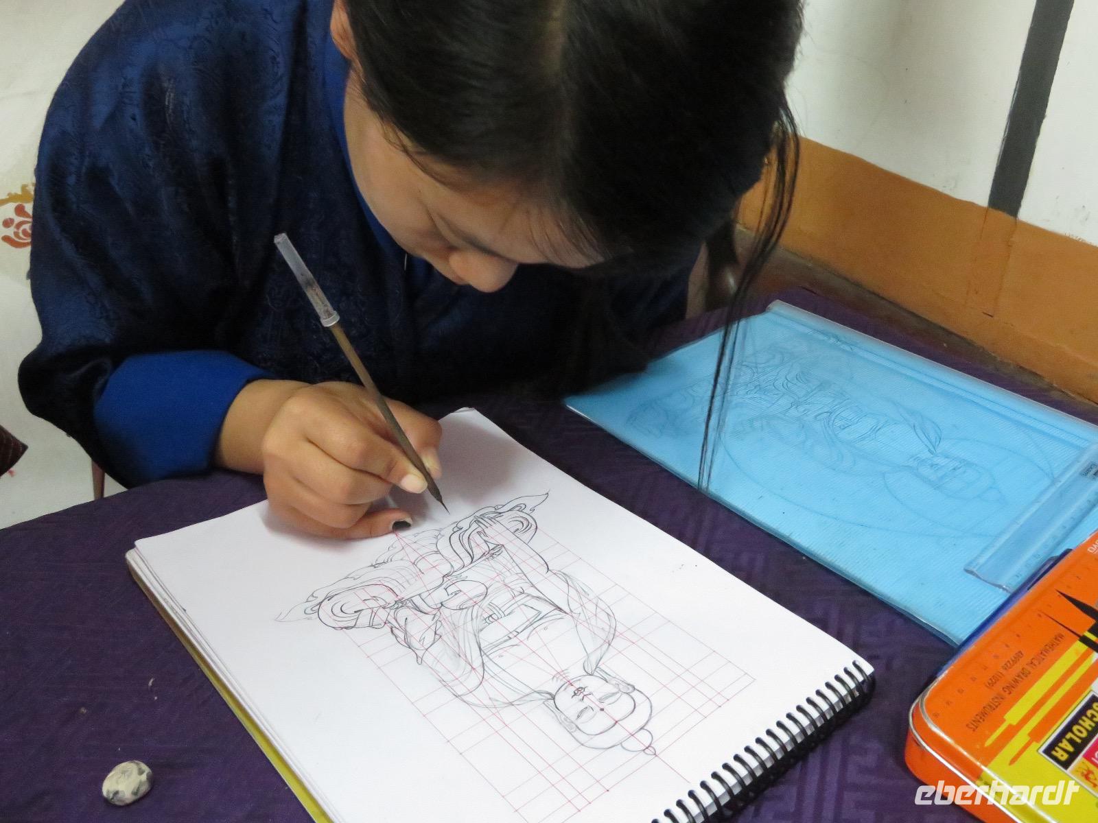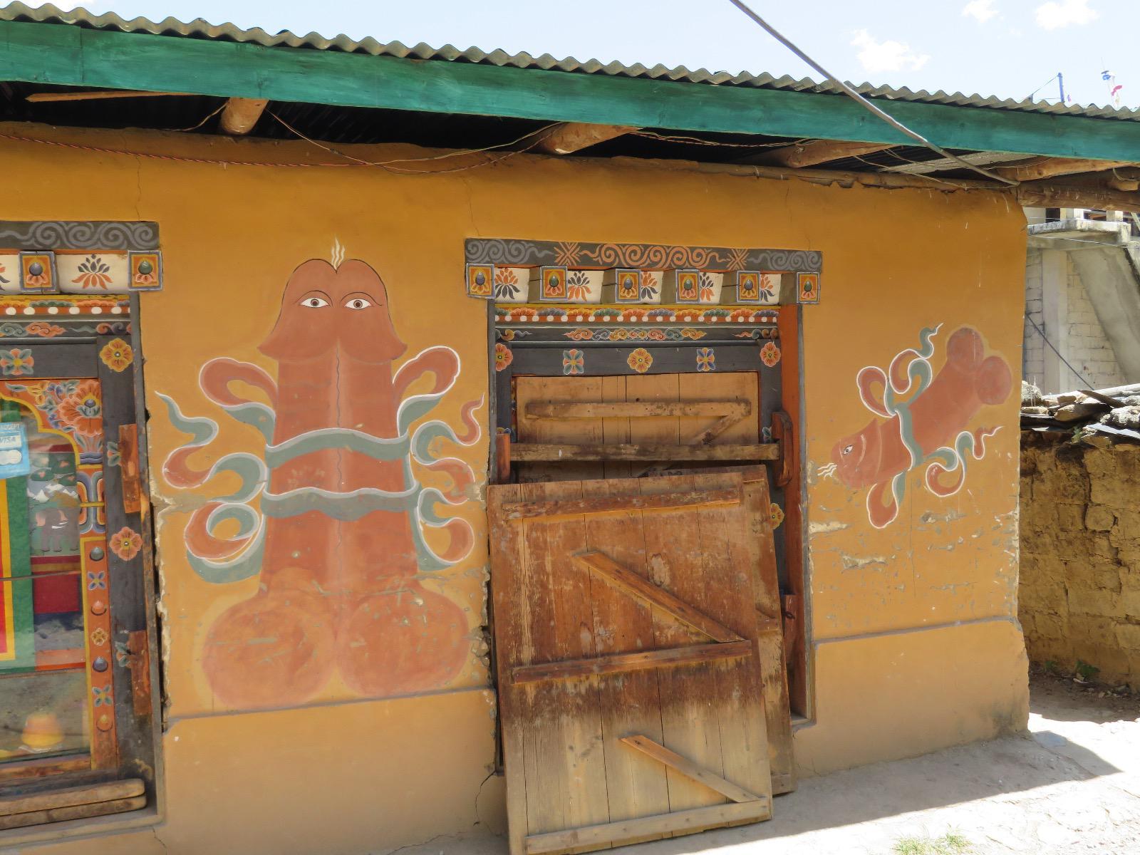 Nun geht es zu einer Handwerksstätte für Kinder aus armen Familien. Wie in Gangtok bekommen sie hier ebenfalls eine tolle Ausbildung in Malerei, Weberei, Schnitzerei und Wirtschaft. Die Berufschancen nach der Ausbildung sind sehr hoch, berichtete Sangay. Im Innenhof erzählt uns Sangay auch von der Geschichte der Harmonischen Vier, wie Vogel, Affe, Hase und Elefant einen Pfirsichbaum pflanzen und ernten und so nur zusammen stark sind.Neben dem recht kleinen, bescheidenen Königspalast, dem großen Parlamentsgebäude befindet sich der große Thimphu-Dzong. Ihr Inneres beherbergt unglaubliche Schätze an bunten Seidentüchern, Wandmalereien, welche den Lebenslauf Buddhas wiedergeben, und großartige Statuen sowie heilige Schriften. Die gewaltigen Ausmaße der Festung und die Ruhe hinter den Mauern geben eine besondere Aura.Wer noch nicht fußmüde ist, bummelt durch die Straßen und den lokalen Markt. Viele Produkte müssen aus Indien und Nepal importiert werden. Im oberen Stockwerk werden die biologisch angebauten Gemüse- und Kräuter wie auch eigens gezüchtete Hühner und Schweine verkauft, welche die Bauern auf ihrem Land selbst ernten. So finden wir hier Buttertee, Essfarn und Yakkäse. Seltsamerweise können wir auf dem Markt auch Rindfleisch kaufen, obwohl Rinder in dieser Welt ja heilig sind. Sangay verrät uns, dass sie selbst keine Rinder schlachten, aber doch auch Rindfleisch aus dem Ausland importieren und verspeisen. Ja, willkommen in Bhutan.