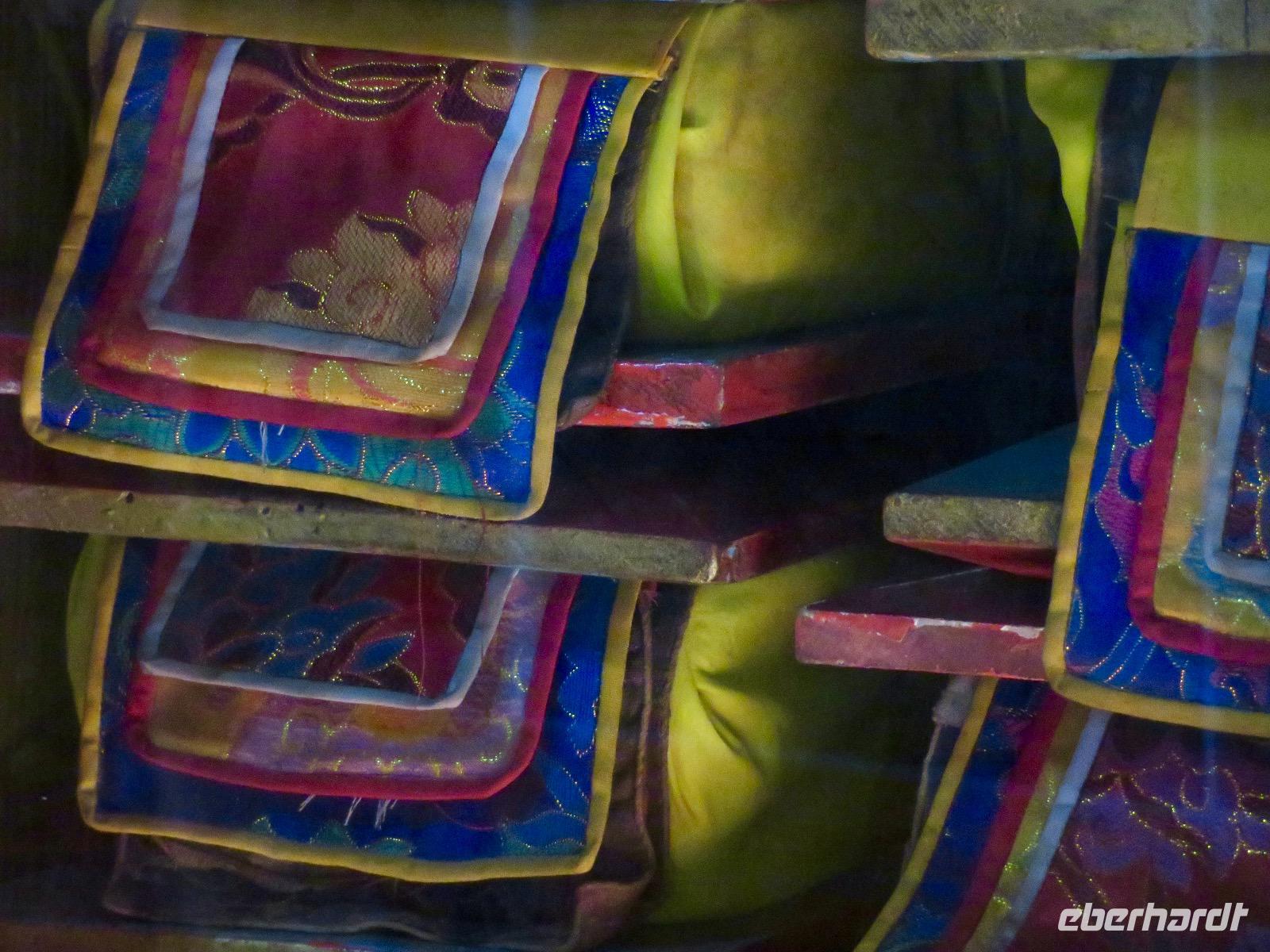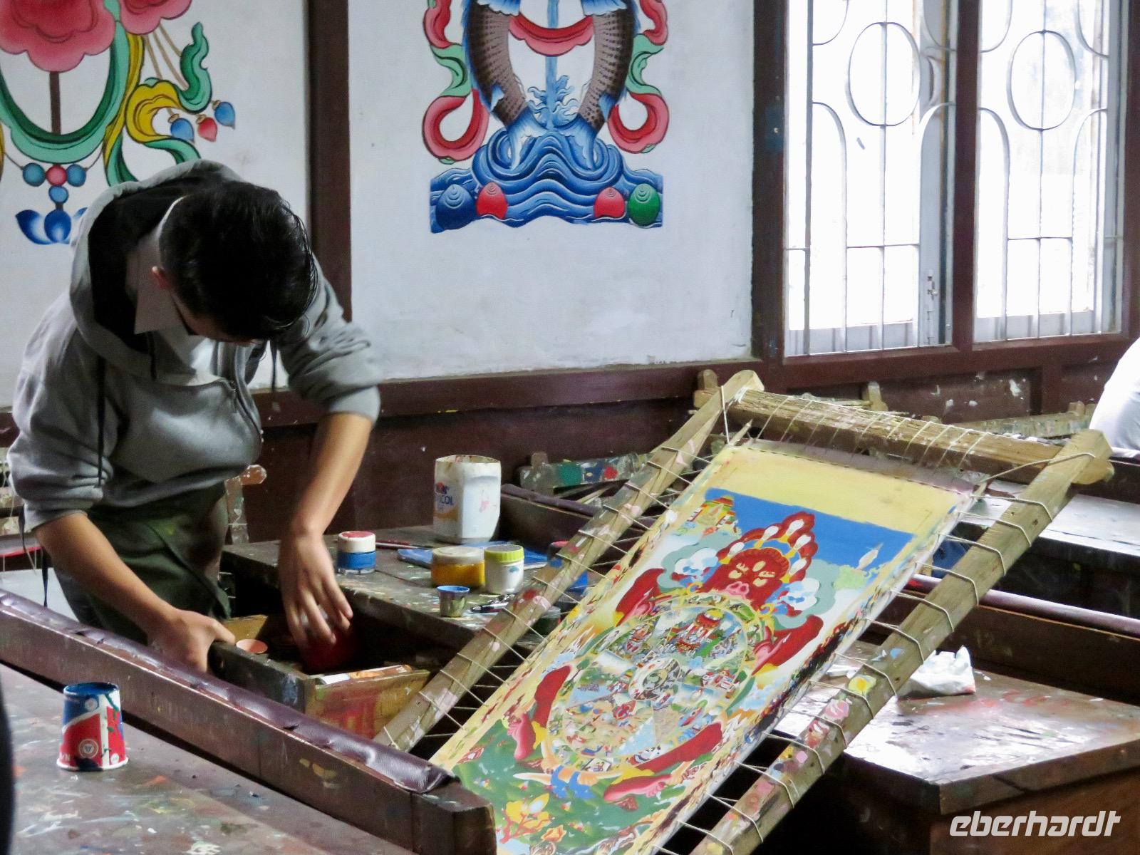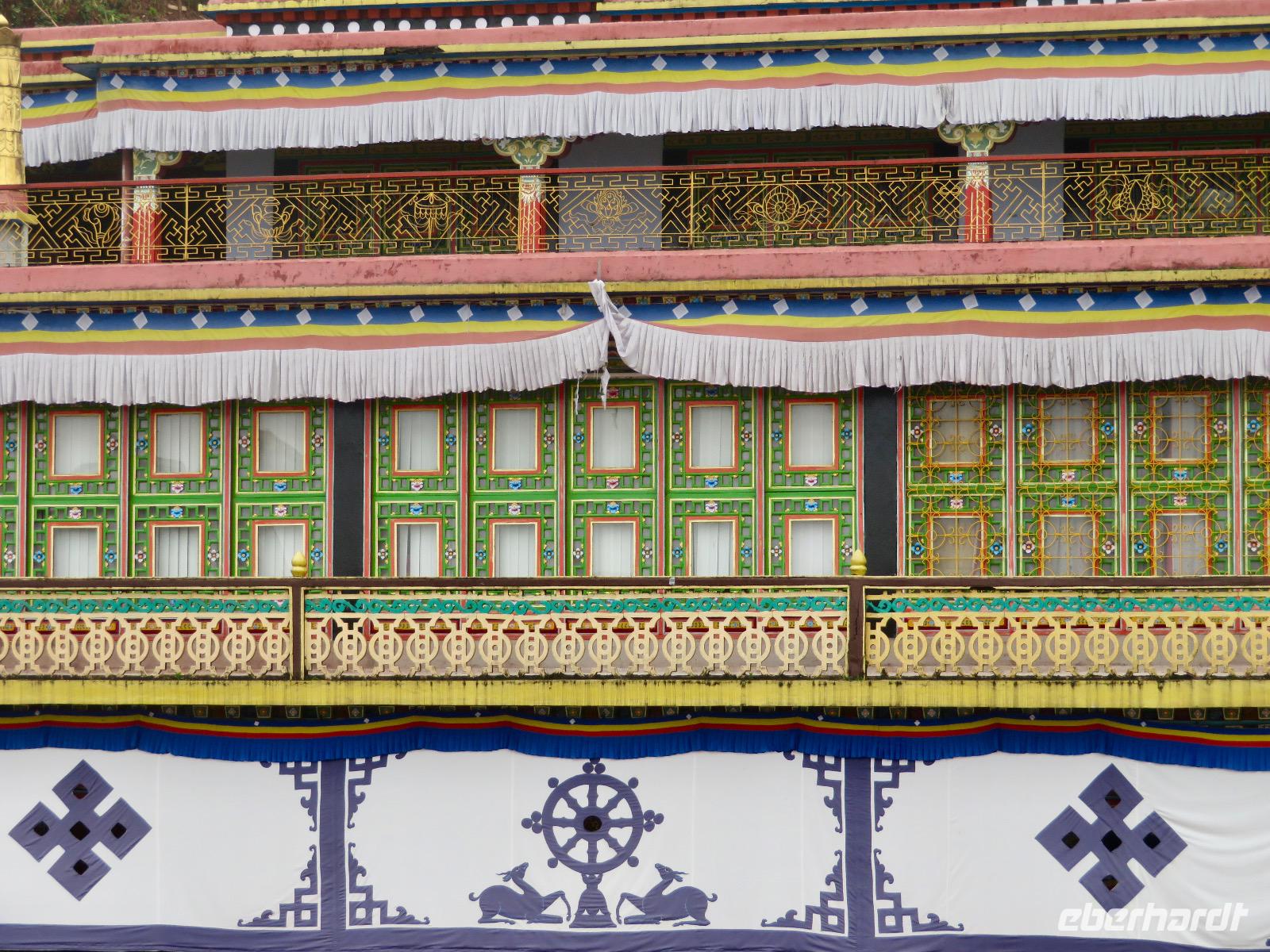 Die Klosteranlage schmiegt sich elegant am Bergrücken und wirkt besonders geheimnisvoll im sich umgebenden Nebelschleier. Das Oberhaupt der Schwarzhutbuddhisten floh 1960 aus Tibet und nahm die Einrichtug des Klosters mit. Somit besteht das Rumtek-Kloster anstelle des ursprünglichen Hauptsitzes Tibet. Leider wurde das ursprüngliche tibetische Kloster bei der Annexion Tibets im Jahre 1959 von den Chinesen zerstört. Bhawani erklärt uns, dass mehrere Lamas, buddhistische Lehrmeister, Anspruch auf den Thron des 17. Karmapa (Oberhaupt der Schwarzhutbuddhisten) erheben. Aus diesem Grund müssen die Mönche und das Kloster vor gewaltsame Erstürmung geschützt werden. Aus diesem Grund gibt es an allen Zugängen militärische Bewachung und strenge Kontrollen.Nach diesen tollen Eindrücken kehren wir in die Hauptstadt Gangtok zurück und besuchen das Museum für Tibetologie, welches wertvolle Schätze wie Bronzene Buddhastaturen, Instrumente und heilige Schriften in der Bibliothek beherbergt. Es folgt ein etwas spanisches Mittagessen am Nachmittag bevor wir noch schnell die Handwerksschule besuchen wollen. Jugendliche von armen Verhältnissen können hier eine Ausbildung absolvieren in Teppichweben, Malerei, Holzschnitzerei und Stickerei.
