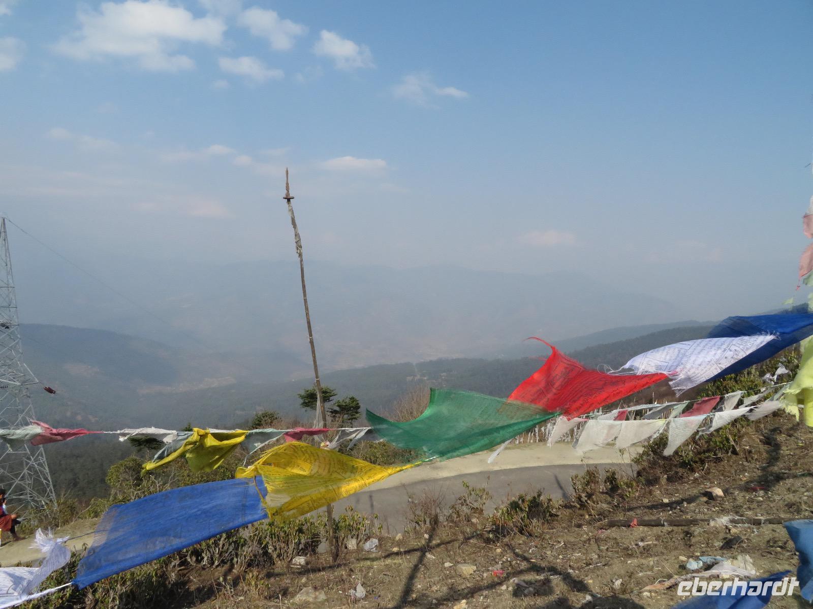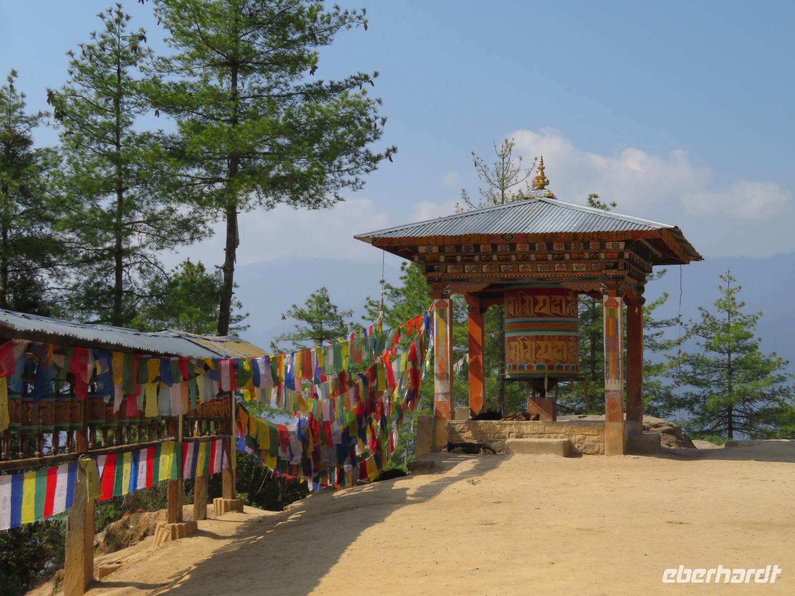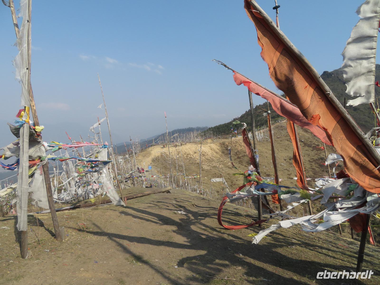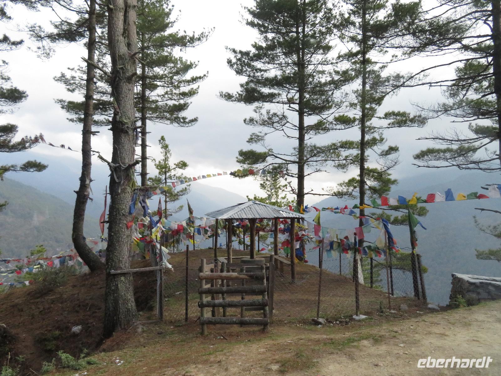 Nach dem Mittagessen bummeln einige Reisegäste weiter in der Stadt Paro, während die anderen zum Chelela-Pass auf 3.988 Metern fahren. Auf der Route zum Pass fahren wir durch Pinienwälder, die wie verwunschene Märchenwälder wirken, und passieren die Baumkrone. Auf dem Chelela-Pass heißt es warm anziehen, denn der eisige Wind peitscht so sehr, dass nur vereinzelt Gräser und niedriges Gebüsch wächst. Wieder tausende von Gebetsfahnen sind aufgestellt und geben dem Pass ein besonderes Flair. Die fünf Farben der rot, grün, gelb, blau und weiß stehen für die fünf Elemente Feuer, Fluss/Wasser, Land bzw. auch der Buddhismus, Himmel und Luft bzw. den Geist/die Reinheit. Leider ist die Aussicht etwas diesig, sodass wir nur erahnen können, dass sich das Haa-Tal auf der linken Seite und das Paro-Tal auf der rechten Seite befindet. Auf der Rückfahrt begegnen wir eine Herde Yaks, die auf einer blühenden Wiese genüsslich grasen.