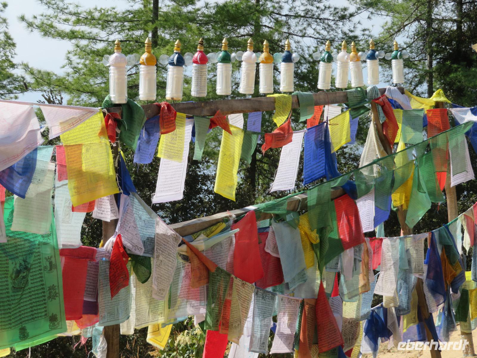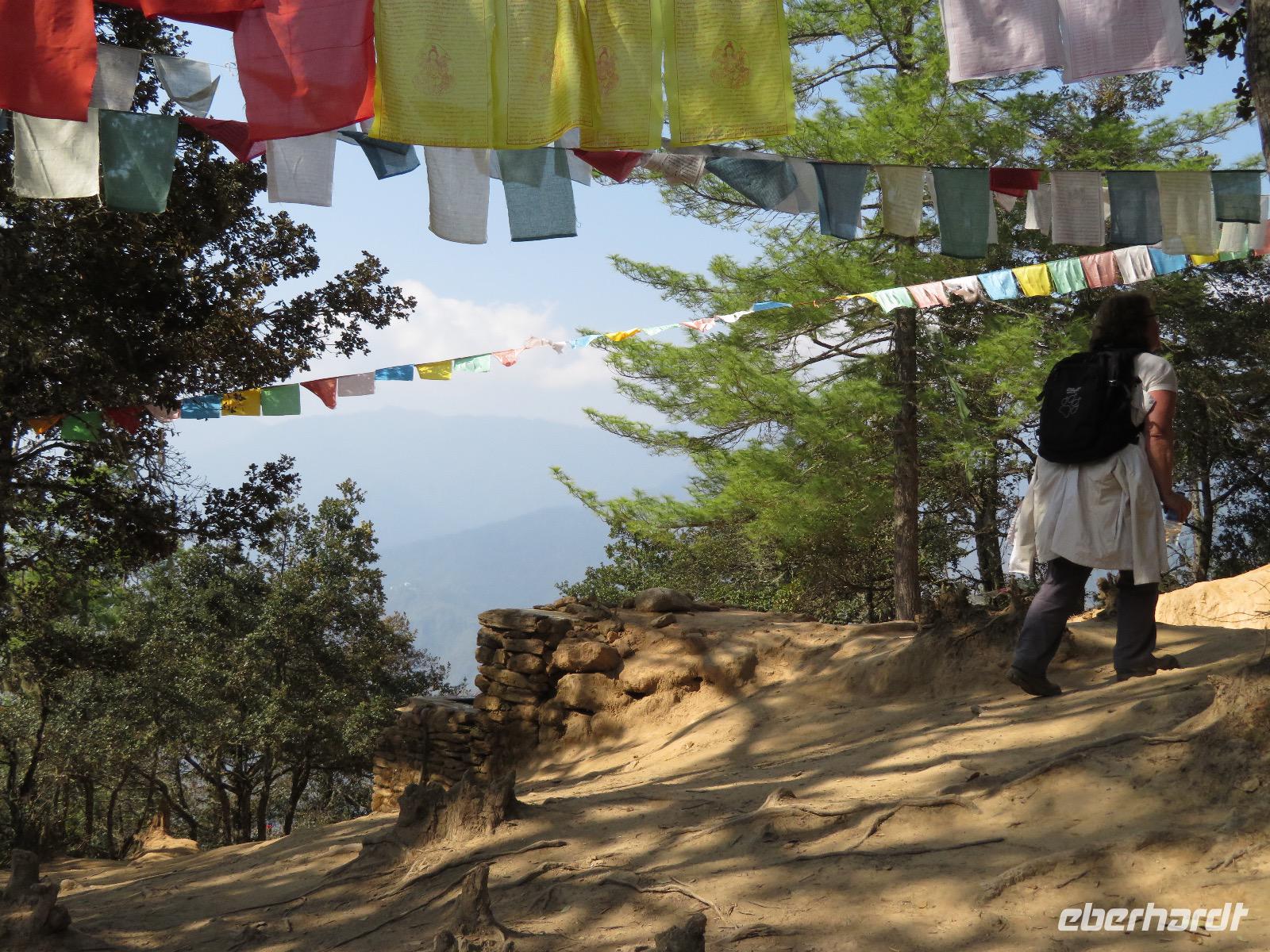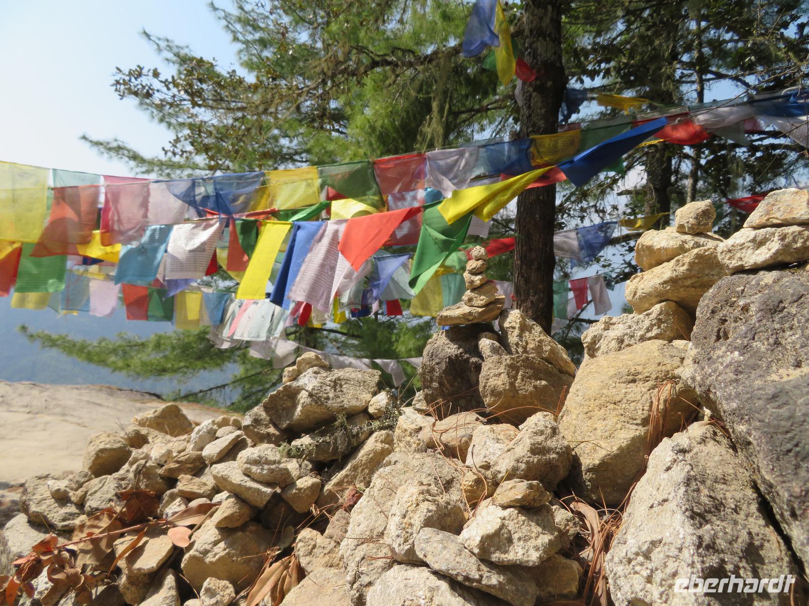 Nach dem Mittagessen bummeln einige Reisegäste weiter in der Stadt Paro, während die anderen zum Chelela-Pass auf 3.988 Metern fahren. Auf der Route zum Pass fahren wir durch Pinienwälder, die wie verwunschene Märchenwälder wirken, und passieren die Baumkrone. Auf dem Chelela-Pass heißt es warm anziehen, denn der eisige Wind peitscht so sehr, dass nur vereinzelt Gräser und niedriges Gebüsch wächst. Wieder tausende von Gebetsfahnen sind aufgestellt und geben dem Pass ein besonderes Flair. Die fünf Farben der rot, grün, gelb, blau und weiß stehen für die fünf Elemente Feuer, Fluss/Wasser, Land bzw. auch der Buddhismus, Himmel und Luft bzw. den Geist/die Reinheit. Leider ist die Aussicht etwas diesig, sodass wir nur erahnen können, dass sich das Haa-Tal auf der linken Seite und das Paro-Tal auf der rechten Seite befindet. Auf der Rückfahrt begegnen wir eine Herde Yaks, die auf einer blühenden Wiese genüsslich grasen.