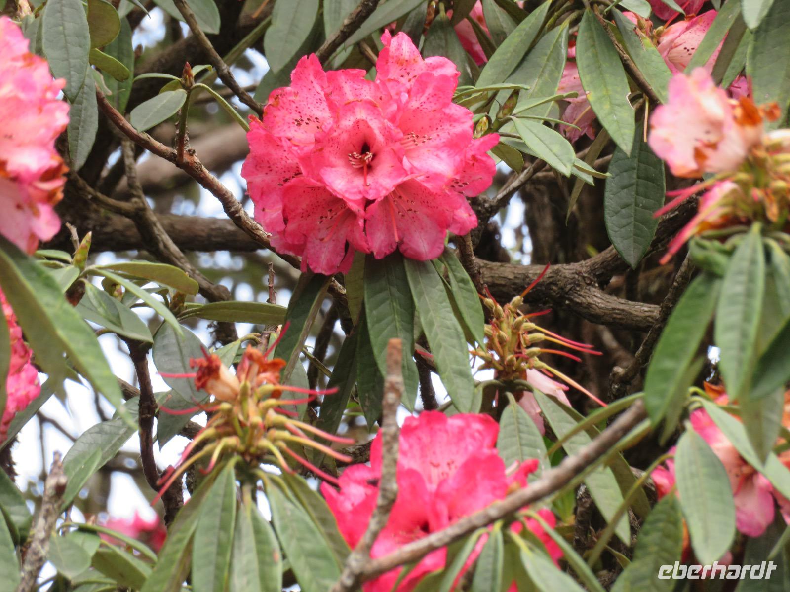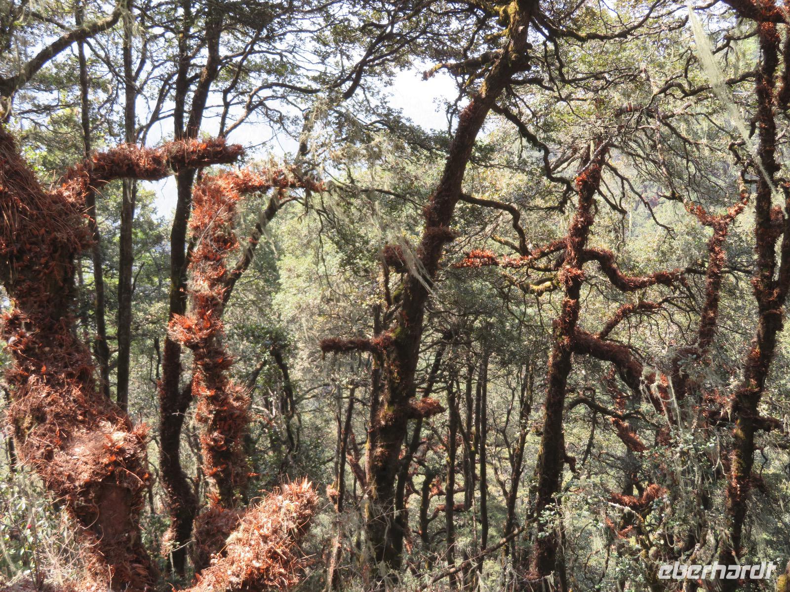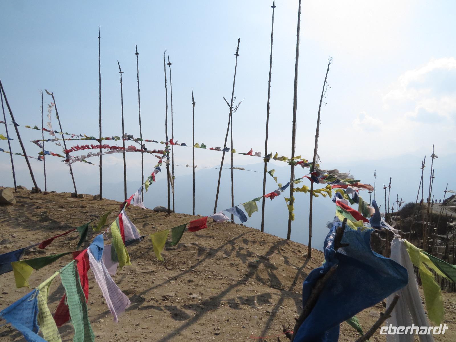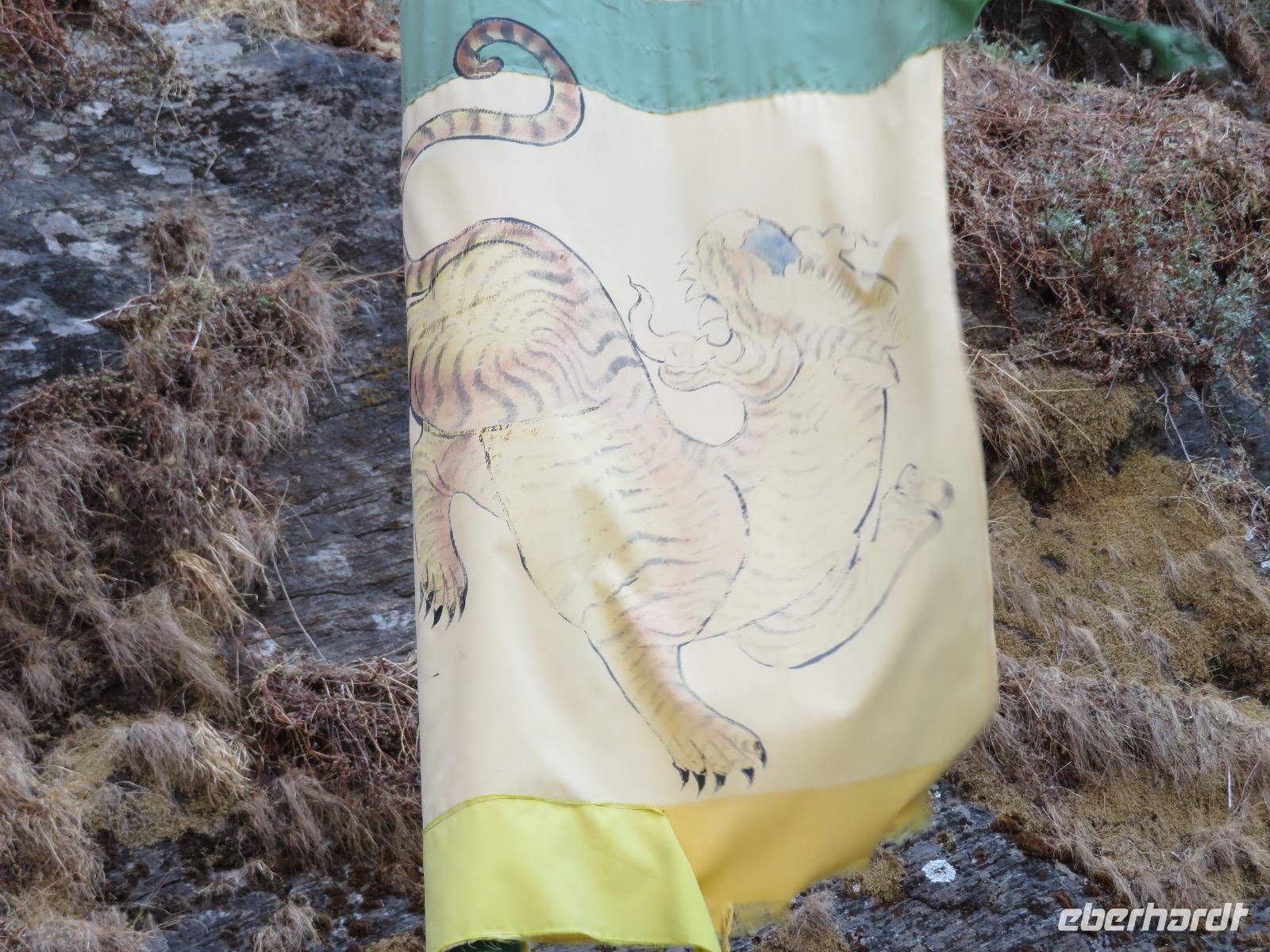Nach dem Mittagessen bummeln einige Reisegäste weiter in der Stadt Paro, während die anderen zum Chelela-Pass auf 3.988 Metern fahren. Auf der Route zum Pass fahren wir durch Pinienwälder, die wie verwunschene Märchenwälder wirken, und passieren die Baumkrone. Auf dem Chelela-Pass heißt es warm anziehen, denn der eisige Wind peitscht so sehr, dass nur vereinzelt Gräser und niedriges Gebüsch wächst. Wieder tausende von Gebetsfahnen sind aufgestellt und geben dem Pass ein besonderes Flair. Die fünf Farben der rot, grün, gelb, blau und weiß stehen für die fünf Elemente Feuer, Fluss/Wasser, Land bzw. auch der Buddhismus, Himmel und Luft bzw. den Geist/die Reinheit. Leider ist die Aussicht etwas diesig, sodass wir nur erahnen können, dass sich das Haa-Tal auf der linken Seite und das Paro-Tal auf der rechten Seite befindet. Auf der Rückfahrt begegnen wir eine Herde Yaks, die auf einer blühenden Wiese genüsslich grasen.