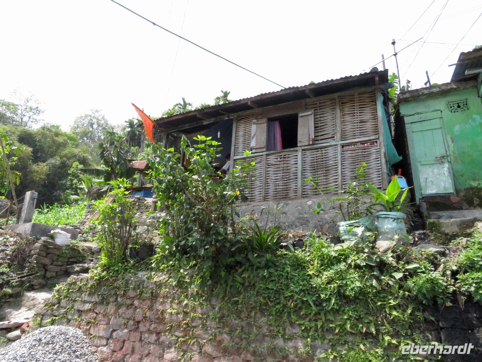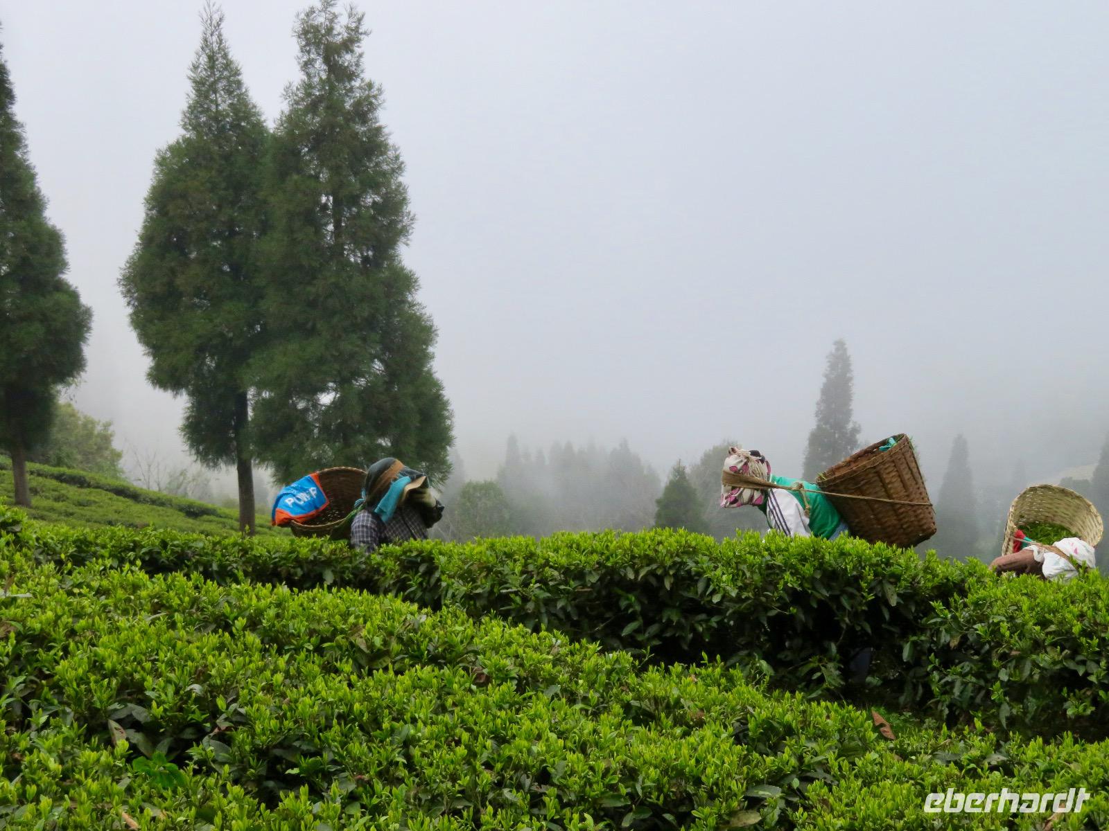 Wir sind bereits vertraut mit Flugverspätungen und müssen auch dieses Mal 30 Minuten dafür einbüßen. Während des Fluges klappert es mal hier, mal da - wer weiß, ob der Pilot doch ein Sikh ist? Von Bagdogra fahren wir vorbei an Assamteeplantagen im Tiefland bevor es die Berge hinauf in den "Teeort" Darjeeling geht. Der Weg führt uns teilweise entlang der recht schlecht erhaltenen berühmten und inzwischen teilweise stillgelegten Himalayan-Darjeeling-Railway - immerhin zum UNESCO-Weltkulturerbe gehörend. Unterwegs gibt es natürlich Fotostopps, unter anderem an einer der berühmten Teeplantagen. Angelegt hatte man die Teeplantagen auf damals englisch beherrschtem Territorium seit Mitte des 19. Jh. um ausbleibende Teelieferungen aus China zu kompensieren. So sind die Teeplantagen von Darjeeling bereits 120 Jahre alt, während Assamteeplantagen nur ca. 60 Jahre alt sind. Bis heute wurde daraus die wohl berühmteste Teeregion der Welt, aus dem der Tee in zwölf Qualitätsstufen stammt, darunter die kostbarsten im Handel erhältlichen Tees, bsp. der Weiße Tee mit nur den ersten, jungen Teespitzen (First Blossom). Nicht um sonst sagt man auch, Darjeelingtee ist der Champagner unter den Tees.