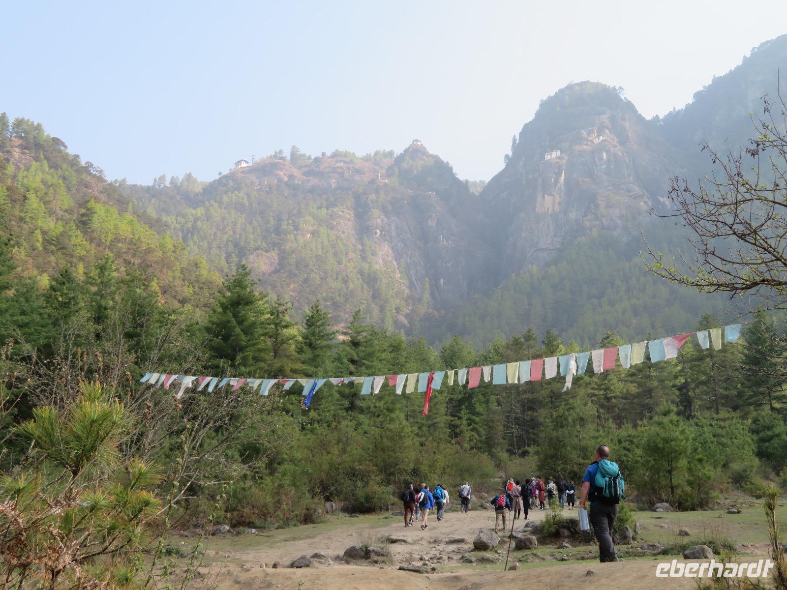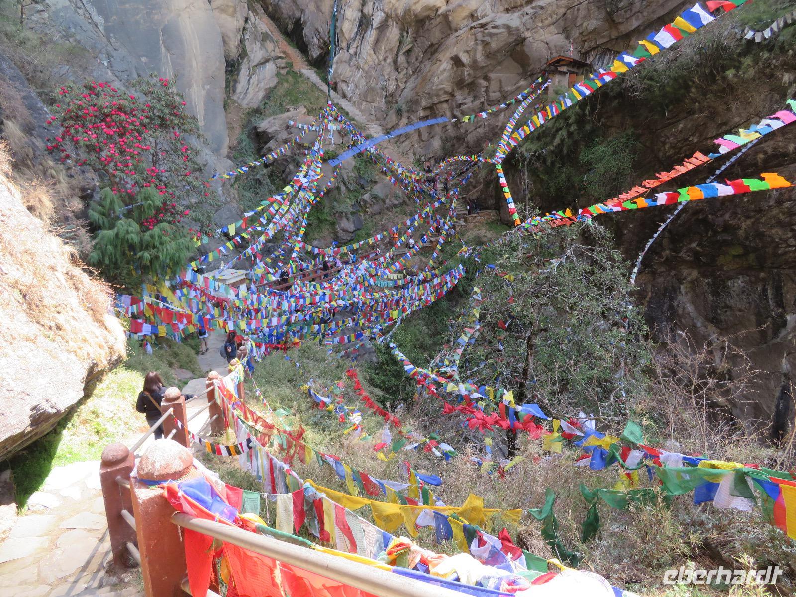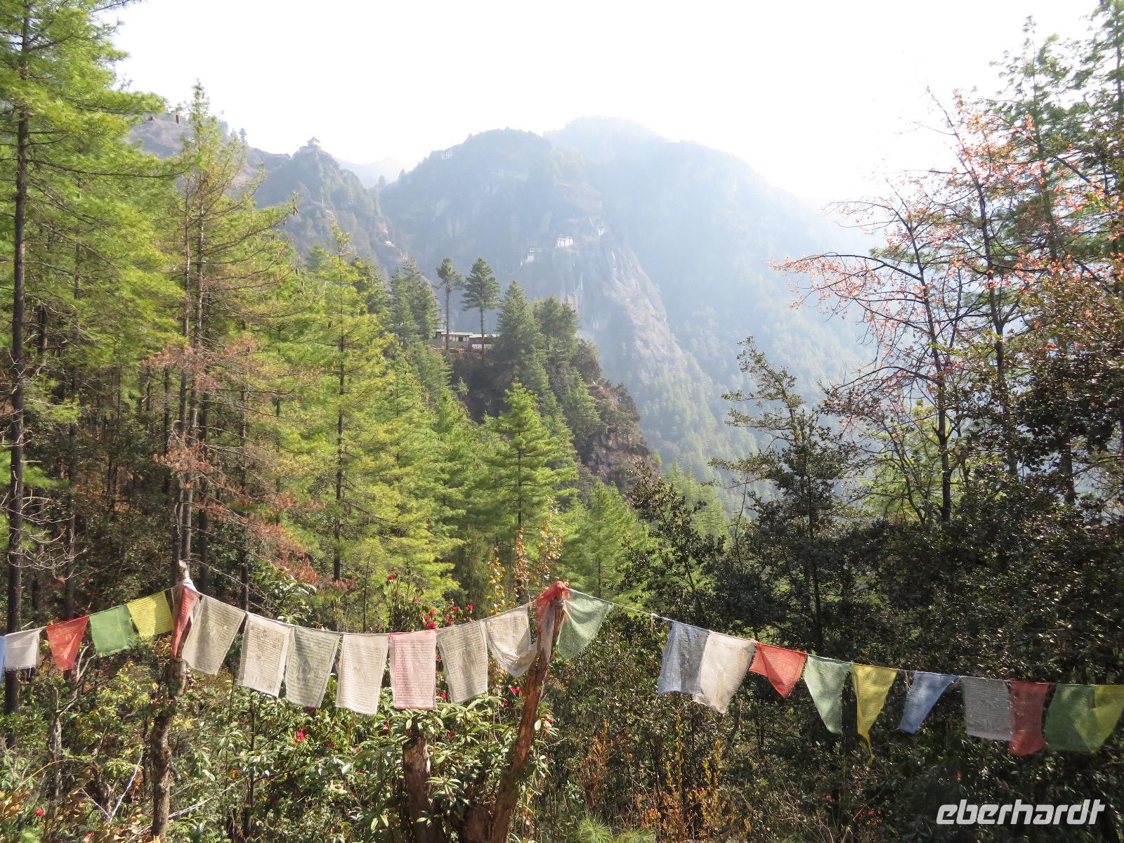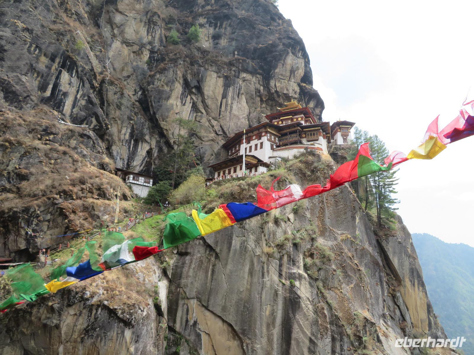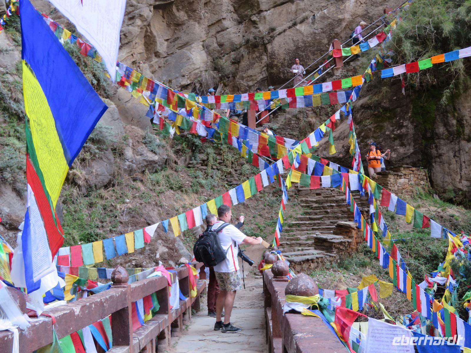 Ein besonderer Höhepunkt der Reise ist das unverwechselbare Kloster Taktsang auf dem Tigerfelsen. Gut die Hälfte der Reisegruppe erklärt sich bereit zur tapferen Wanderung mit einer Höhenüberwindung von ca. 800 Metern. Zeitig am Morgen steigen wir tapfer die erste Hälfte bis zur Cafeteria hinauf. Unterwegs lassen wir ein paar Mulis vorbei und blicken über das schöne Paro-Tal, welches heute deutlicher sichtbar ist. Nach einer Kaffeepause nehmen wir uns die zweite Etappe des Aufstieges vor. Vorbei am Geburtshaus eines ehemaligen buddhistischen Lehrmeisters und Gebetsmühlen erreichen wir den ersten Aussichtspunkt über das beeindruckende Tigernest. Wer mag, steigt 150 Stufen hinab zu einer mit Gebetsfahnen übersäten Brücke. Links von uns ergießt sich ein schöner Wasserfall. Wir halten Kurs auf das Tigernest und überwinden die letzten 100 Stufen hinauf. Aus Respekt und Sicherheit müssen wir die Schuhe ausziehen sowie uns von allen elektronischen Geräte entledigen. Der Blick auf und in die verschiedenen der acht Tempeln macht alle Anstrengungen des Aufstieges wieder gut. Hier in einer Höhle soll Buddhisathva drei Monate lang meditiert haben. Nach ihm haben es viele weitere Buddhistische Meister getan und im 12. Jahrhundert ließ ein Mönch dieses Kloster errichten. Es heißt, wer den Aufstieg auf das Tigernest geschafft hat, wird mit vielem guten Karma gesegnet. Mit gutem Karma und guter Laune begeben wir uns auf den Rückweg.