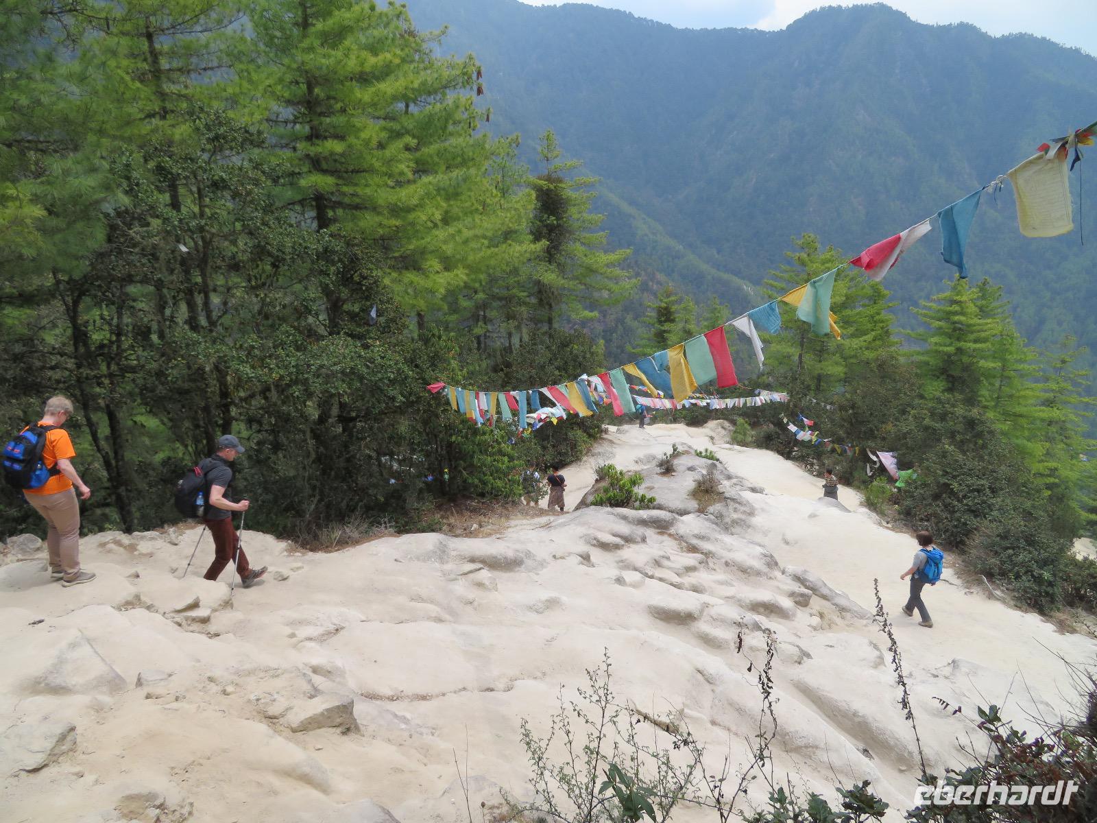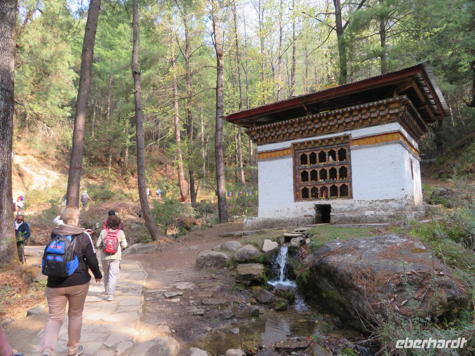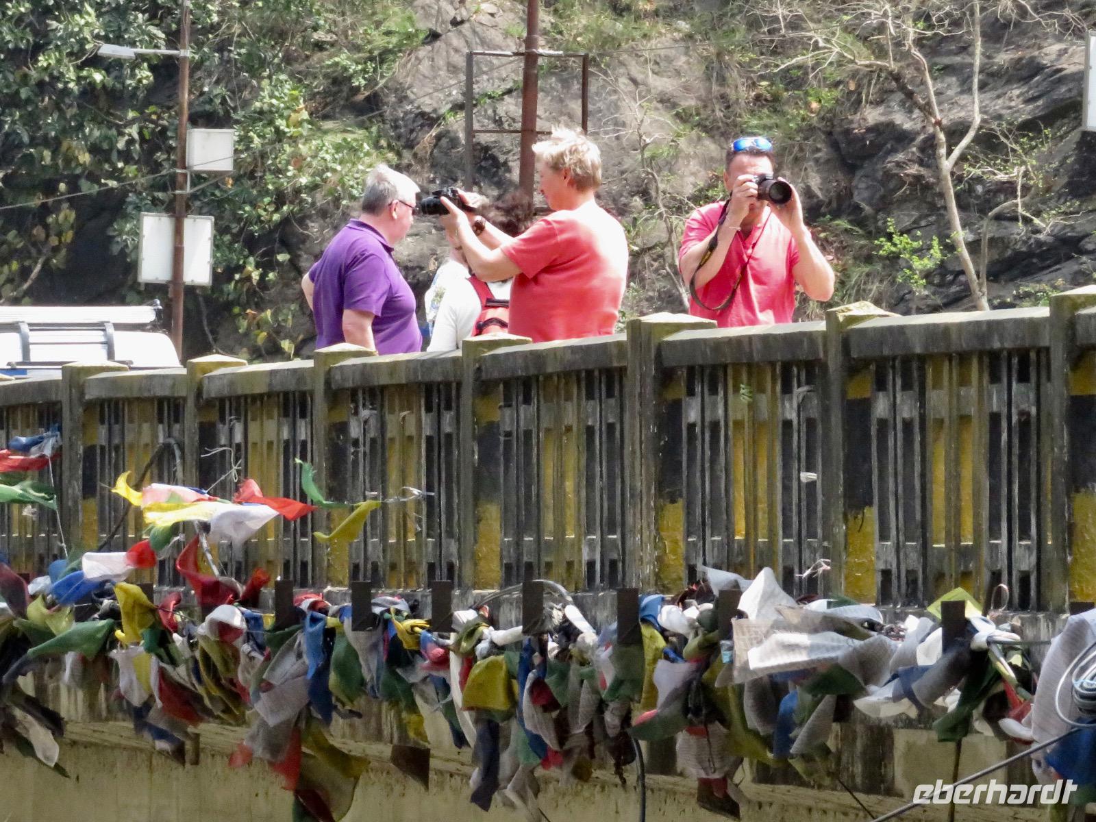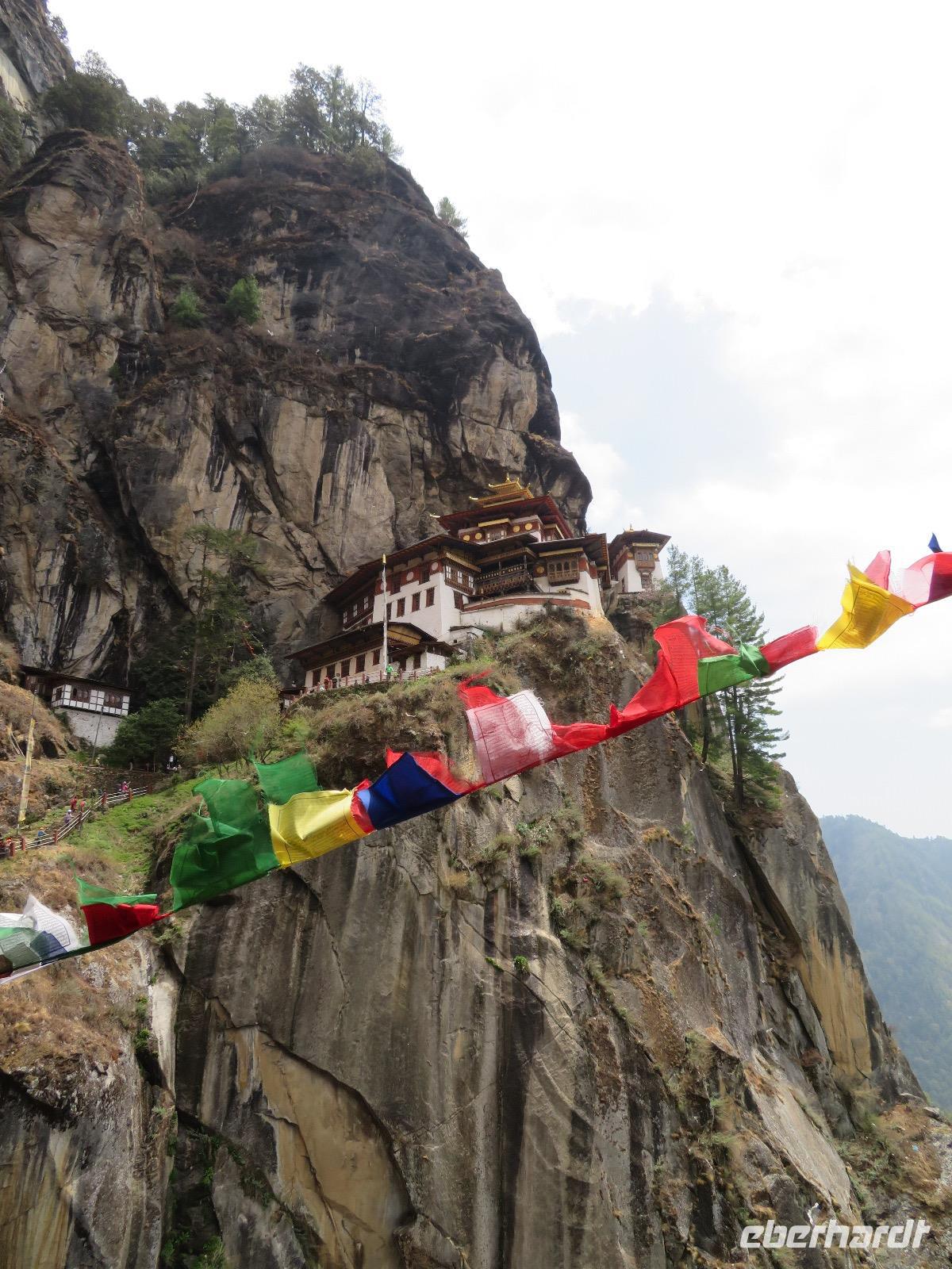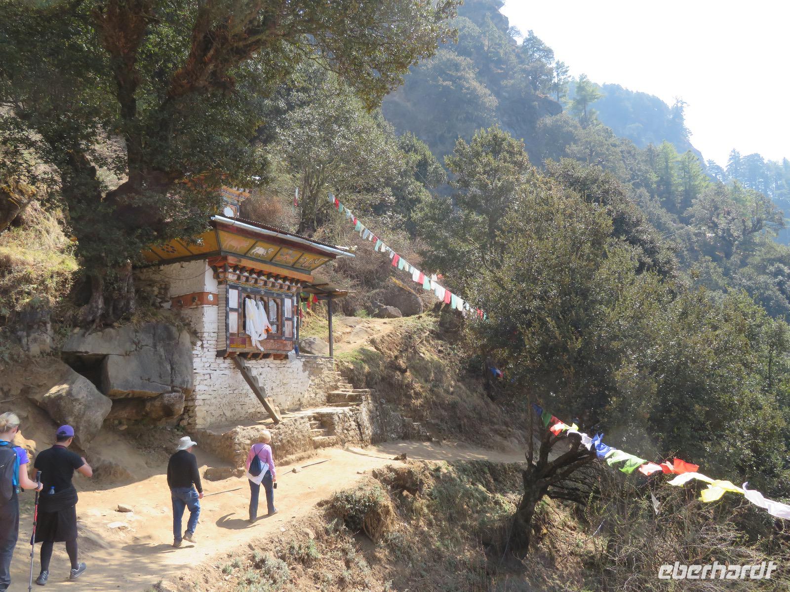 Ein besonderer Höhepunkt der Reise ist das unverwechselbare Kloster Taktsang auf dem Tigerfelsen. Gut die Hälfte der Reisegruppe erklärt sich bereit zur tapferen Wanderung mit einer Höhenüberwindung von ca. 800 Metern. Zeitig am Morgen steigen wir tapfer die erste Hälfte bis zur Cafeteria hinauf. Unterwegs lassen wir ein paar Mulis vorbei und blicken über das schöne Paro-Tal, welches heute deutlicher sichtbar ist. Nach einer Kaffeepause nehmen wir uns die zweite Etappe des Aufstieges vor. Vorbei am Geburtshaus eines ehemaligen buddhistischen Lehrmeisters und Gebetsmühlen erreichen wir den ersten Aussichtspunkt über das beeindruckende Tigernest. Wer mag, steigt 150 Stufen hinab zu einer mit Gebetsfahnen übersäten Brücke. Links von uns ergießt sich ein schöner Wasserfall. Wir halten Kurs auf das Tigernest und überwinden die letzten 100 Stufen hinauf. Aus Respekt und Sicherheit müssen wir die Schuhe ausziehen sowie uns von allen elektronischen Geräte entledigen. Der Blick auf und in die verschiedenen der acht Tempeln macht alle Anstrengungen des Aufstieges wieder gut. Hier in einer Höhle soll Buddhisathva drei Monate lang meditiert haben. Nach ihm haben es viele weitere Buddhistische Meister getan und im 12. Jahrhundert ließ ein Mönch dieses Kloster errichten. Es heißt, wer den Aufstieg auf das Tigernest geschafft hat, wird mit vielem guten Karma gesegnet. Mit gutem Karma und guter Laune begeben wir uns auf den Rückweg.