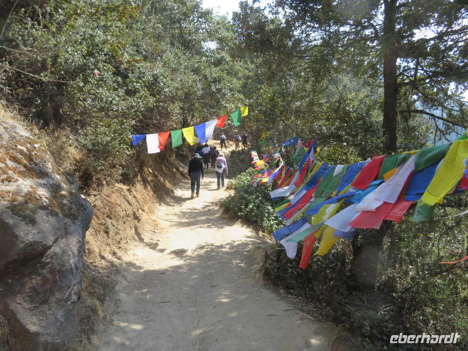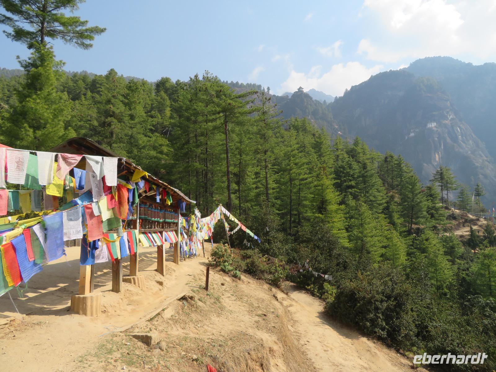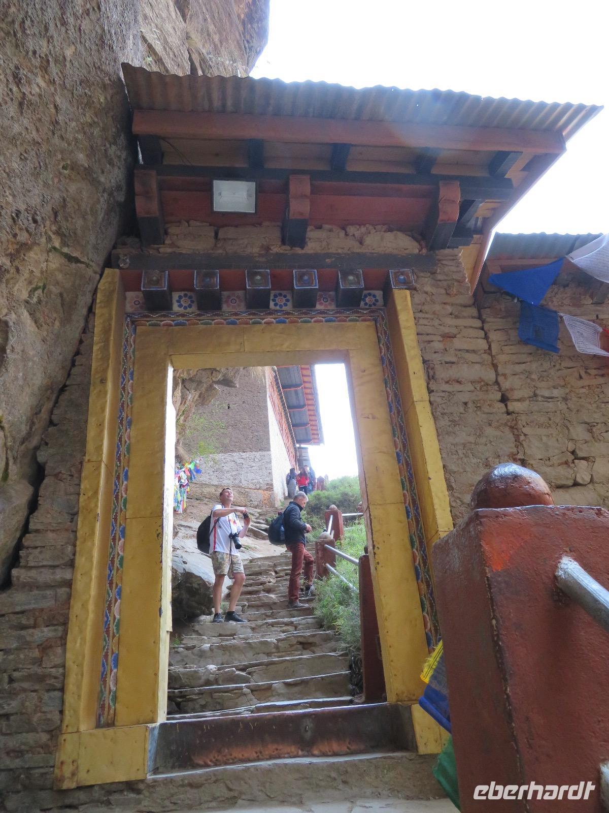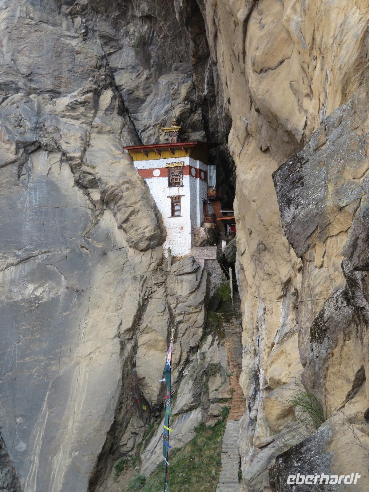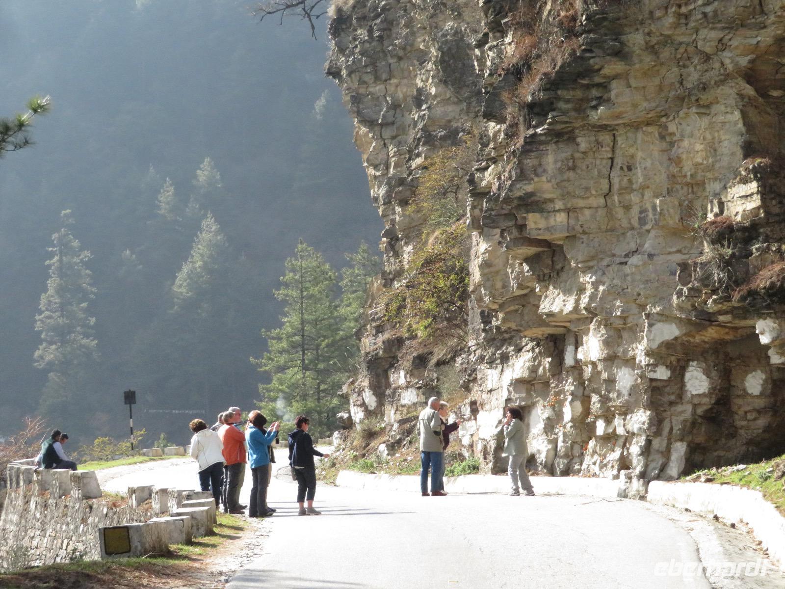 Ein besonderer Höhepunkt der Reise ist das unverwechselbare Kloster Taktsang auf dem Tigerfelsen. Gut die Hälfte der Reisegruppe erklärt sich bereit zur tapferen Wanderung mit einer Höhenüberwindung von ca. 800 Metern. Zeitig am Morgen steigen wir tapfer die erste Hälfte bis zur Cafeteria hinauf. Unterwegs lassen wir ein paar Mulis vorbei und blicken über das schöne Paro-Tal, welches heute deutlicher sichtbar ist. Nach einer Kaffeepause nehmen wir uns die zweite Etappe des Aufstieges vor. Vorbei am Geburtshaus eines ehemaligen buddhistischen Lehrmeisters und Gebetsmühlen erreichen wir den ersten Aussichtspunkt über das beeindruckende Tigernest. Wer mag, steigt 150 Stufen hinab zu einer mit Gebetsfahnen übersäten Brücke. Links von uns ergießt sich ein schöner Wasserfall. Wir halten Kurs auf das Tigernest und überwinden die letzten 100 Stufen hinauf. Aus Respekt und Sicherheit müssen wir die Schuhe ausziehen sowie uns von allen elektronischen Geräte entledigen. Der Blick auf und in die verschiedenen der acht Tempeln macht alle Anstrengungen des Aufstieges wieder gut. Hier in einer Höhle soll Buddhisathva drei Monate lang meditiert haben. Nach ihm haben es viele weitere Buddhistische Meister getan und im 12. Jahrhundert ließ ein Mönch dieses Kloster errichten. Es heißt, wer den Aufstieg auf das Tigernest geschafft hat, wird mit vielem guten Karma gesegnet. Mit gutem Karma und guter Laune begeben wir uns auf den Rückweg.