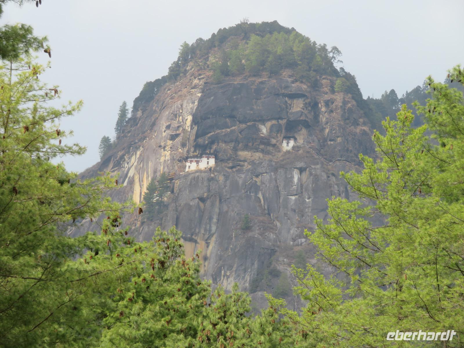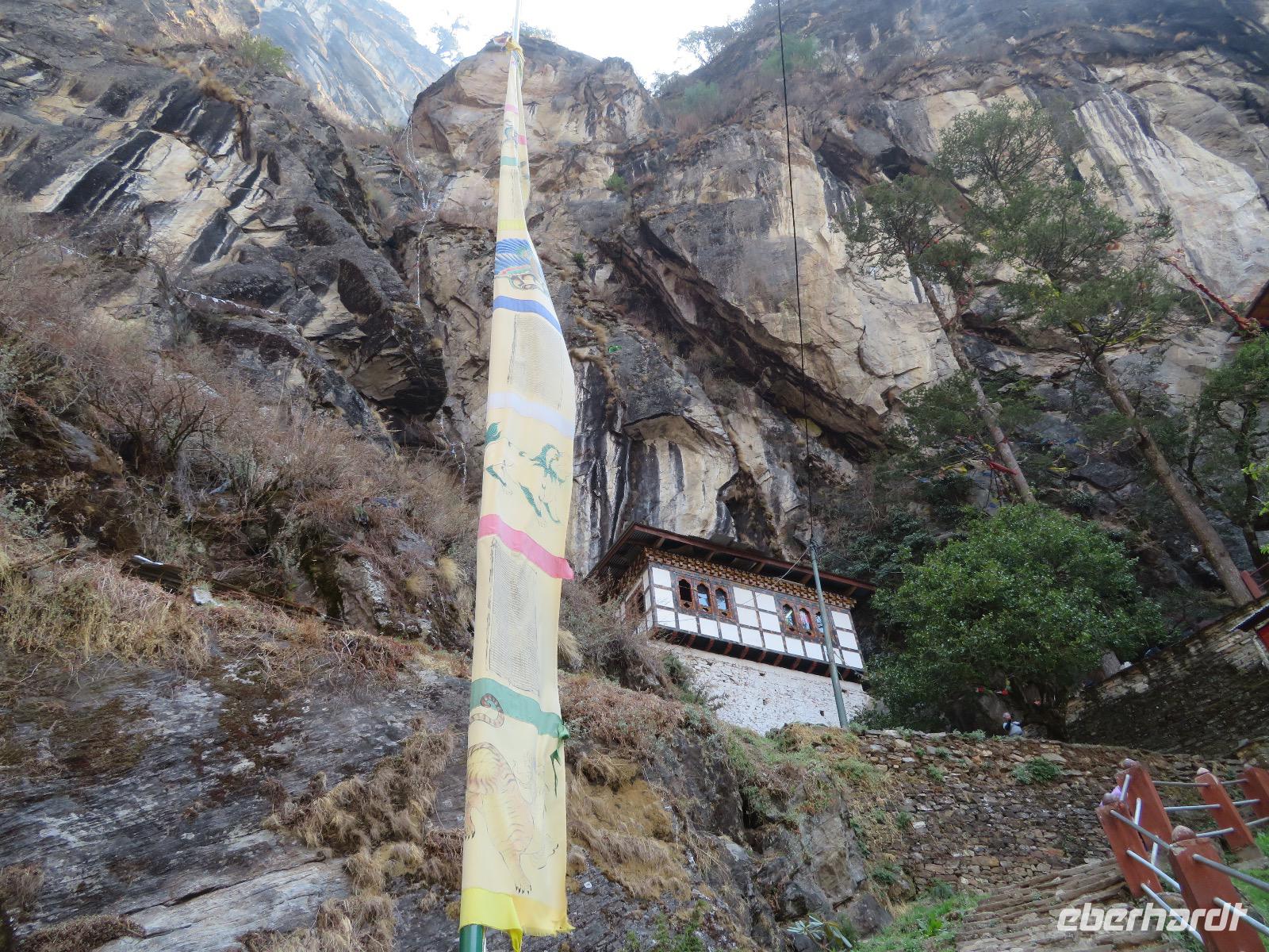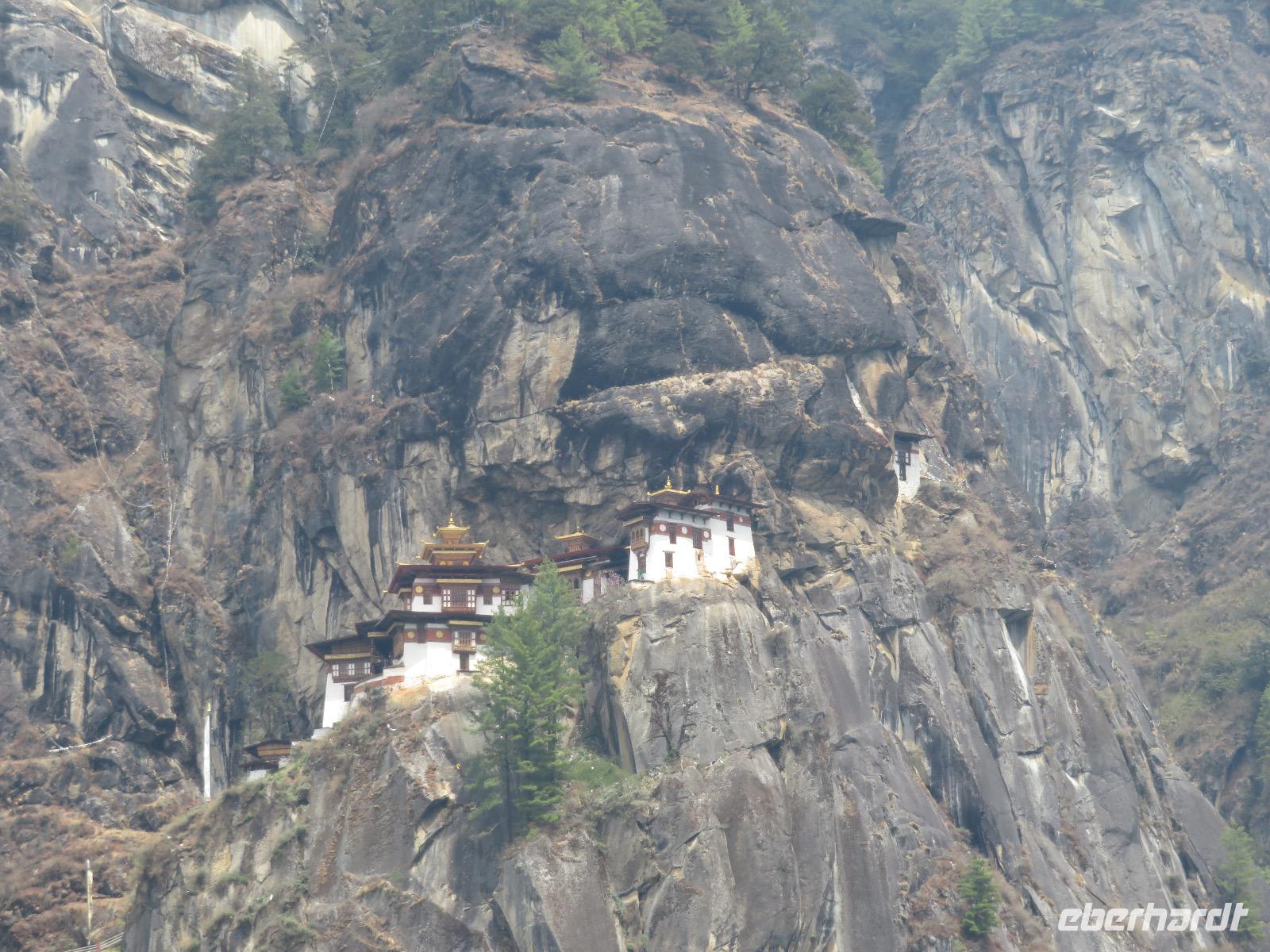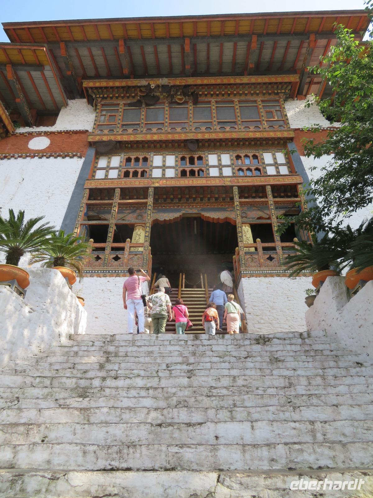 Ein besonderer Höhepunkt der Reise ist das unverwechselbare Kloster Taktsang auf dem Tigerfelsen. Gut die Hälfte der Reisegruppe erklärt sich bereit zur tapferen Wanderung mit einer Höhenüberwindung von ca. 800 Metern. Zeitig am Morgen steigen wir tapfer die erste Hälfte bis zur Cafeteria hinauf. Unterwegs lassen wir ein paar Mulis vorbei und blicken über das schöne Paro-Tal, welches heute deutlicher sichtbar ist. Nach einer Kaffeepause nehmen wir uns die zweite Etappe des Aufstieges vor. Vorbei am Geburtshaus eines ehemaligen buddhistischen Lehrmeisters und Gebetsmühlen erreichen wir den ersten Aussichtspunkt über das beeindruckende Tigernest. Wer mag, steigt 150 Stufen hinab zu einer mit Gebetsfahnen übersäten Brücke. Links von uns ergießt sich ein schöner Wasserfall. Wir halten Kurs auf das Tigernest und überwinden die letzten 100 Stufen hinauf. Aus Respekt und Sicherheit müssen wir die Schuhe ausziehen sowie uns von allen elektronischen Geräte entledigen. Der Blick auf und in die verschiedenen der acht Tempeln macht alle Anstrengungen des Aufstieges wieder gut. Hier in einer Höhle soll Buddhisathva drei Monate lang meditiert haben. Nach ihm haben es viele weitere Buddhistische Meister getan und im 12. Jahrhundert ließ ein Mönch dieses Kloster errichten. Es heißt, wer den Aufstieg auf das Tigernest geschafft hat, wird mit vielem guten Karma gesegnet. Mit gutem Karma und guter Laune begeben wir uns auf den Rückweg.