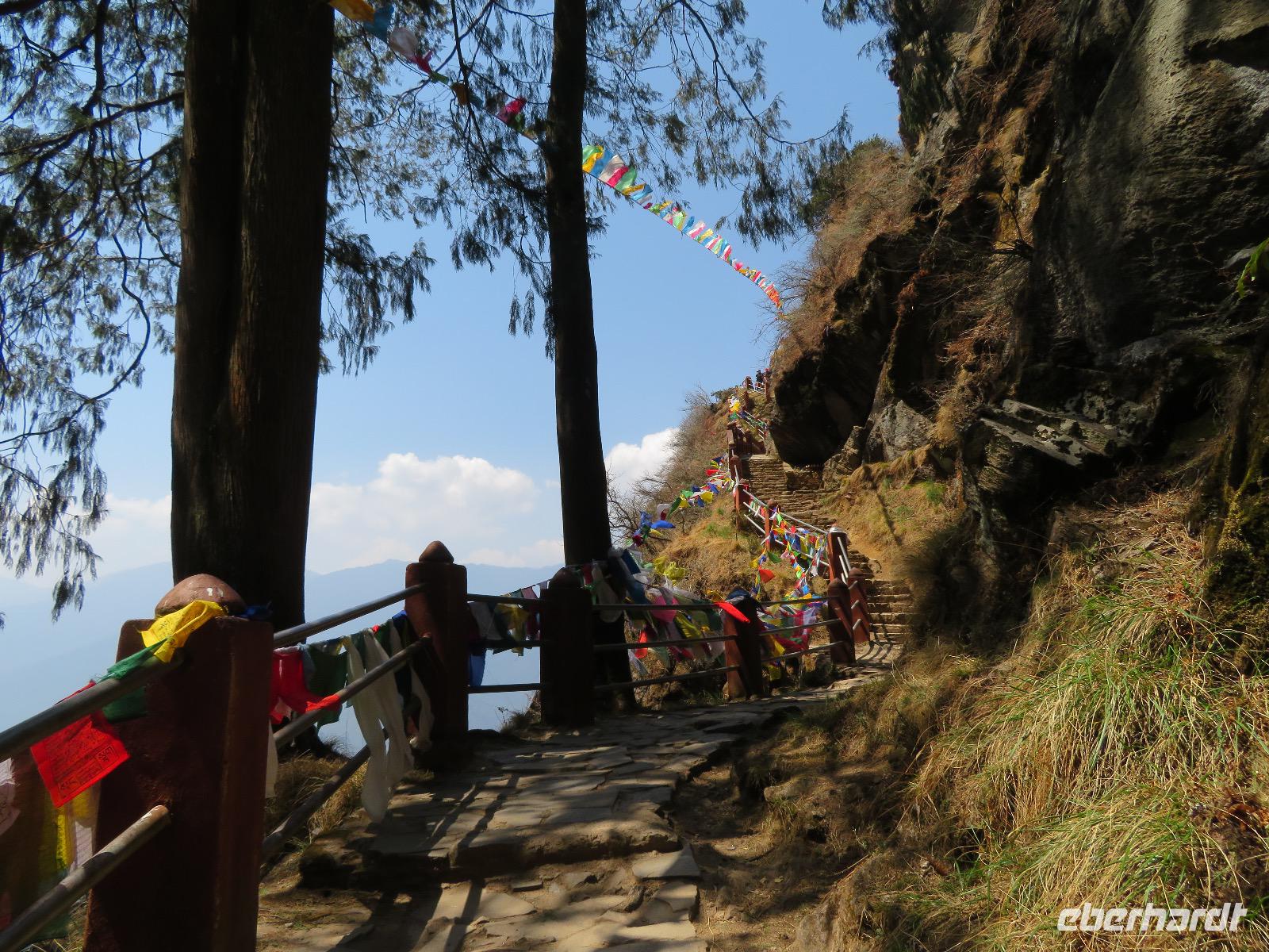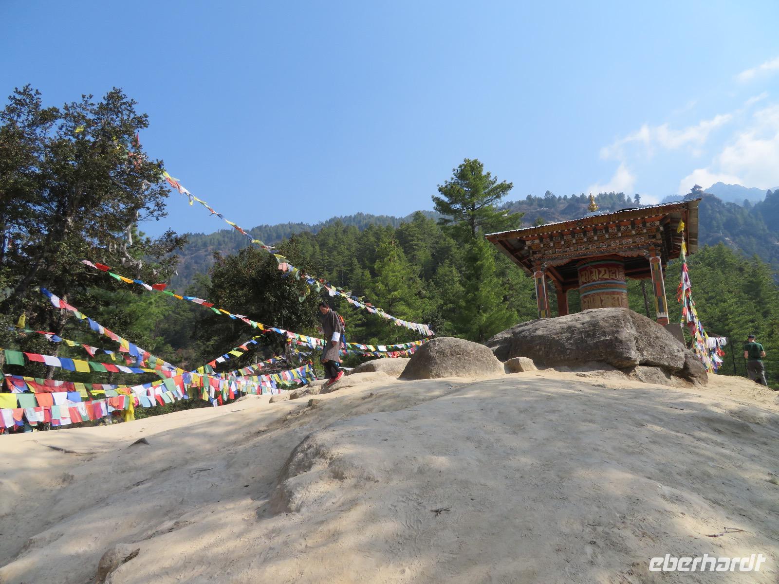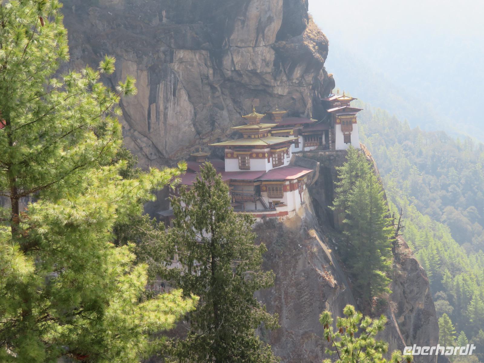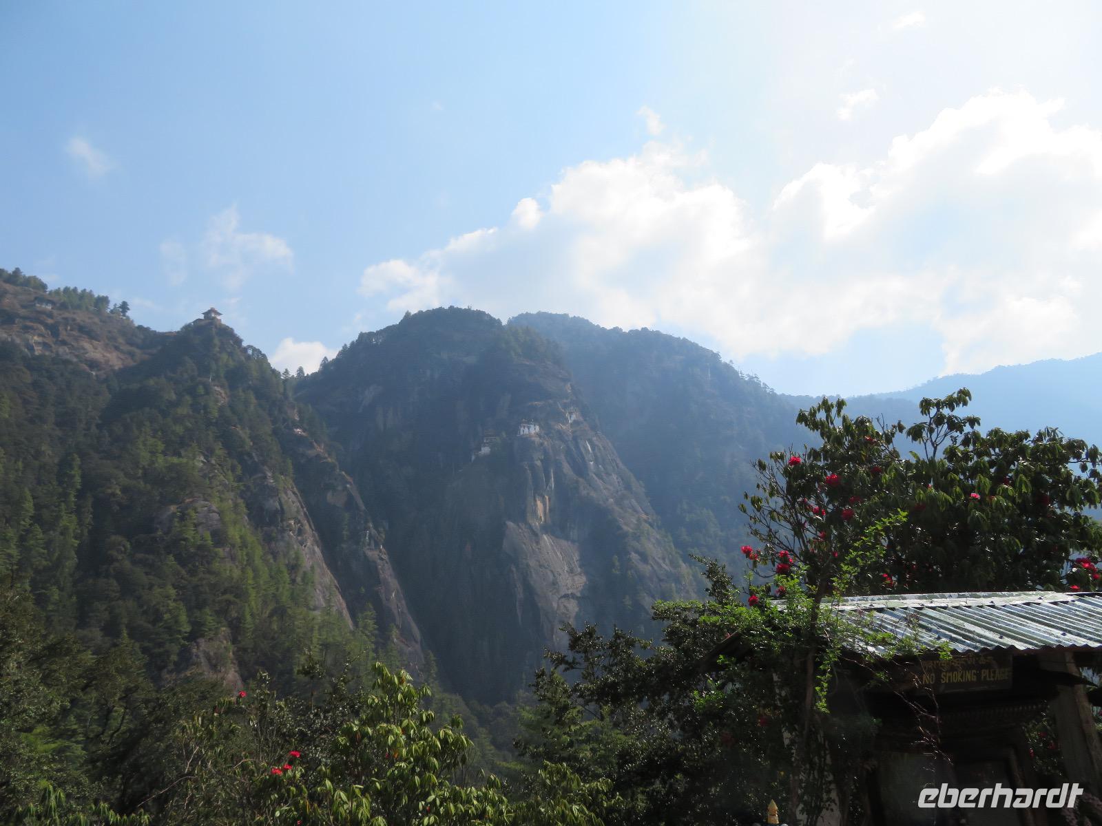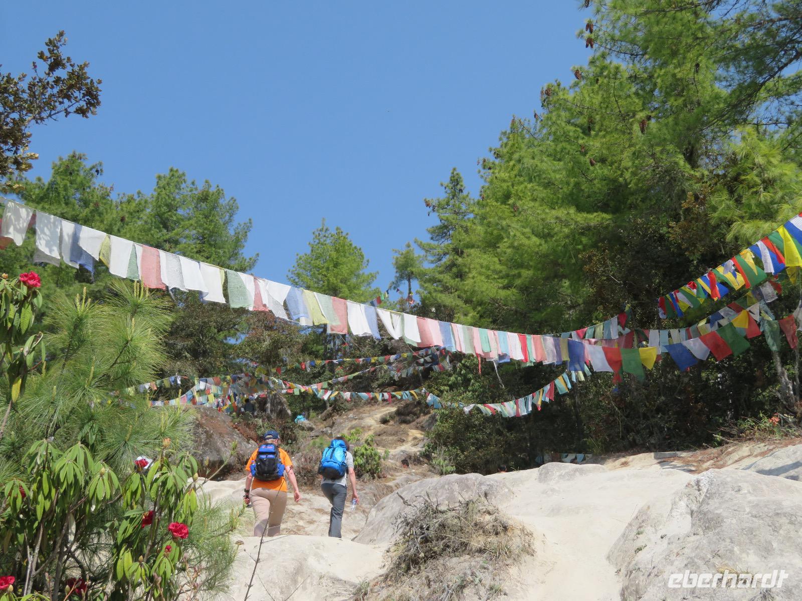 Ein besonderer Höhepunkt der Reise ist das unverwechselbare Kloster Taktsang auf dem Tigerfelsen. Gut die Hälfte der Reisegruppe erklärt sich bereit zur tapferen Wanderung mit einer Höhenüberwindung von ca. 800 Metern. Zeitig am Morgen steigen wir tapfer die erste Hälfte bis zur Cafeteria hinauf. Unterwegs lassen wir ein paar Mulis vorbei und blicken über das schöne Paro-Tal, welches heute deutlicher sichtbar ist. Nach einer Kaffeepause nehmen wir uns die zweite Etappe des Aufstieges vor. Vorbei am Geburtshaus eines ehemaligen buddhistischen Lehrmeisters und Gebetsmühlen erreichen wir den ersten Aussichtspunkt über das beeindruckende Tigernest. Wer mag, steigt 150 Stufen hinab zu einer mit Gebetsfahnen übersäten Brücke. Links von uns ergießt sich ein schöner Wasserfall. Wir halten Kurs auf das Tigernest und überwinden die letzten 100 Stufen hinauf. Aus Respekt und Sicherheit müssen wir die Schuhe ausziehen sowie uns von allen elektronischen Geräte entledigen. Der Blick auf und in die verschiedenen der acht Tempeln macht alle Anstrengungen des Aufstieges wieder gut. Hier in einer Höhle soll Buddhisathva drei Monate lang meditiert haben. Nach ihm haben es viele weitere Buddhistische Meister getan und im 12. Jahrhundert ließ ein Mönch dieses Kloster errichten. Es heißt, wer den Aufstieg auf das Tigernest geschafft hat, wird mit vielem guten Karma gesegnet. Mit gutem Karma und guter Laune begeben wir uns auf den Rückweg.