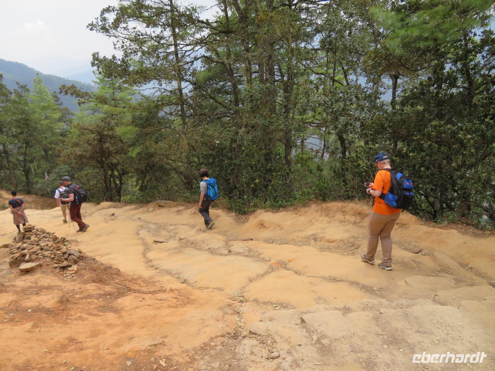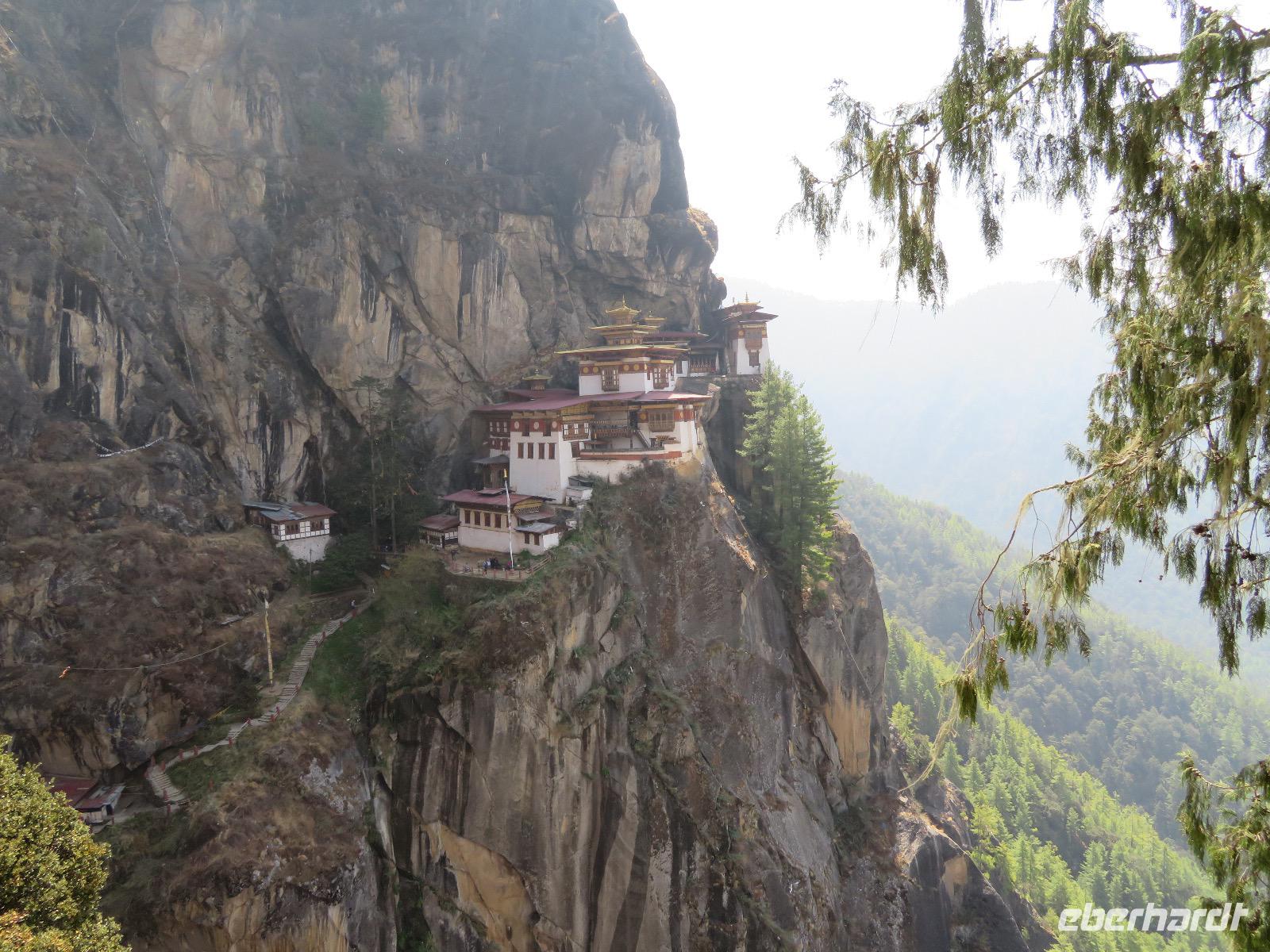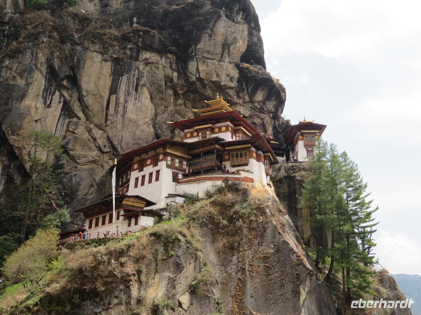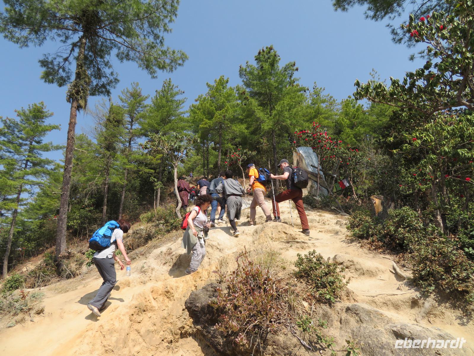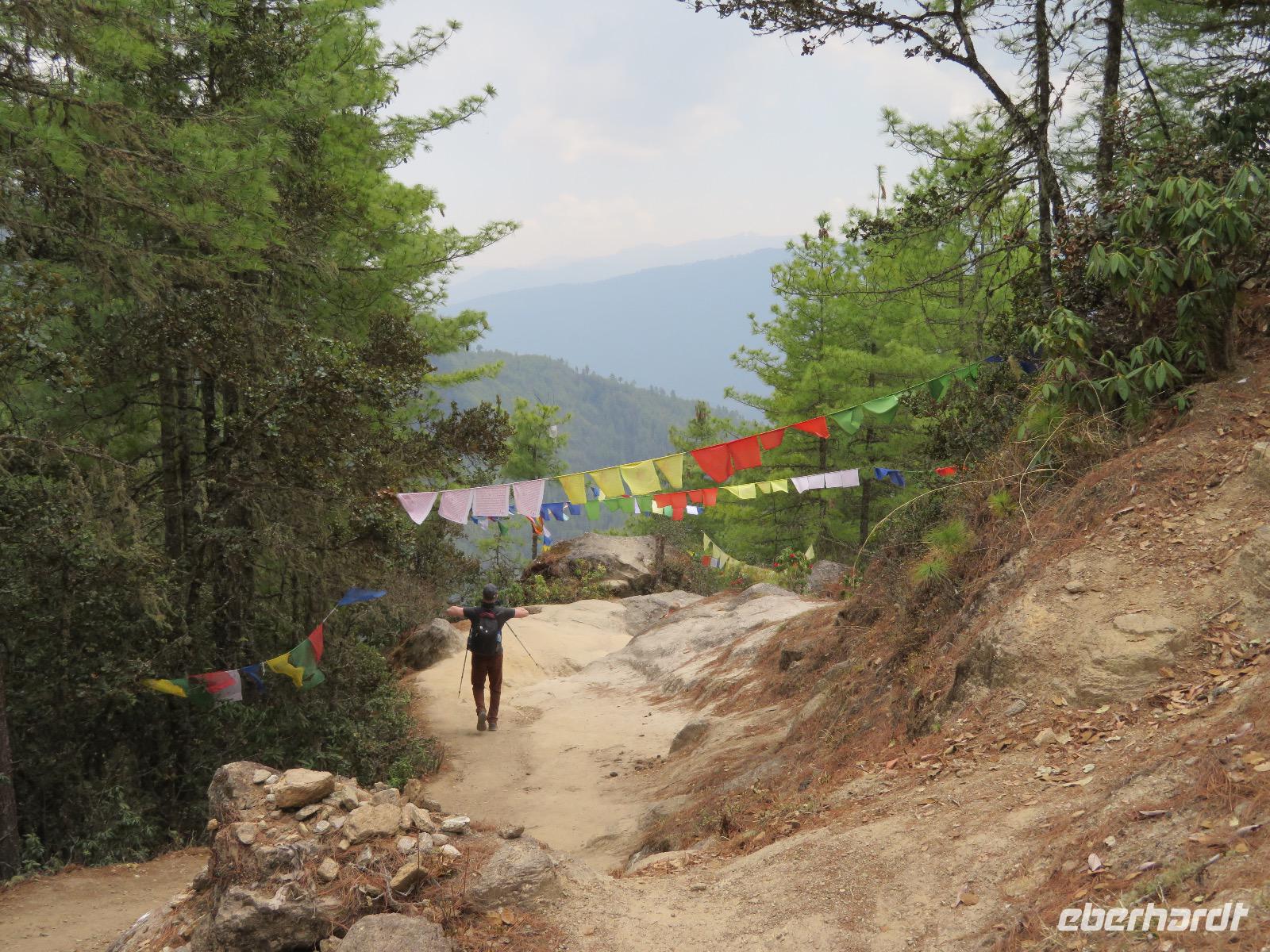 Ein besonderer Höhepunkt der Reise ist das unverwechselbare Kloster Taktsang auf dem Tigerfelsen. Gut die Hälfte der Reisegruppe erklärt sich bereit zur tapferen Wanderung mit einer Höhenüberwindung von ca. 800 Metern. Zeitig am Morgen steigen wir tapfer die erste Hälfte bis zur Cafeteria hinauf. Unterwegs lassen wir ein paar Mulis vorbei und blicken über das schöne Paro-Tal, welches heute deutlicher sichtbar ist. Nach einer Kaffeepause nehmen wir uns die zweite Etappe des Aufstieges vor. Vorbei am Geburtshaus eines ehemaligen buddhistischen Lehrmeisters und Gebetsmühlen erreichen wir den ersten Aussichtspunkt über das beeindruckende Tigernest. Wer mag, steigt 150 Stufen hinab zu einer mit Gebetsfahnen übersäten Brücke. Links von uns ergießt sich ein schöner Wasserfall. Wir halten Kurs auf das Tigernest und überwinden die letzten 100 Stufen hinauf. Aus Respekt und Sicherheit müssen wir die Schuhe ausziehen sowie uns von allen elektronischen Geräte entledigen. Der Blick auf und in die verschiedenen der acht Tempeln macht alle Anstrengungen des Aufstieges wieder gut. Hier in einer Höhle soll Buddhisathva drei Monate lang meditiert haben. Nach ihm haben es viele weitere Buddhistische Meister getan und im 12. Jahrhundert ließ ein Mönch dieses Kloster errichten. Es heißt, wer den Aufstieg auf das Tigernest geschafft hat, wird mit vielem guten Karma gesegnet. Mit gutem Karma und guter Laune begeben wir uns auf den Rückweg.