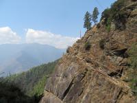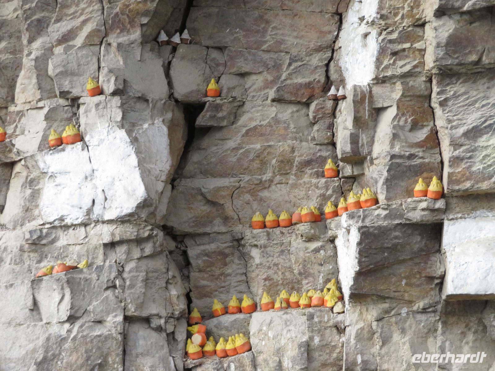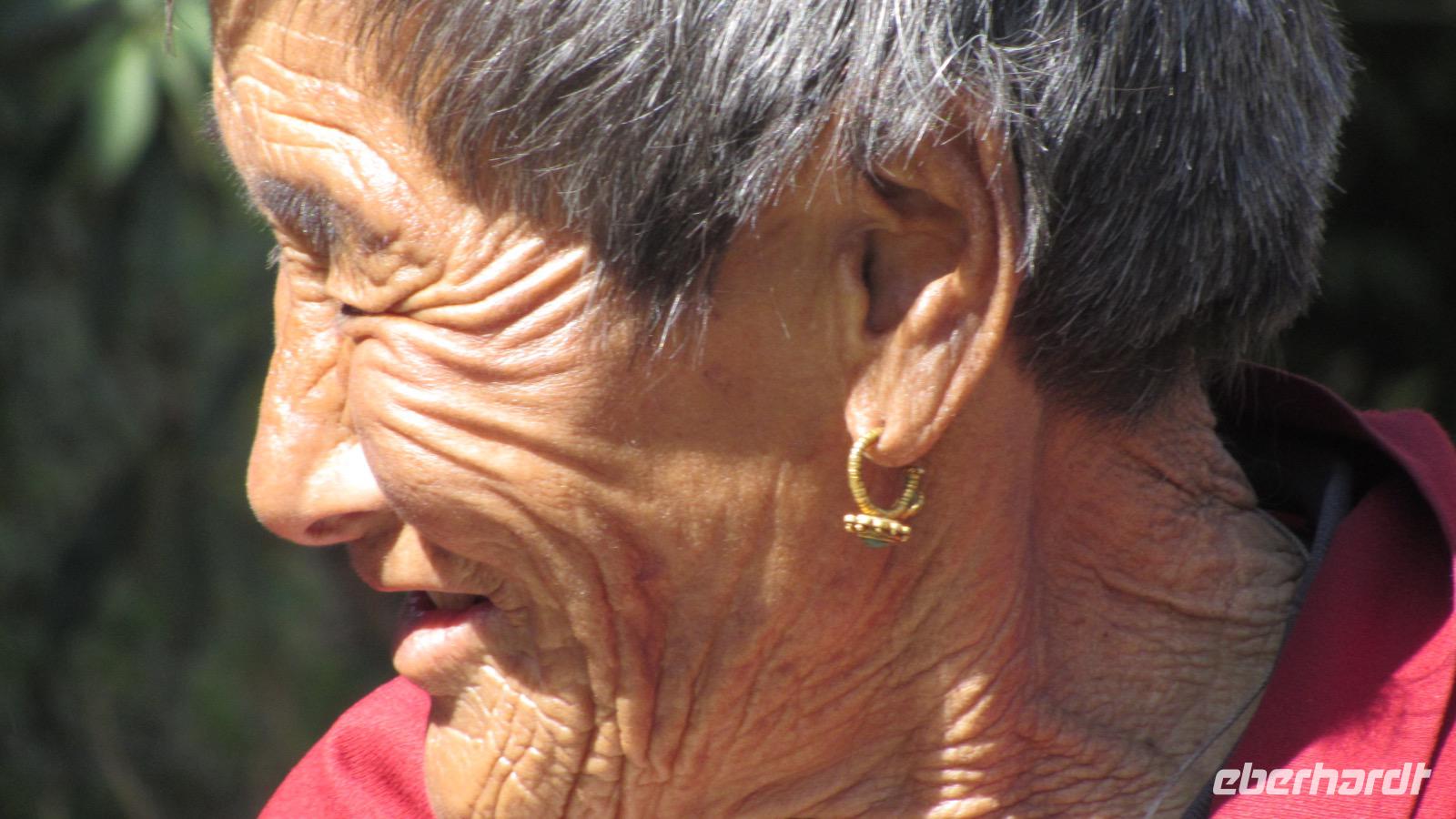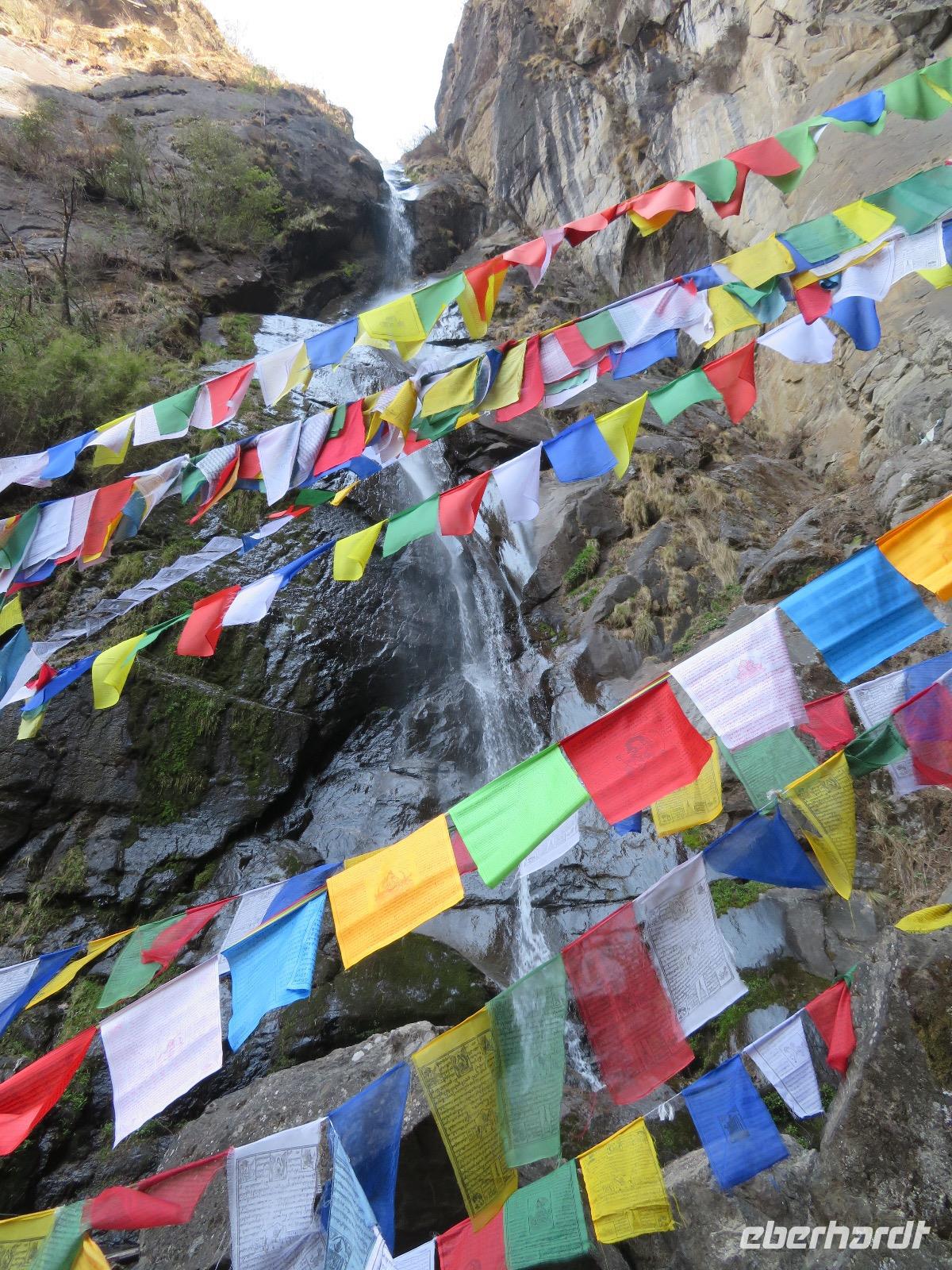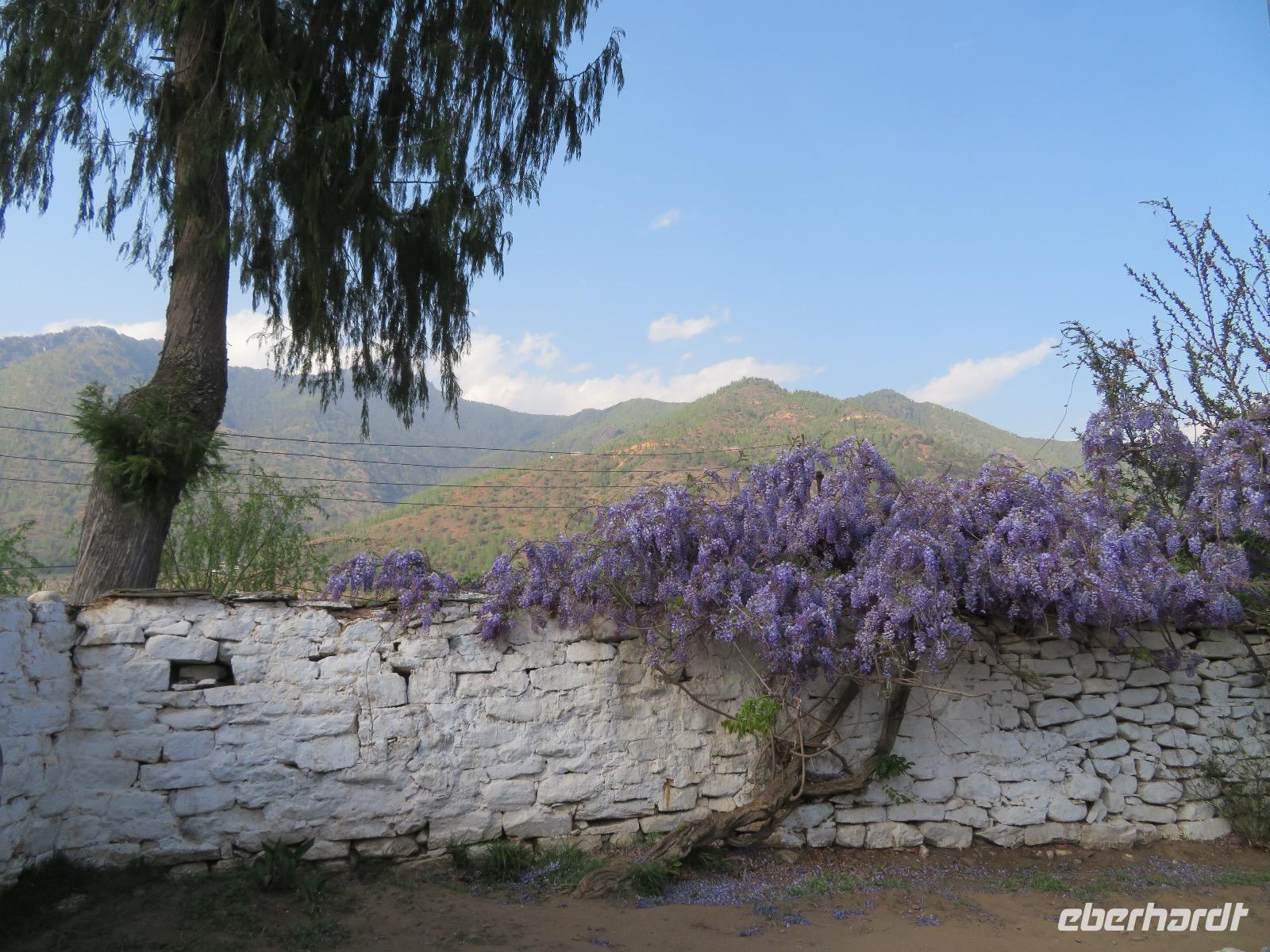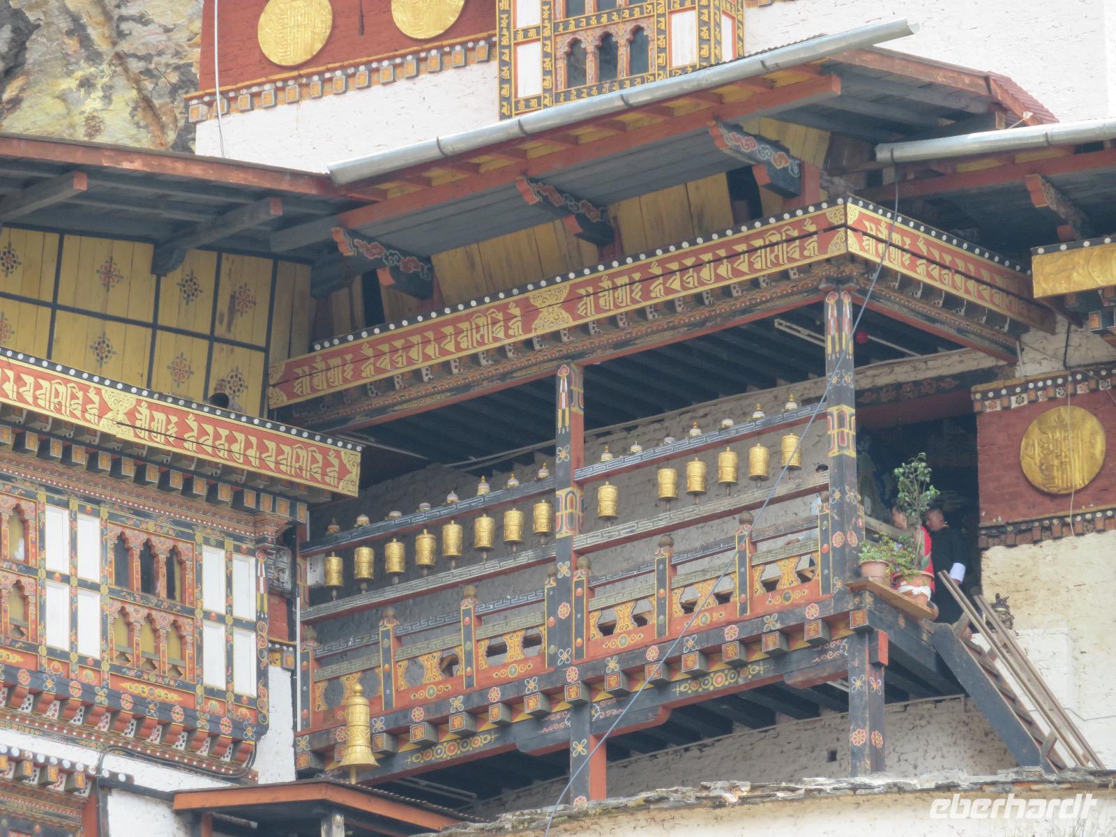 Ein besonderer Höhepunkt der Reise ist das unverwechselbare Kloster Taktsang auf dem Tigerfelsen. Gut die Hälfte der Reisegruppe erklärt sich bereit zur tapferen Wanderung mit einer Höhenüberwindung von ca. 800 Metern. Zeitig am Morgen steigen wir tapfer die erste Hälfte bis zur Cafeteria hinauf. Unterwegs lassen wir ein paar Mulis vorbei und blicken über das schöne Paro-Tal, welches heute deutlicher sichtbar ist. Nach einer Kaffeepause nehmen wir uns die zweite Etappe des Aufstieges vor. Vorbei am Geburtshaus eines ehemaligen buddhistischen Lehrmeisters und Gebetsmühlen erreichen wir den ersten Aussichtspunkt über das beeindruckende Tigernest. Wer mag, steigt 150 Stufen hinab zu einer mit Gebetsfahnen übersäten Brücke. Links von uns ergießt sich ein schöner Wasserfall. Wir halten Kurs auf das Tigernest und überwinden die letzten 100 Stufen hinauf. Aus Respekt und Sicherheit müssen wir die Schuhe ausziehen sowie uns von allen elektronischen Geräte entledigen. Der Blick auf und in die verschiedenen der acht Tempeln macht alle Anstrengungen des Aufstieges wieder gut. Hier in einer Höhle soll Buddhisathva drei Monate lang meditiert haben. Nach ihm haben es viele weitere Buddhistische Meister getan und im 12. Jahrhundert ließ ein Mönch dieses Kloster errichten. Es heißt, wer den Aufstieg auf das Tigernest geschafft hat, wird mit vielem guten Karma gesegnet. Mit gutem Karma und guter Laune begeben wir uns auf den Rückweg.