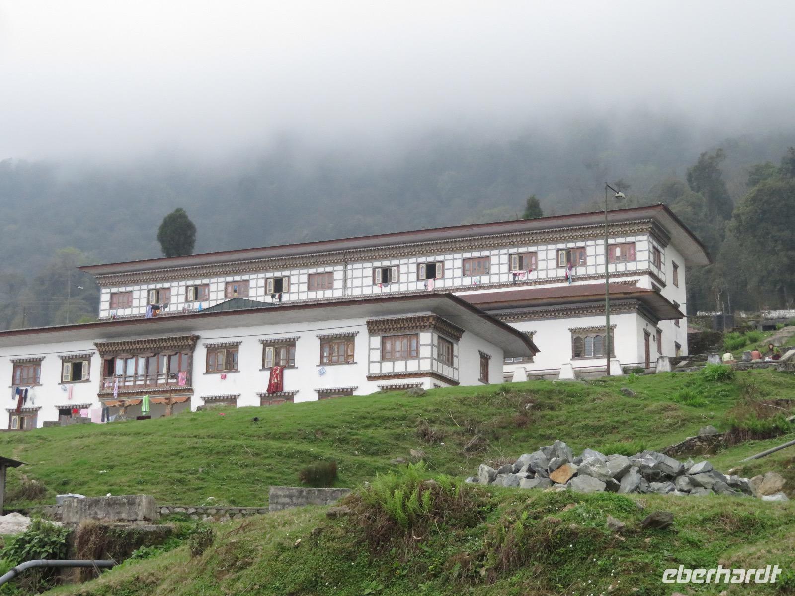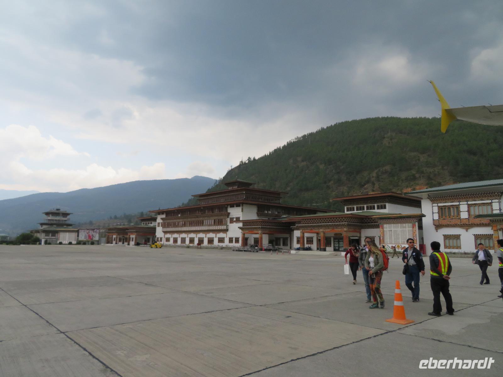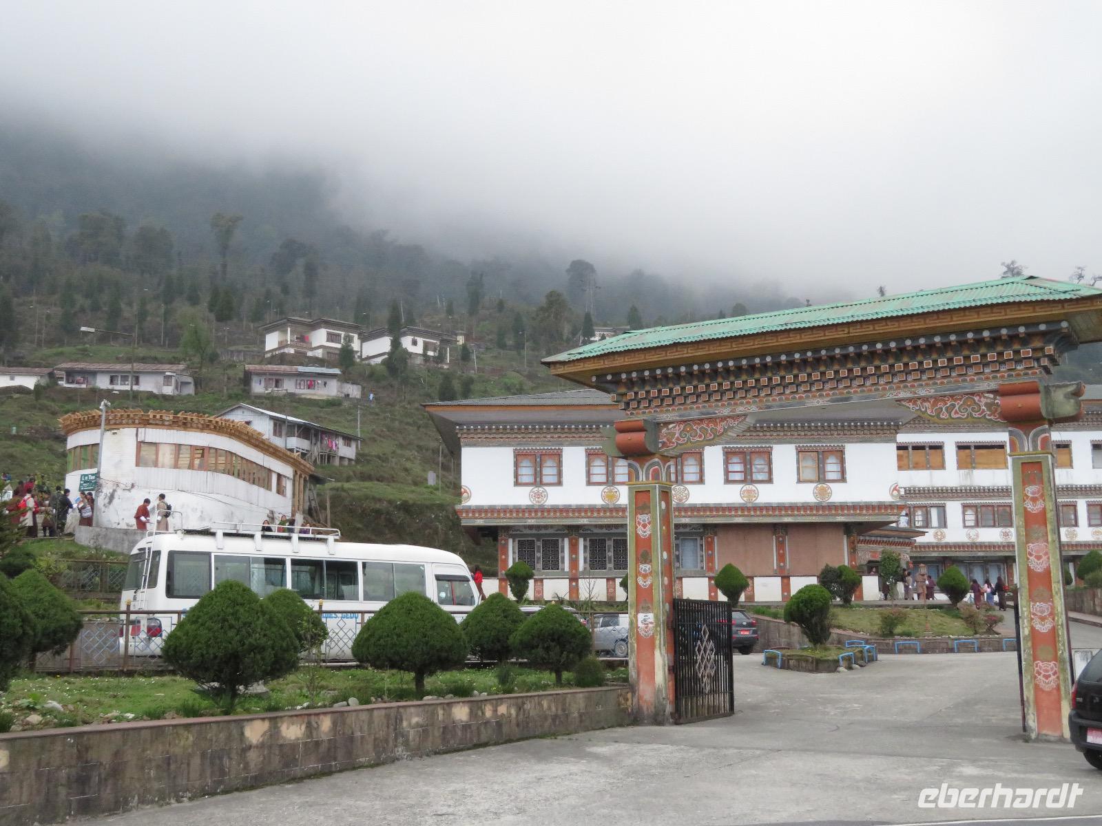 Eine Tagesfahrt über das "Himmelsreich" von Sikkim bis ins "Reich des Donnerdrachens" Bhutan steht auf unserem Programm. In Bhutan leben etwa 700.000 Einwohner. Bis 2008 war es noch eine Monarchie mit einem König in der vierten Generation. Danach hat der Königssohn den Thron bestiegen (offiziell schon 2006, doch gehandelt hat er erst 2008 als König) die Demokratie ausgerufen. Das heißt, in unseren Geschichtsbüchern würde im Gegensatz zu den bhutanesischen wohl konstitutionelle Monarchie stehen, aber für die Bhutanesen war es ein großer, wichtiger Schritt, die ersten freien Wahlen einzuführen.An der einscheinbaren Grenze lassen wir uns zuerst die Ausreisestempel aus Indien geben, bevor wir in Bhutan einreisen. Eberhardt hat bereits elektronische Visa für uns beantragt. Darum dürfen wir zunächst im Hotel in Phuentsholing einchecken, einen Willkommenstee genießen und unsere Zimmer beziehen. Erst danach spazieren wir zur Grenzbehörde nebenan, um offiziell die Einreise zu vollziehen. Ein kurzer netter Plausch mit den Grenzbeamten und zack haben wir die Stempel für das Königreich Bhutan. „Kuzu Zangpo La", grüßt uns herzlich Sangay, unser bhutanesischer Reiseleiter für die kommende Woche. Er spaziert mit uns zum Tempel Zangtho Perli Lhakhang, um uns die ersten Eindrücke vom Reich des Donnerdrachens zu geben.