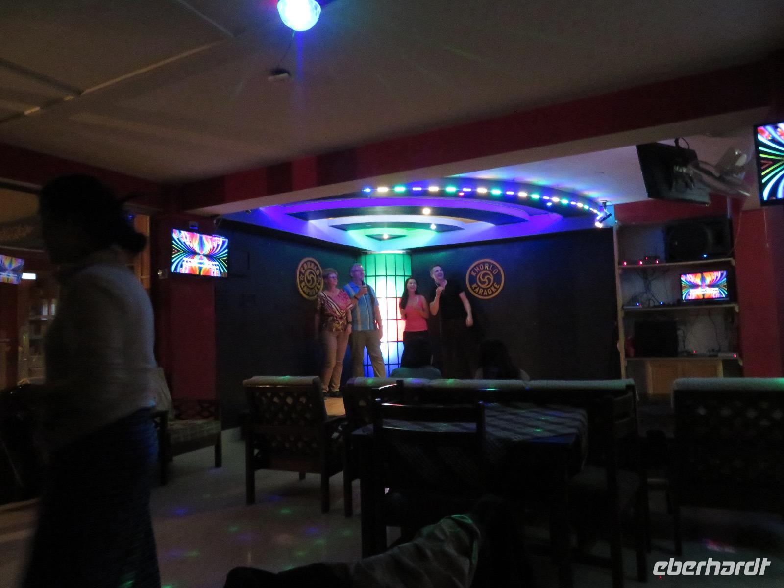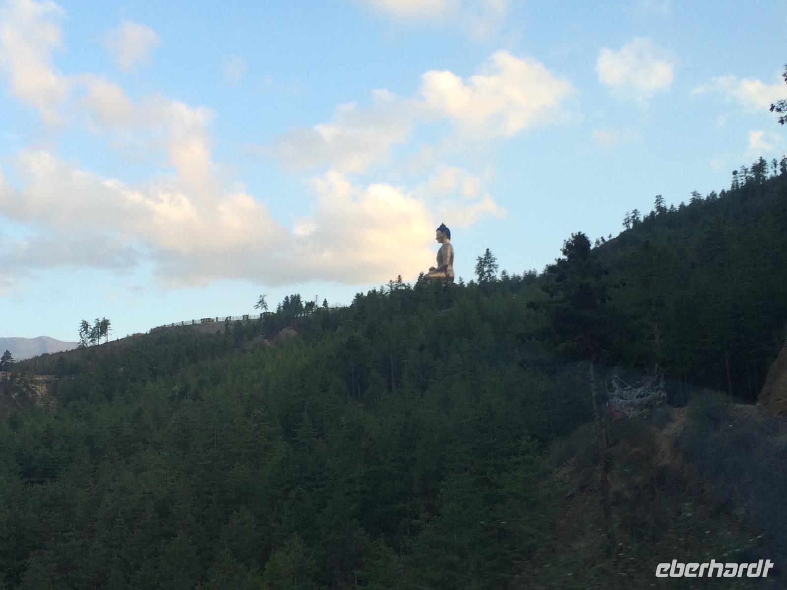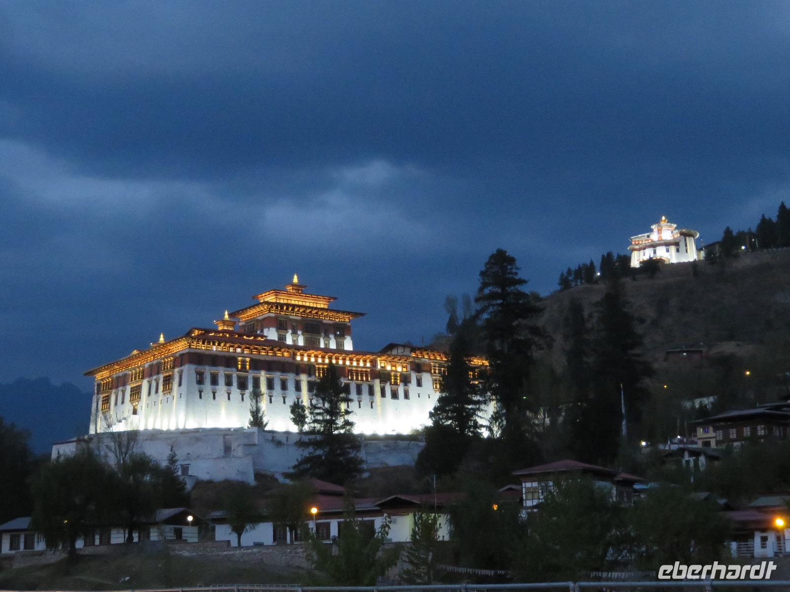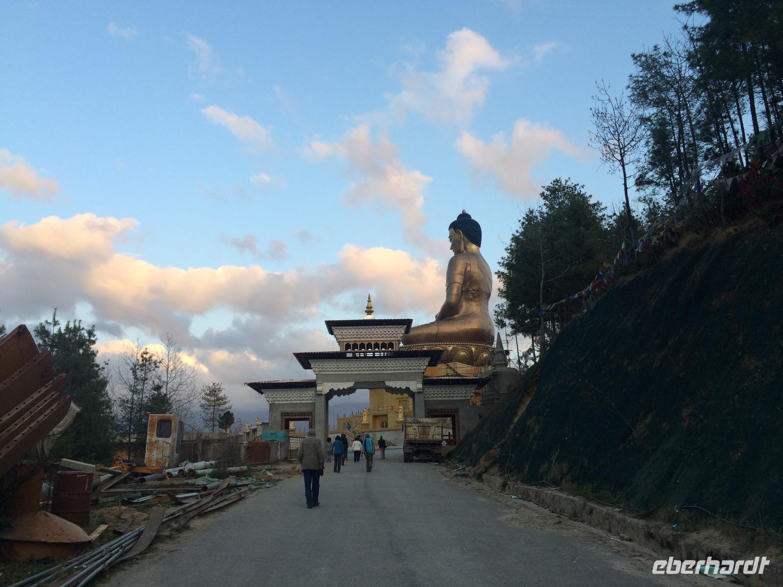Erst in den 60er Jahren wurden richtige Straßen im Land gebaut, und die Städte besser miteinander zu verbinden. 1941 wurde der erste Computer eingeführt, 1999 das erste Fernsehen und 1974 durften die ersten Touristen in das Land einreisen. Wir sind gespannt, was Bhutan die nächsten Tage zu bieten hat. Kurz nach dem Verlassen der Stadt Phuentsholing besuchen wir das Kloster Kharbandi Gompa. Kurz vor Thimphu halten wir an einer Universität für Wirtschaft, in der 600 Studenten drei Jahre lang zu ihrem Abschluss hinarbeiten. Schulen, staatliche Krankenhäuser und Universitäten sind in der Sozialabsicherung der Bevölkerung integriert und können von ihr kostenfrei genutzt werden. Bei Bauernhäusern legen wir einen Halt für einen kurzen Spaziergang. Reiseleiter Sangay sagt, wenn wir die frische Bergluft hier einatmen, werden wir uns um 10 Jahre jünger fühlen... wir werden sehen bzw. spüren...Genau zum Sonnenuntergang erreichen wir die Hauptstadt Thimphu. In ihr leben ca. 180.000 Einwohner. Seit 1950 ist sie zur Landeshauptstadt ernannt worden, vorher waren es Punakha und Paro. Bevor Thimphu Hauptstadt wurde, lebten nur Bauernfamilien hier um den roten Reis anzubauen. Heutzutage haben die Dörfer mit Landflucht zu kämpfen. Am Buddhapunkt bewundern wir nicht nur die mächtige Buddhastatue aus Bronze, sondern auch die romantischen Farben des umliegenden Thimphu-Tals.Wer noch nicht müde ist, spaziert mit Anh eine Runde durch die kleine Hauptstadt. Kurz vor um neuen werden schon die Ladenrollows heruntergeklappt und die Bordsteine hochgeklappt. Nicht aber in den Bars. So kehren wir in eine Karaokebar ein, um die Bhutanis näher kennenzulernen. Beeindruckt von ihren Singtalenten fassen wir auch unseren Mut und performen gemeinsam als Trio und Quartette Gröl- ähm, ich meine Gesangsacts. Egal ob wir grölen oder singen, es macht auf jeden Fall Spaß und die Bhutanesen sind so tolerant, dass sie auch uns einen großen Beifall geben.
