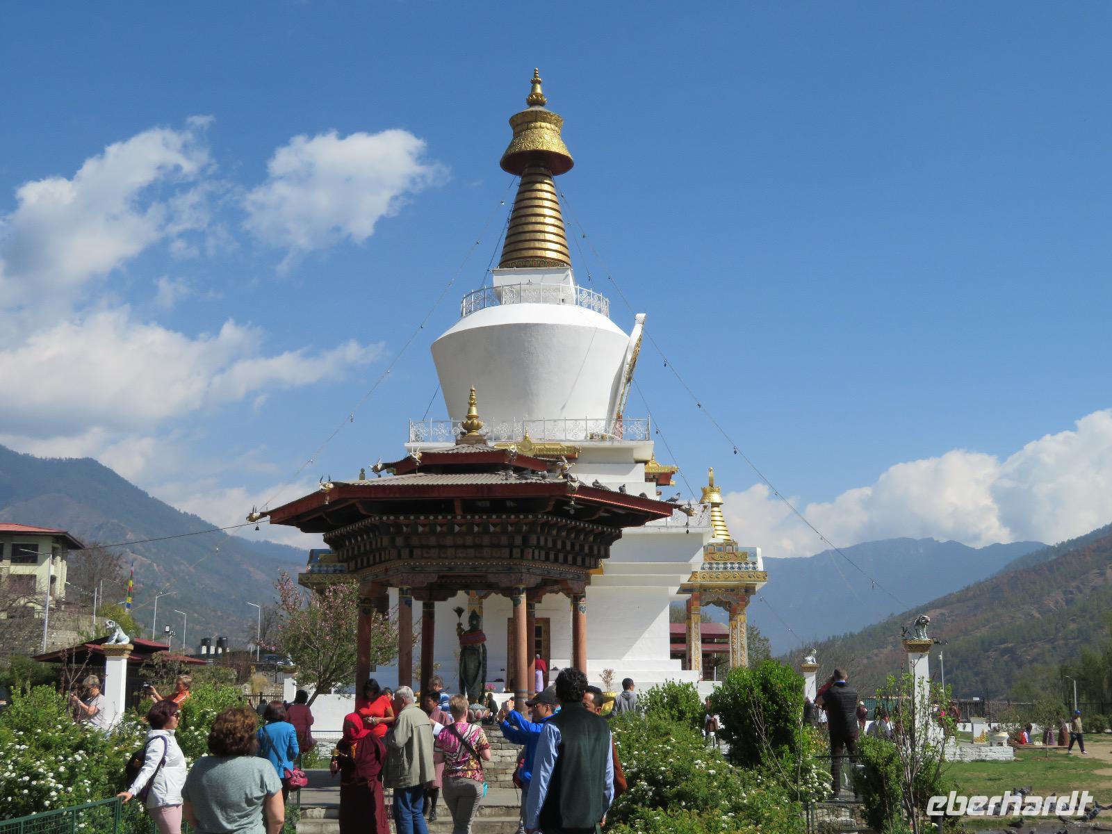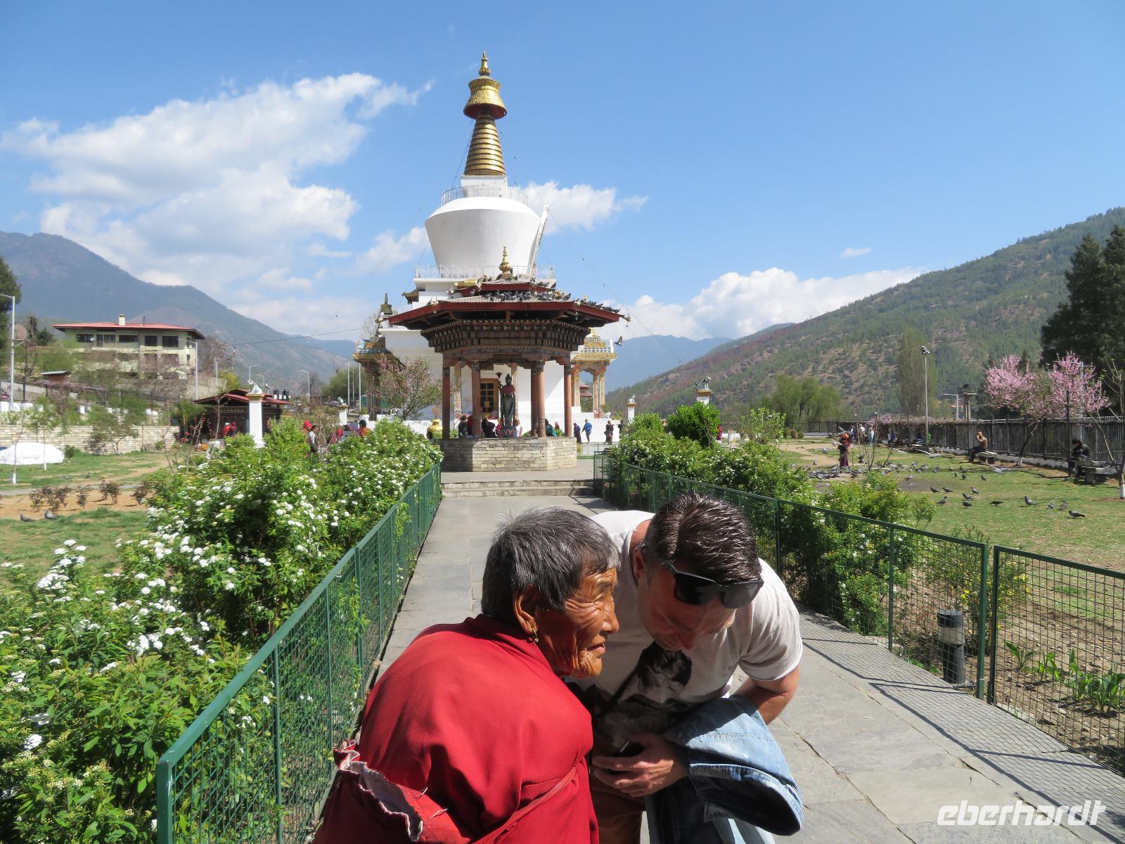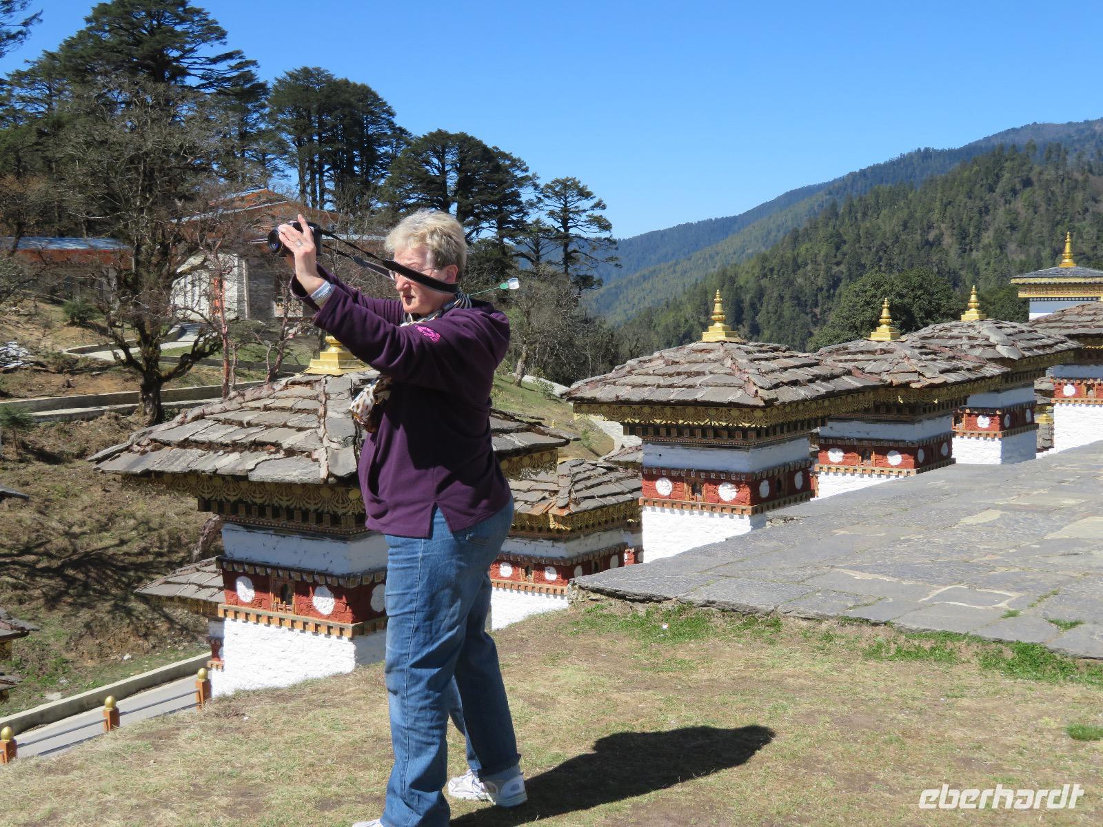 Eine Hauptstadt der besonderen Art. Thimphu ist die einzige Hauptstadt ohne Verkehrsampeln, weil die Einheimischen diese zu unpersönlich finden, dafür sorgen Polizisten mit weißen Handschuhen in kleinen Rondellen am Kreisverkehr für Ordnung und die einzige Tankstelle erinnert eher an einen Tempel. Im ganzen Land ist es auch verboten zu Rauchen, seltsamerweise begegnet man viele Raucher in der Stadt. Betelnussessen gehört zum Nationalsymbol genauso wie das Bruttoglücksprodukt.Wir holen den Besuch des Simtokha-Dzongs nach, der für den gestrigen Tag vorgesehen war. DAs älteste Kloster im Land ist gleichzeitig eine buddhistische Schule und Erinnerungschörte (Stupa) für den dritten König. In ihrem Tiefen Glauben wachen die Bhutanis jeden Morgen auf. So besuchen von jung bis alt alle regelmäßig die Tempel. Viele ältere Menschen werden von ihren Kindern morgens in die Tempel gebracht, sie treffen hier auf Freunde und werden nach Feierabend wieder von ihren Kindern abgeholt. Spannenderweise treffen wir im Tempel auf die Vizepräsidentin des Deutschen Bundestages Claudia Roth, die gerade in Bhutan auf Staatsbesuch ist. Sehr freundlich begegnet sie uns und ist sogar bereit für ein kleines Gruppenfoto. Gut, dass wir den Besuch doch auf heute Morgen verlegt haben.