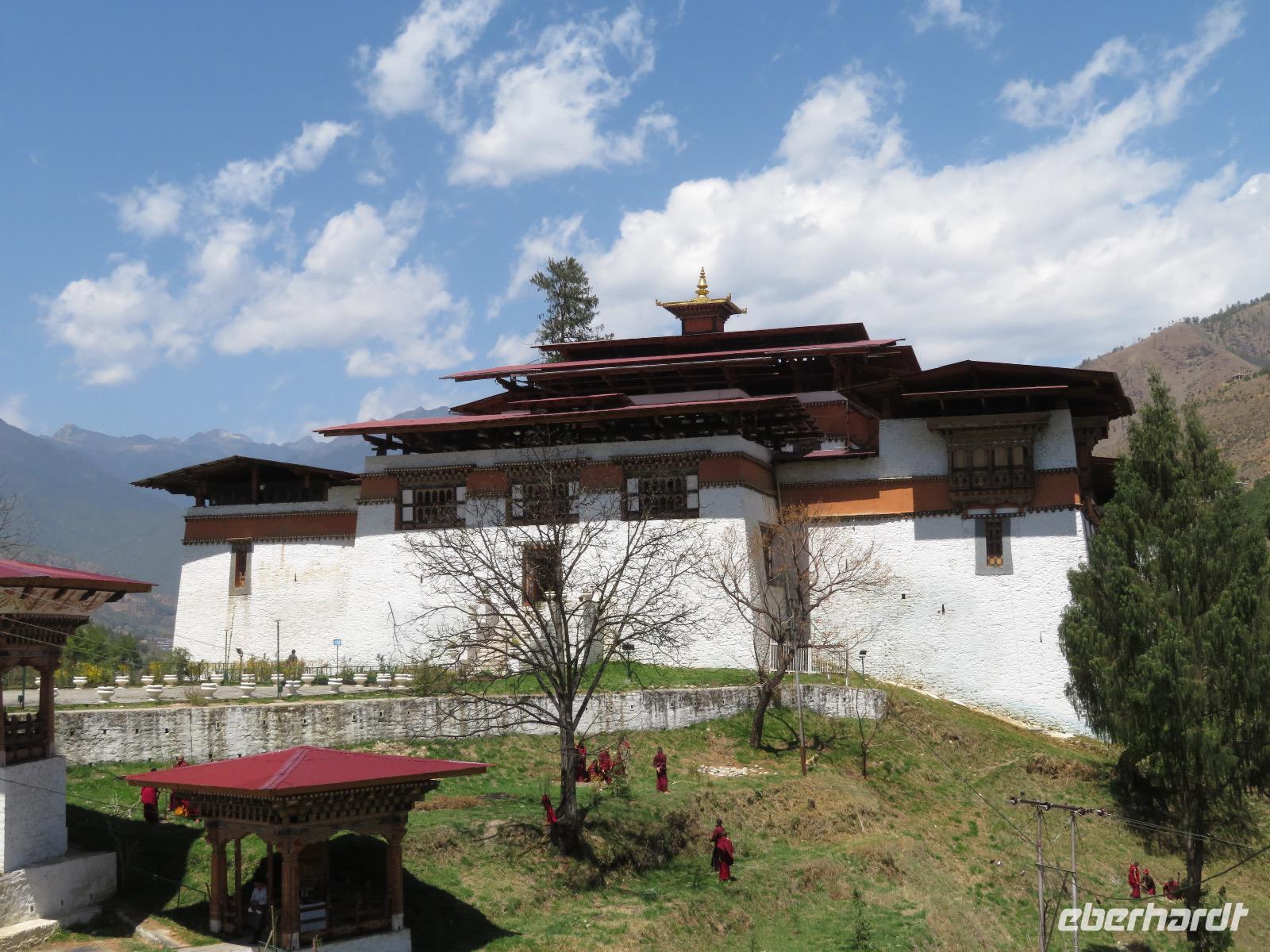 Der Besuch des Punakha Dzongs ist ein Muß - neben dem Regierungspalast gilt er als schönstes Burg- und Klosterbauwerk in Bhutan. Diese vielleicht schönst Burg Bhutans wurde am Zusammenfluß zweier Gletschergewässer errichtet und stellte im 17. Jh. die Sperre für immer wieder anrückende tibetische Armeen in einem jahrhundertealten Religionsstreit dar. Nach ausgiebiger Besichtigung kehren wir in unsere schöne Hotelanlage am Fluss zurück. Sammler unter uns gehen auf Steinsuche, die anderen entspannen im Hotelgarten.