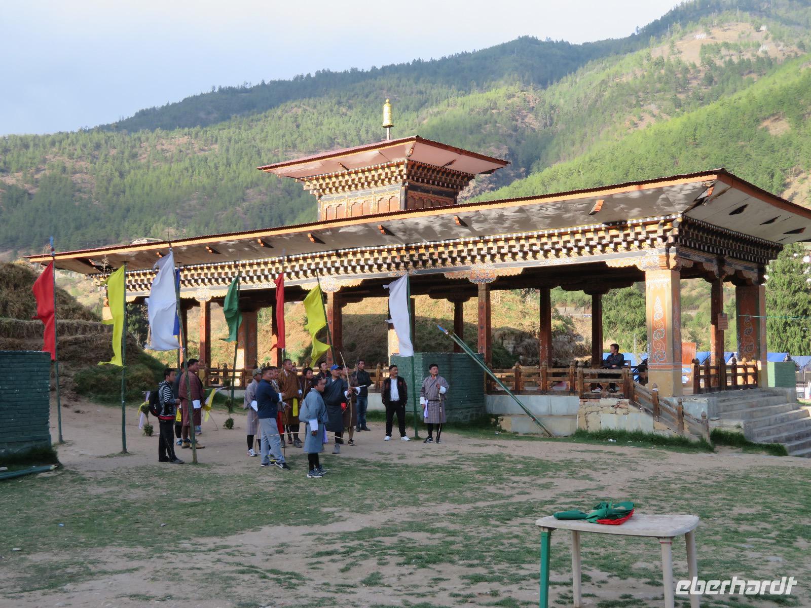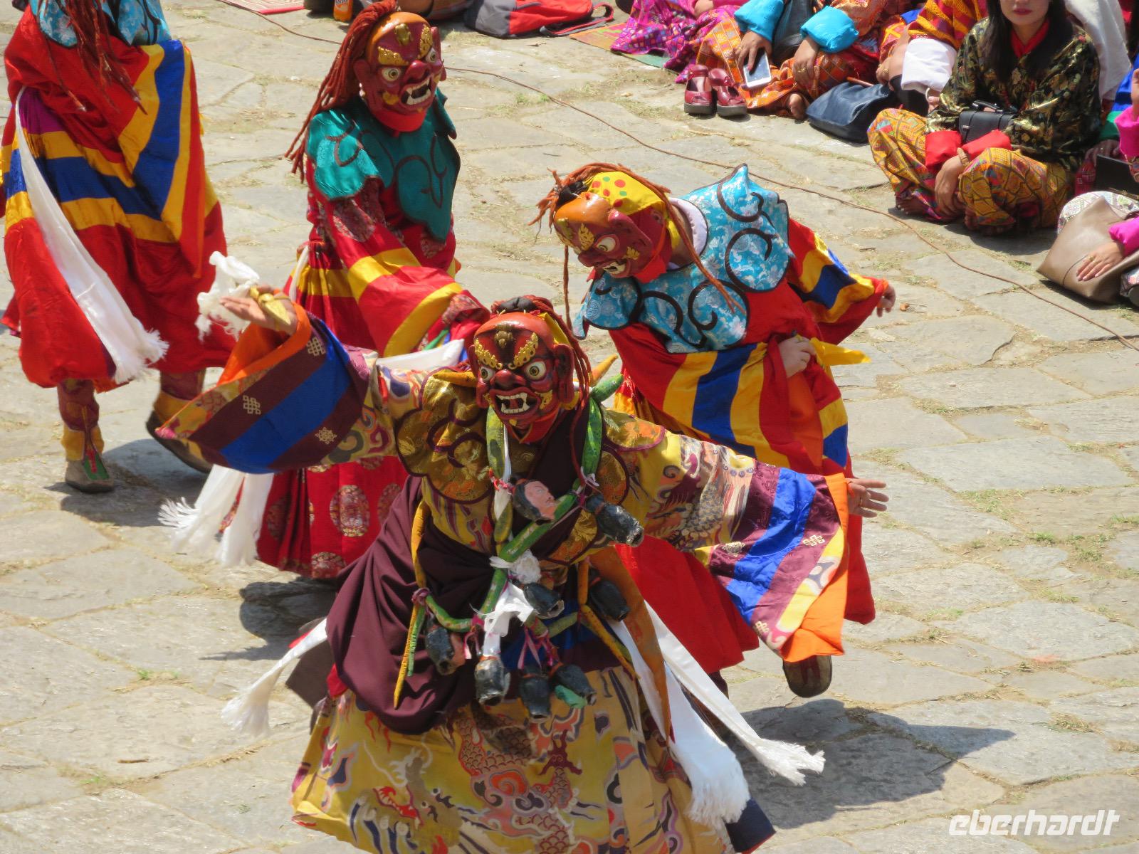 Schon einige Tage zuvor machten sich Pilger auf dem Weg nach Paro zum Tempelfest. Viele wollen ein Mal in ihrem Leben das große Tangkha-Bild sehen, den König live erleben und die Segnung von den Paropriestern einholen. Am letzten Tag der Festwoche finden vormittags die wichtigsten Rituale statt. All diese tollen Erfahrungen dürfen wir auf dieser Reise mitnehmen. Gemeinsam mit tausenden von Einheimischen in ihren schönsten, bunten Trachten Kho aus Seide begeben wir uns zum Paro-Dzong. Als der König angekündigt wird, sind alle gespannt und zeigen Respekt und Sympathie für ihren Herrscher. Wir sehen den König direkt an uns vorbei laufen. Als ein kleiner Junge hingefallen ist vor Aufregung, tröstet ihn sogar der König persönlich. Nun verstehen wir die Liebe des Volkes zum König und umgekehrt. Anschließend bewegen sich alle auf das große Tangkha-Bild zu. Sie lassen sich segnen und von ihren Sünden befreien, in dem sie das Bild am Kopf berühren und mit Aufrichtigkeit um Segnung bitten. Parallel finden diverse Tanzvorführungen statt. Feierlich wird das Tangkha-Bild schließlich herabgelassen, vorsichtige zusammengelegt und mit einer Parade hinausgeführt. Wir beobachten, dass die Einheimischen Familien von zu Hause ein Picknick mitbringen und dieses genüsslich auf der Wiese bei regem Austausch, Lachen und Scherzen verspeisen. Himmelstrommler gehen durch die Menge und berührteren mit ihrem Trommelstab die Köpfe der Zuschauer, um sie zu segnen. Zum krönenden Abschluss findet der legendäre Maskentanz statt, auf das alle gespannt gewartet haben. Wir schätzen uns sehr glücklich, dieses einmalige Erlebnis genießen zu dürfen, obwohl zahlreiche Bhutanis ihr ganzes Leben nur davon träumen können.