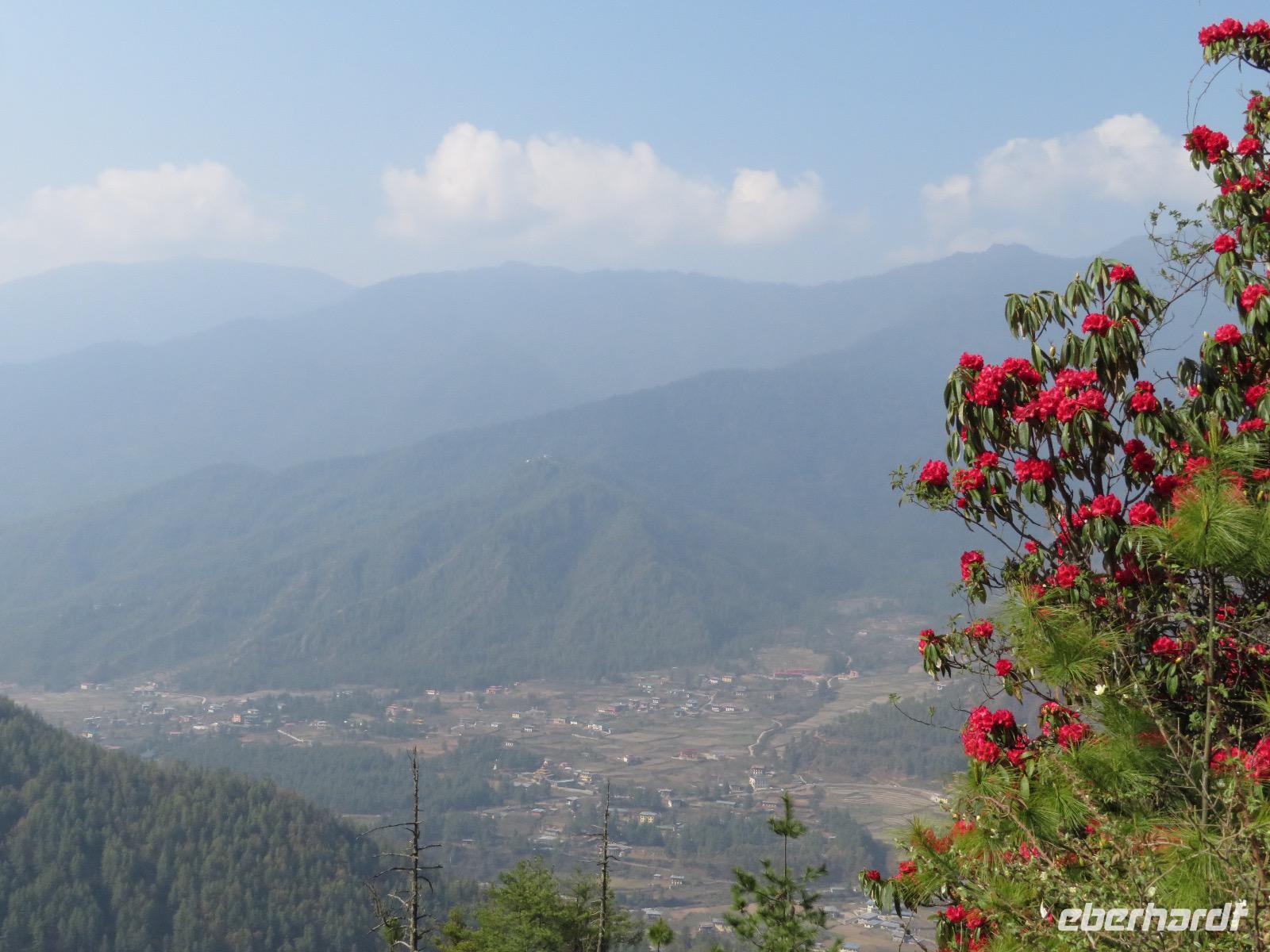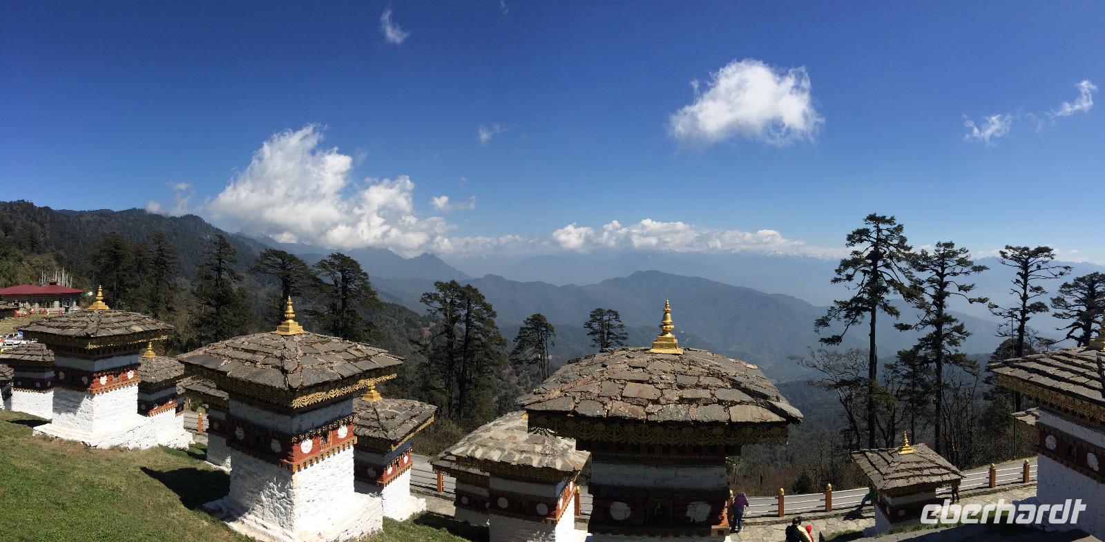 Die Sonne lacht, ein perfekter Tag für neue Entdeckungen. Wir brechen heute auf ins Landesinnere. Nach etwa einer guten Stunde halten wir am 3.088 hohen Dochula Pass. 108 Chorten und zahllose Gebetsfahnen stehen hier. Die Spitze hier oben eröffnet uns einen klaren, fantastischen Blick auf das Himalaya-Gebirge. Ein halbes Dutzend Siebentausender wie der Jejegangphugang mit 7.158 Metern wie auch der höchste Bhutans Gangkar Punsum mit 7.564 Metern halten wir mit unseren Kameras fest. Mit weiteren Fotostopps an kleinen Dörfern und Reiseterrassen und Bhawanis Erzählungen zu hiesigen Hochzeitstraditionen sowie „Night Hunting" erreichen wir Punakha. Diese Gegend gilt als das fruchtbarste Gebiet des Landes, in dem zwei Mal pro Jahr Roter Reis geerntet werden kann.