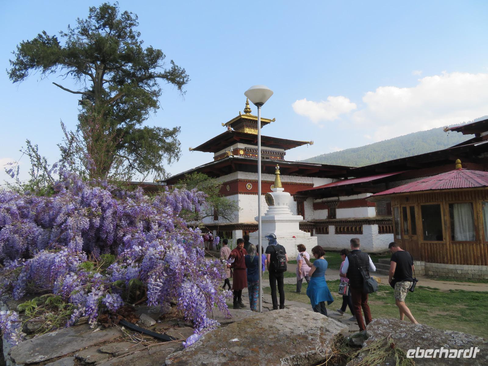 Danach besuchen wir die Anlage des Kyichu Lhakhang. Es ist ein buddhistischer Tempel in Pagodenbauweise im westlichen Teil des Königreichs Bhutan. Die vermutlich im siebenten Jahrhundert von Songtsen Gampo gegründete Anlage ist eines der ältesten buddhistischen Klöster in Bhutan, das dafür bestimmt war die "Risiege Dämonin" zu zähmen. So zählt es zu den berühmten 108-Dämonen-Klöstern, die der Überlieferung nach auf verschiedenen Körperteilen der im Himalaya schlafenden Dämonin errichtet wurden, damit sie nicht wieder aufstehen kann. Kyichu Lhakhang ist u.a. bekannt für seine alten Boddhisatva-Statuen im Altarraum sowie die überwältigende Wandmalerei aus dem siebenten Jahrhundert.