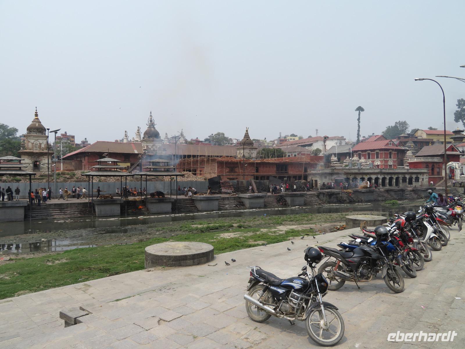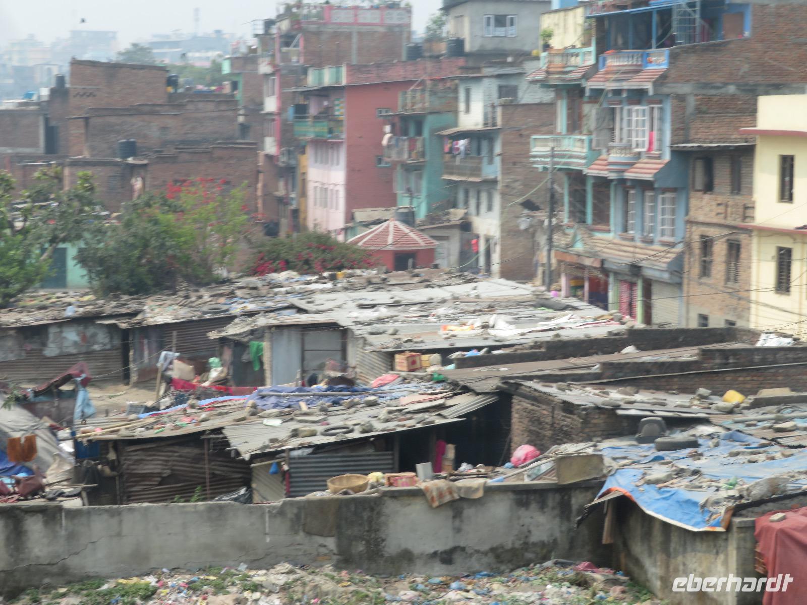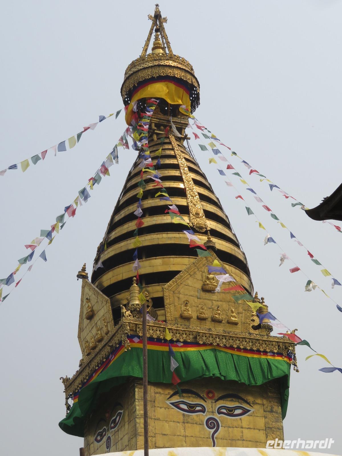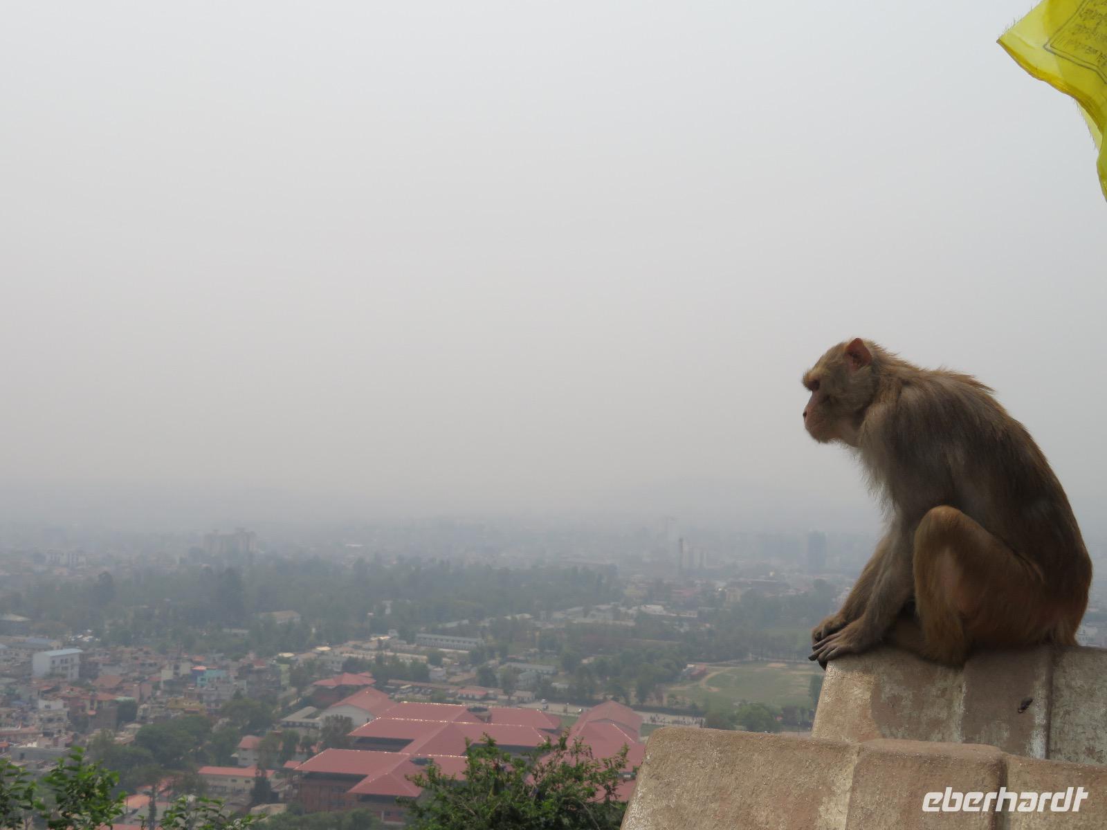 Nun packen wir unsere sieben Sachen und begeben uns auf Erkundungstour. Reiseleiter Abhi bringt uns auf eine Stadtrundfahrt zu den schönsten Orten seiner Heimat.Erster Stopp erfolgt am den Swayambhunath-Tempel (Affen-Tempel), an dem heute zum buddhistischen Neujahr besonders viel los ist. Bis zur Spitze des Tempelkomplexes mit dem Stupa sind es 365 Stufen. Überall lugen Affen hervor. Die kleinen Kerle sind sehr flink und können sogar aggressiv werden, wenn sie nicht das bekommen, was sie (fressen) wollen. Wir setzen unsere Tour in Richtung Bhaktapur fort. Die Straßen sind voll mit Menschen, in den Bussen und LKWs sitzen sie wie Sardinen in der Dose, denn es ist nun einmal Feiertag. Tapfer schlagen wir uns durch den Wahnsinns Verkehr durch, was für die Nepalis der eher ganz normale Wahnsinn scheint. Unser Busfahrer ist nur zu bewundern. Wir fahren durch den Ort Banepa, aus dem Tenzing Norgay stammt. Von hier sind es etwa zwei Wochen zu Fuß zum Everest-Basislager. Der Highway, auf dem wir fahren wurde von China gebaut. Von hier sind es 130 km zur Grenze nach Tibet. Später sehen wir eine Fabrik mit Feldern und Gewächshäusern in der Ayurvedische Medizin hergestellt wird. Es gibt einige Ziegeleien, weil der Boden dafür geeignet ist.