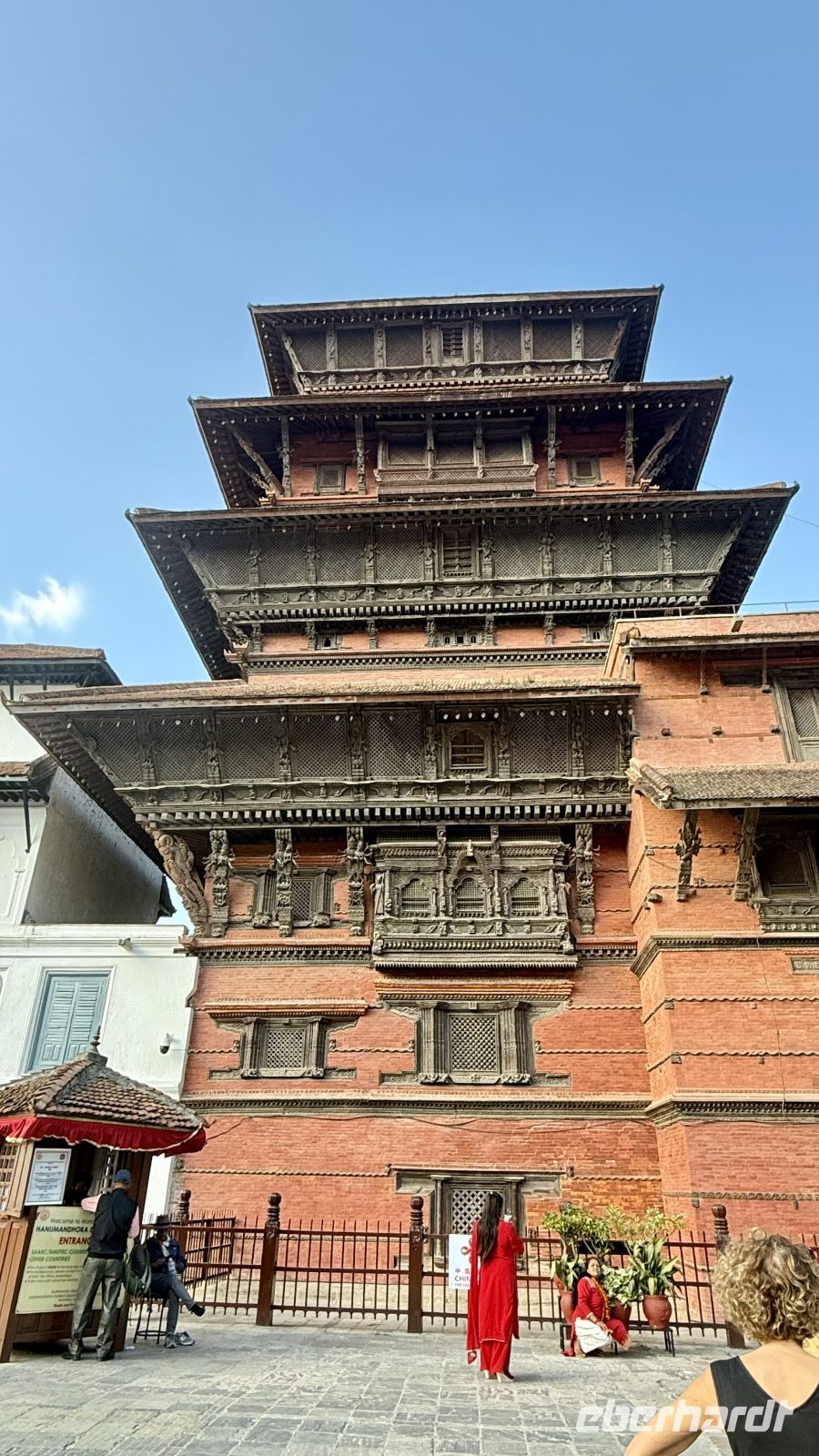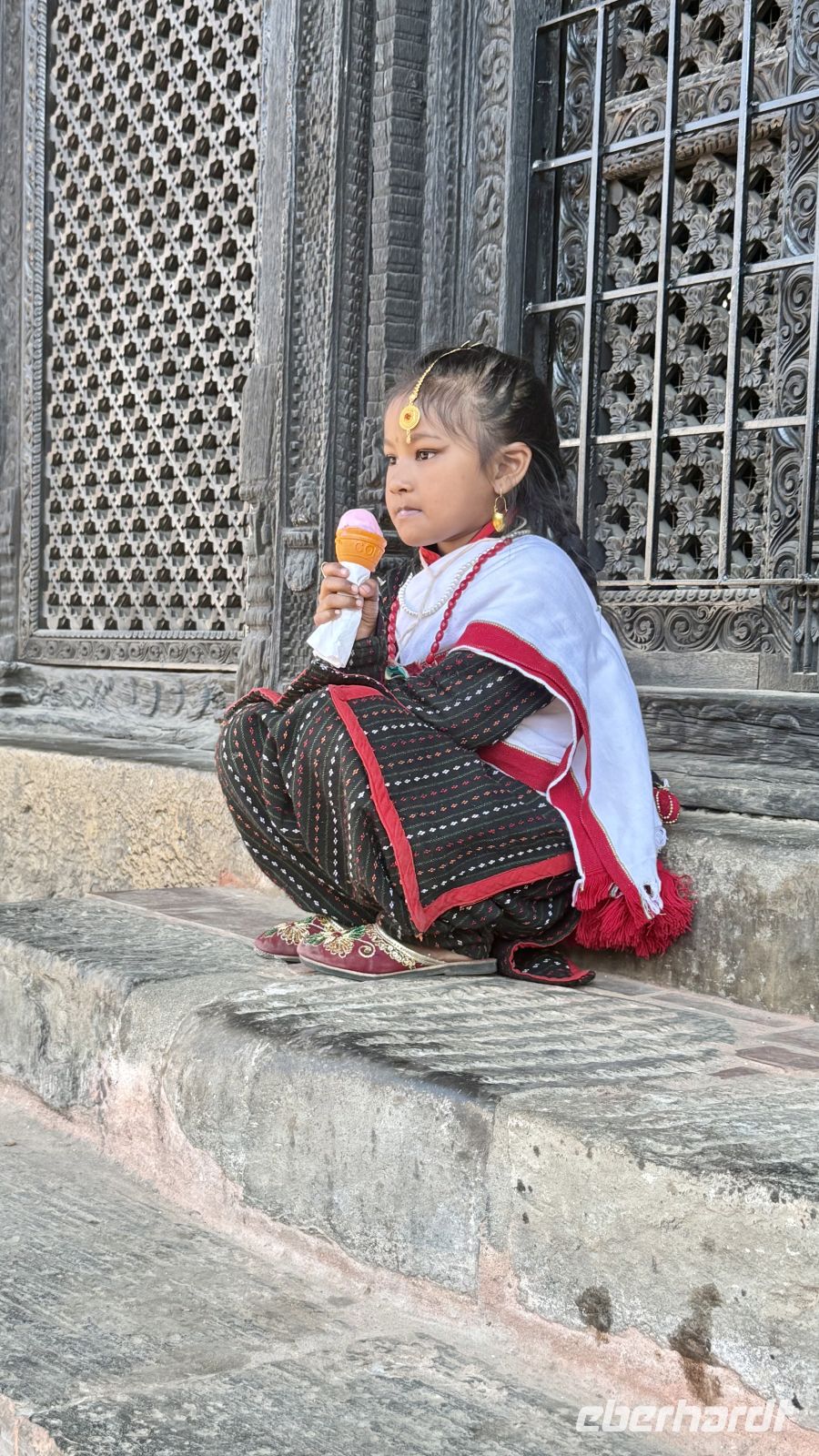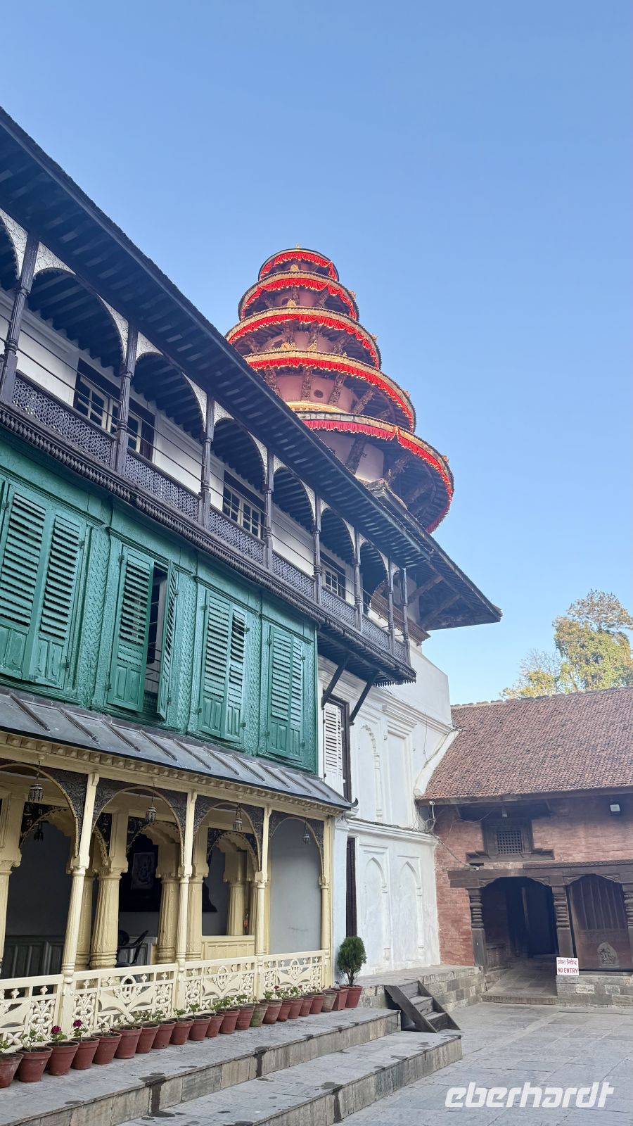 Am Nachmittag kehrten wir zurück nach Kathmandu und besichtigten dort den Königspalast mit dem Basantapur Durbar Square. Dieser Platz war einst das politische und kulturelle Zentrum des alten Königreichs. Besonders beeindruckend sind die kunstvoll verzierten Pagoden, geschnitzten Balkone und Tempel, die den Platz umgeben. Nicht weit entfernt besuchten wir auch das Kumari Ghar, den Wohnsitz der „Lebenden Göttin“ Kumari. Sie gilt als Inkarnation der Göttin Taleju und wird in feierlichen Ritualen verehrt, bis sie die Pubertät erreicht. Wenn man Glück hat, zeigt sich die Kumari für einen kurzen Moment am Fenster – ein seltener und heiliger Augenblick.