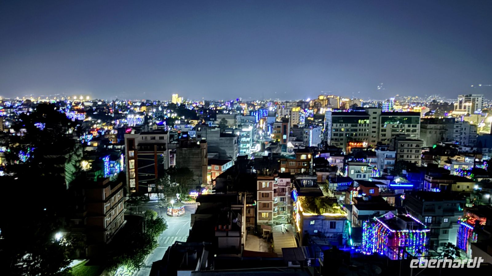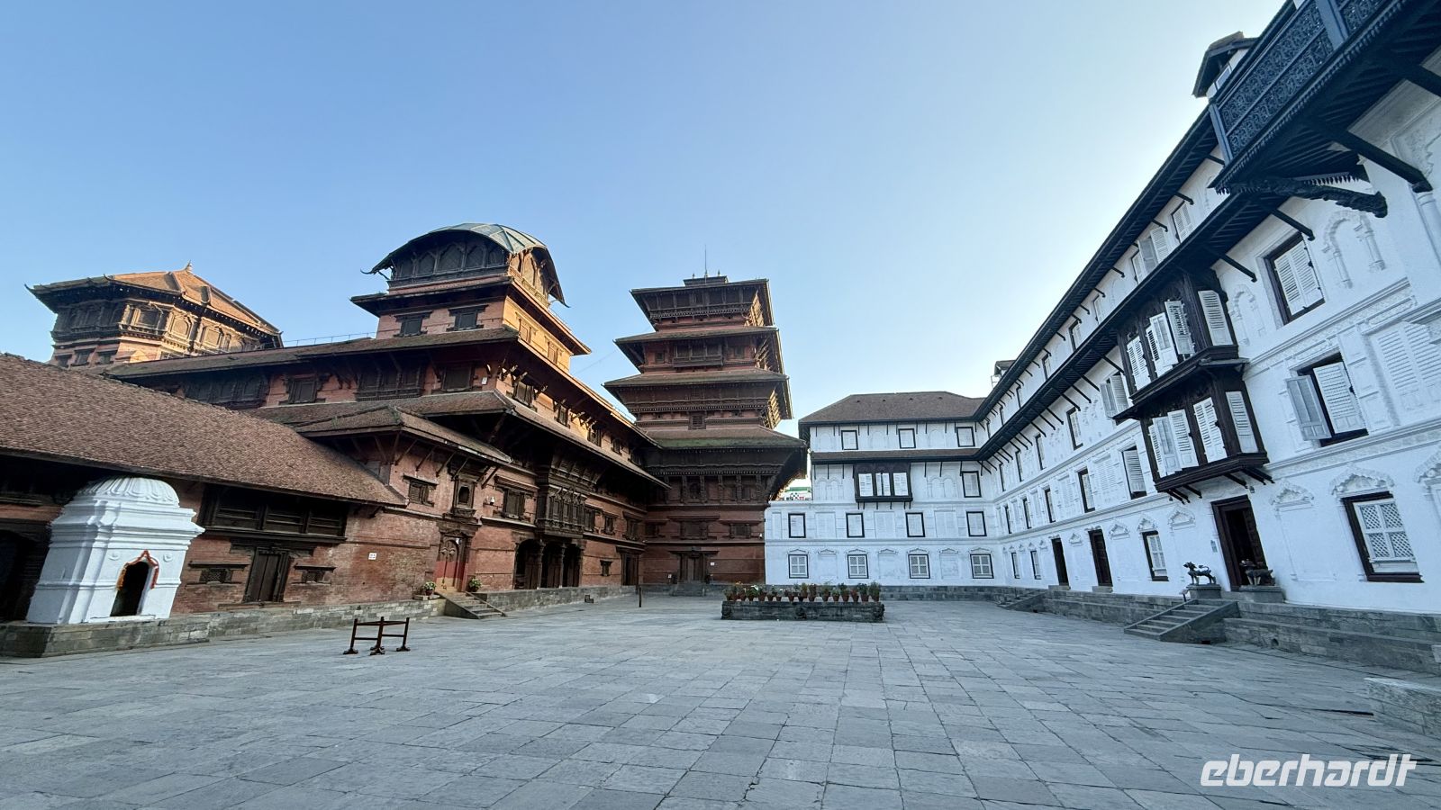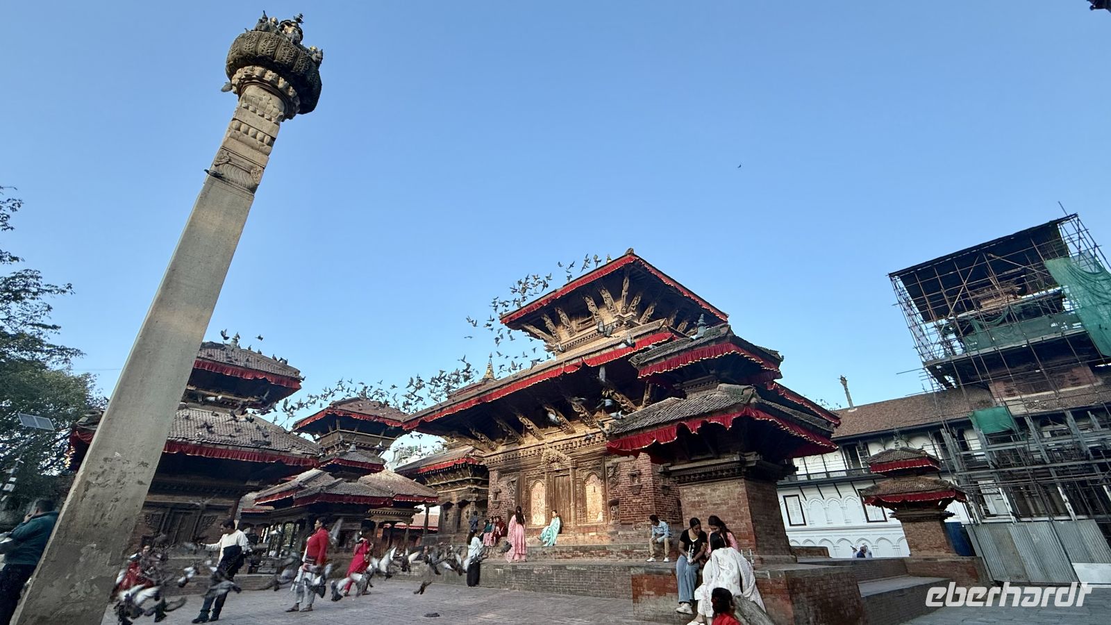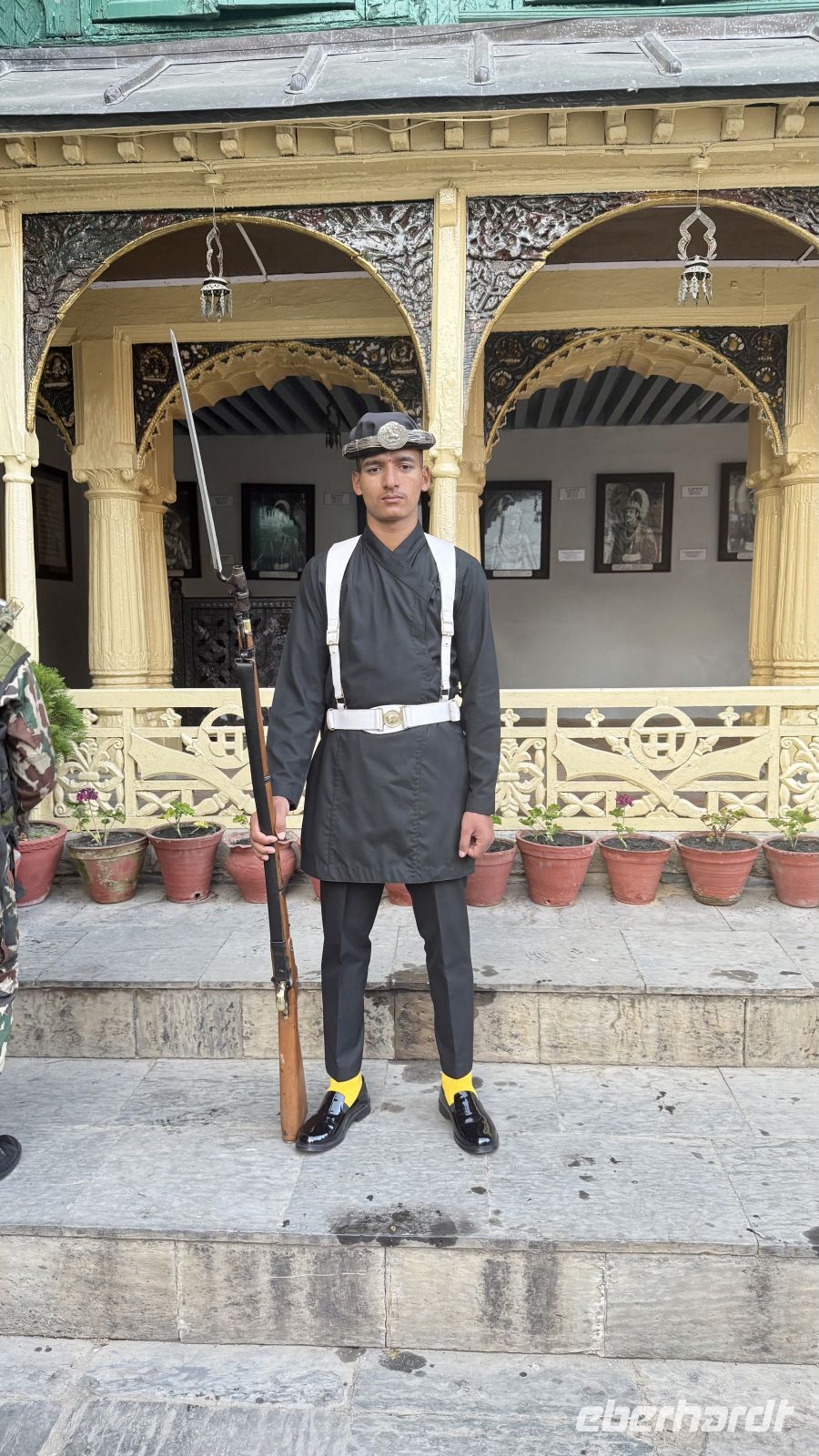 Am Nachmittag kehrten wir zurück nach Kathmandu und besichtigten dort den Königspalast mit dem Basantapur Durbar Square. Dieser Platz war einst das politische und kulturelle Zentrum des alten Königreichs. Besonders beeindruckend sind die kunstvoll verzierten Pagoden, geschnitzten Balkone und Tempel, die den Platz umgeben. Nicht weit entfernt besuchten wir auch das Kumari Ghar, den Wohnsitz der „Lebenden Göttin“ Kumari. Sie gilt als Inkarnation der Göttin Taleju und wird in feierlichen Ritualen verehrt, bis sie die Pubertät erreicht. Wenn man Glück hat, zeigt sich die Kumari für einen kurzen Moment am Fenster – ein seltener und heiliger Augenblick.