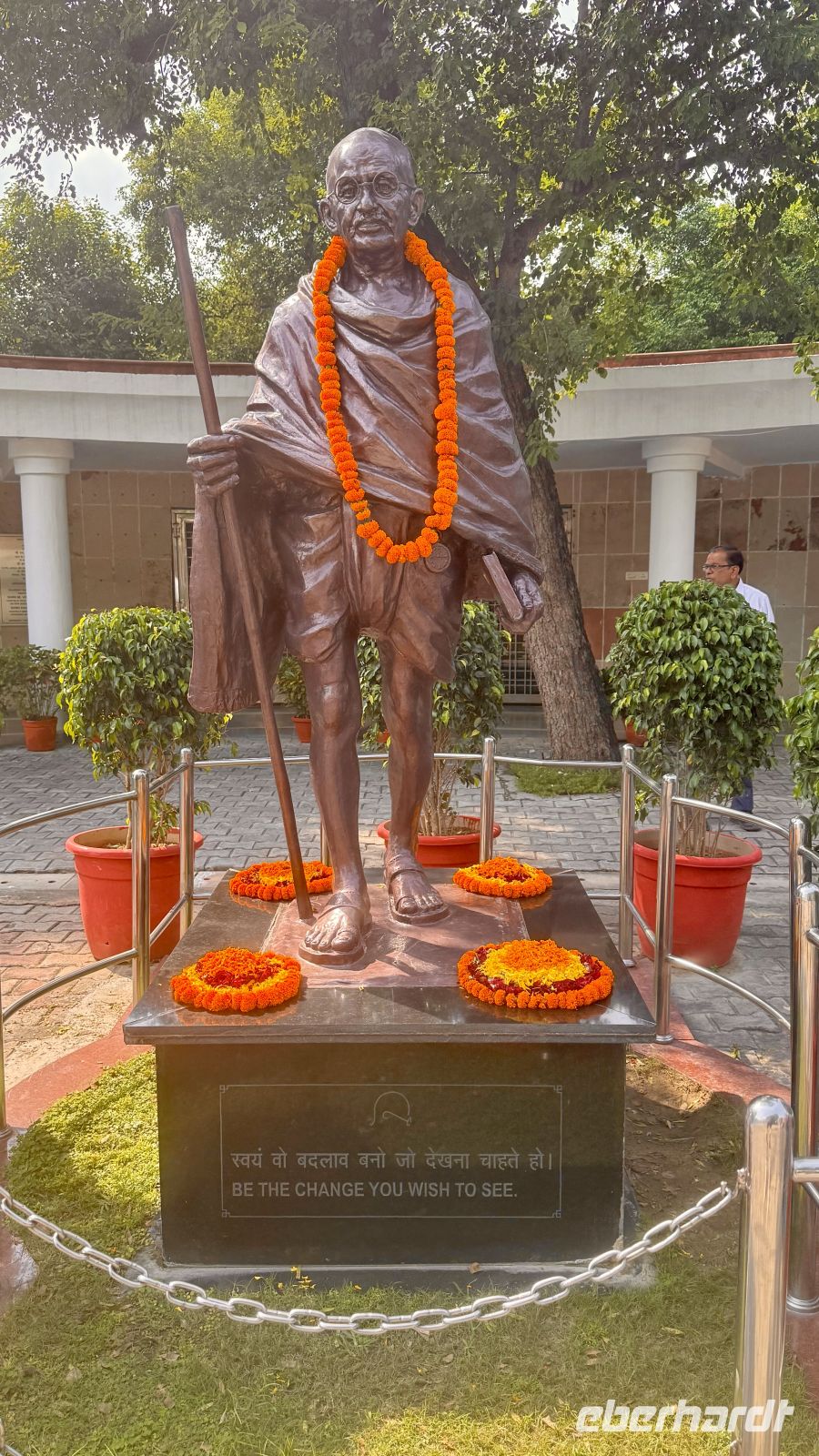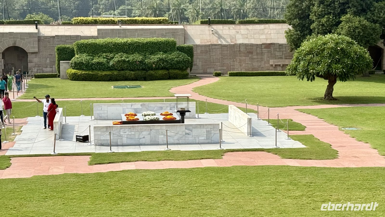 Am Mittag starteten wir unsere Stadtbesichtigung durch Alt-Delhi. Unser erster Halt war Raj Ghat, das schlichte, aber eindrucksvolle Mahnmal für Mahatma Gandhi. Es befindet sich an jener Stelle, an der Gandhi 1948 nach seiner Ermordung eingeäschert wurde. Die schwarze Marmorplatte mit einer ewigen Flamme symbolisiert seine unvergängliche Botschaft von Frieden, Toleranz und Gewaltlosigkeit – ein sehr bewegender Ort.