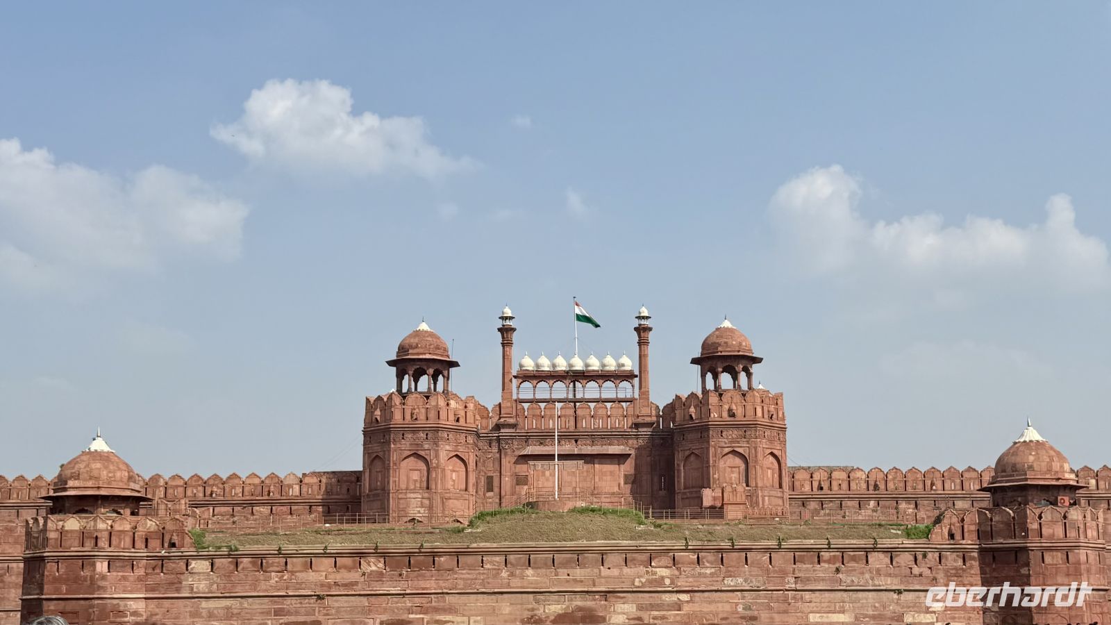 Anschließend besuchten wir das Rote Fort (Lal Qila), eine beeindruckende Festungsanlage aus dem 17. Jahrhundert, die während der Herrschaft des Mogulkaisers Shah Jahan erbaut wurde. Mit ihren mächtigen roten Sandsteinmauern und kunstvoll gestalteten Toren zeugt sie vom einstigen Glanz des Mogulreichs. Wir erkundeten das Gelände zu Fuß und schlenderten danach über einen lebhaften Basar, wo uns exotische Düfte, farbenfrohe Stoffe und das geschäftige Treiben der Händler begeisterten. Natürlich probierten wir auch einige lokale Leckereien – frisch gebackene Kekse und warmes, weiches Naan-Brot.
